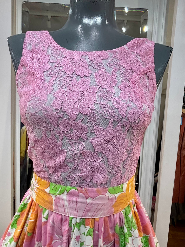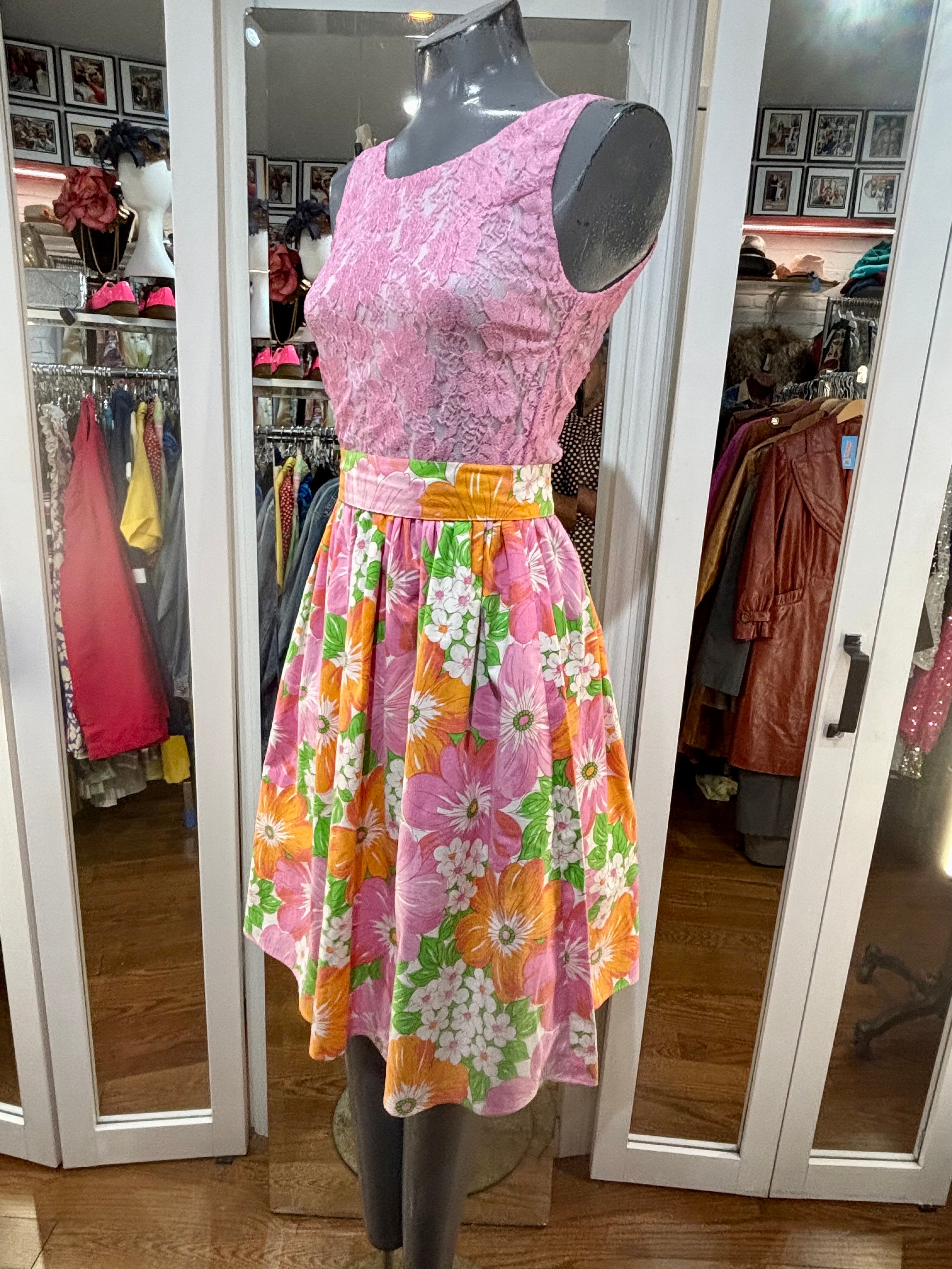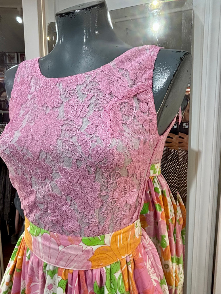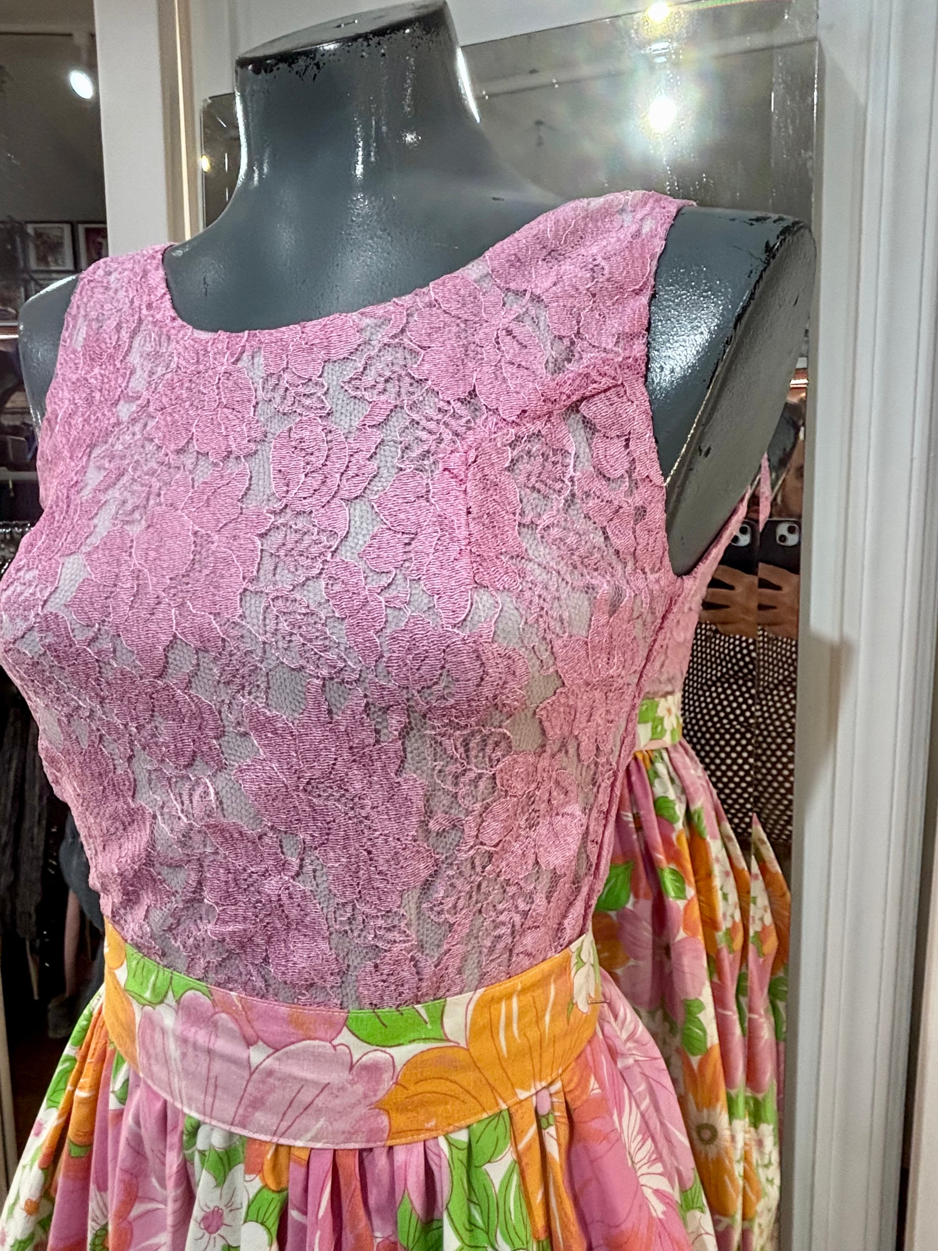 00’s Going 60’s Revival Pink Lace & Multicolor Floral Dress By Soho Mode
