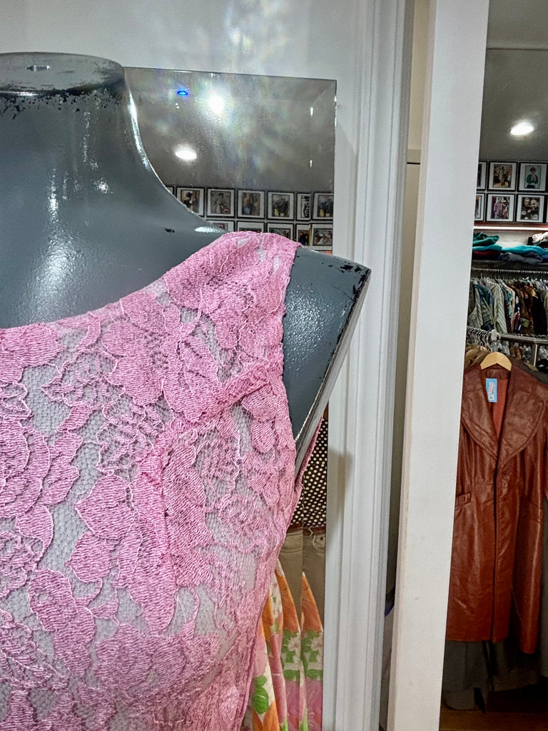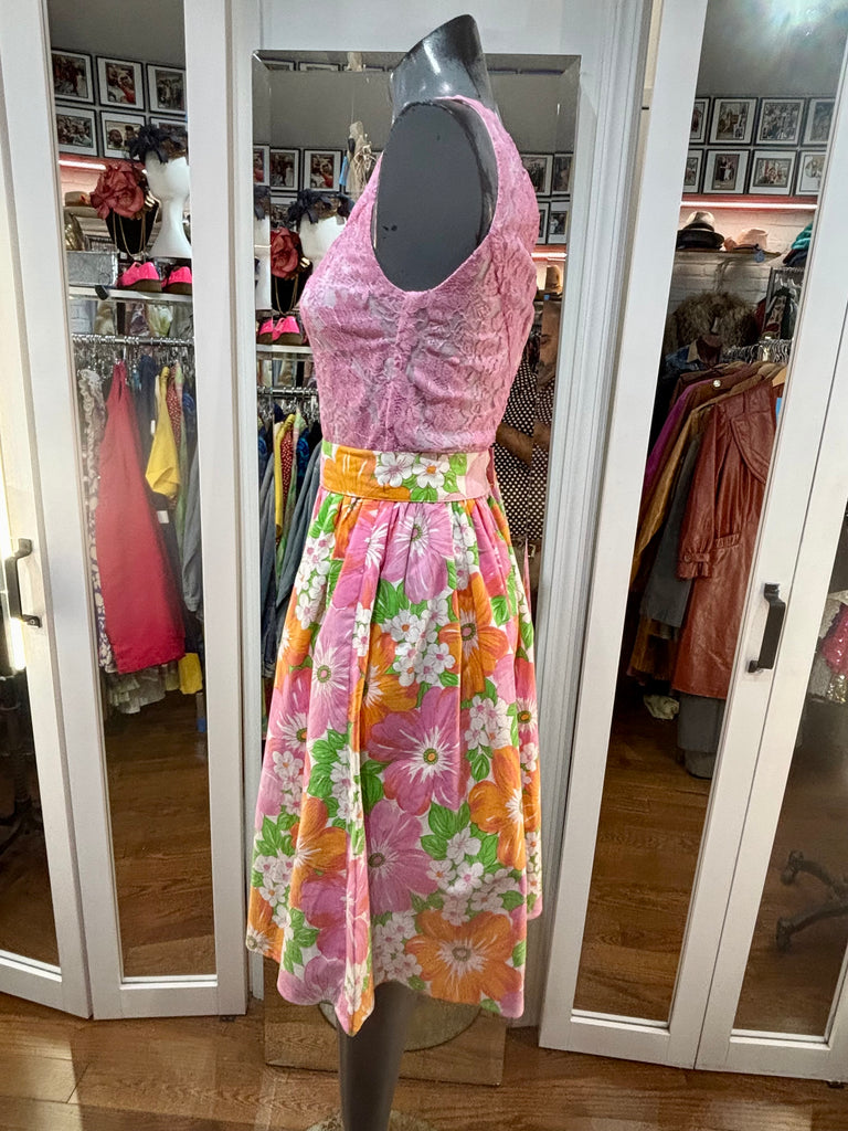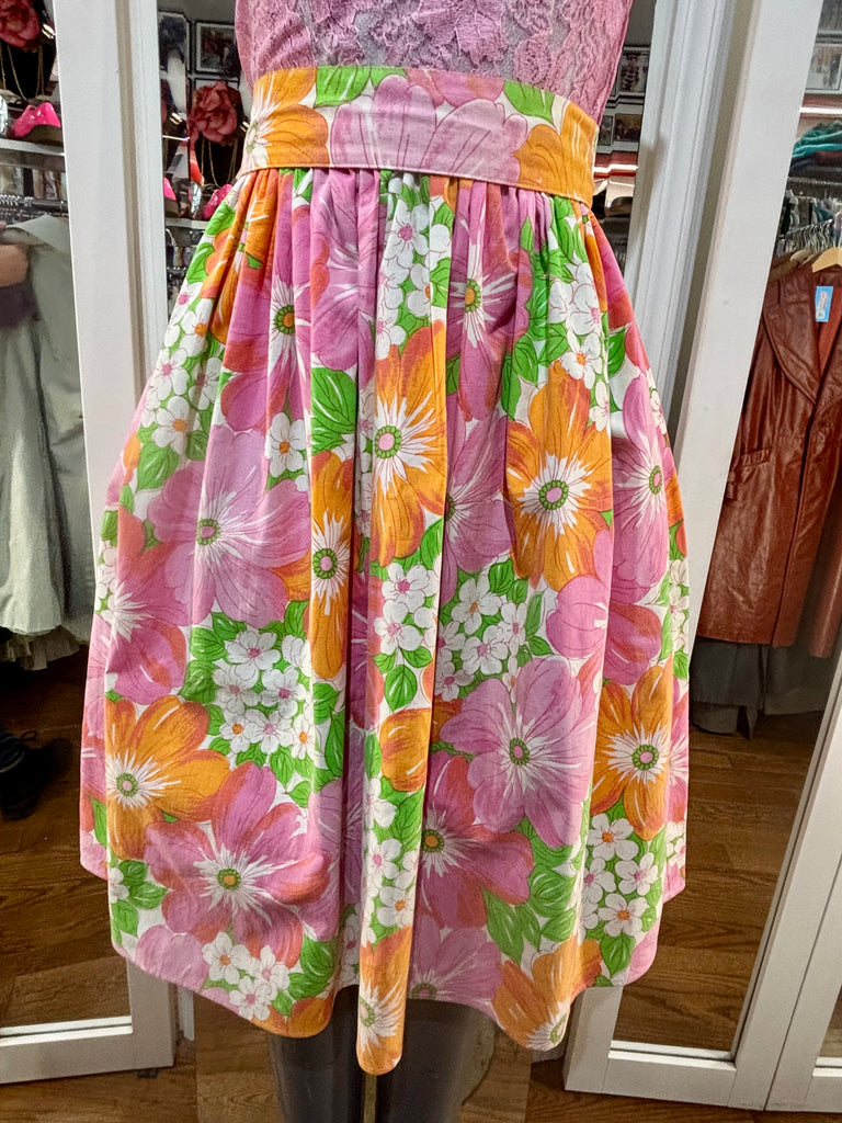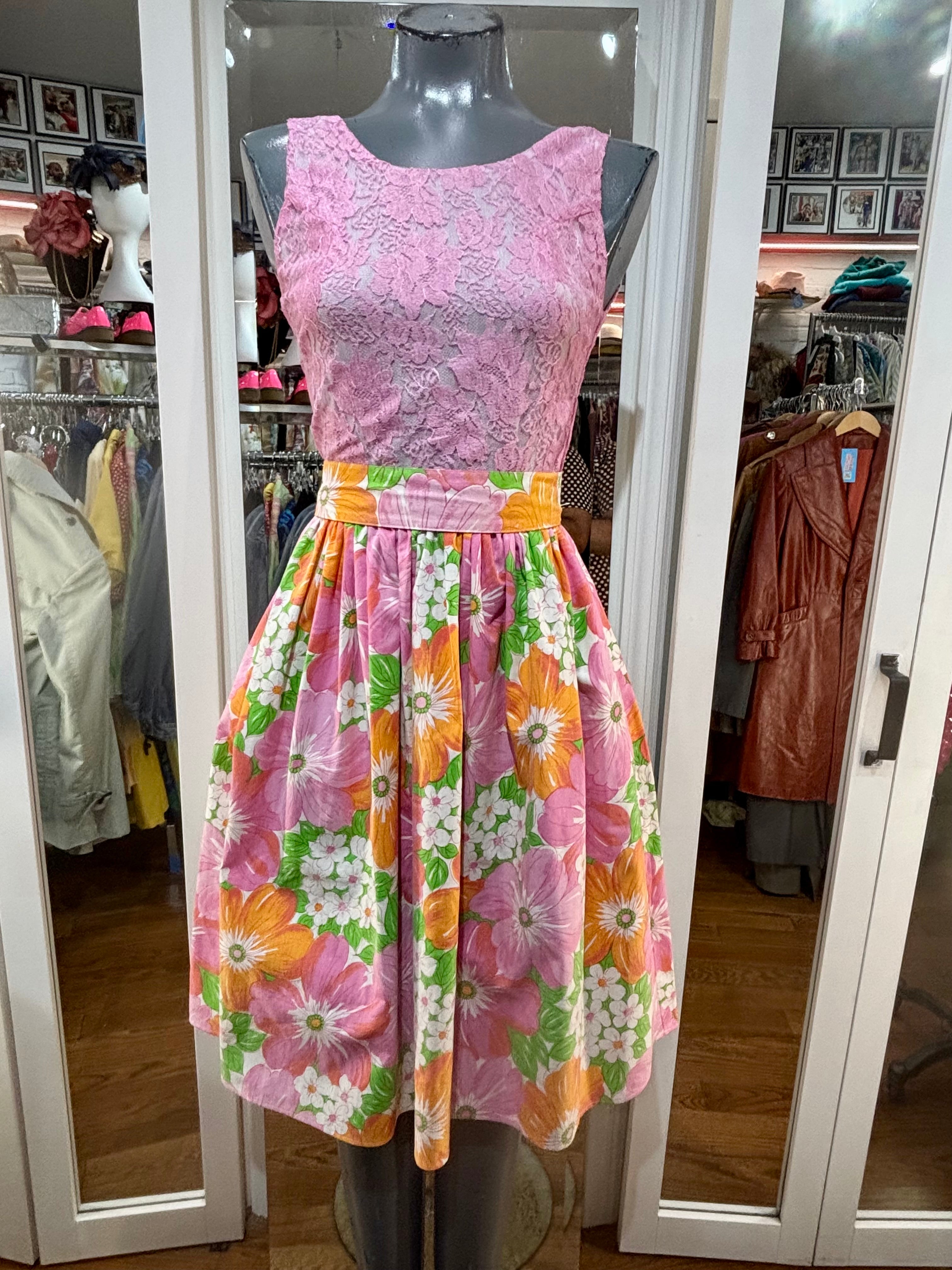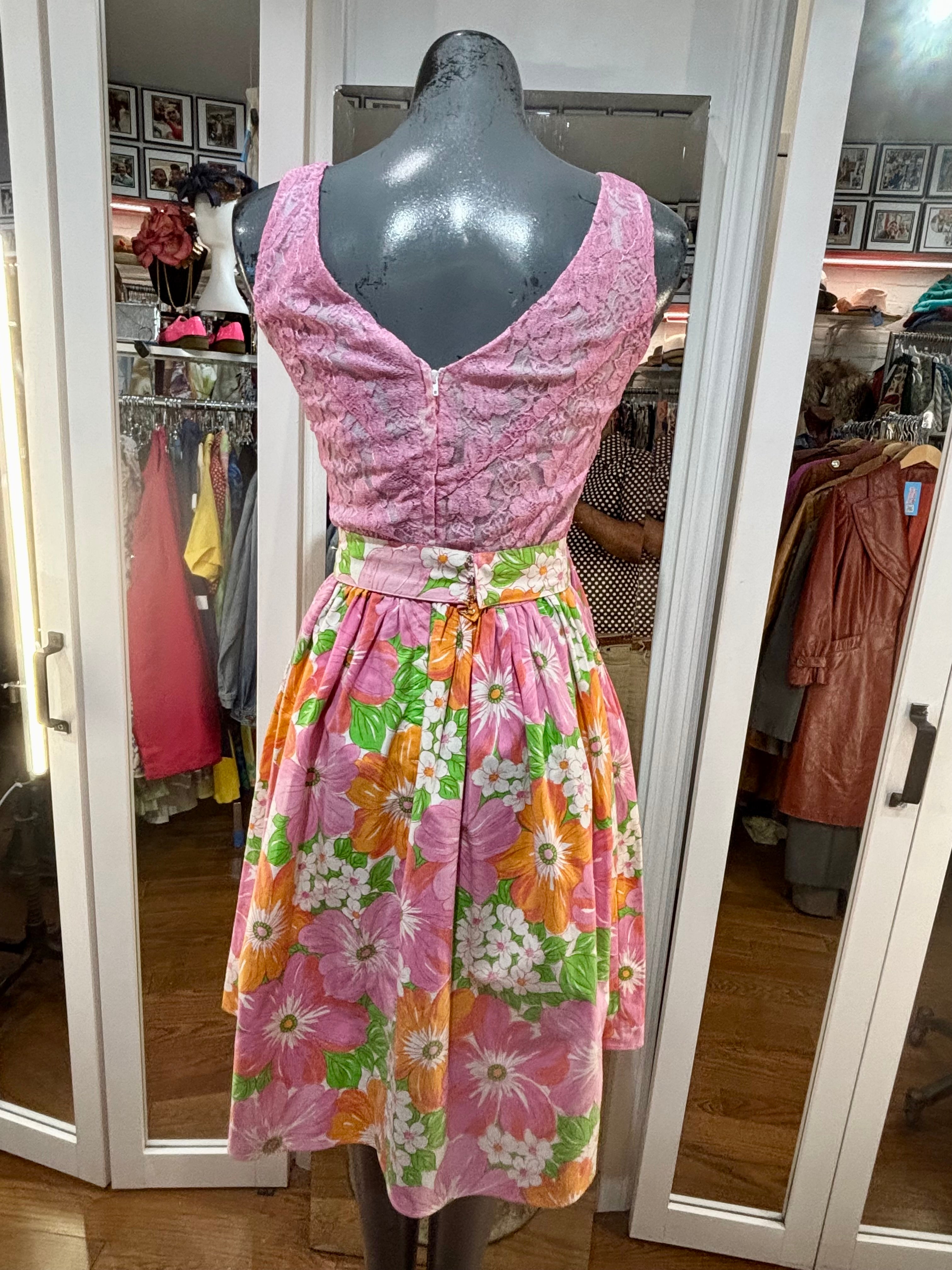 00’s Going 60’s Revival Pink Lace & Multicolor Floral Dress By Soho Mode