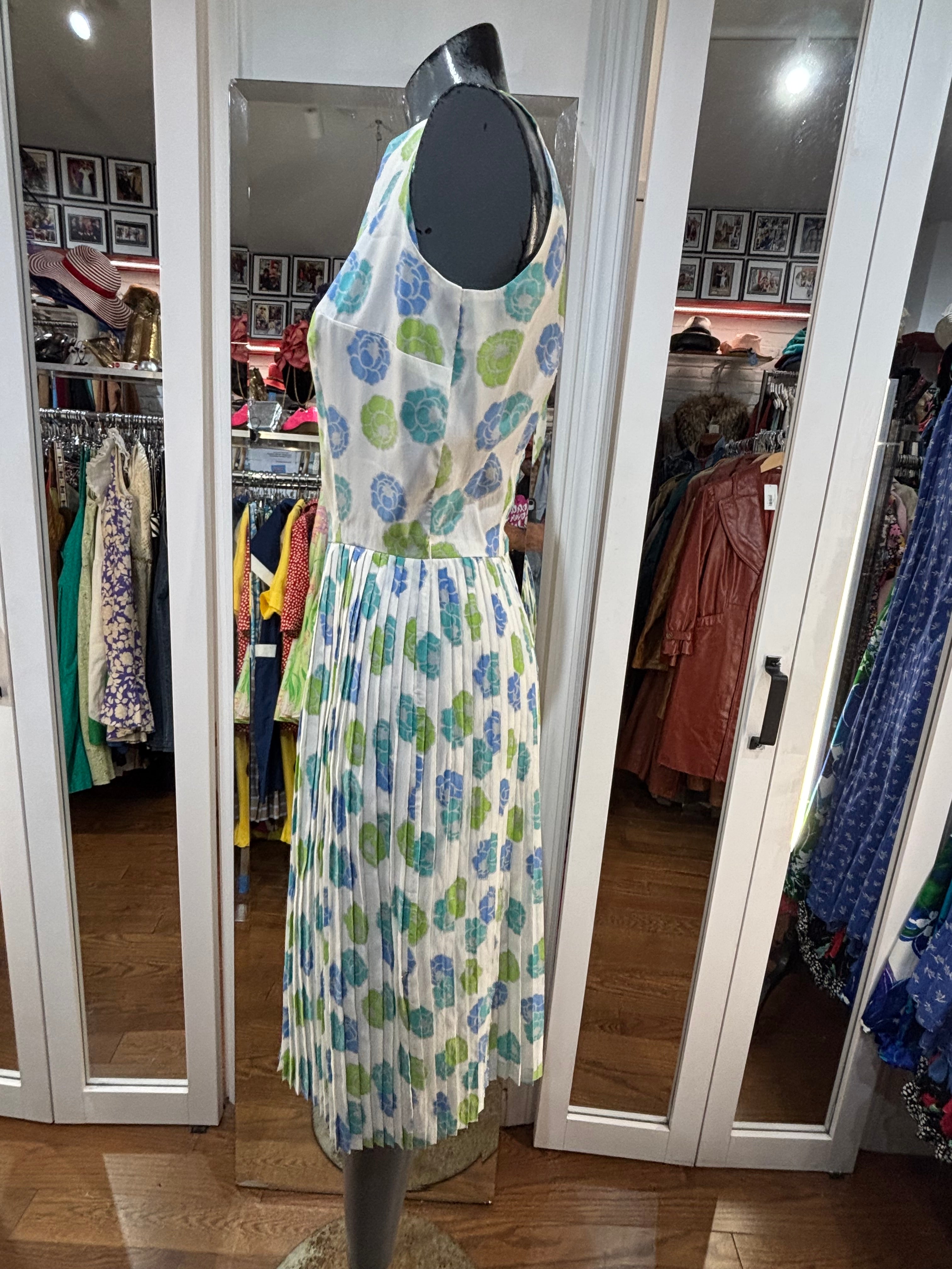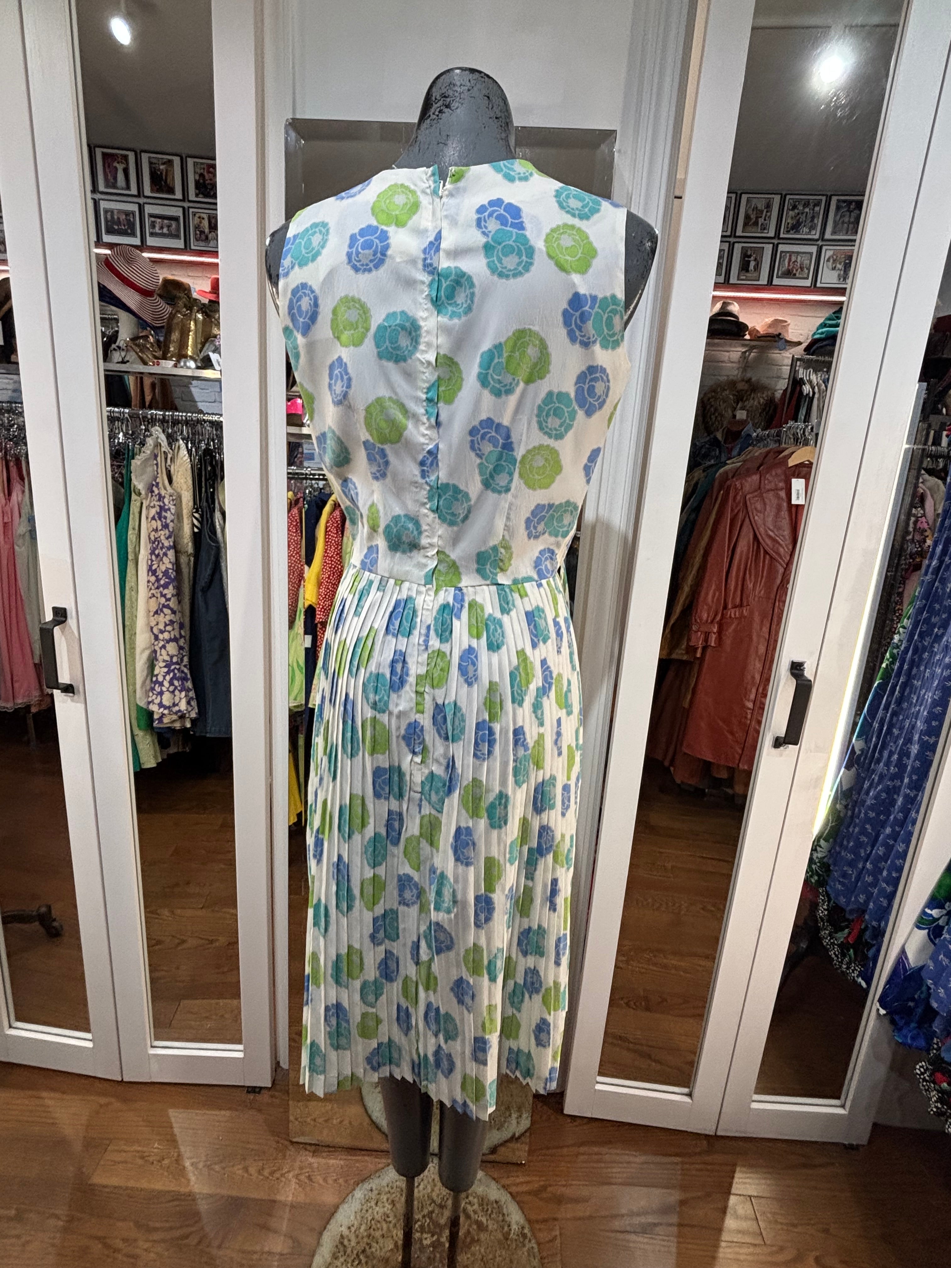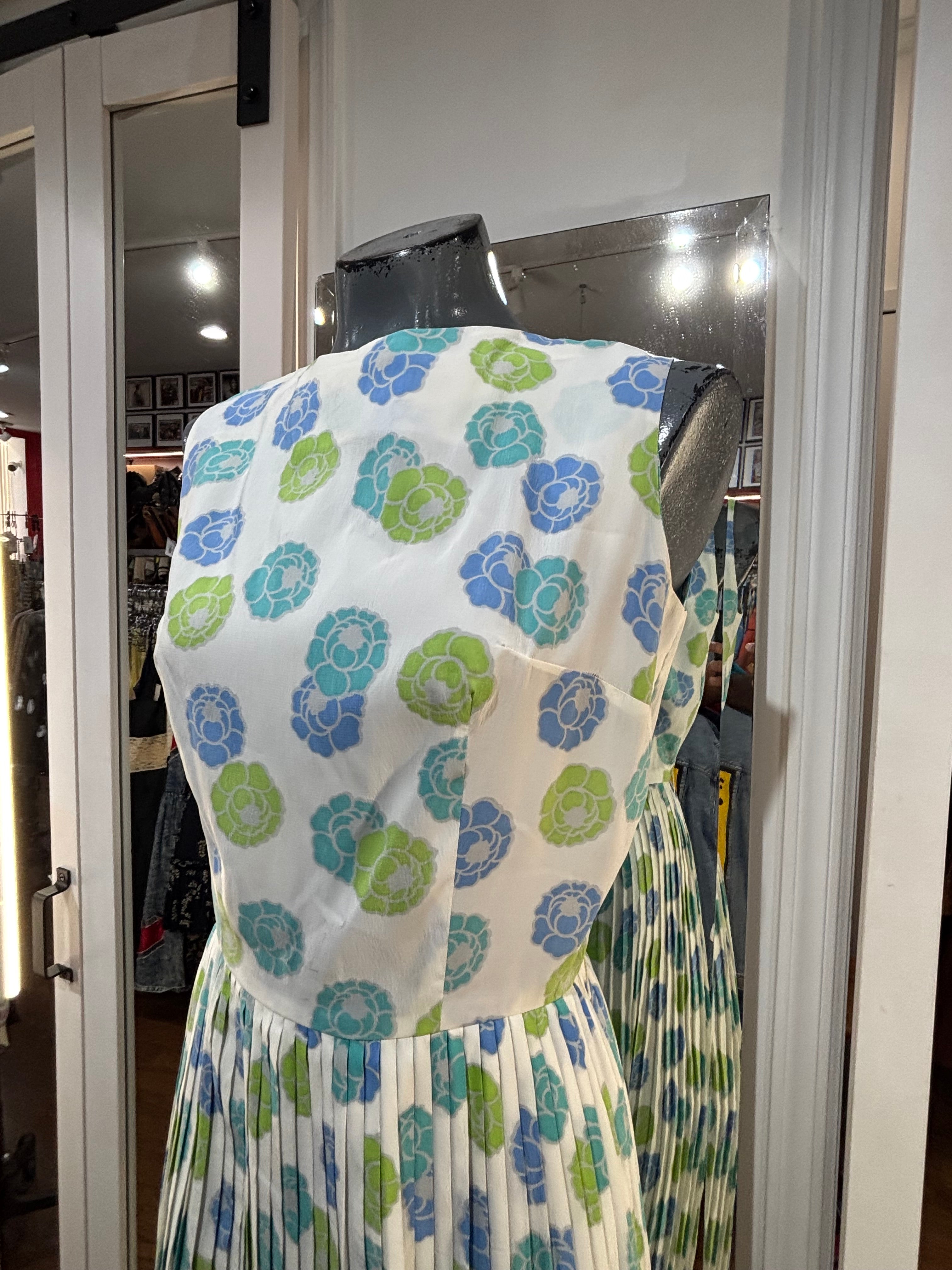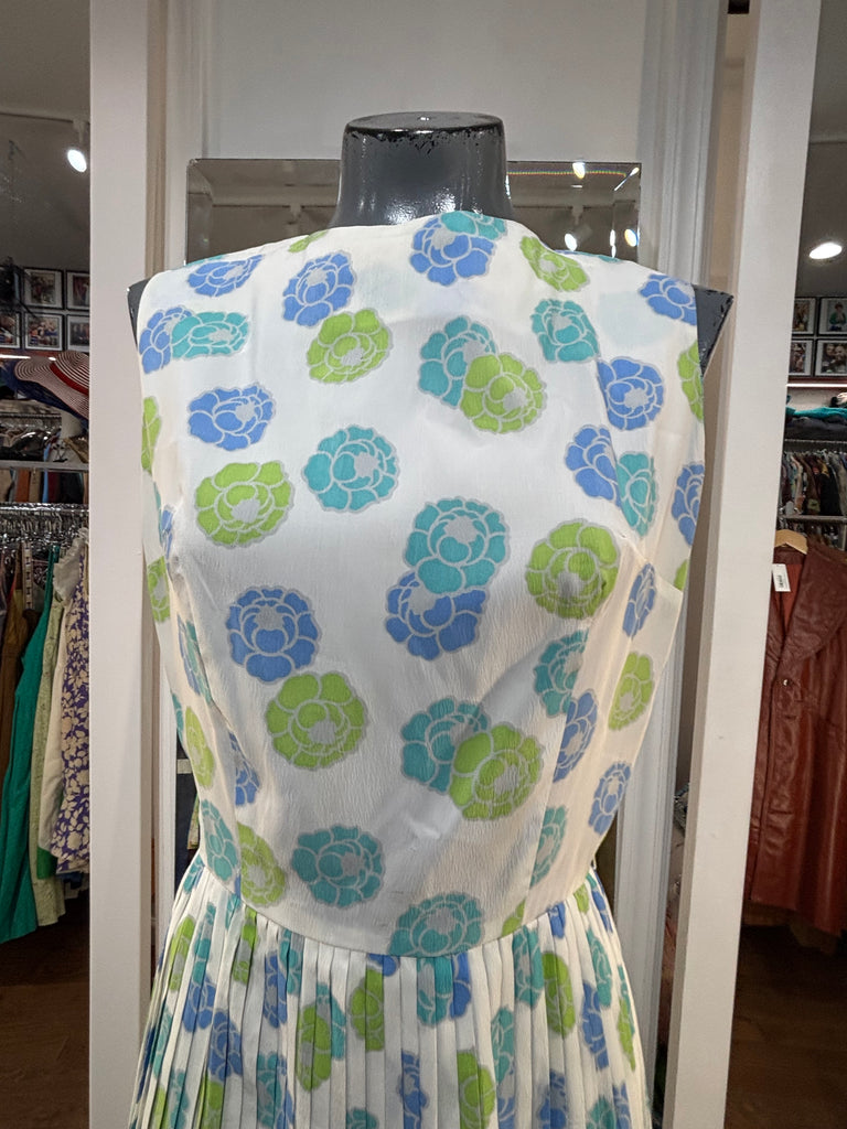 60’s White With Blue & Green Flowers Fit And Flare Dress By Georgia Griffin Fashions