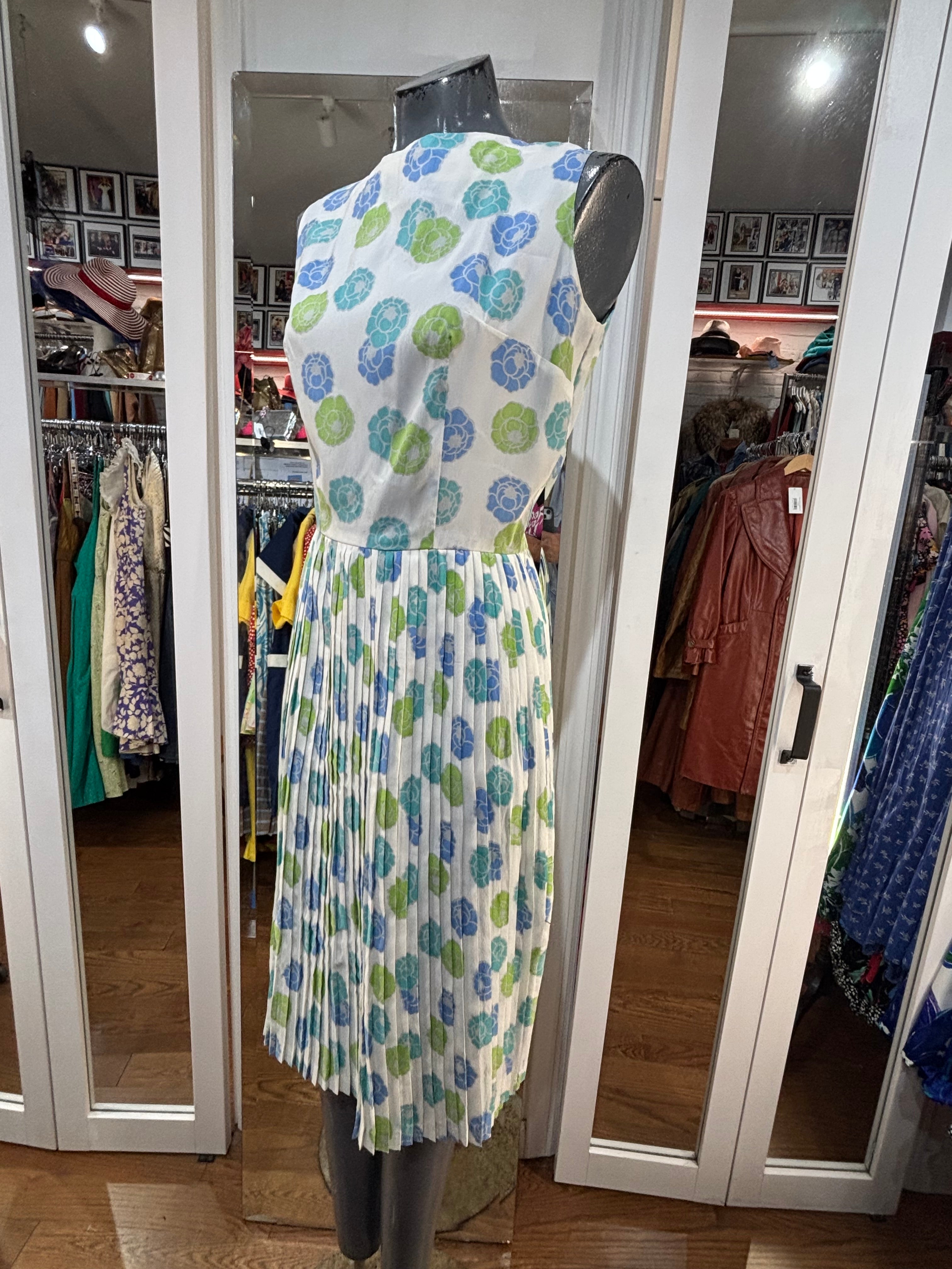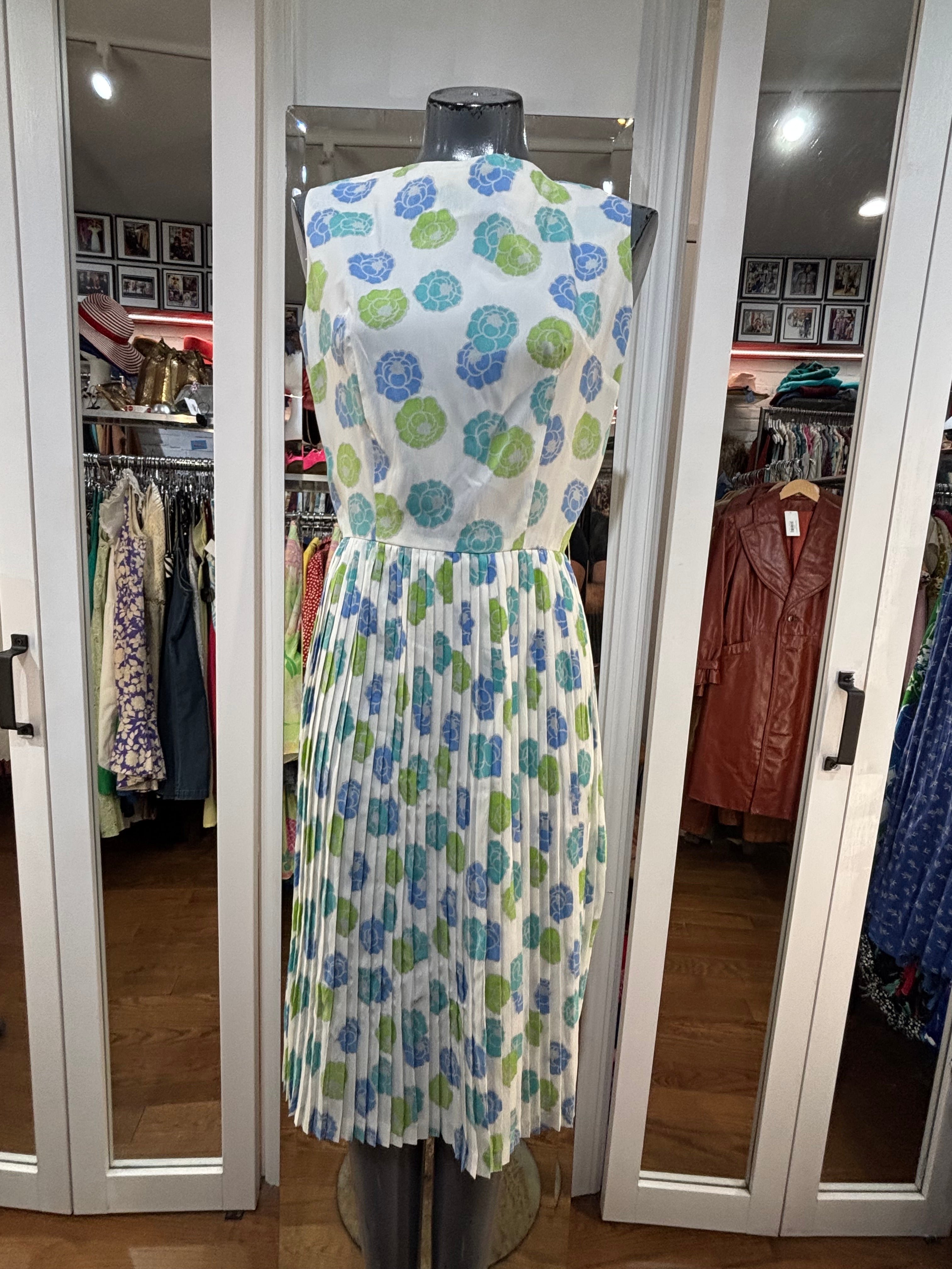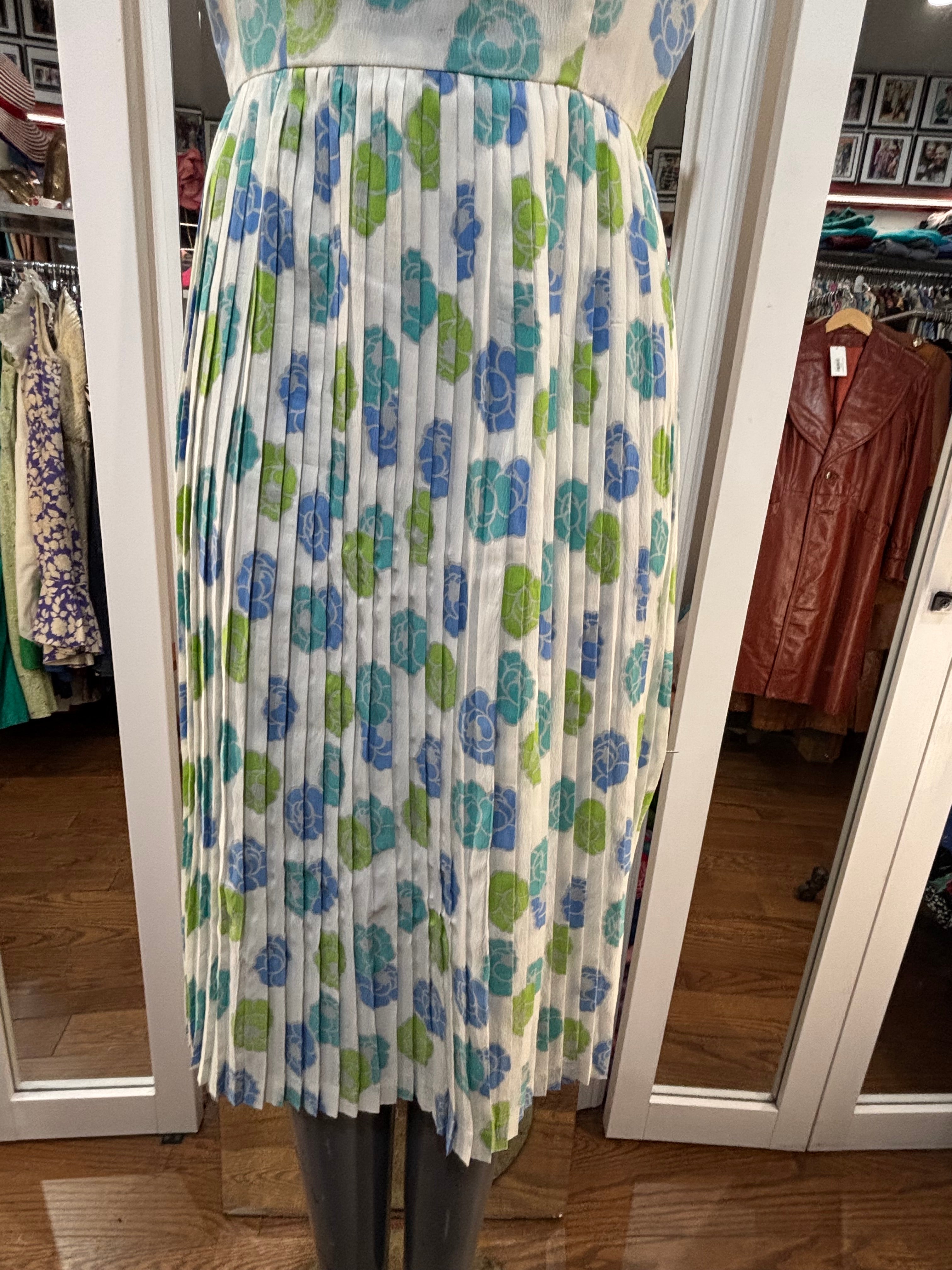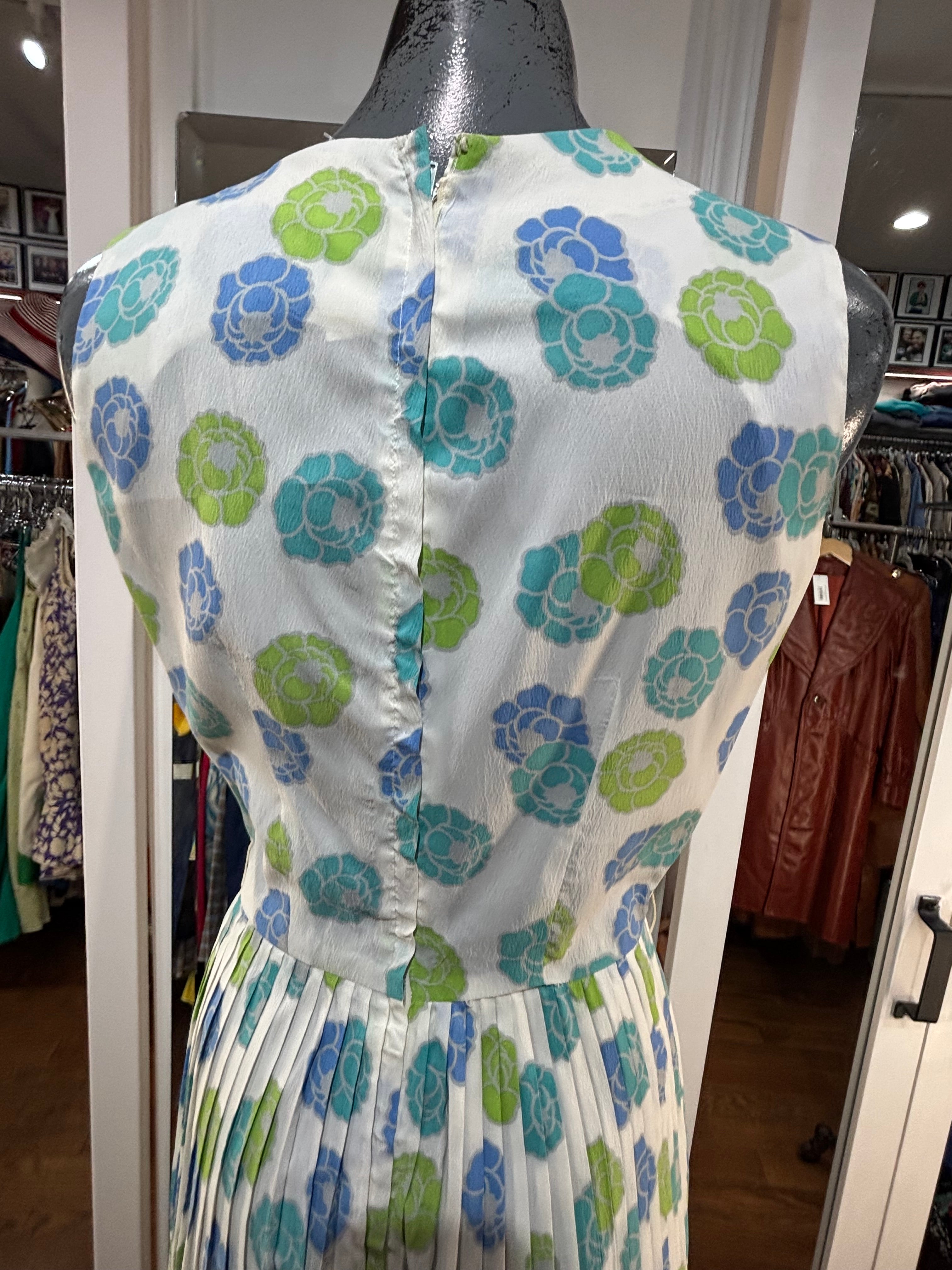 60’s White With Blue & Green Flowers Fit And Flare Dress By Georgia Griffin Fashions