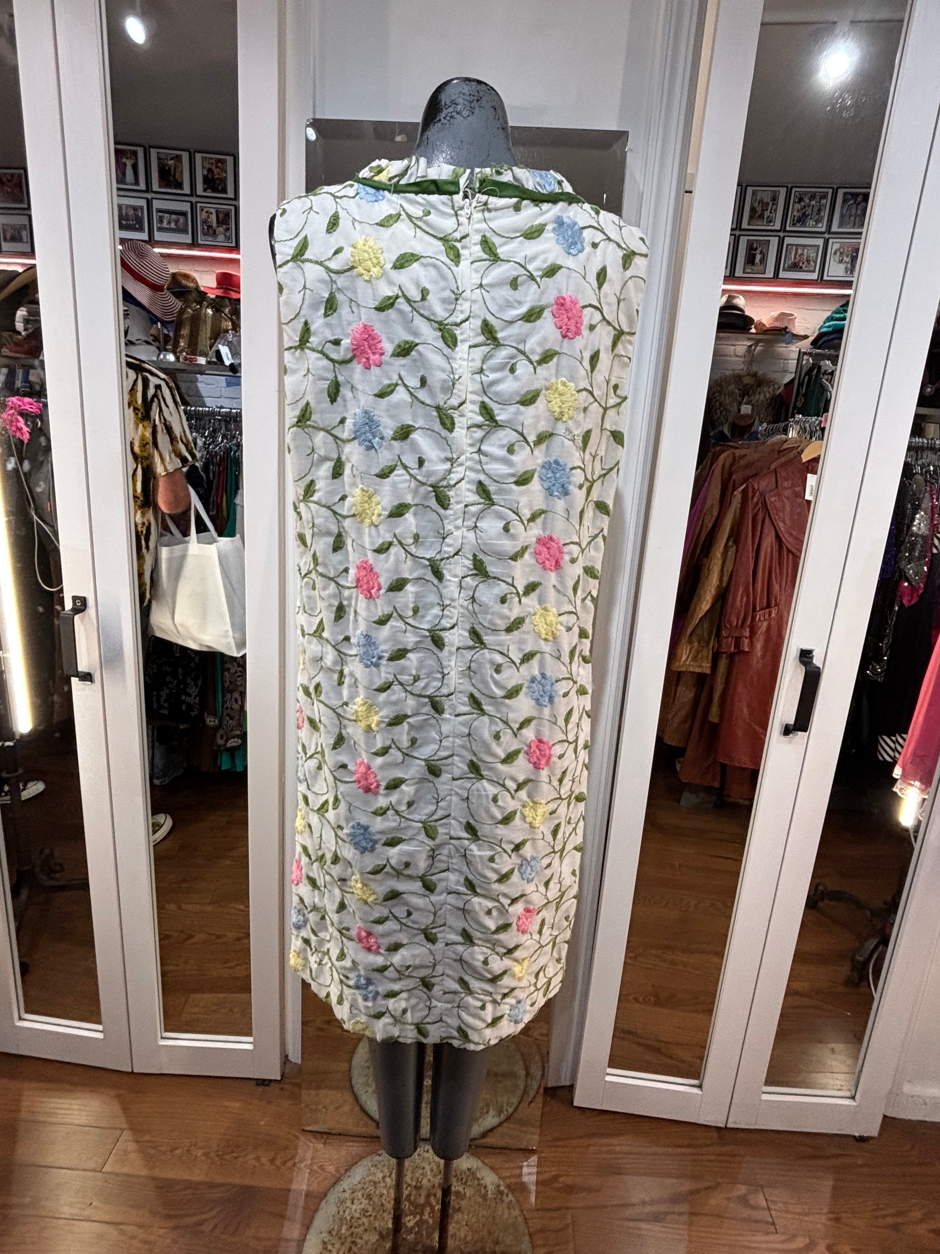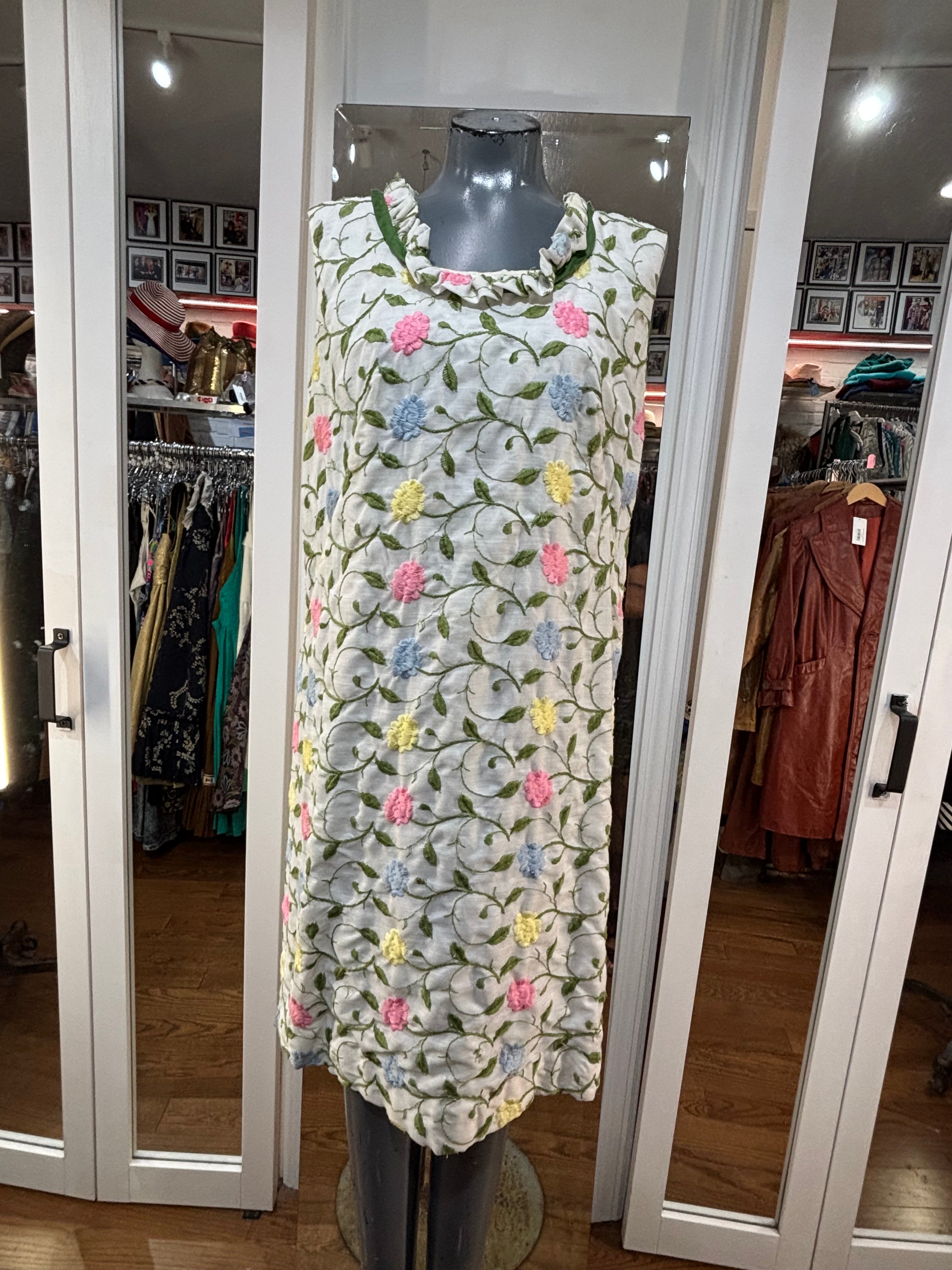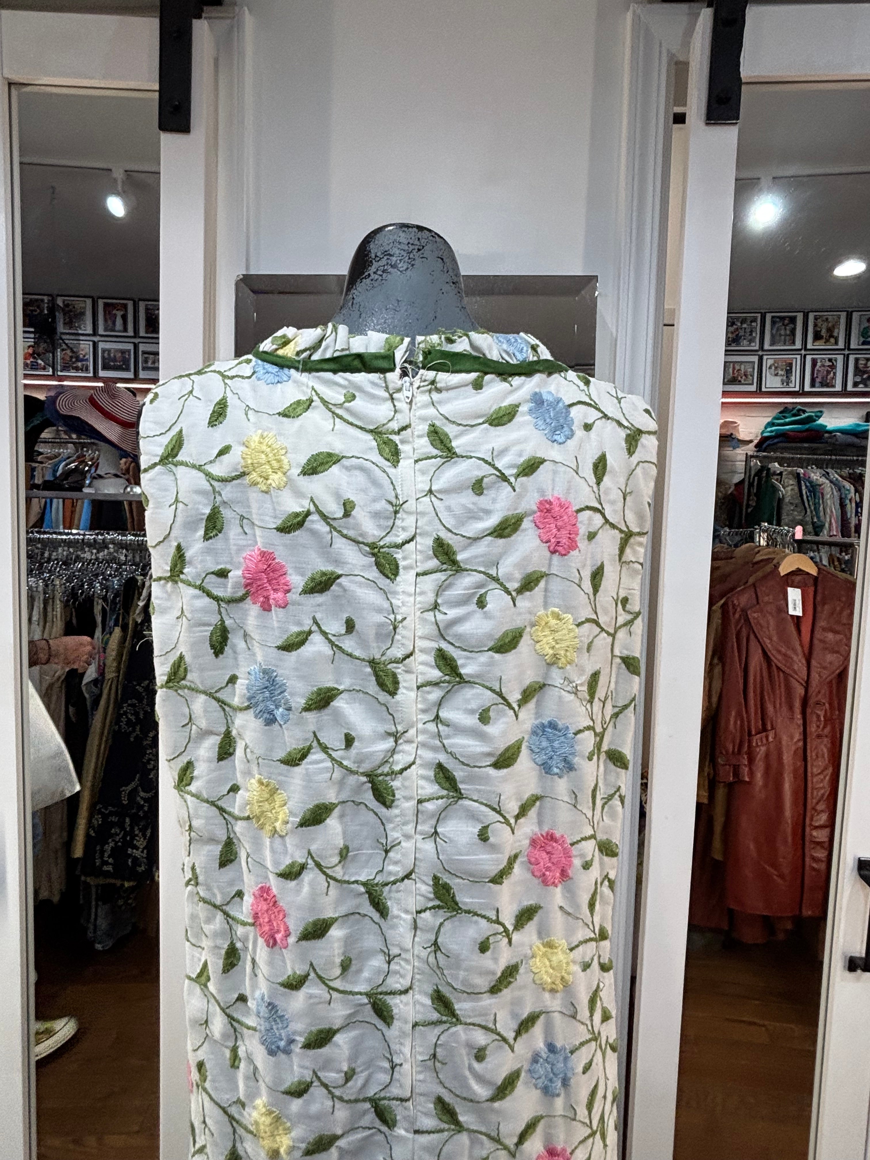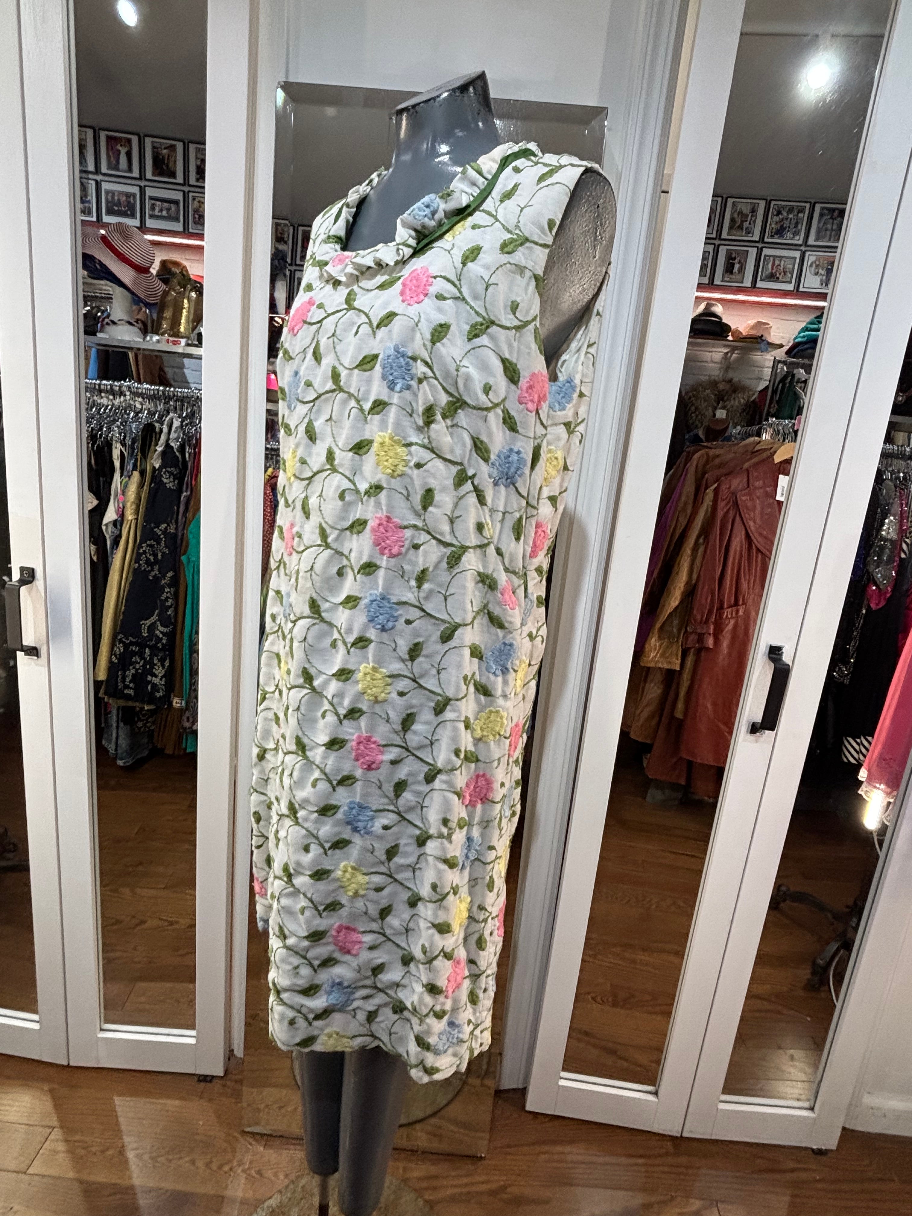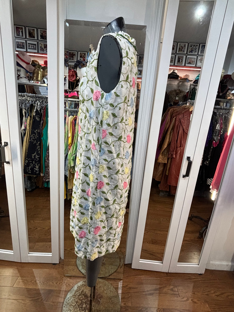 60’s White Non Sleeve Multicolor Embroidered Flower Dress By Sears Fashions