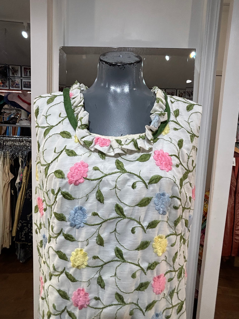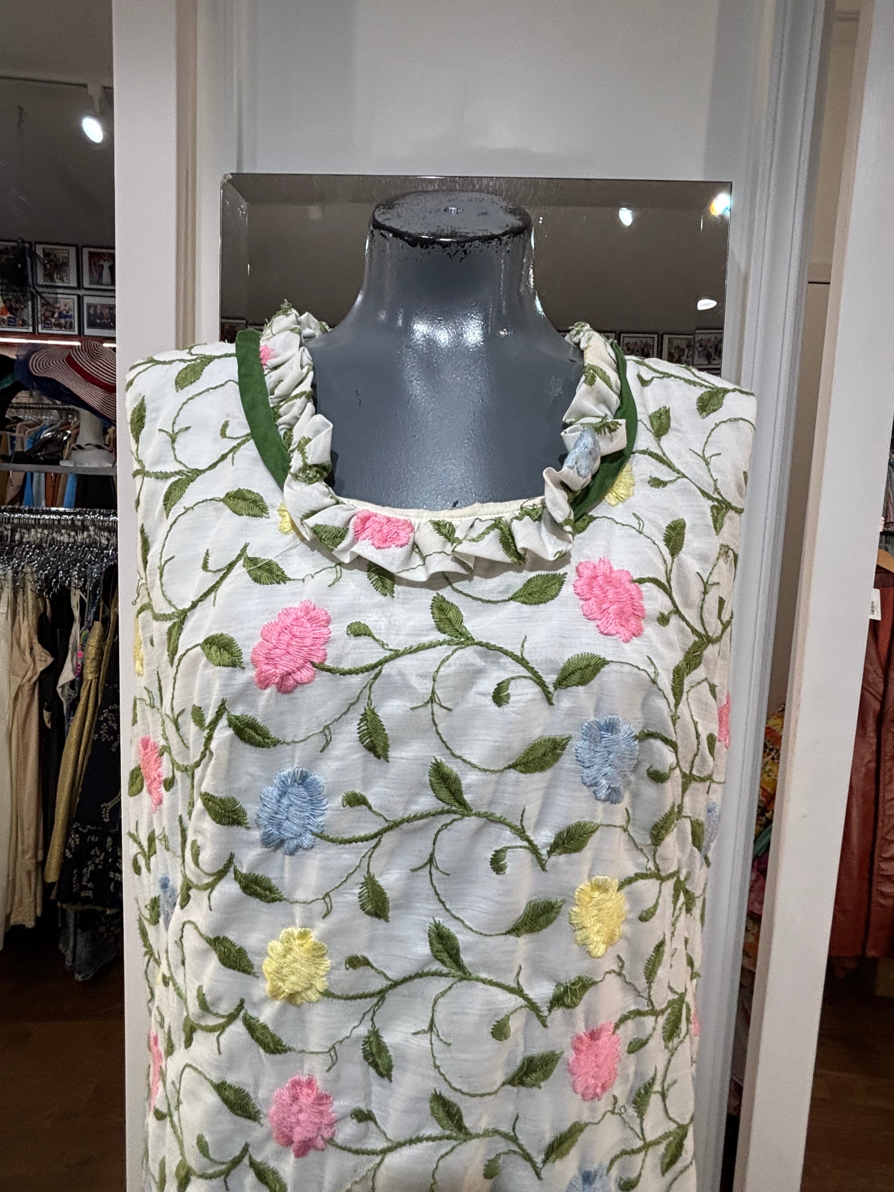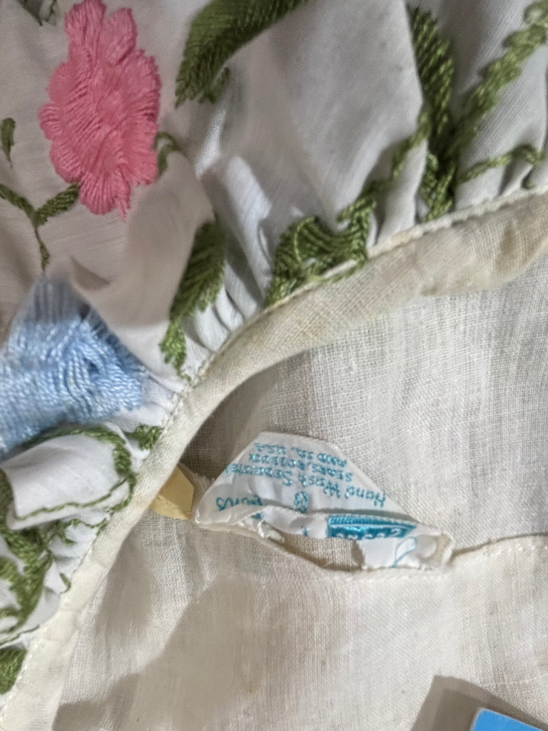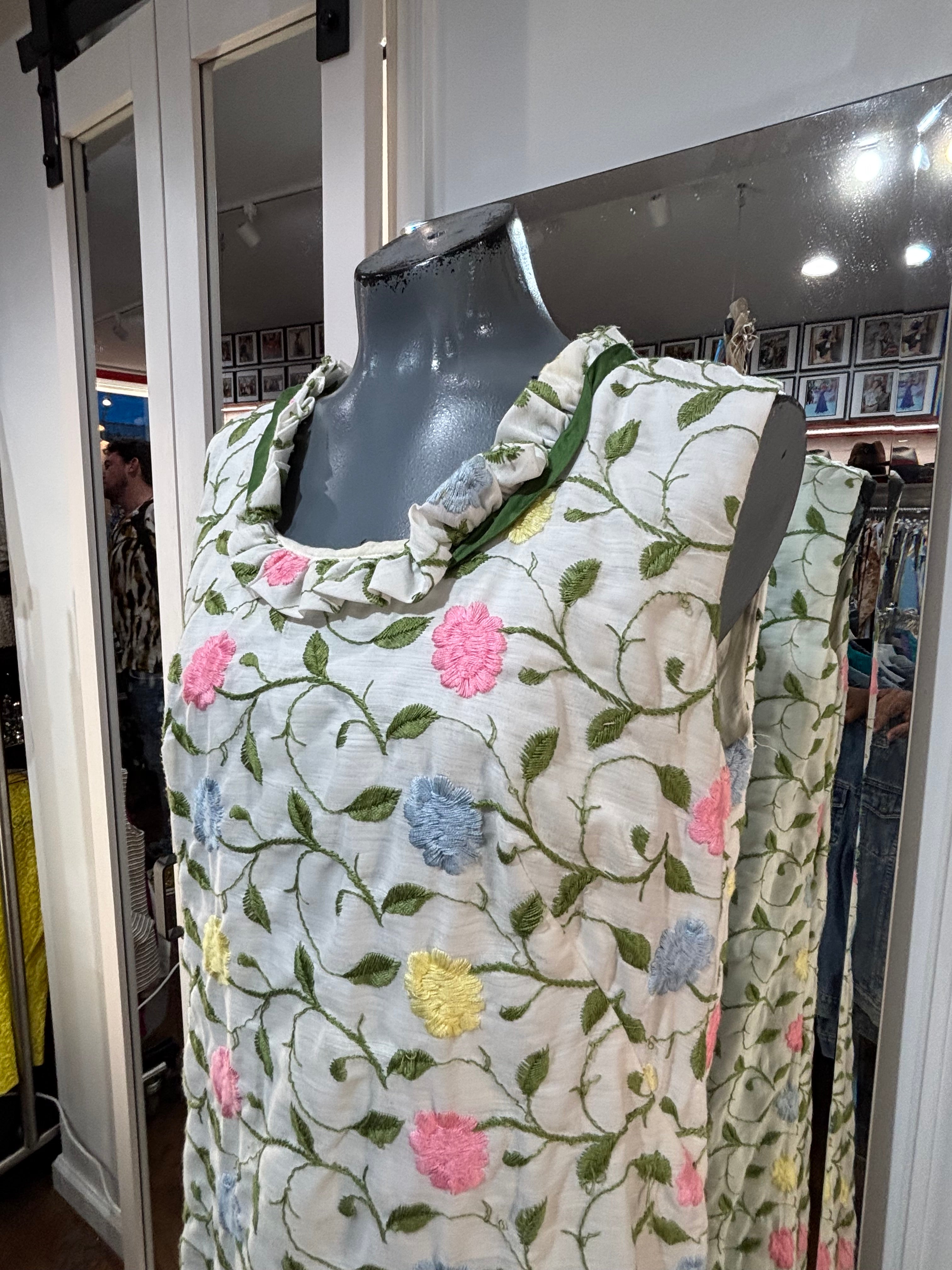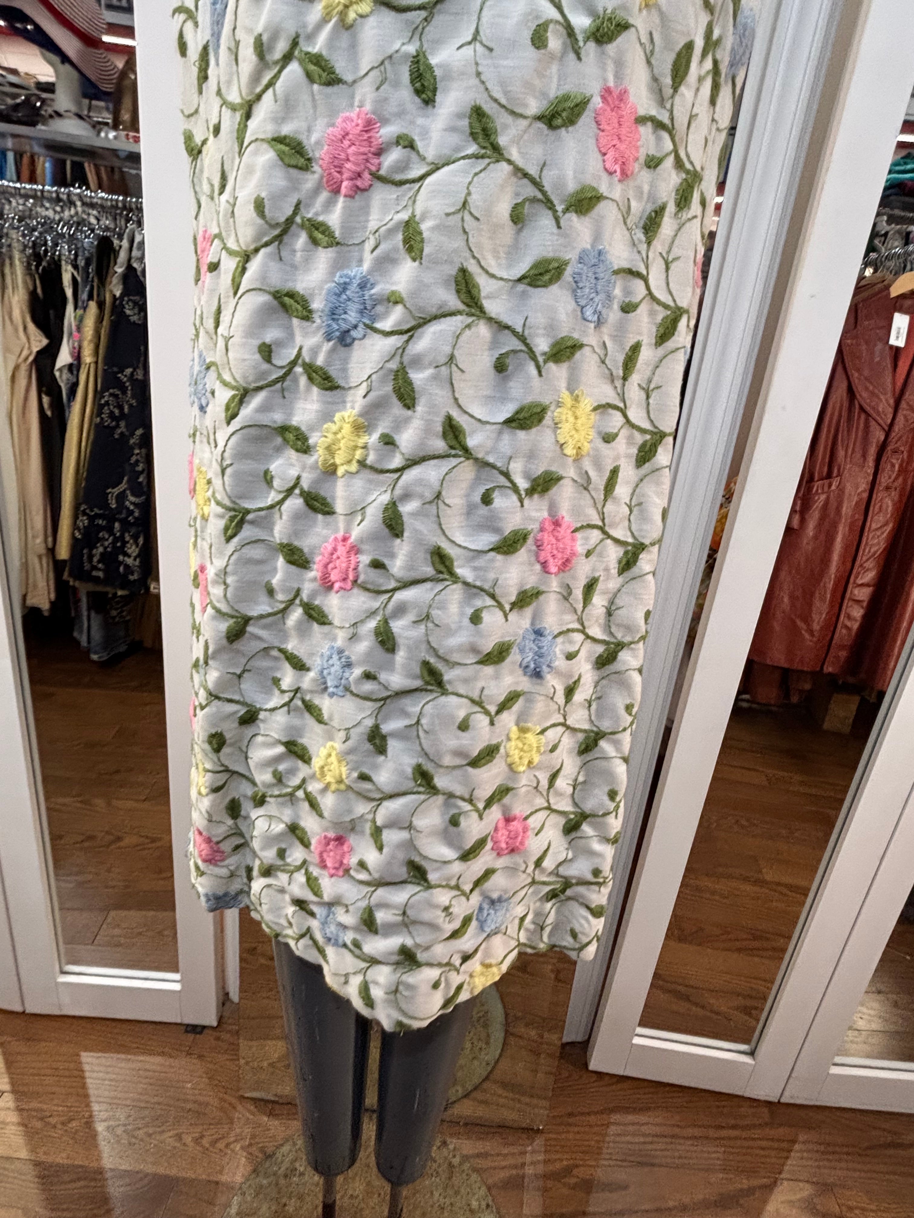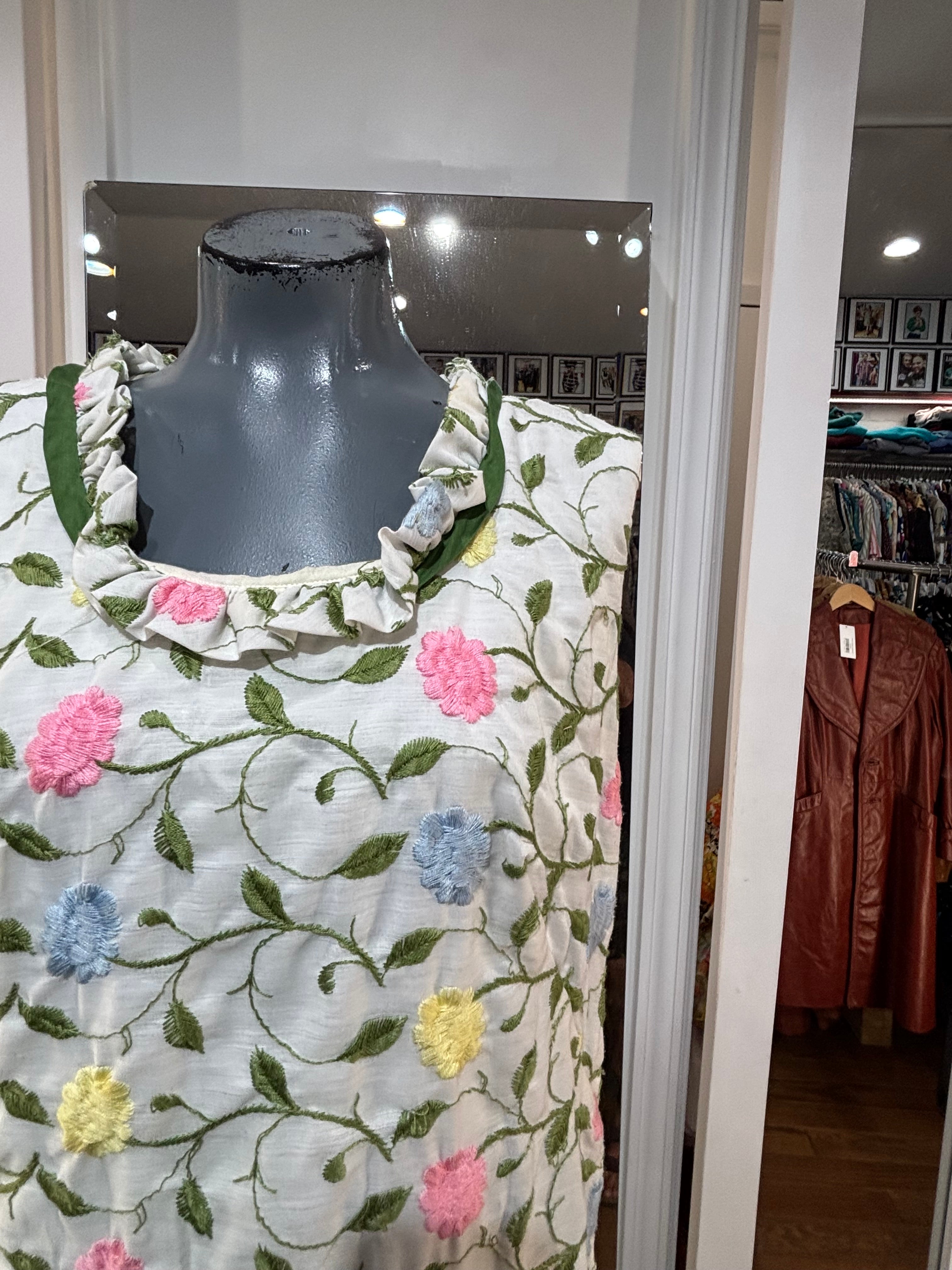 60’s White Non Sleeve Multicolor Embroidered Flower Dress By Sears Fashions