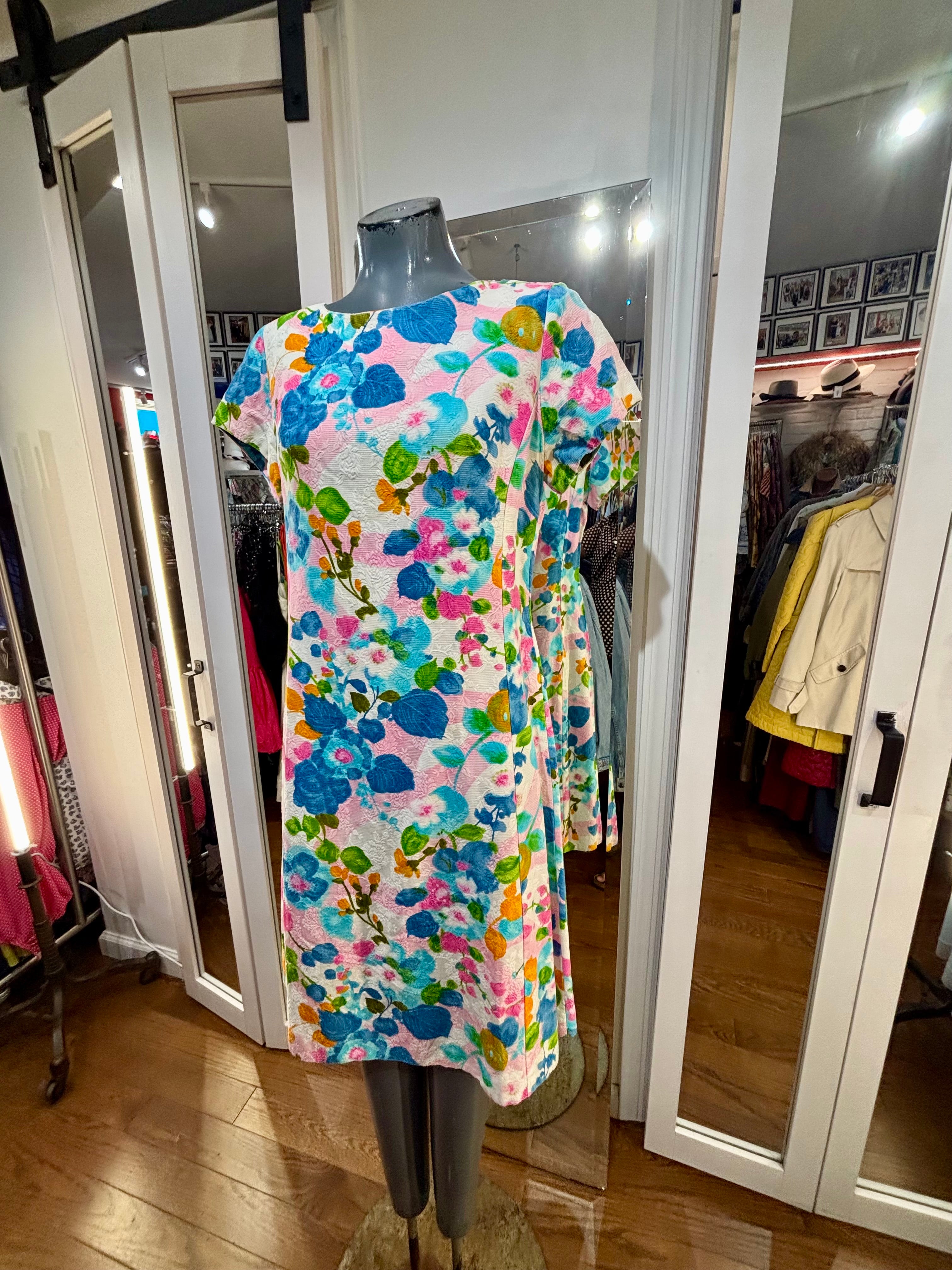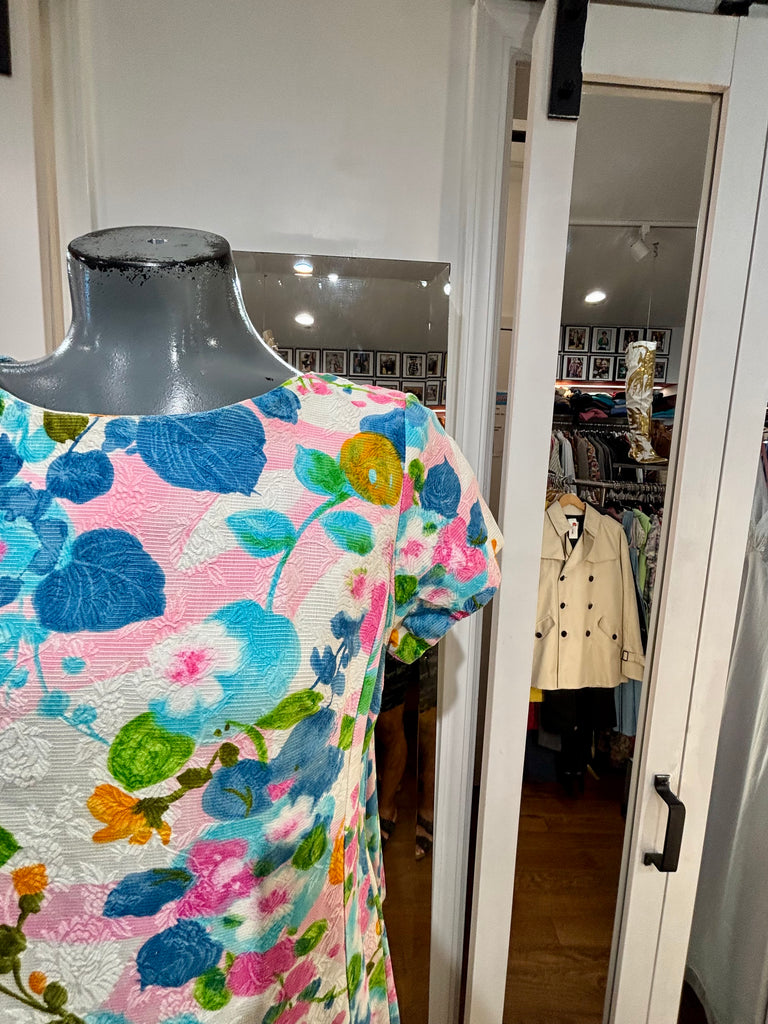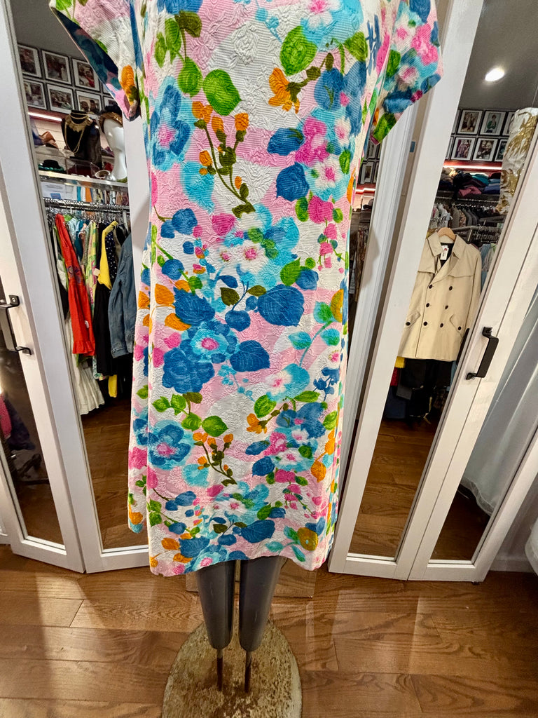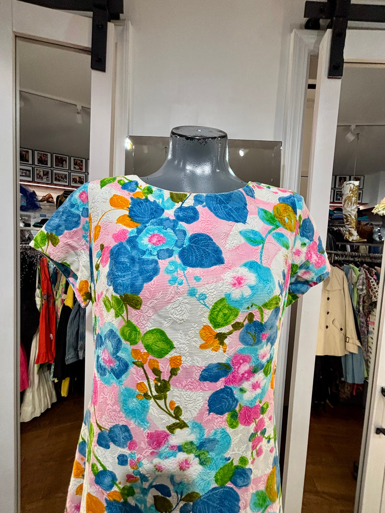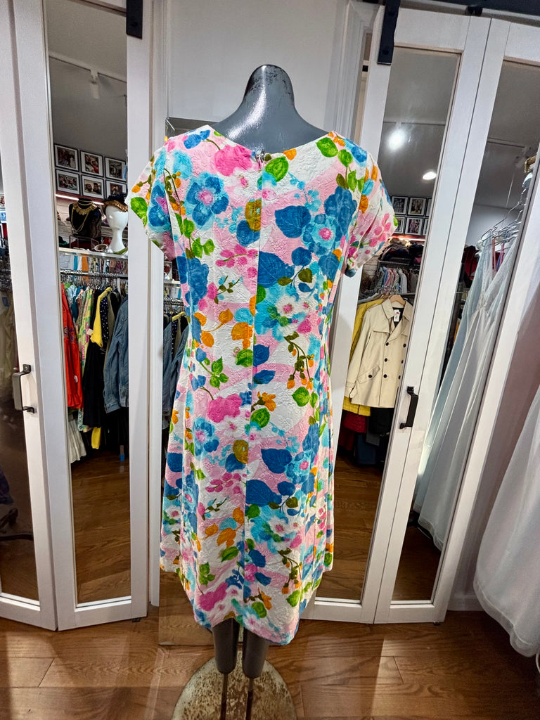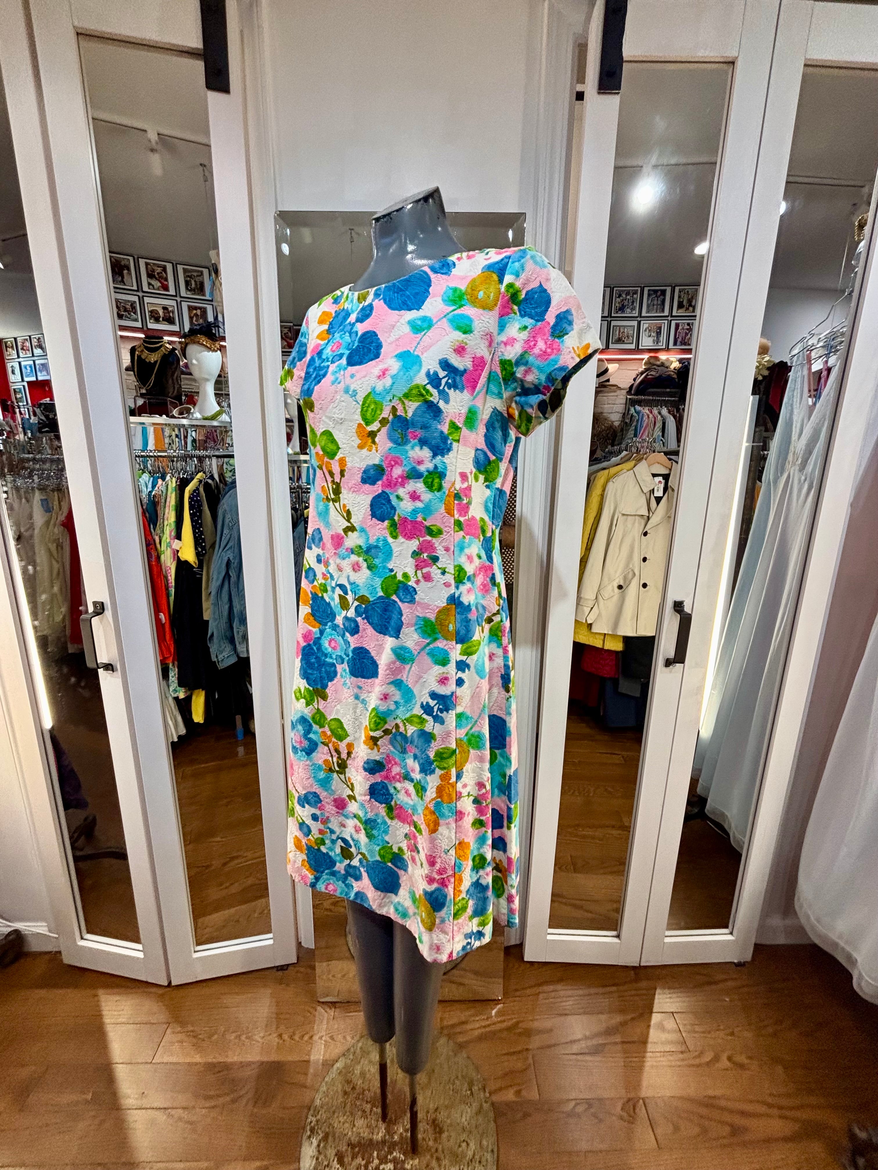 60’s Pink Multicolor Flower Print Cap Sleeve Dress By Alice Of California