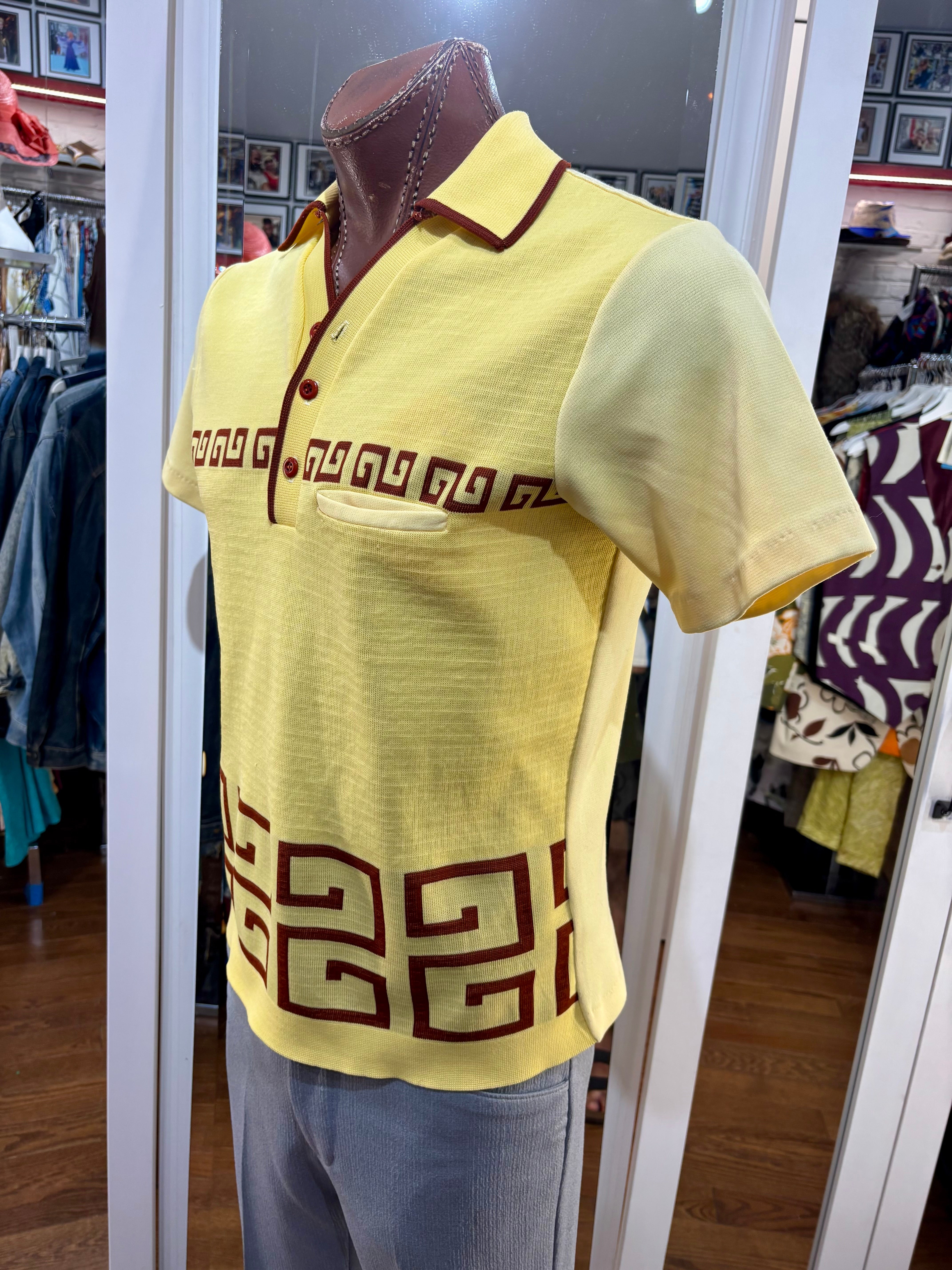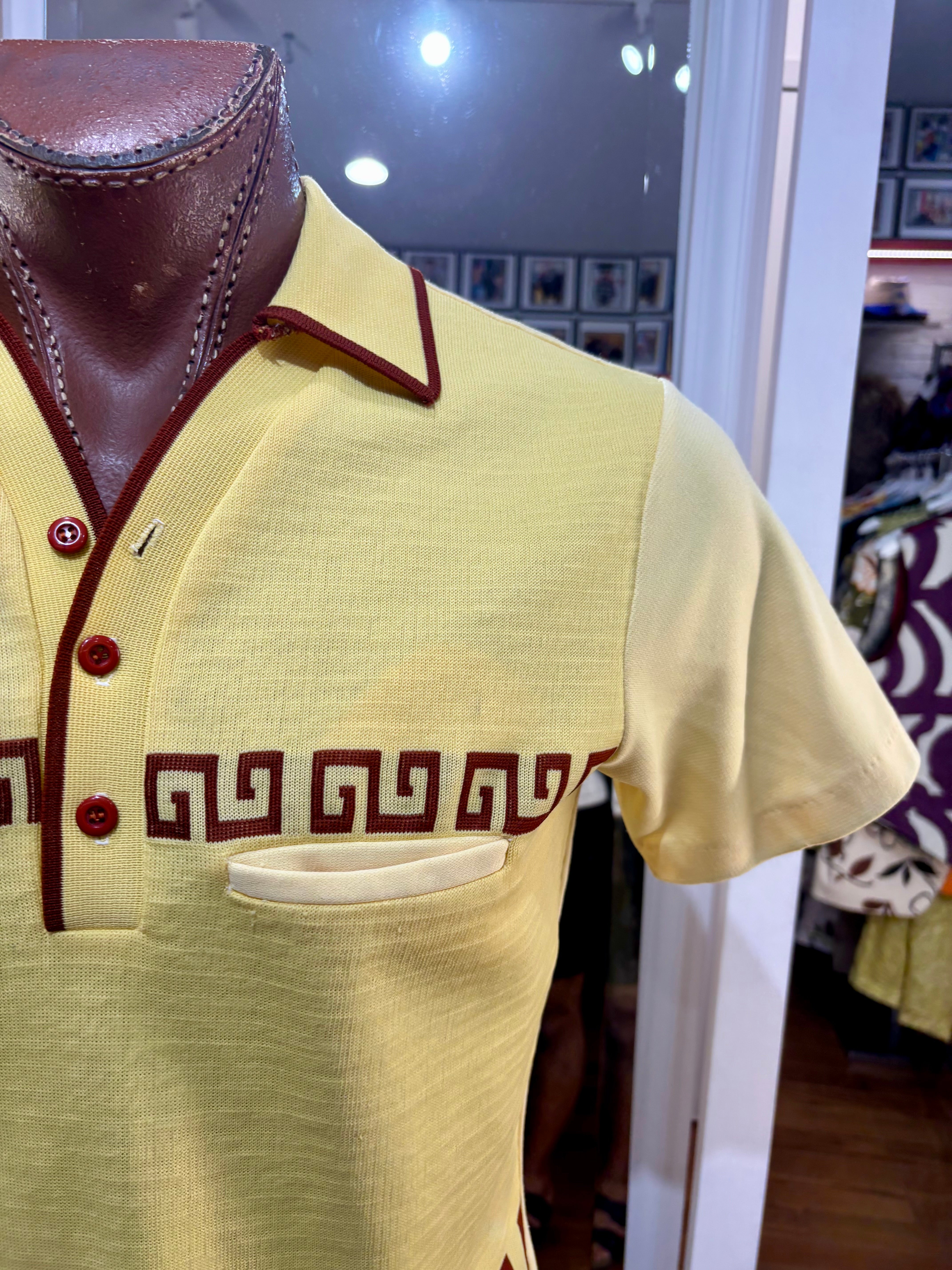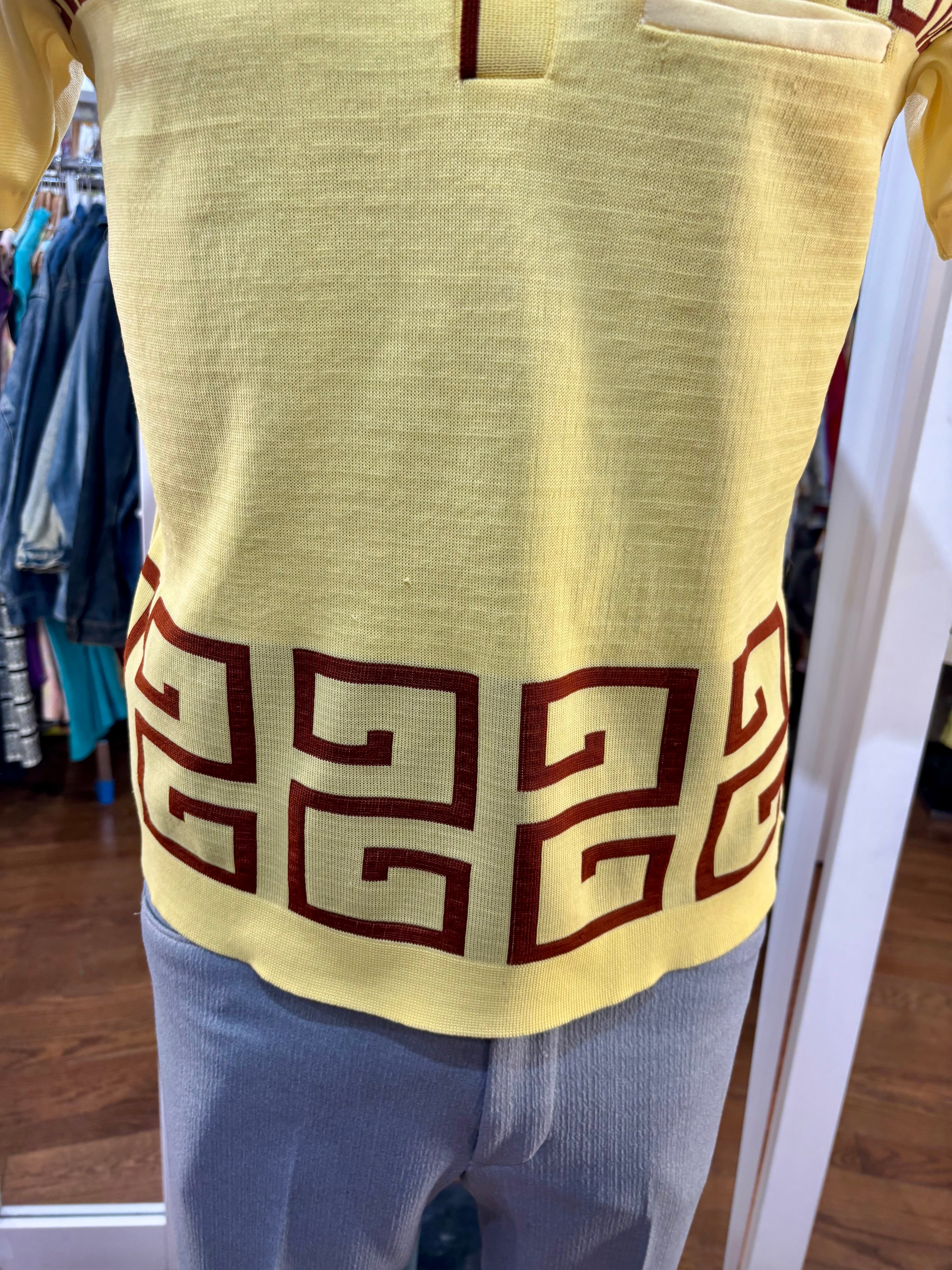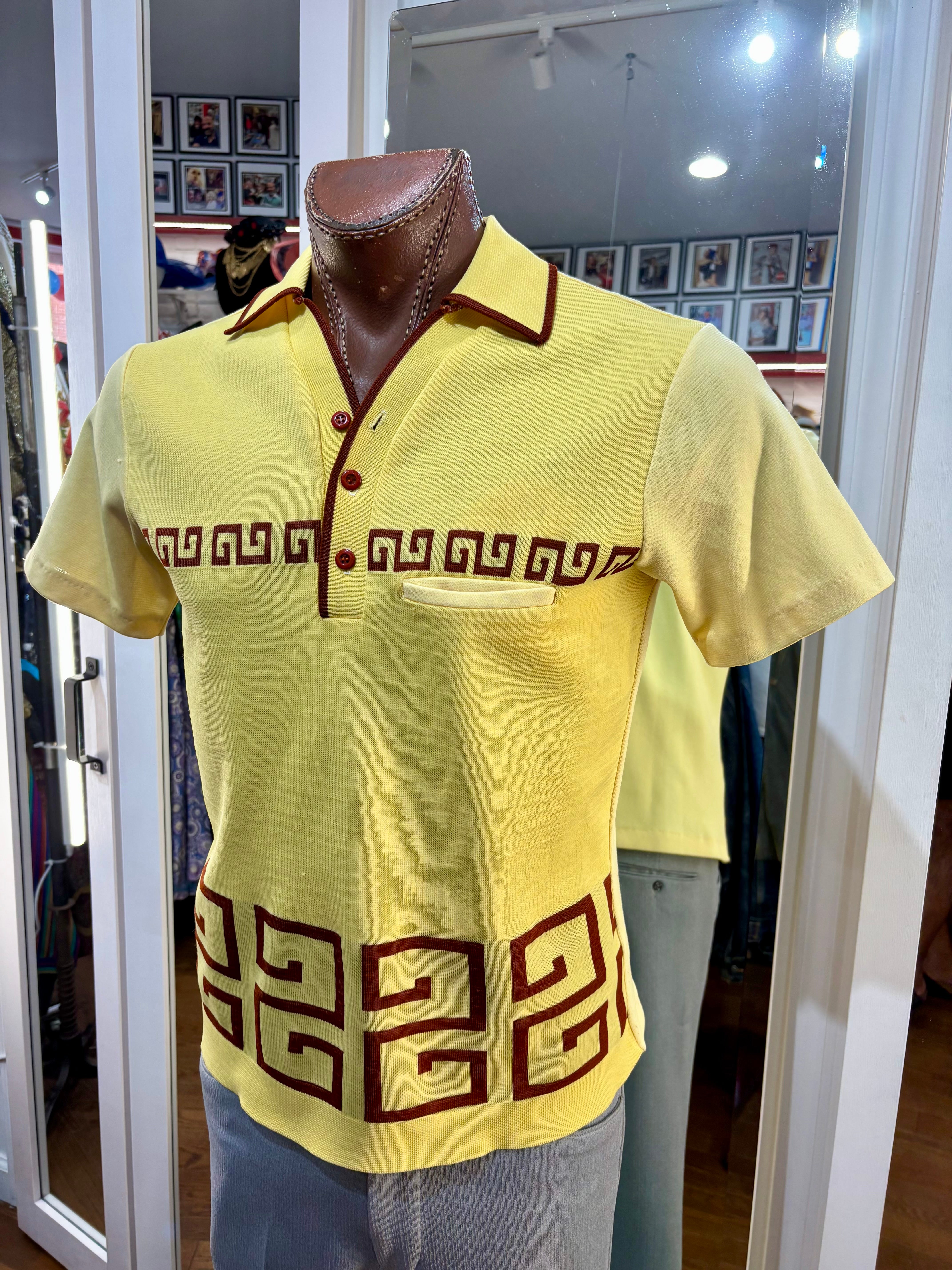 60’s Pale Yellow With Geometric Signs Print Collared Knit Polo Shirt