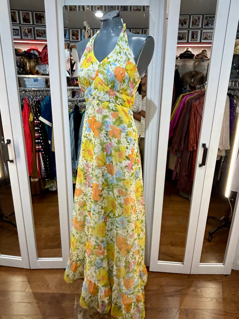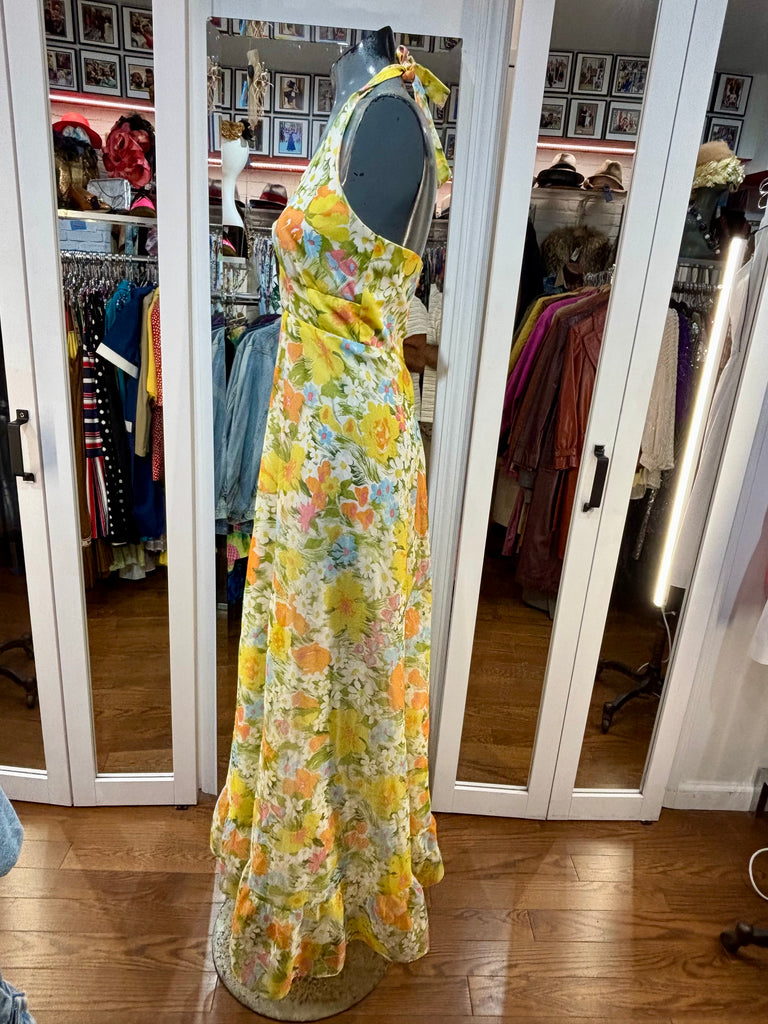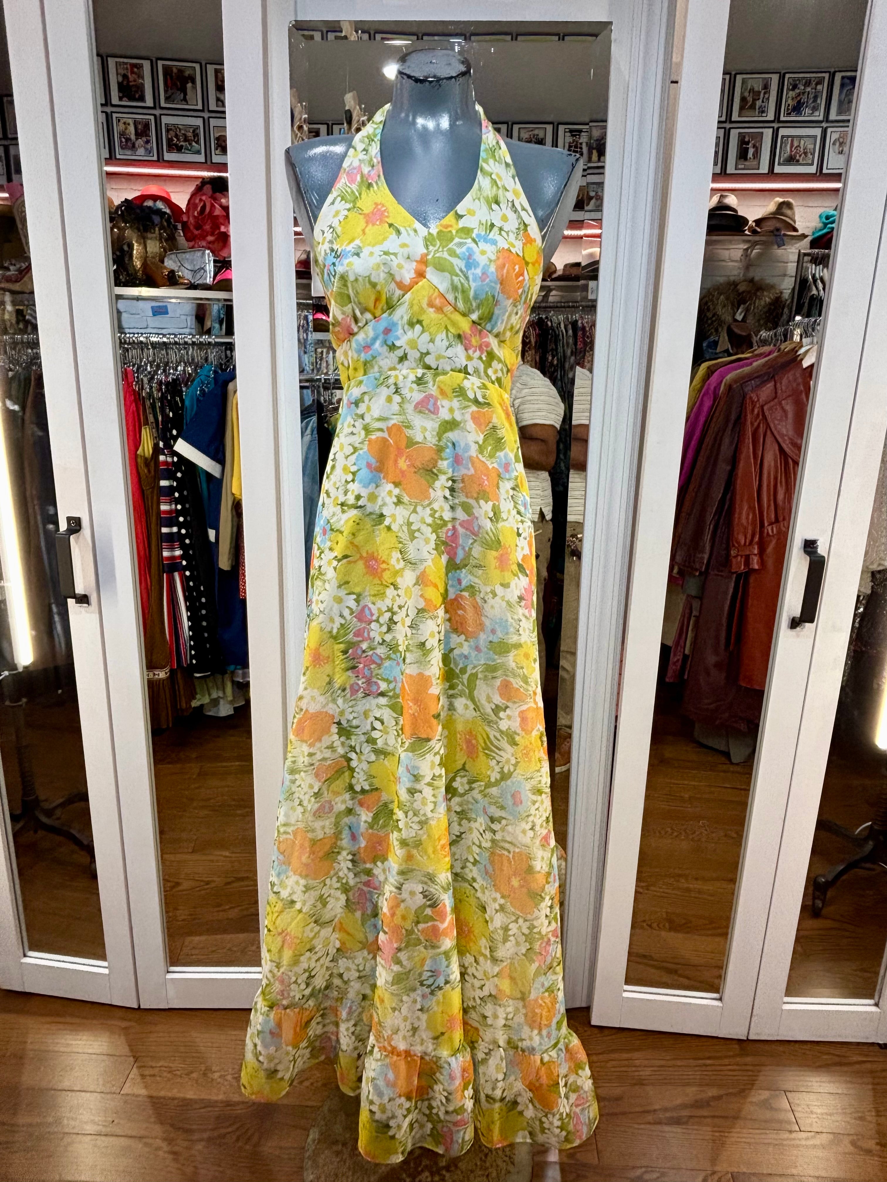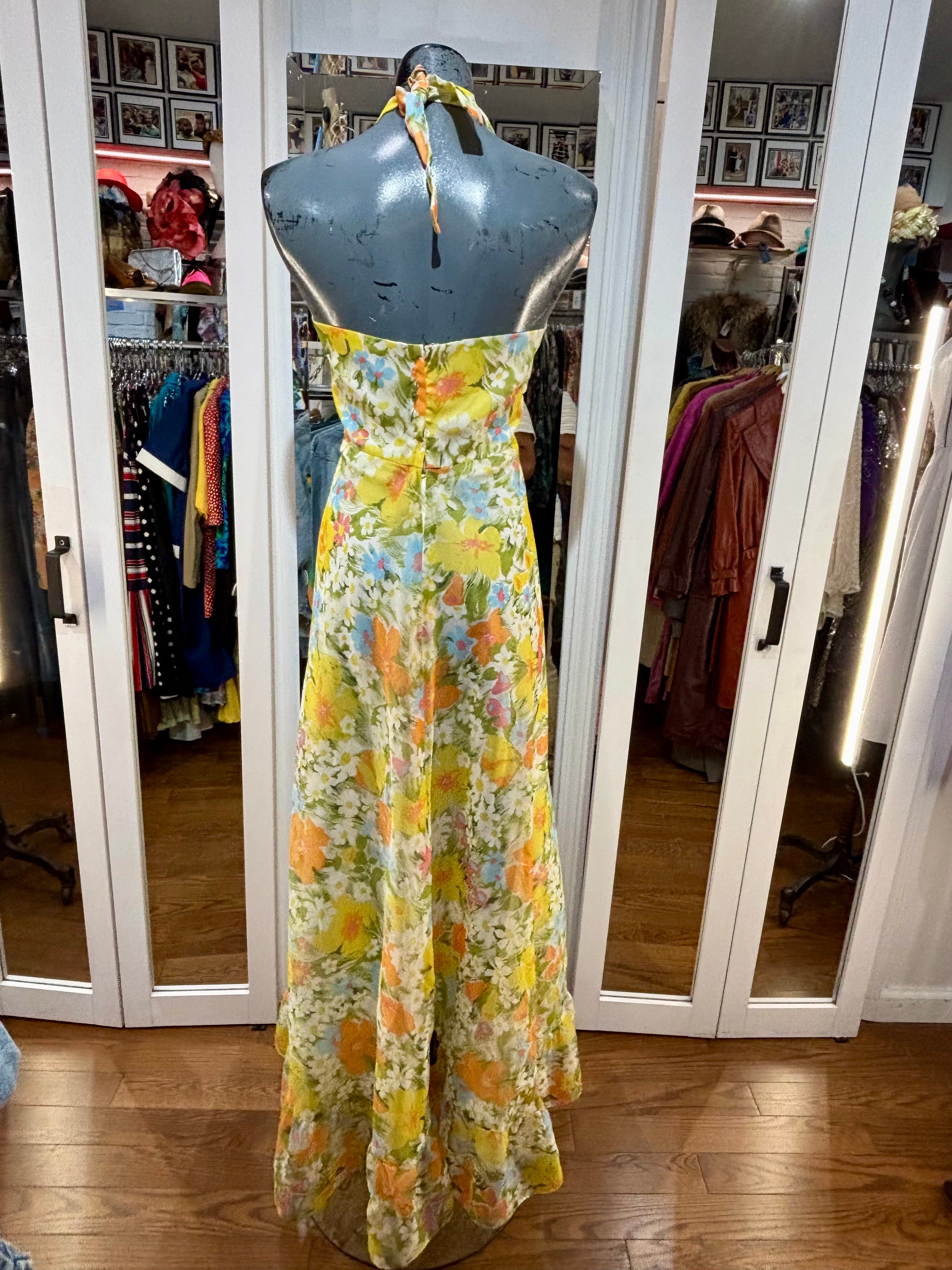 70’s Yellow Sheer Multicolor Flower Print Halter Maxi Dress