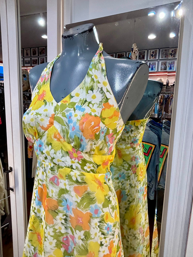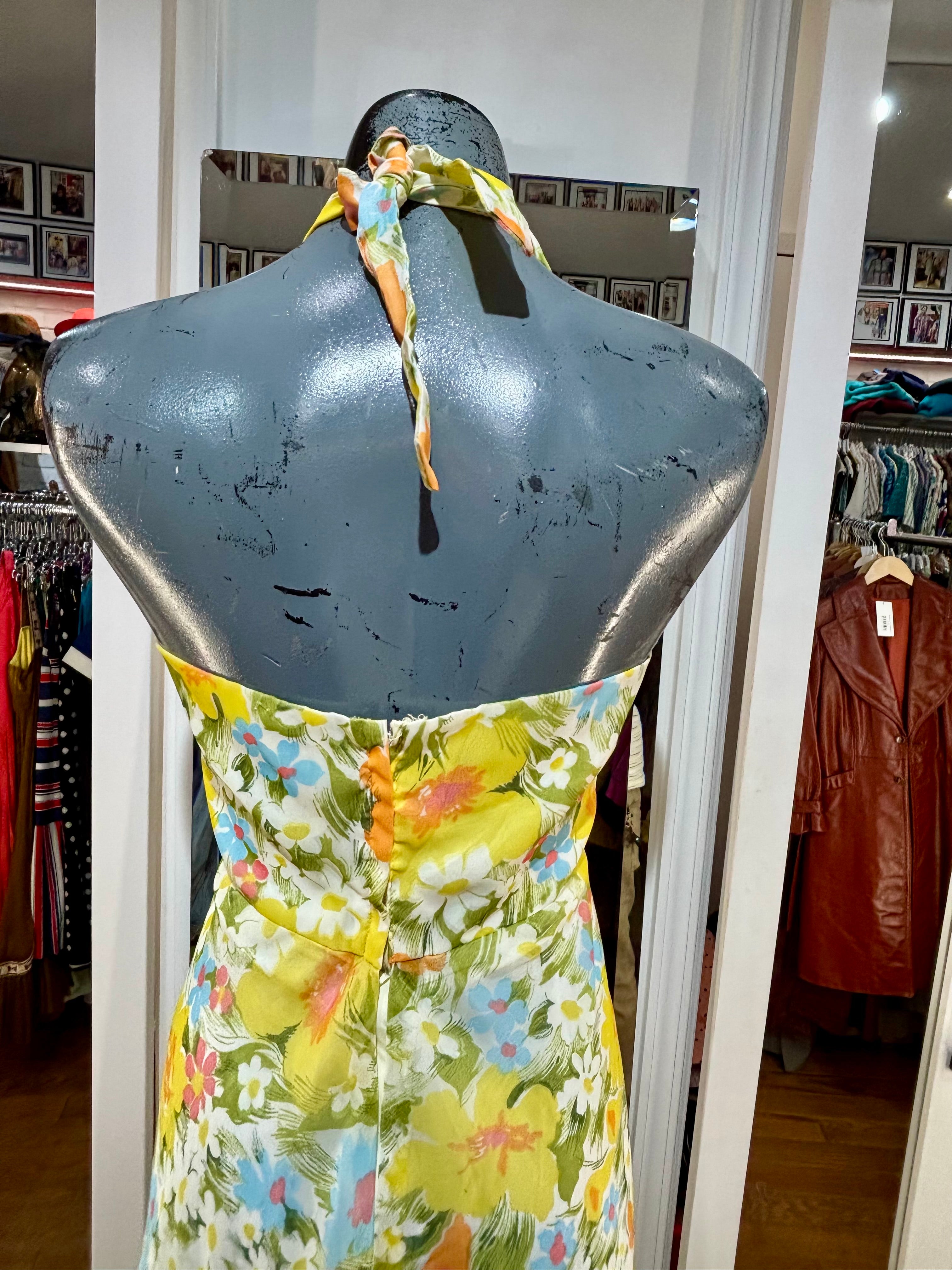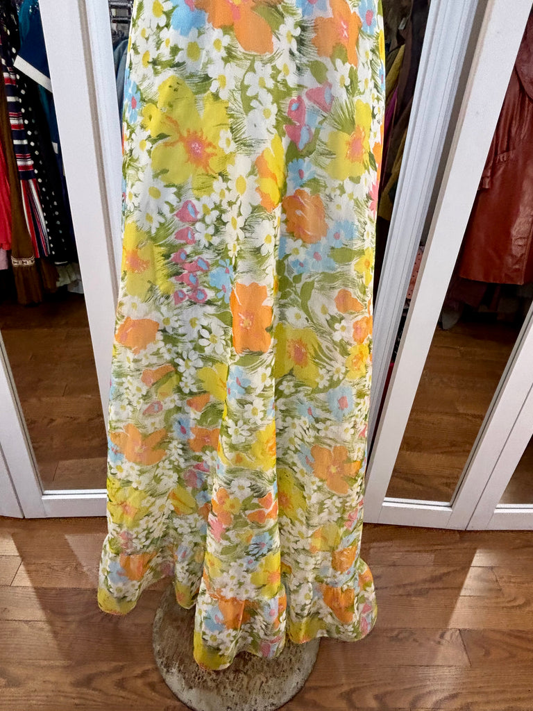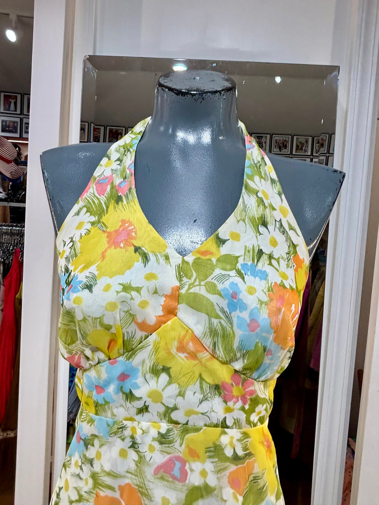 70’s Yellow Sheer Multicolor Flower Print Halter Maxi Dress