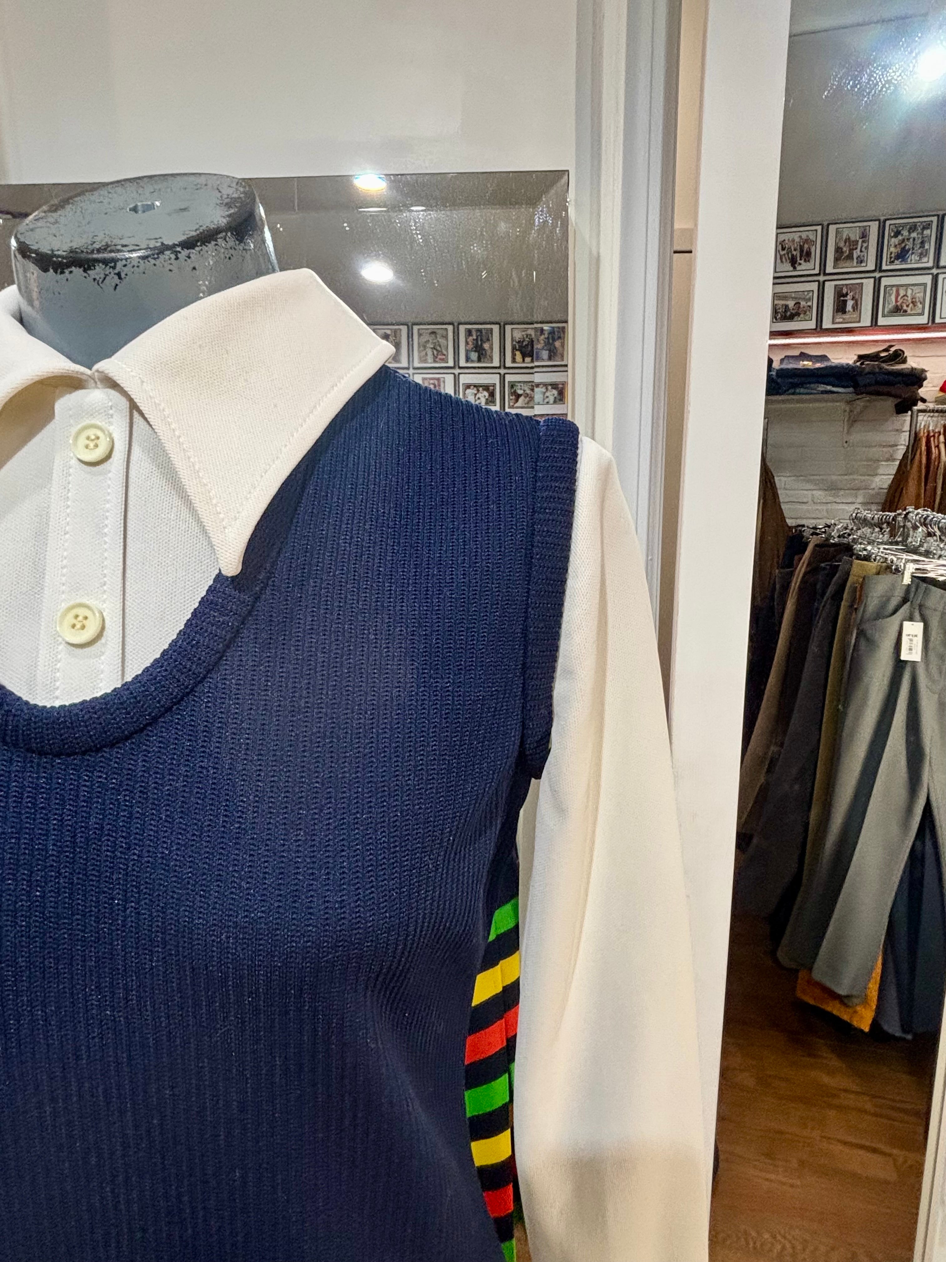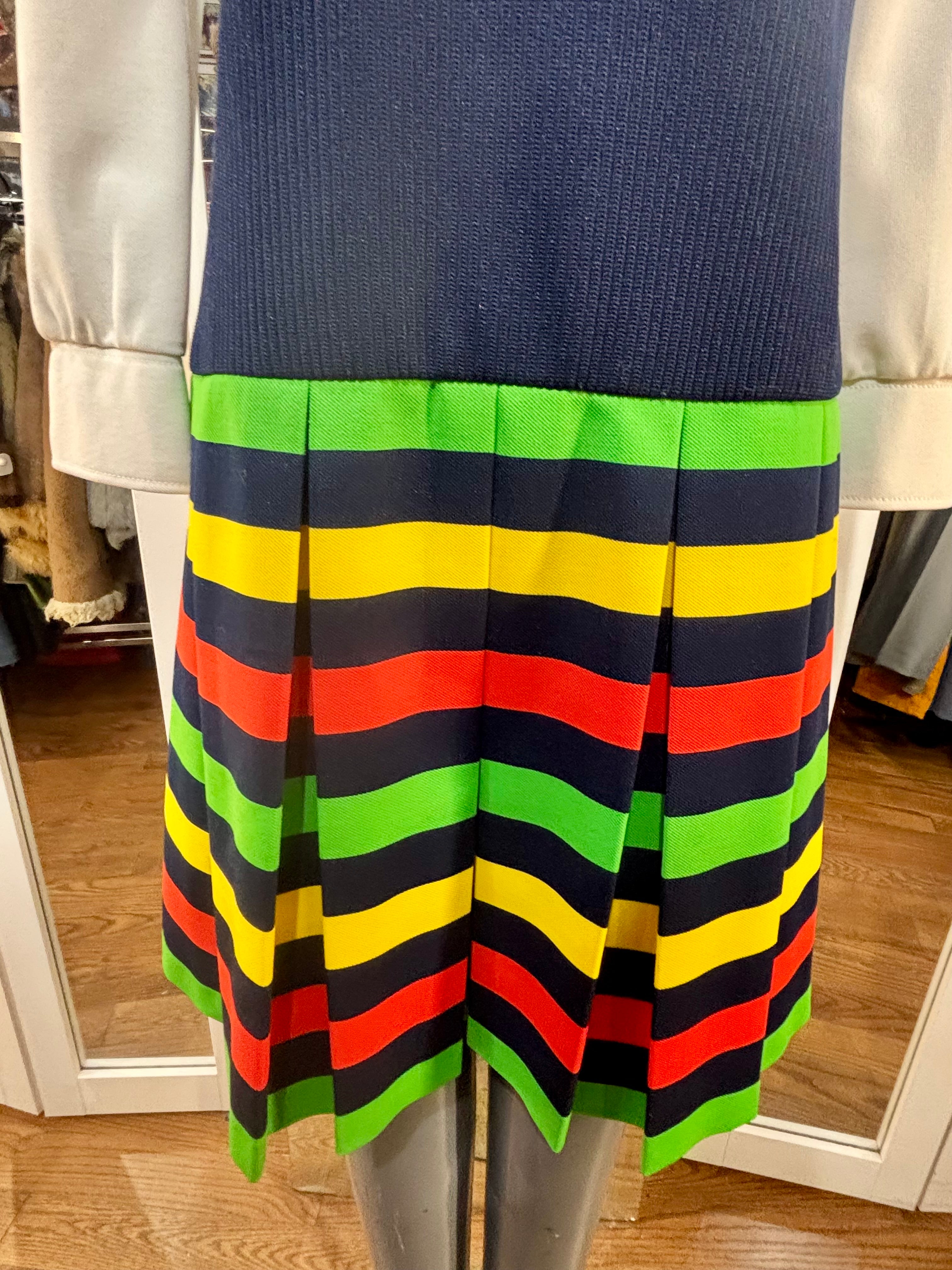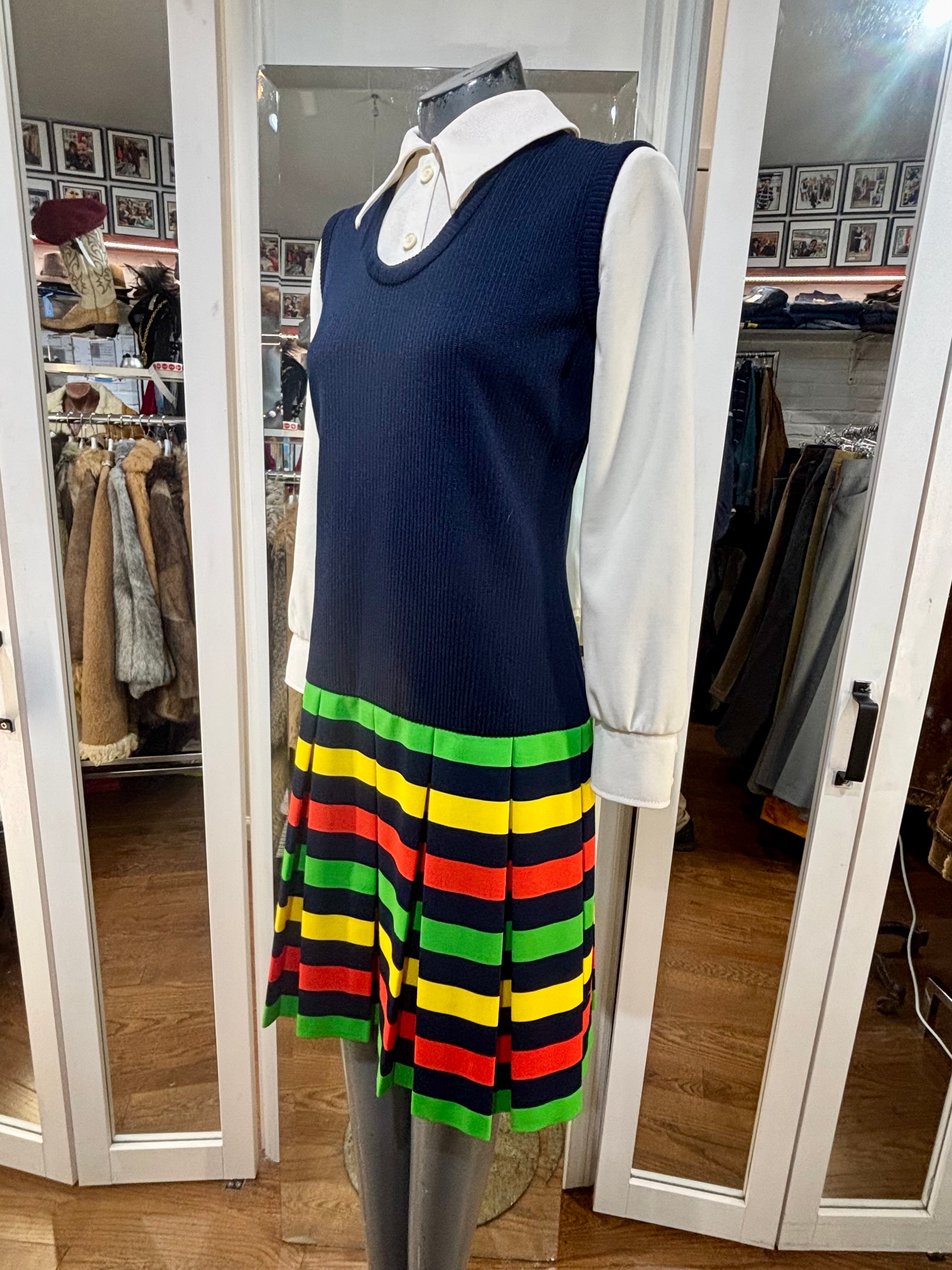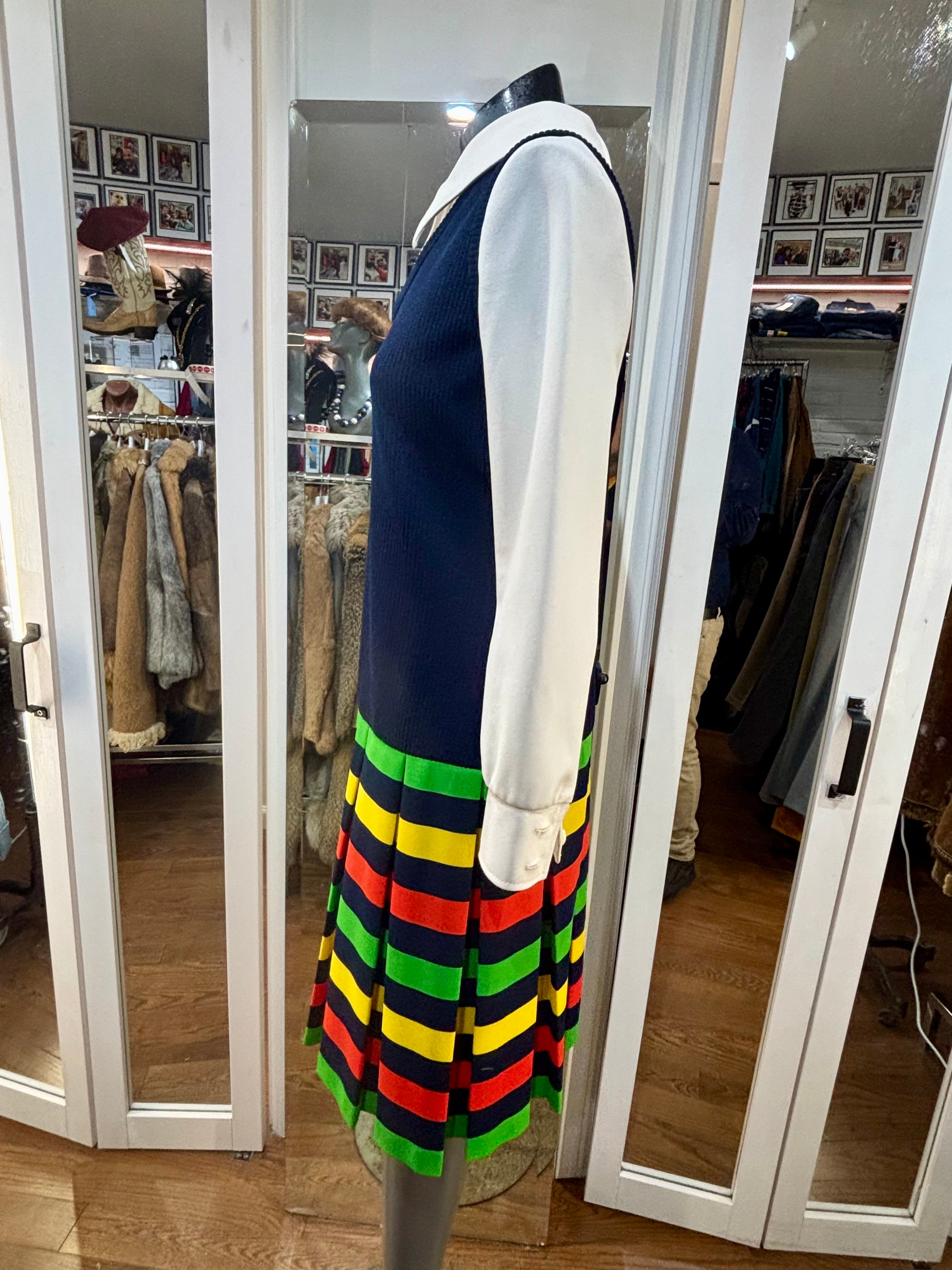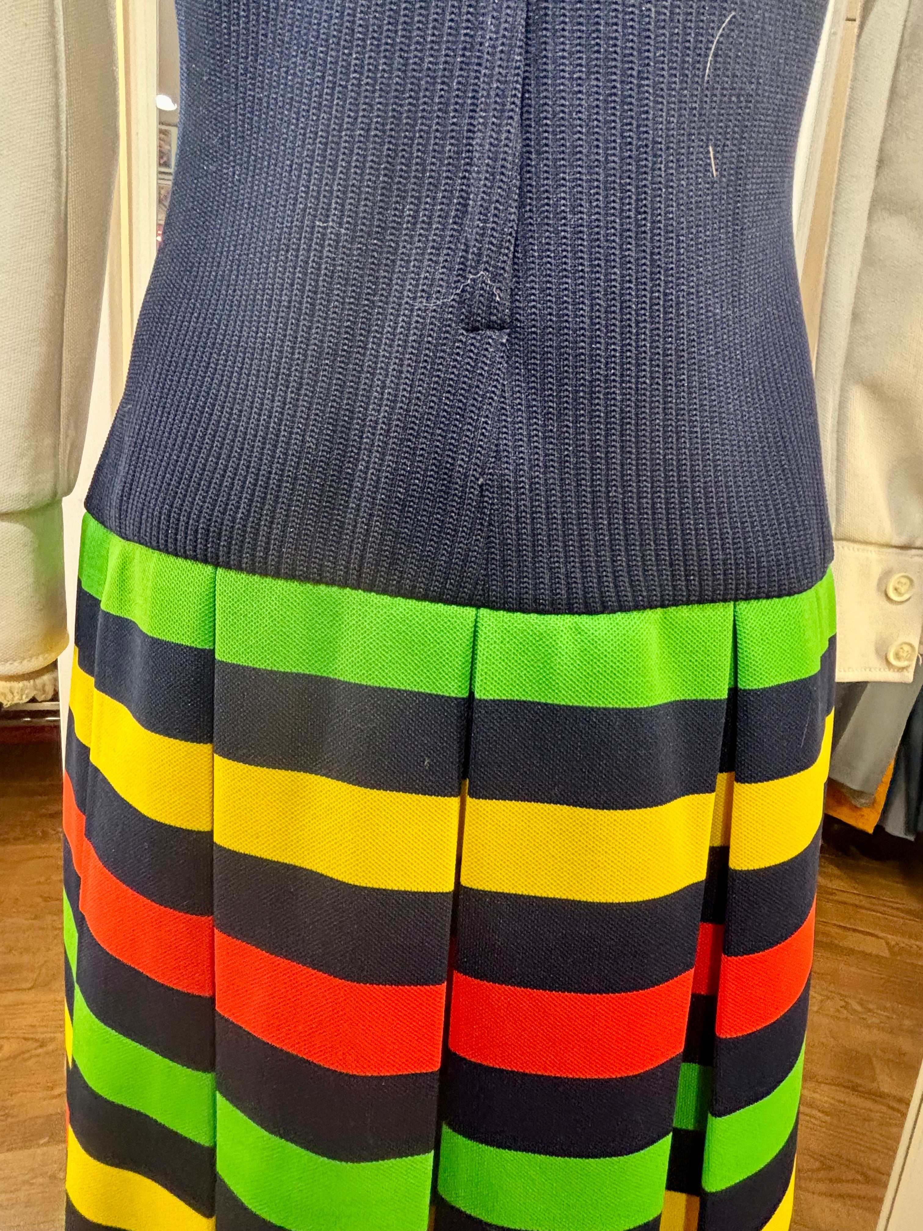 70’s Navy Multicolor Stripes Dress With under Shirt Illusion By Butte Knit