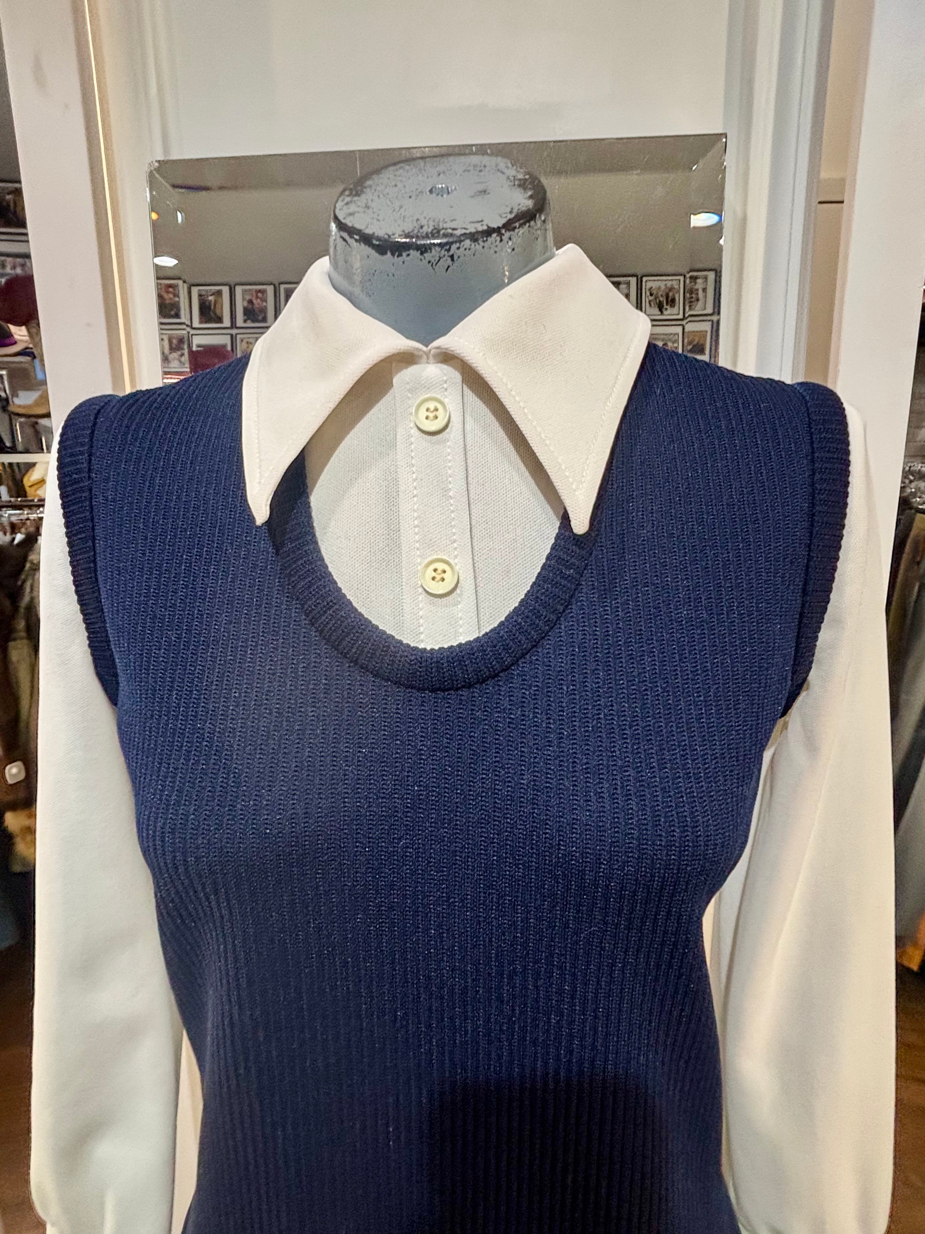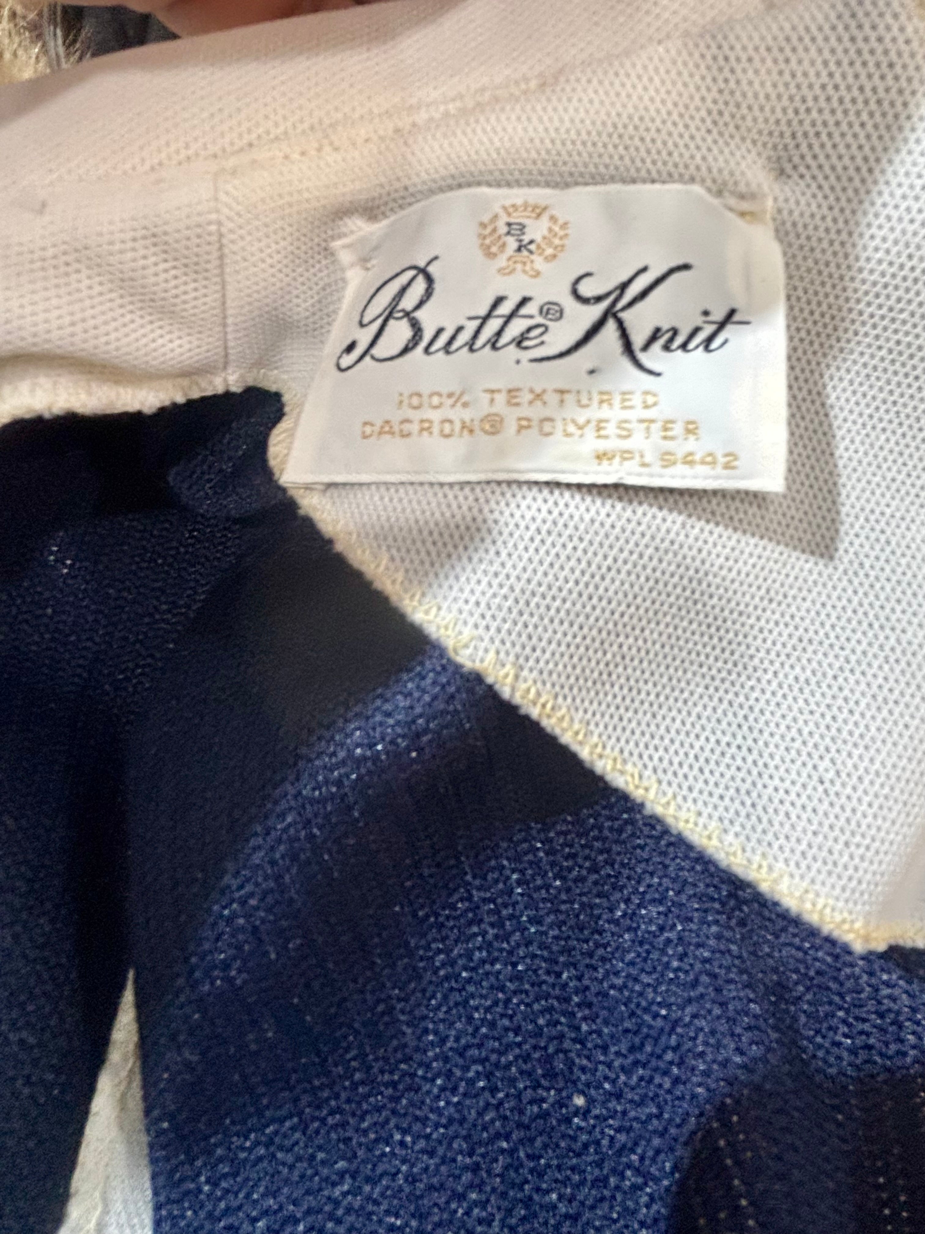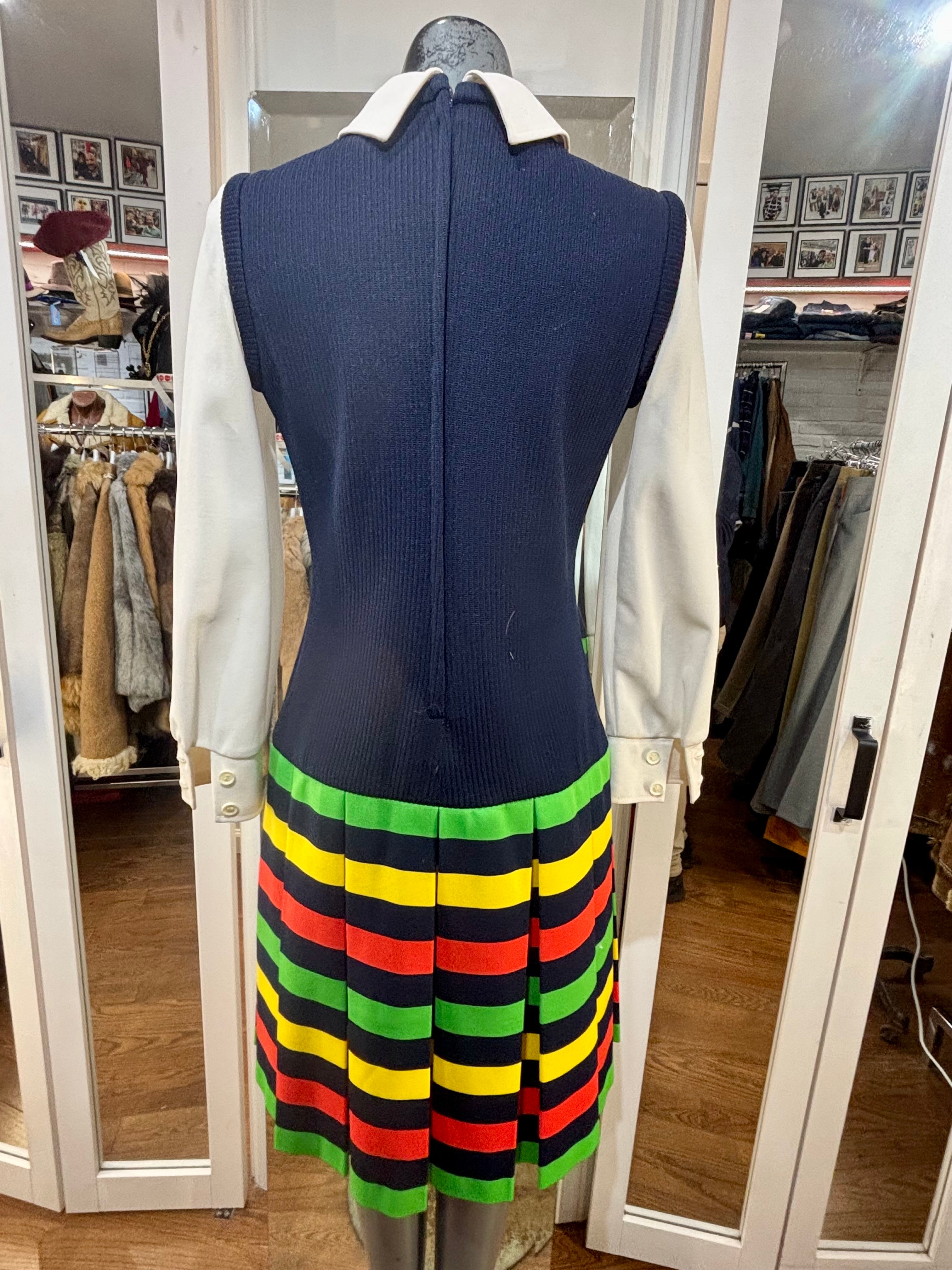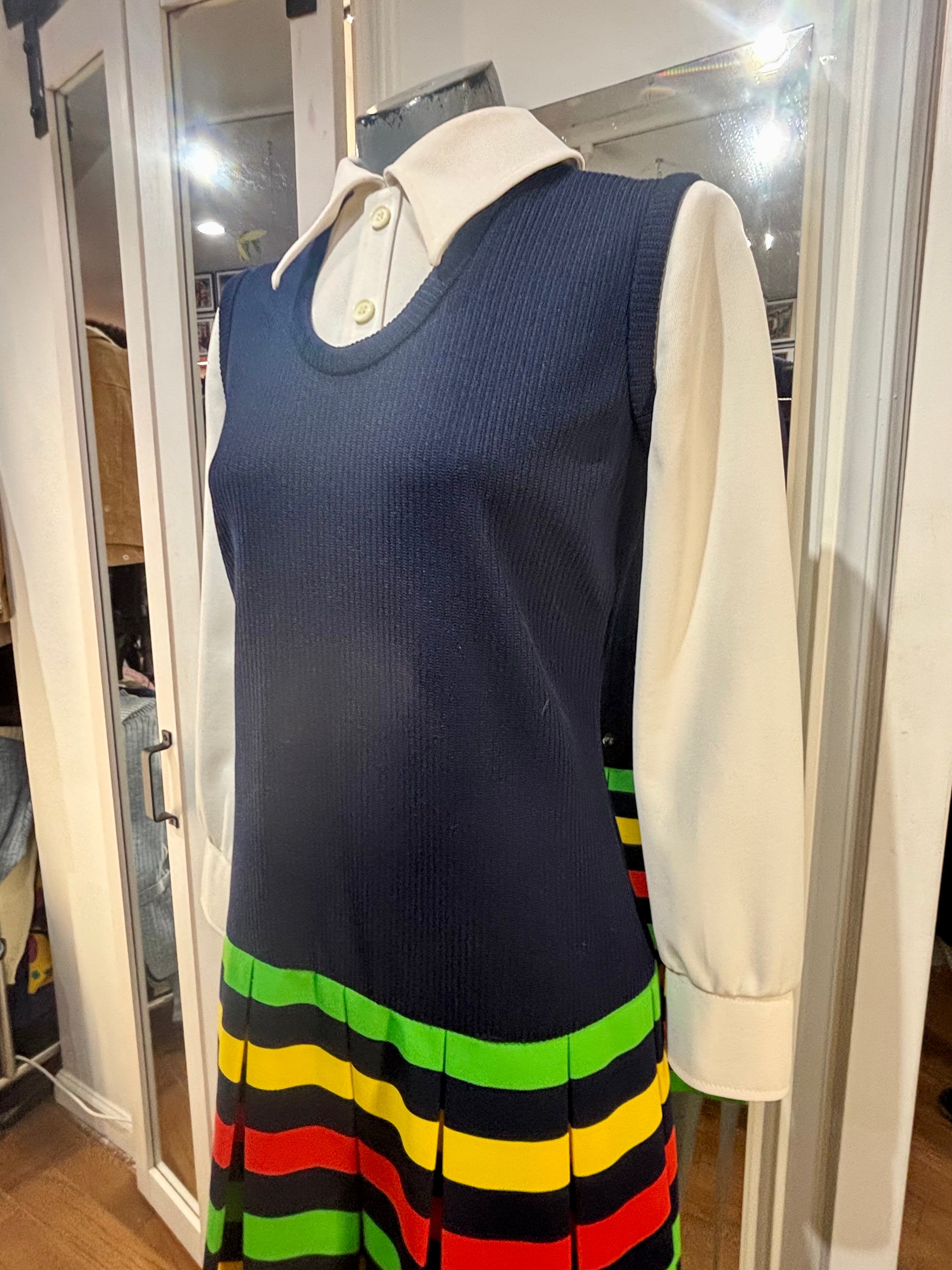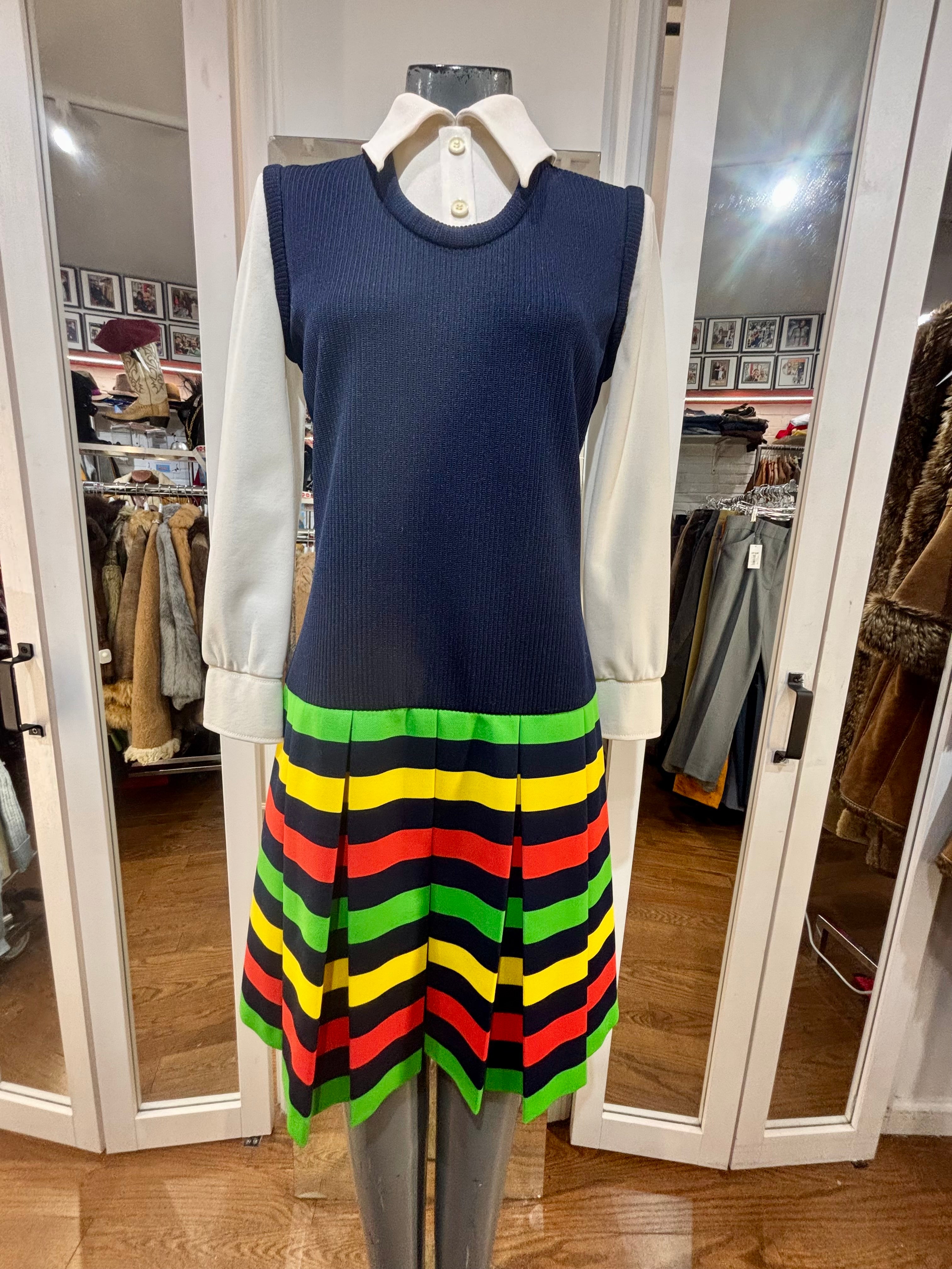 70’s Navy Multicolor Stripes Dress With under Shirt Illusion By Butte Knit
