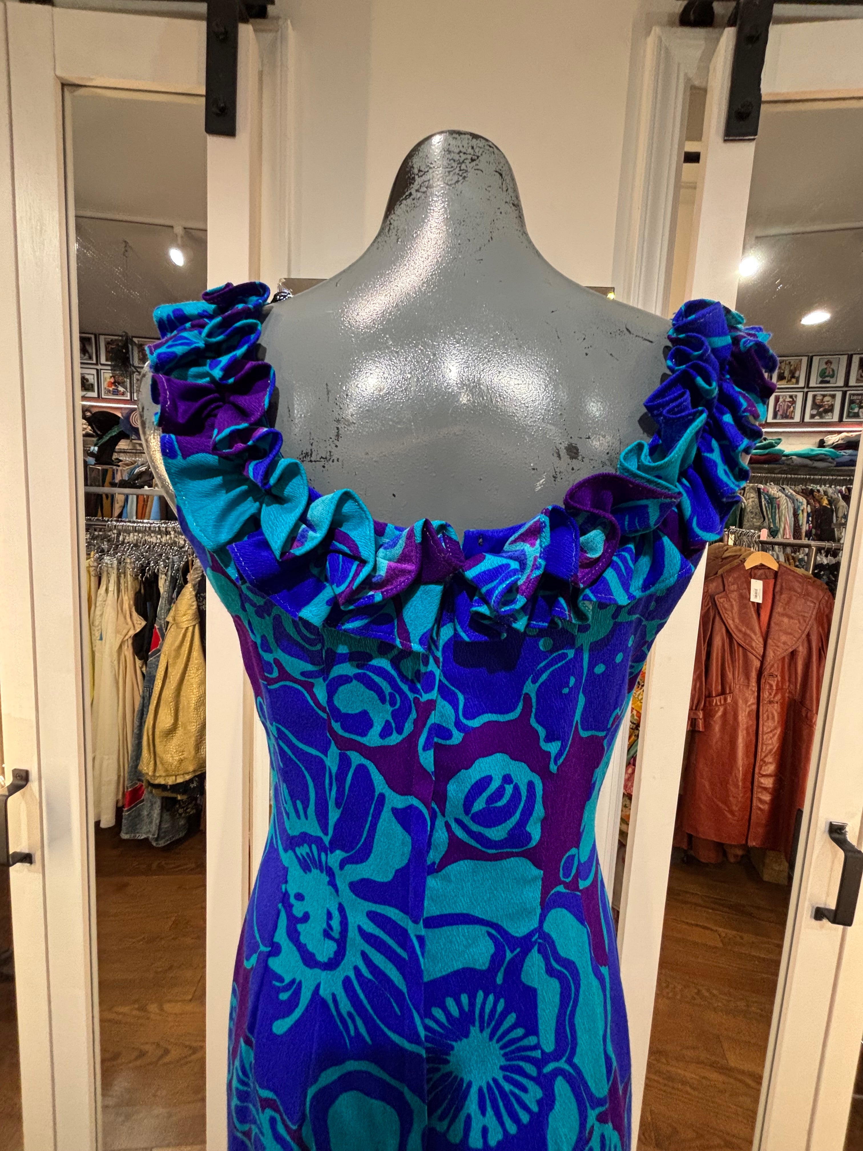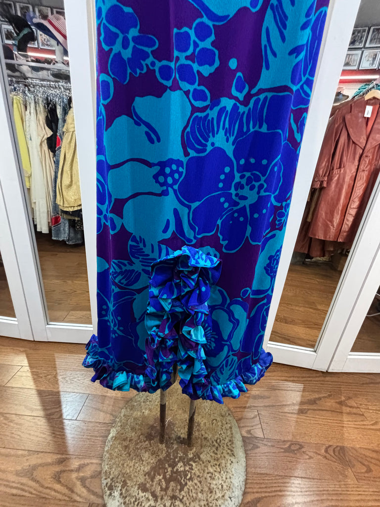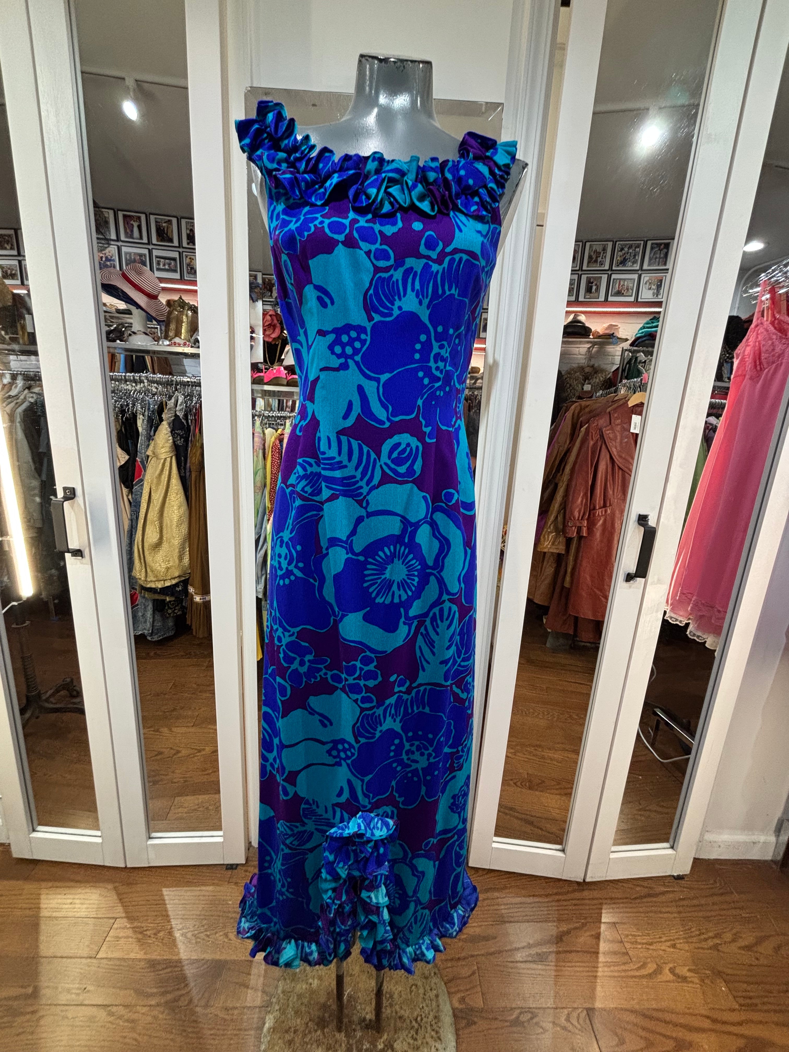 70’s Royal Blue & Turquoise Hawaii Flower Maxi Dress With Ruffles By Waltah Clarkés