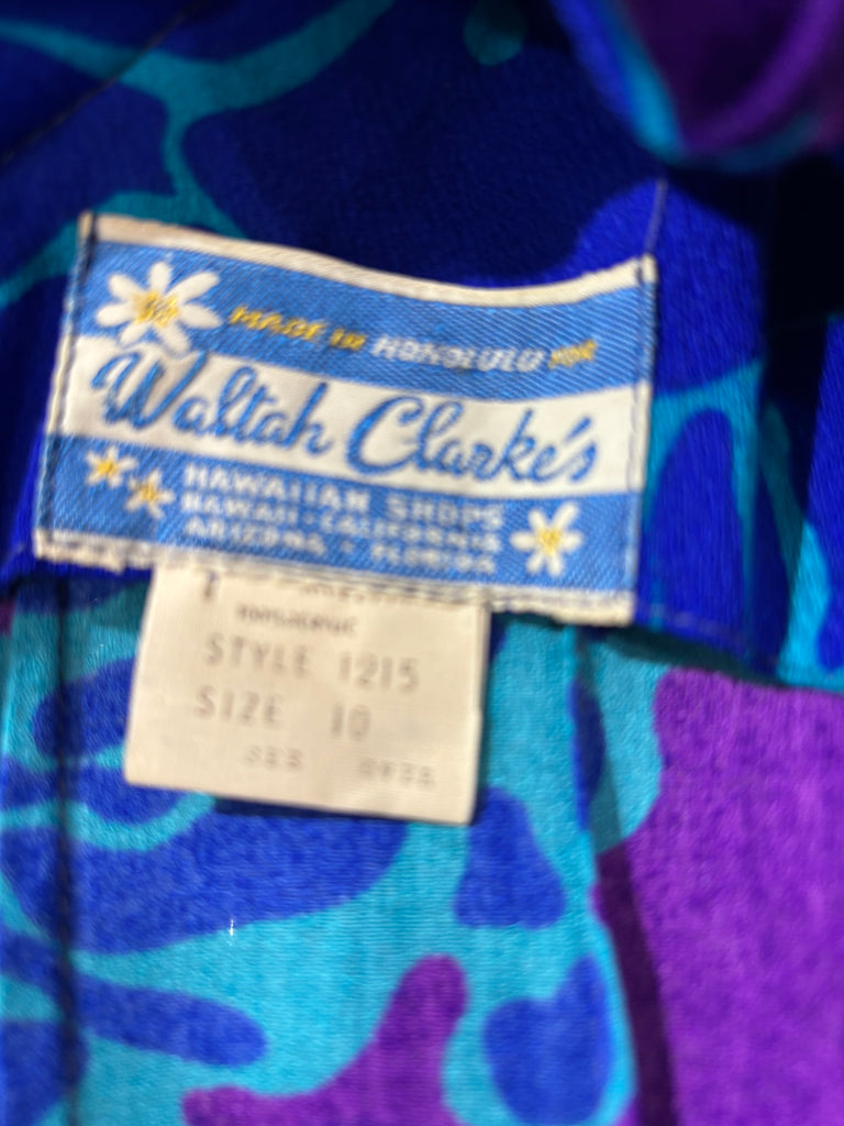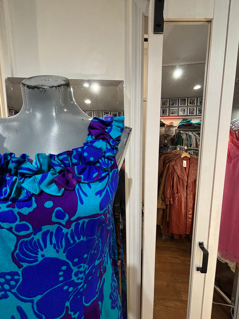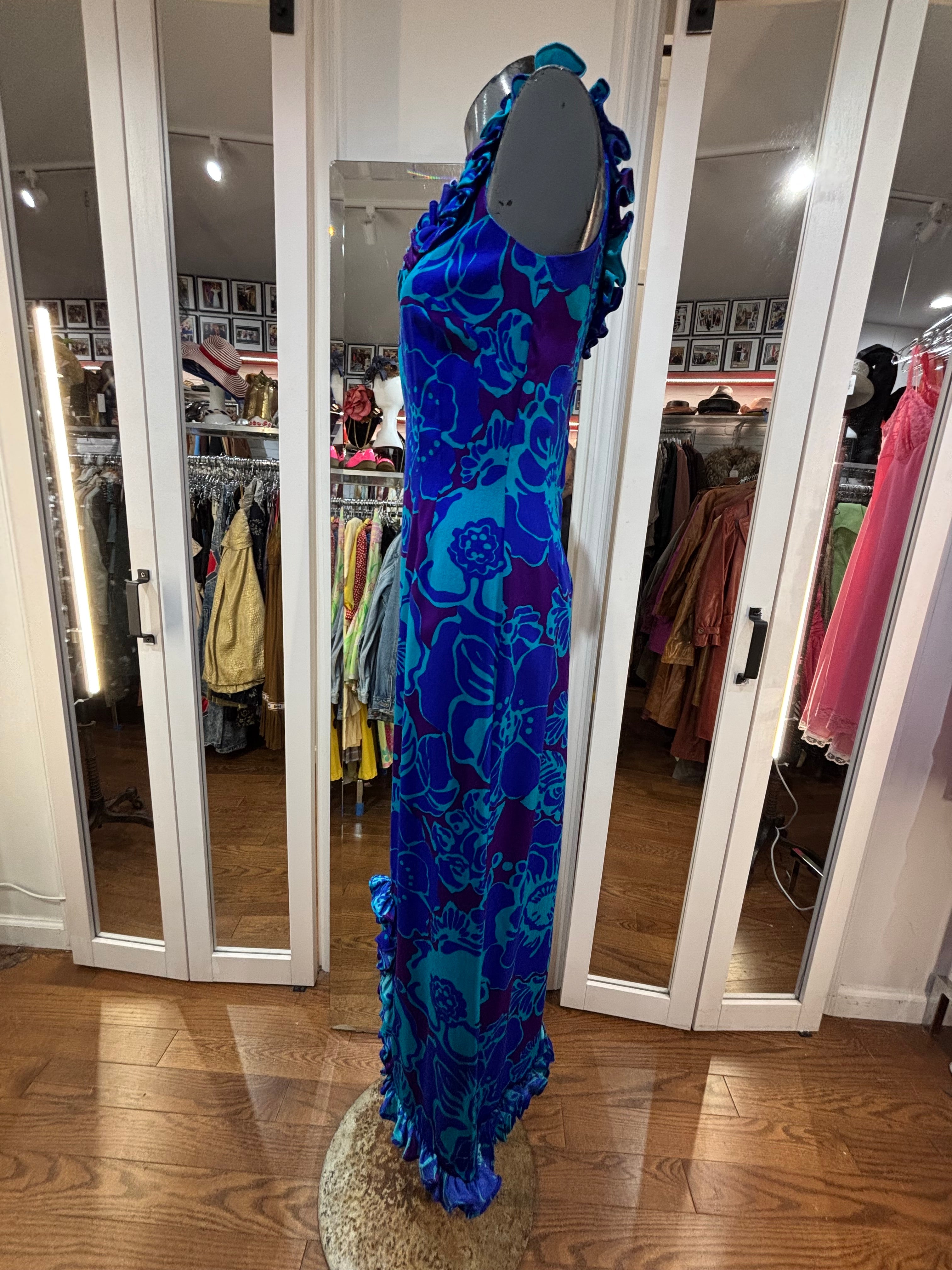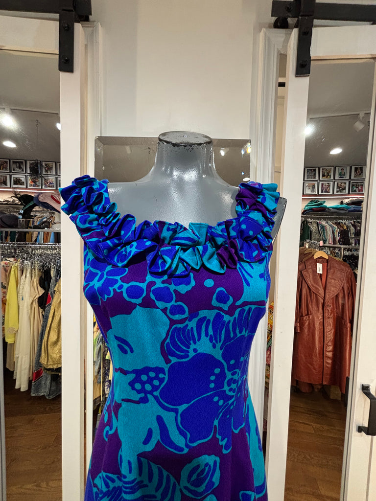 70’s Royal Blue & Turquoise Hawaii Flower Maxi Dress With Ruffles By Waltah Clarkés