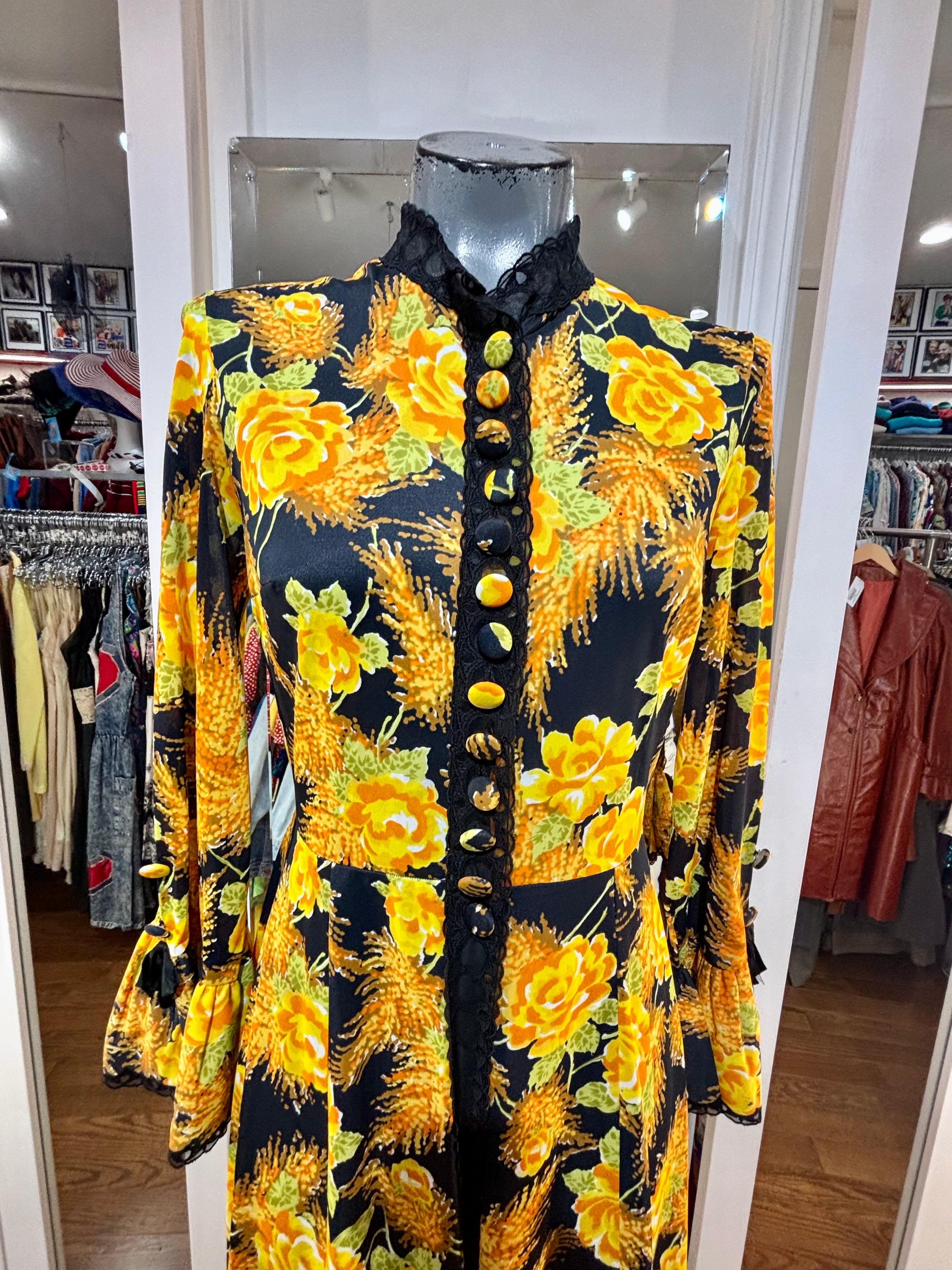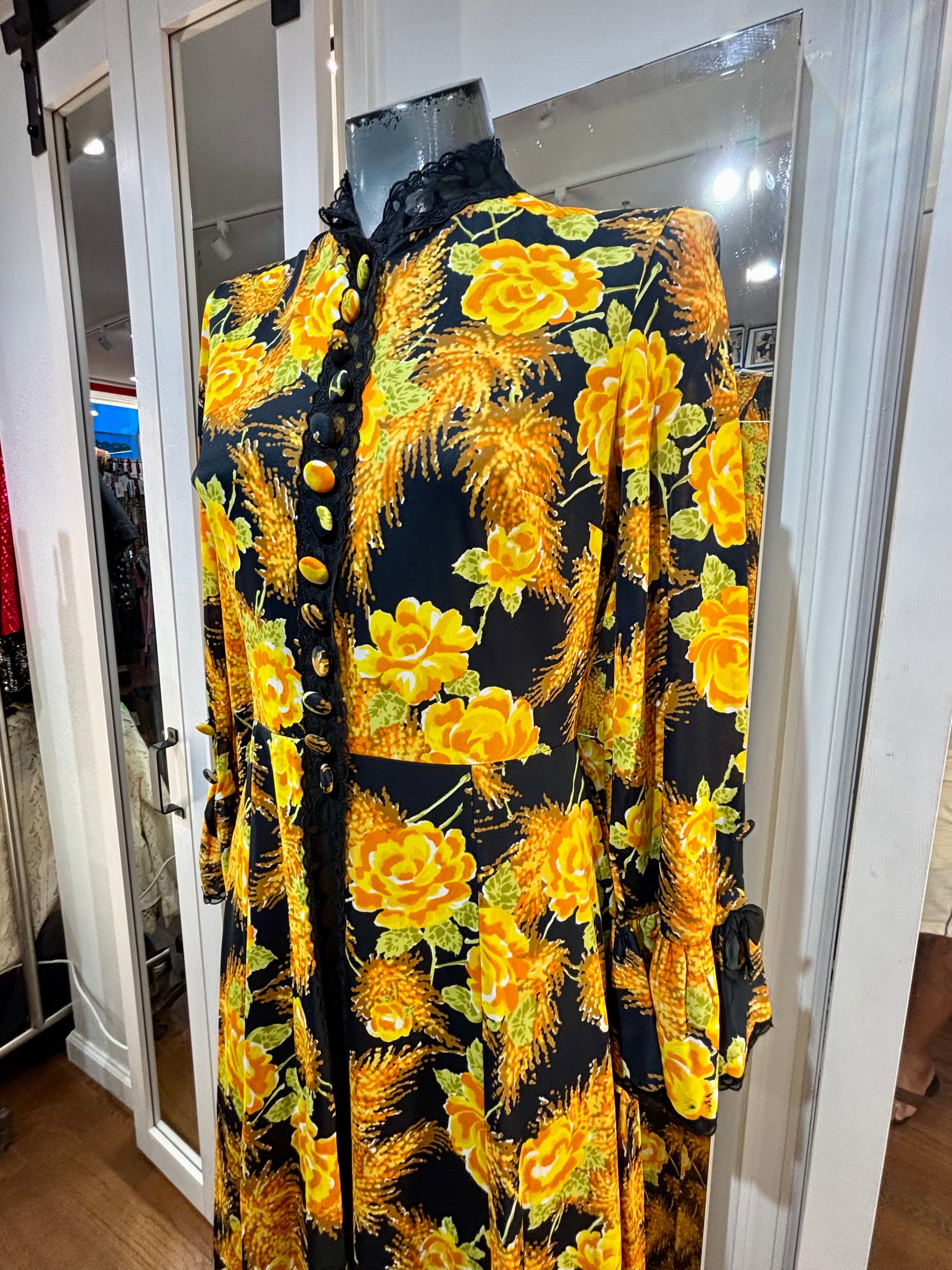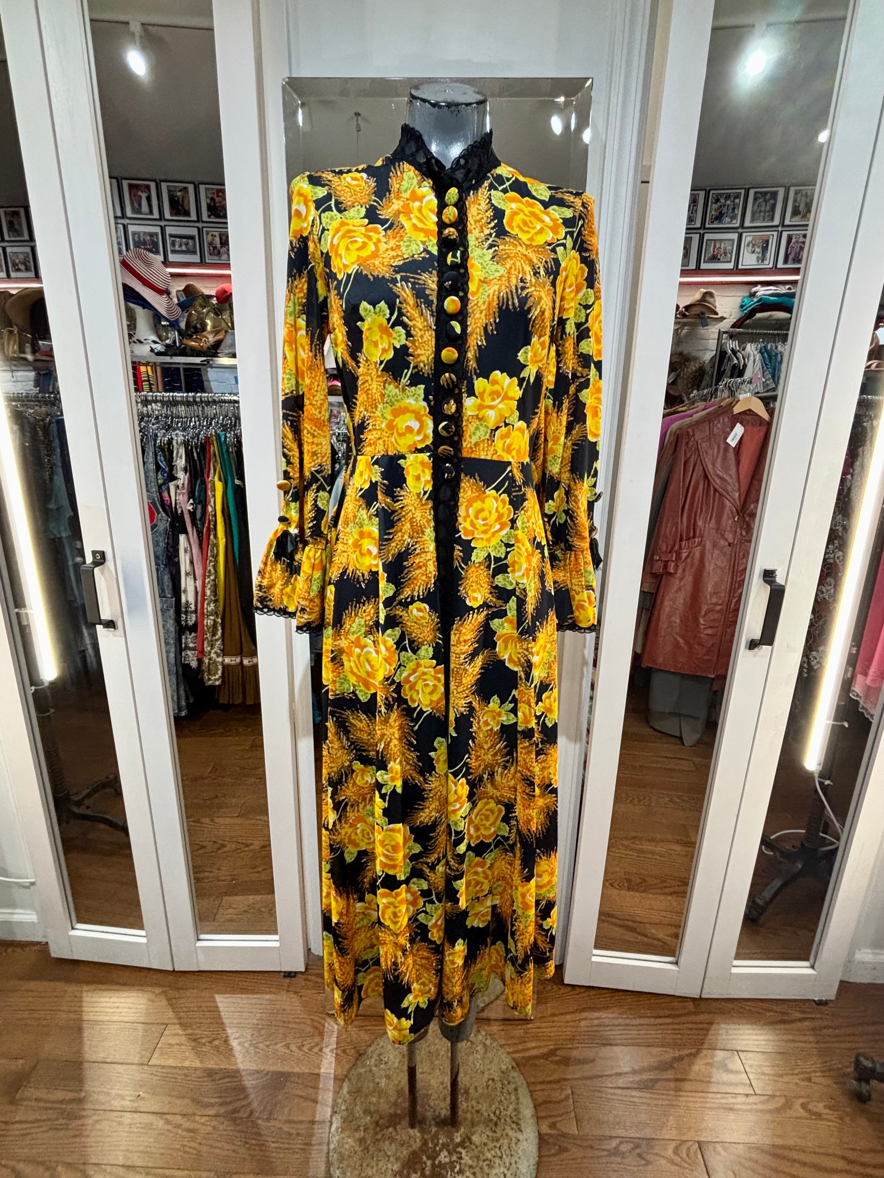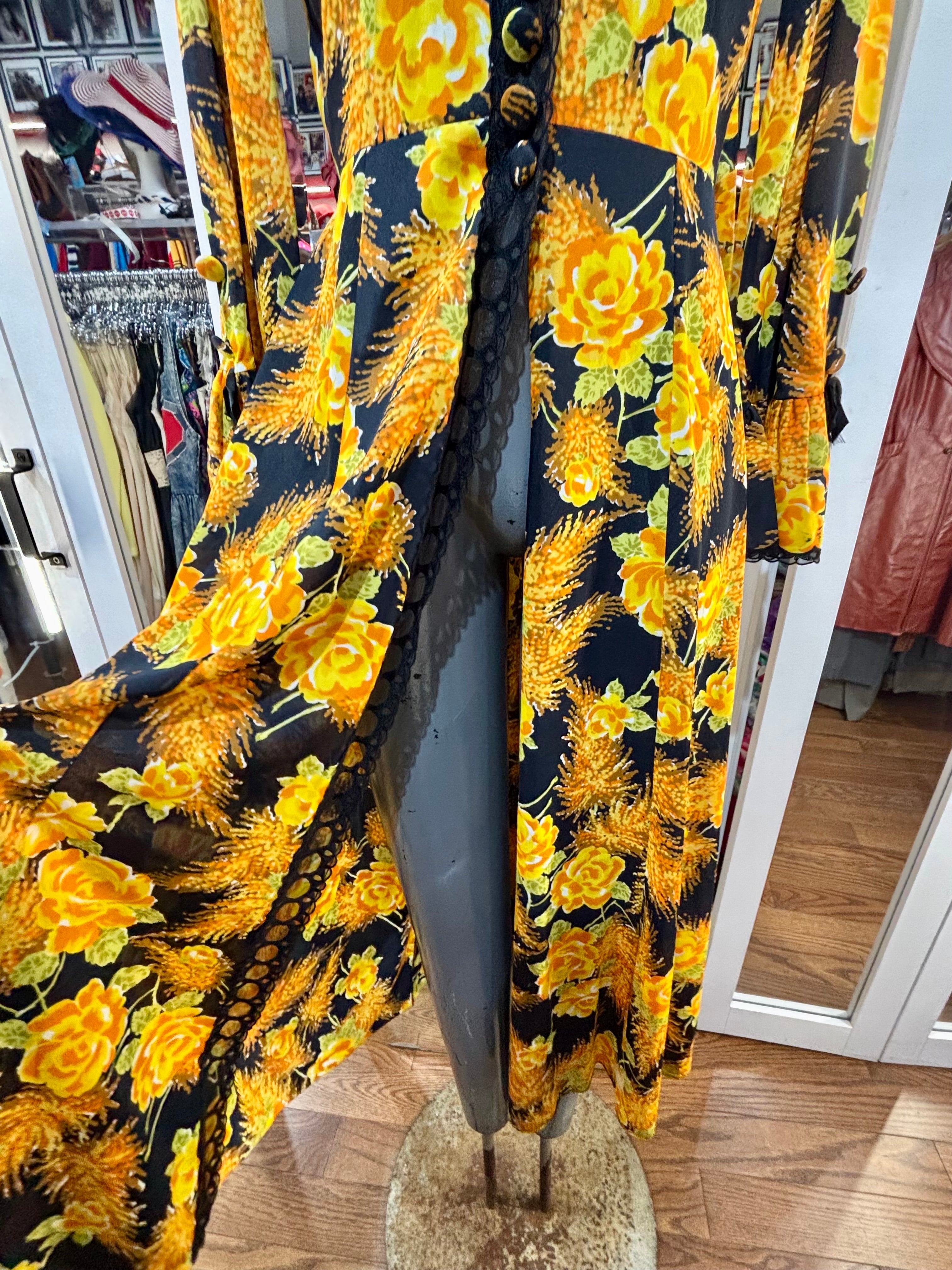 70’s Black And Yellow Sheer Flower Print Front Button Dress With Bell Sleeves