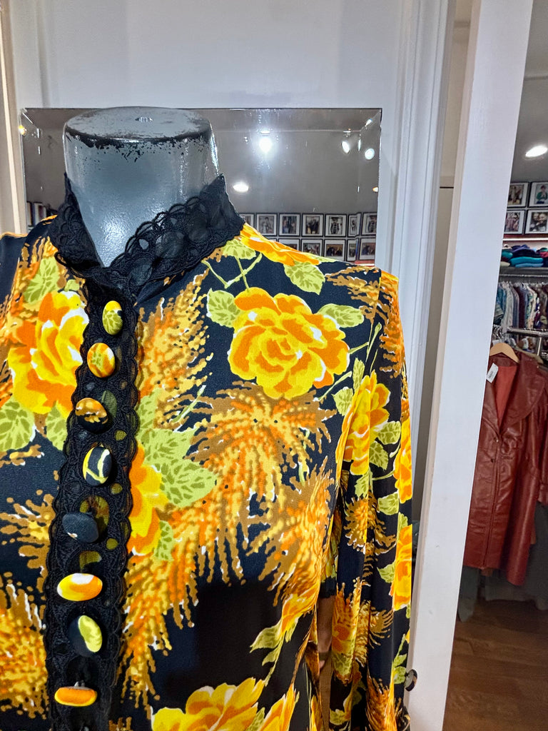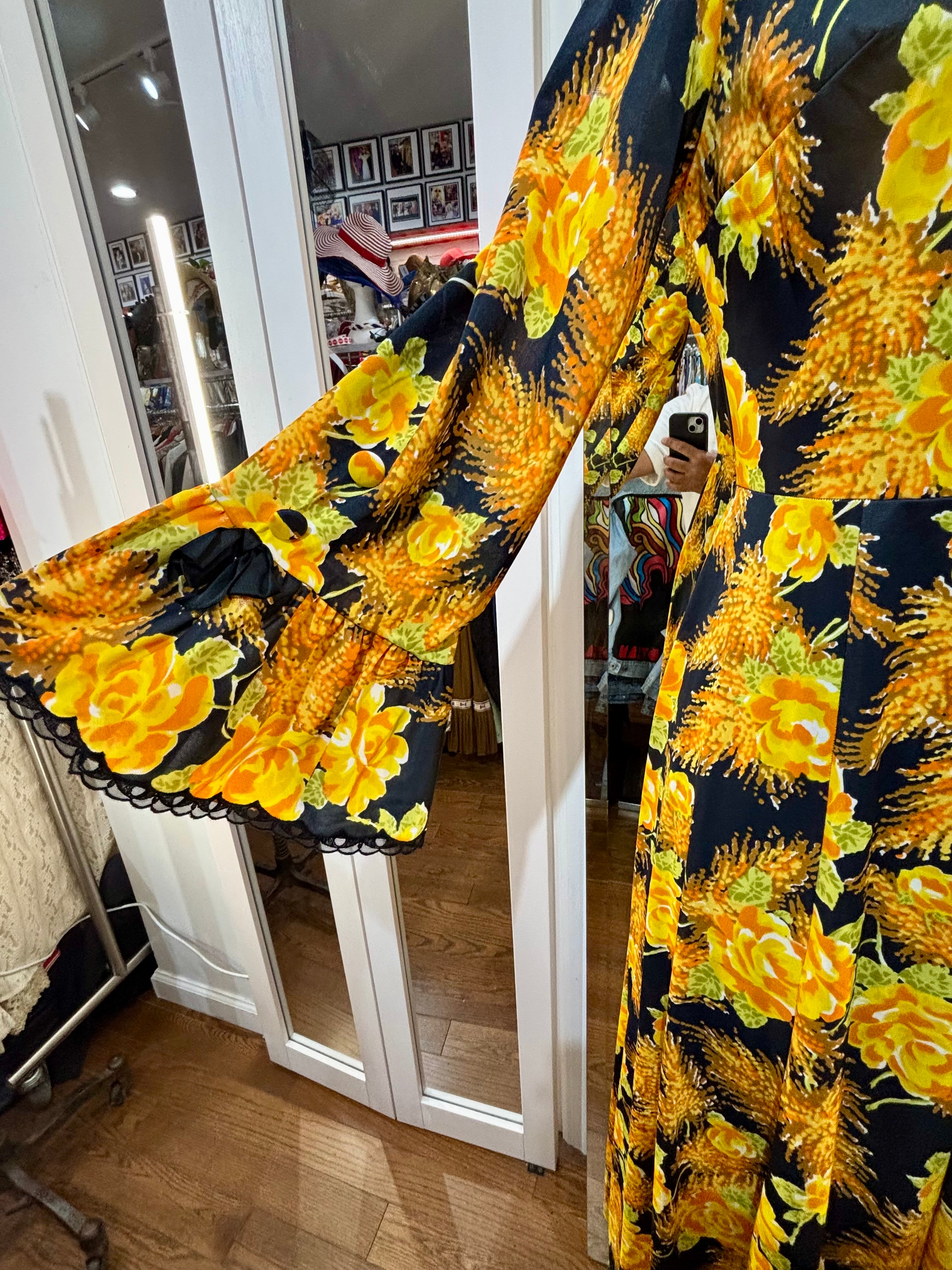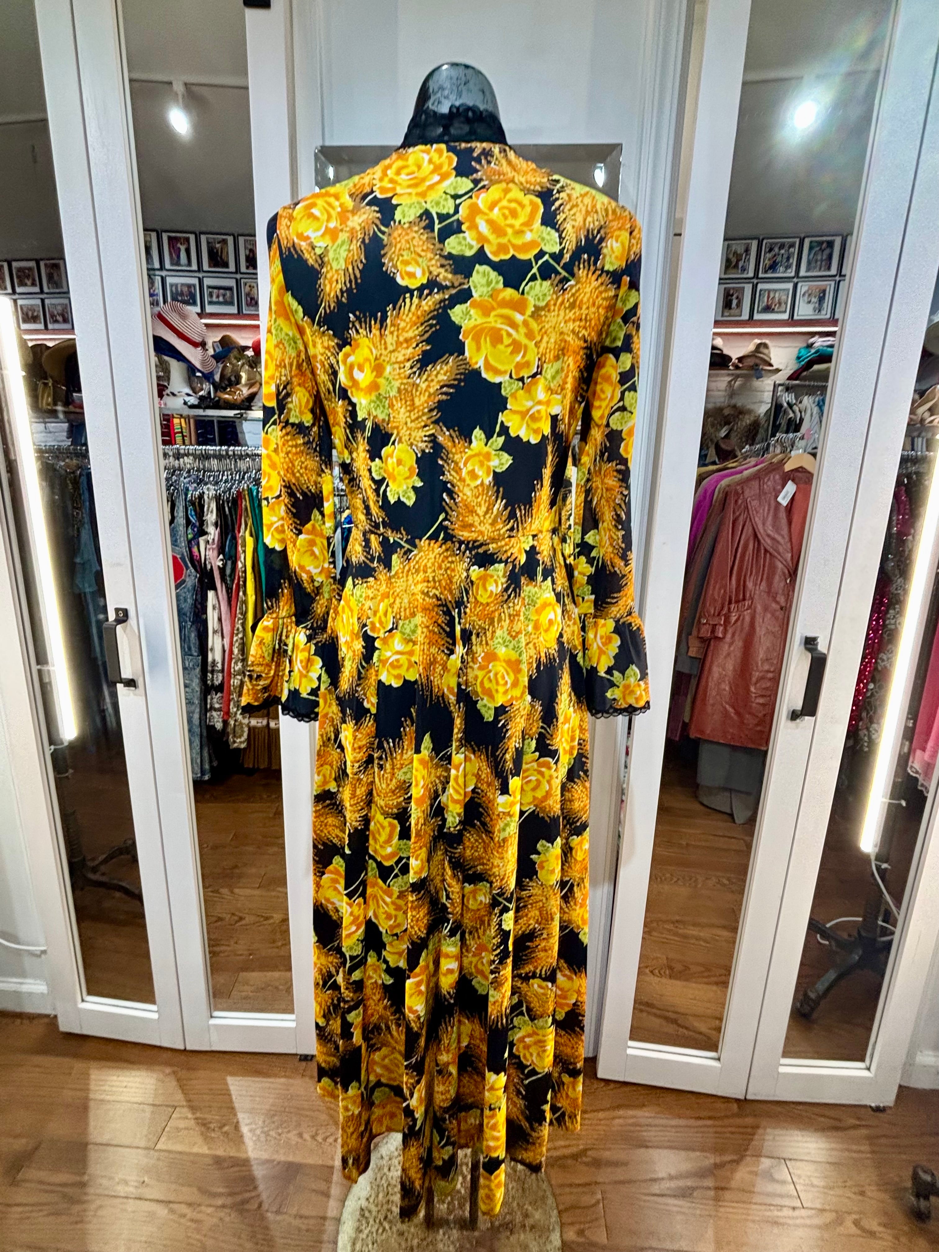 70’s Black And Yellow Sheer Flower Print Front Button Dress With Bell Sleeves