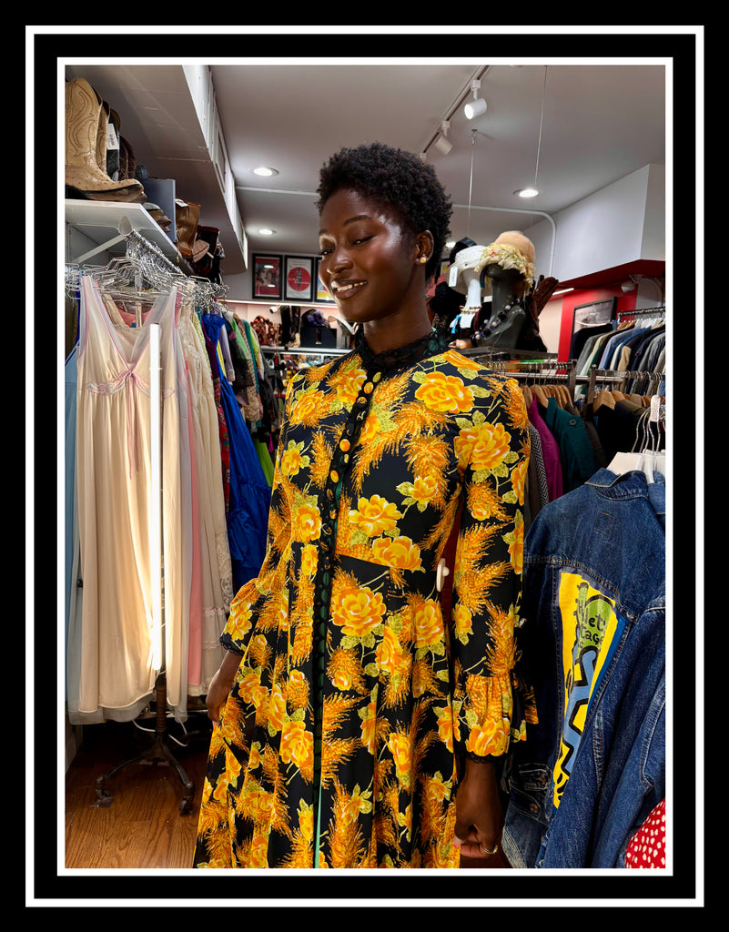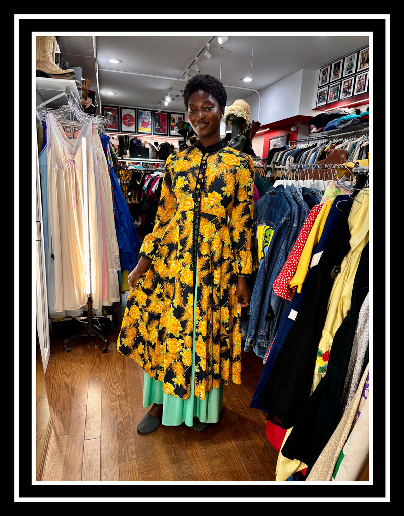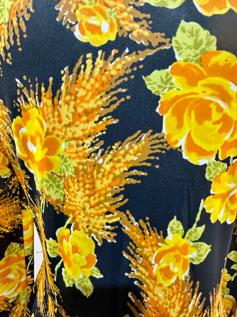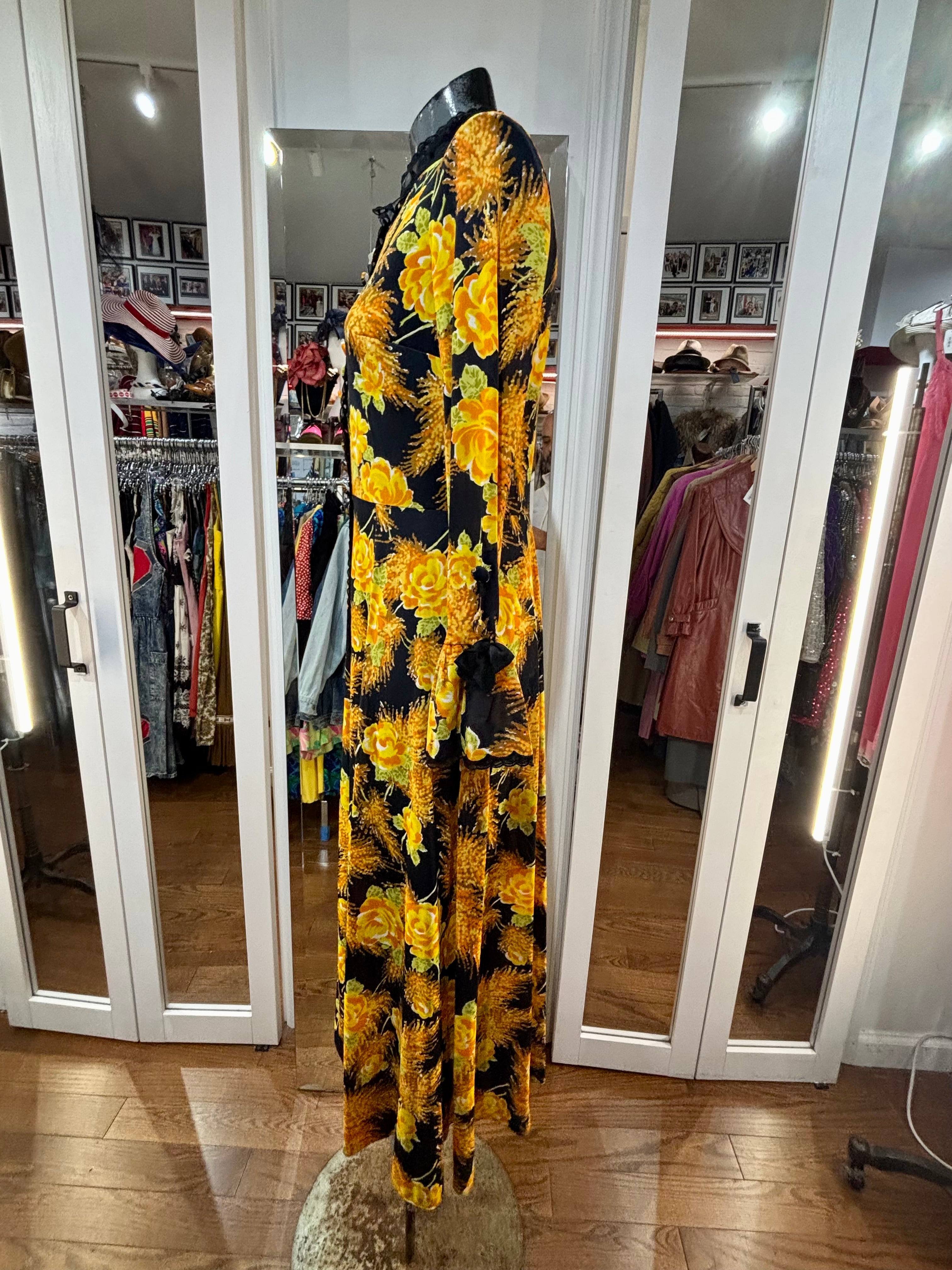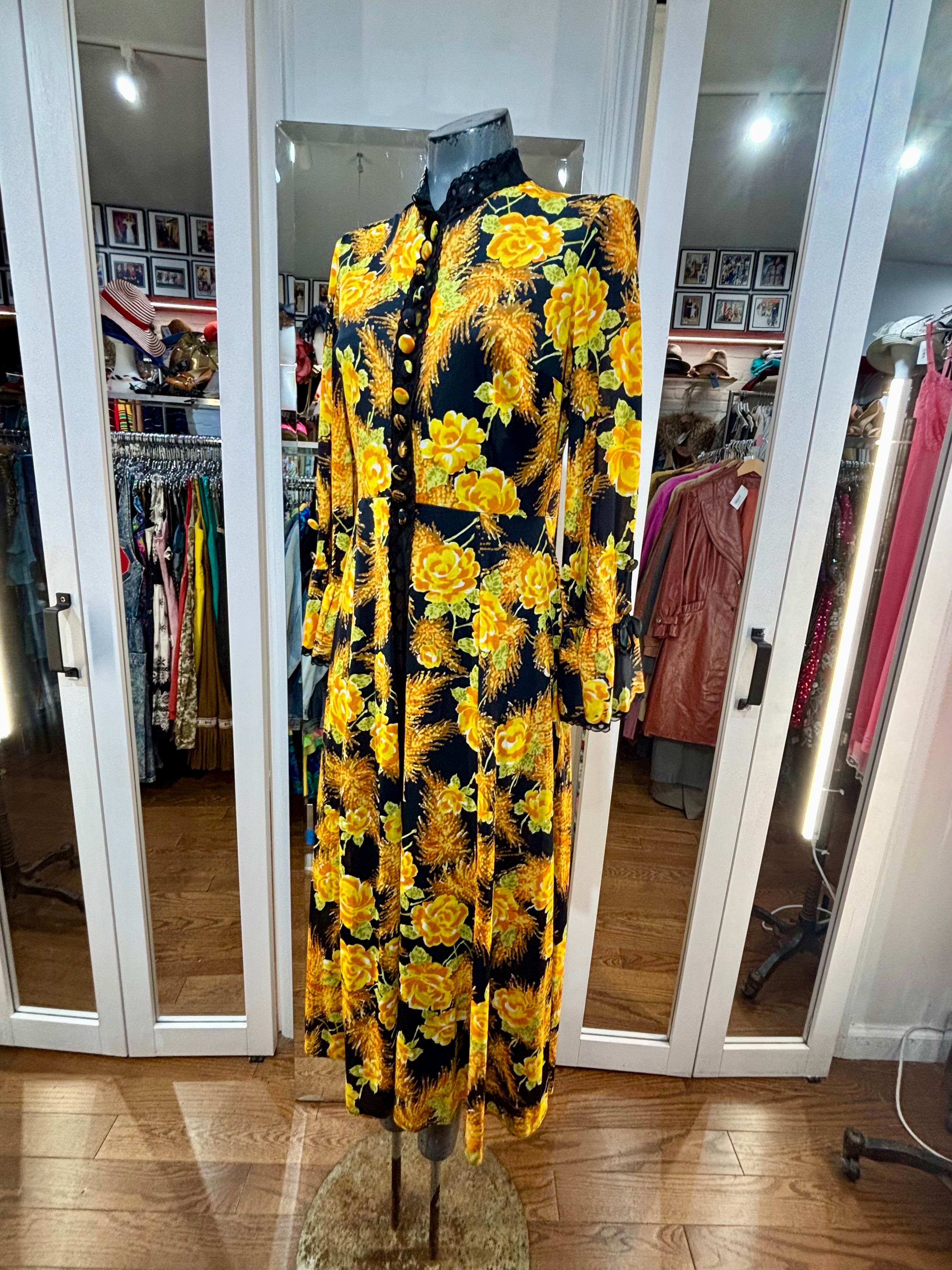 70’s Black And Yellow Sheer Flower Print Front Button Dress With Bell Sleeves