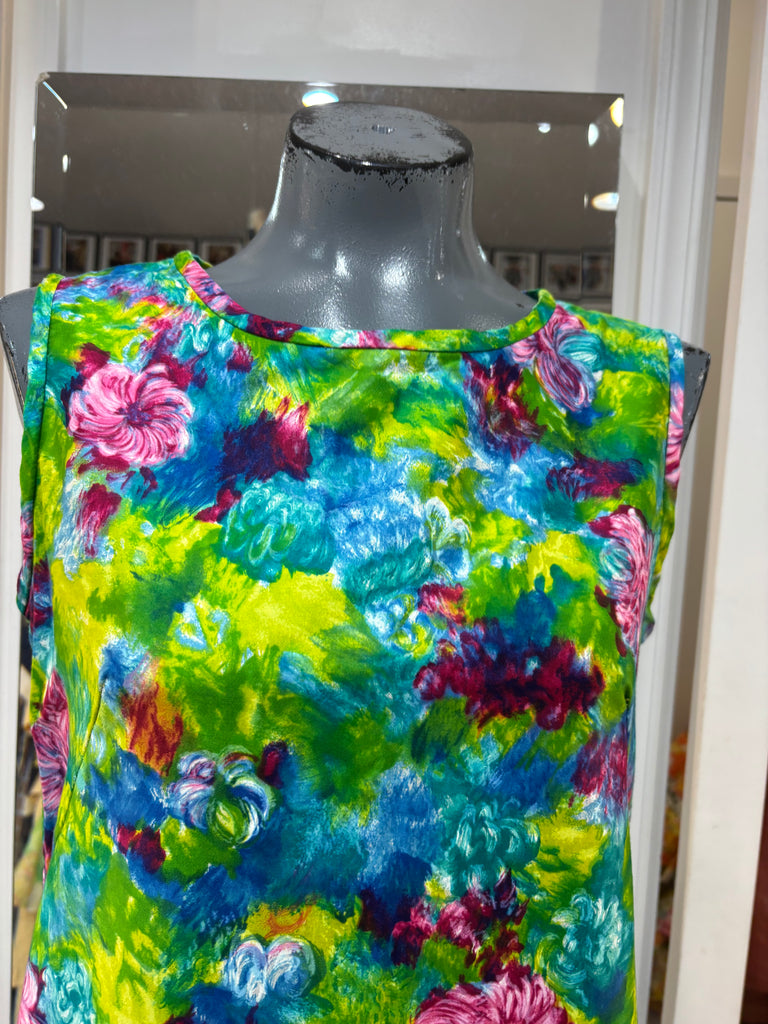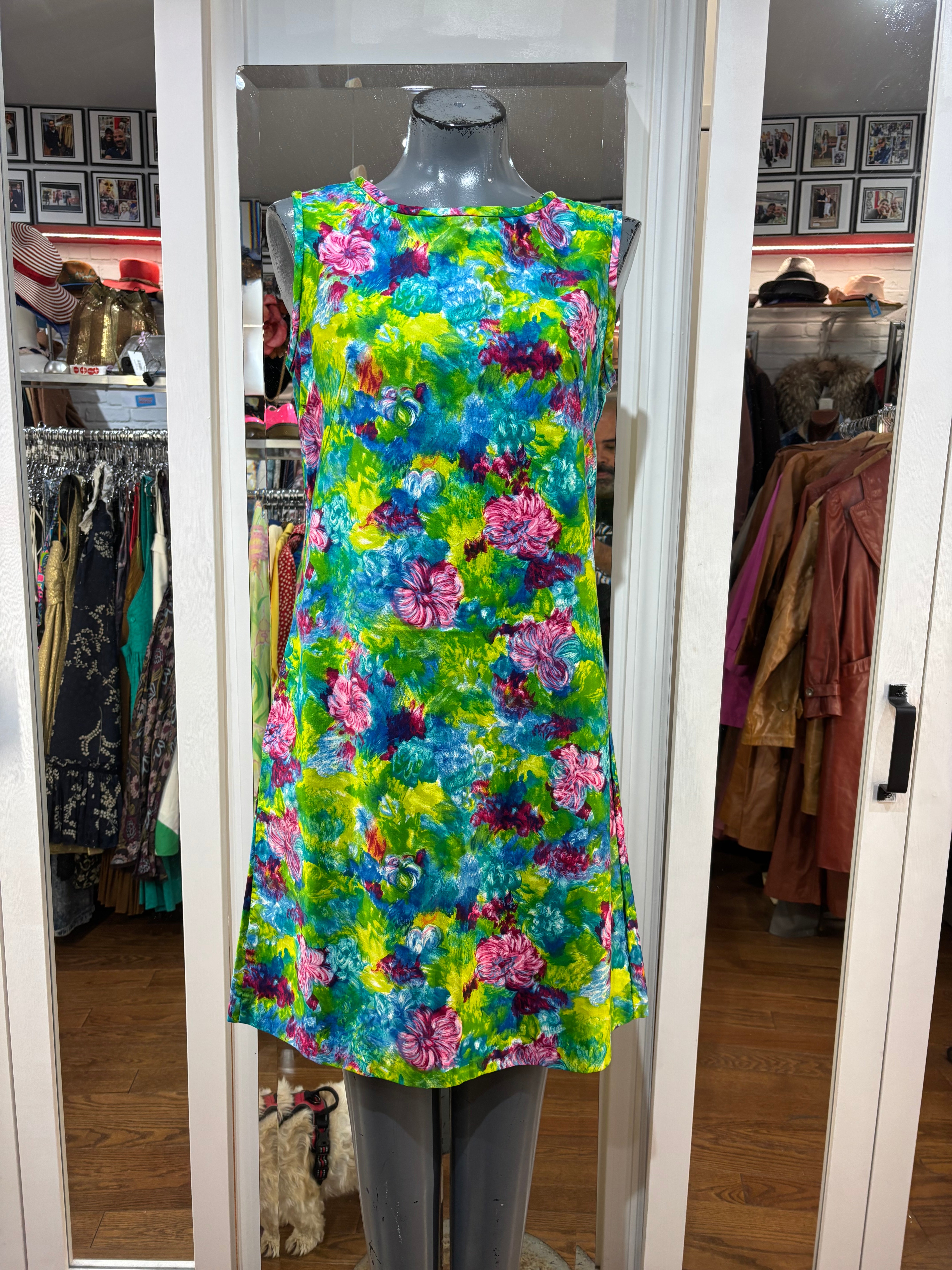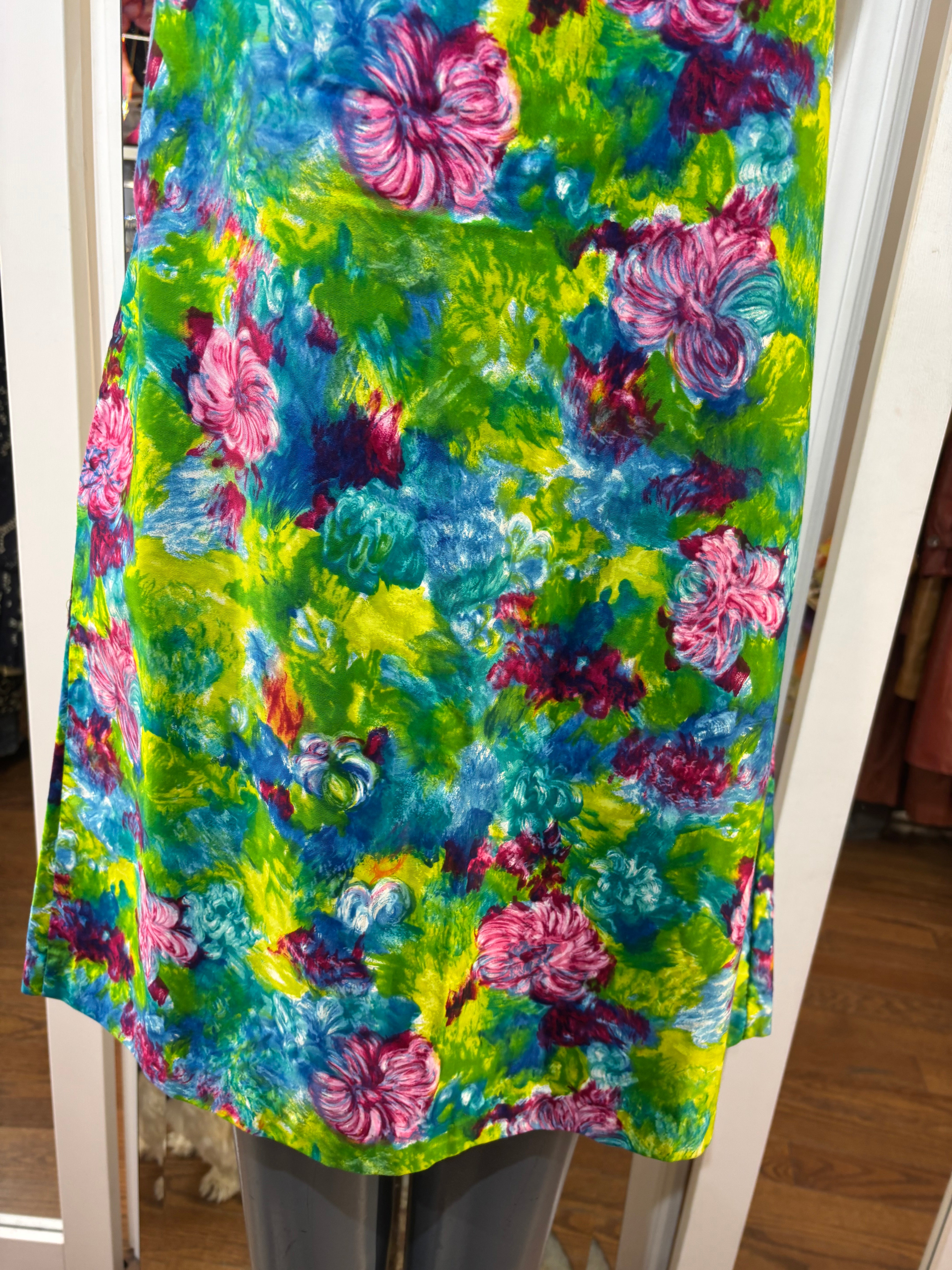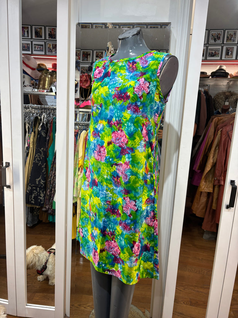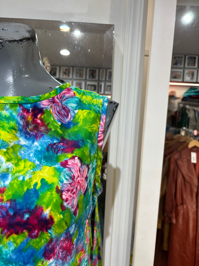 70’s Green Mulicolored Hawaii Print Non Sleeve Knee Dress