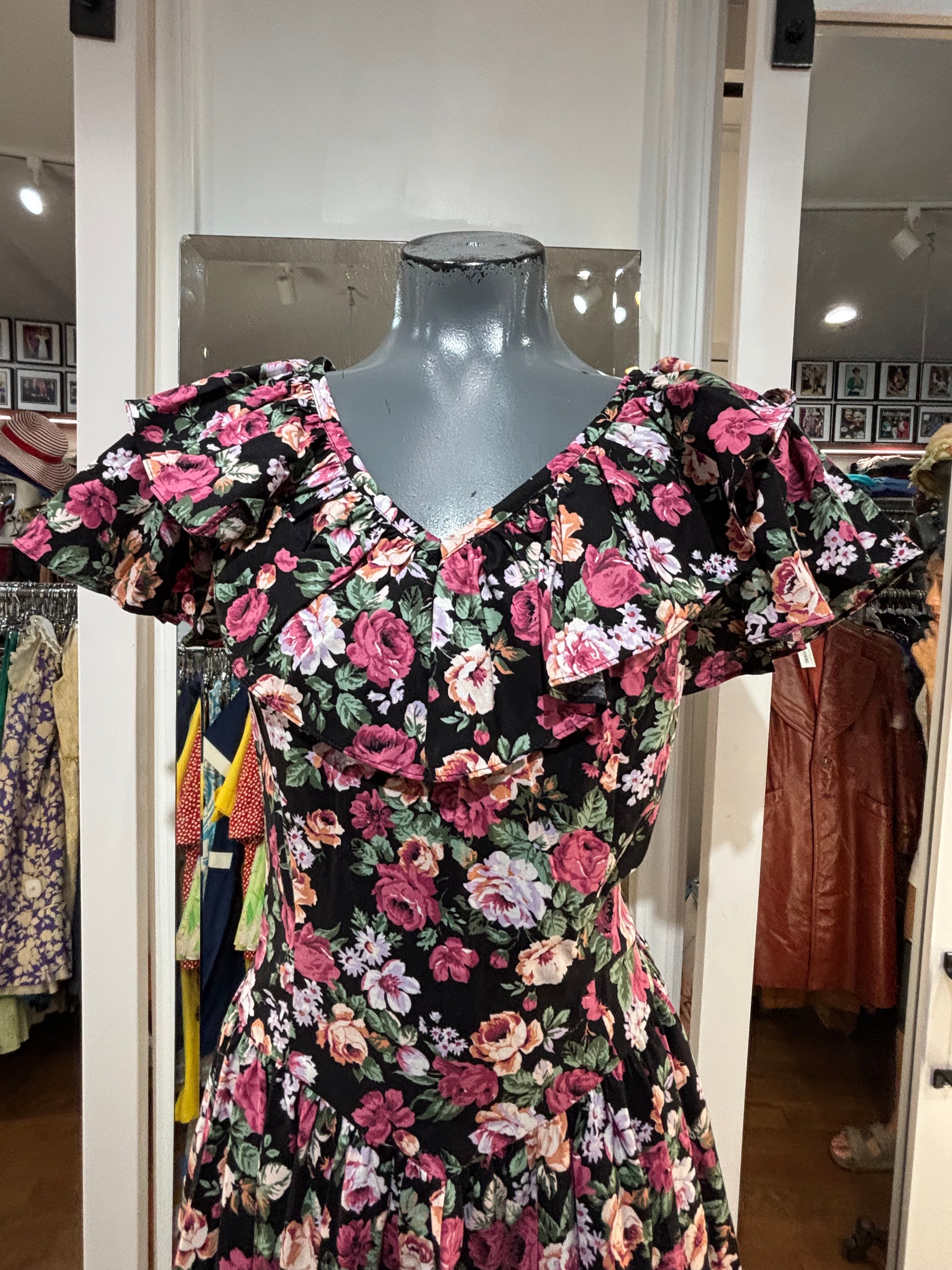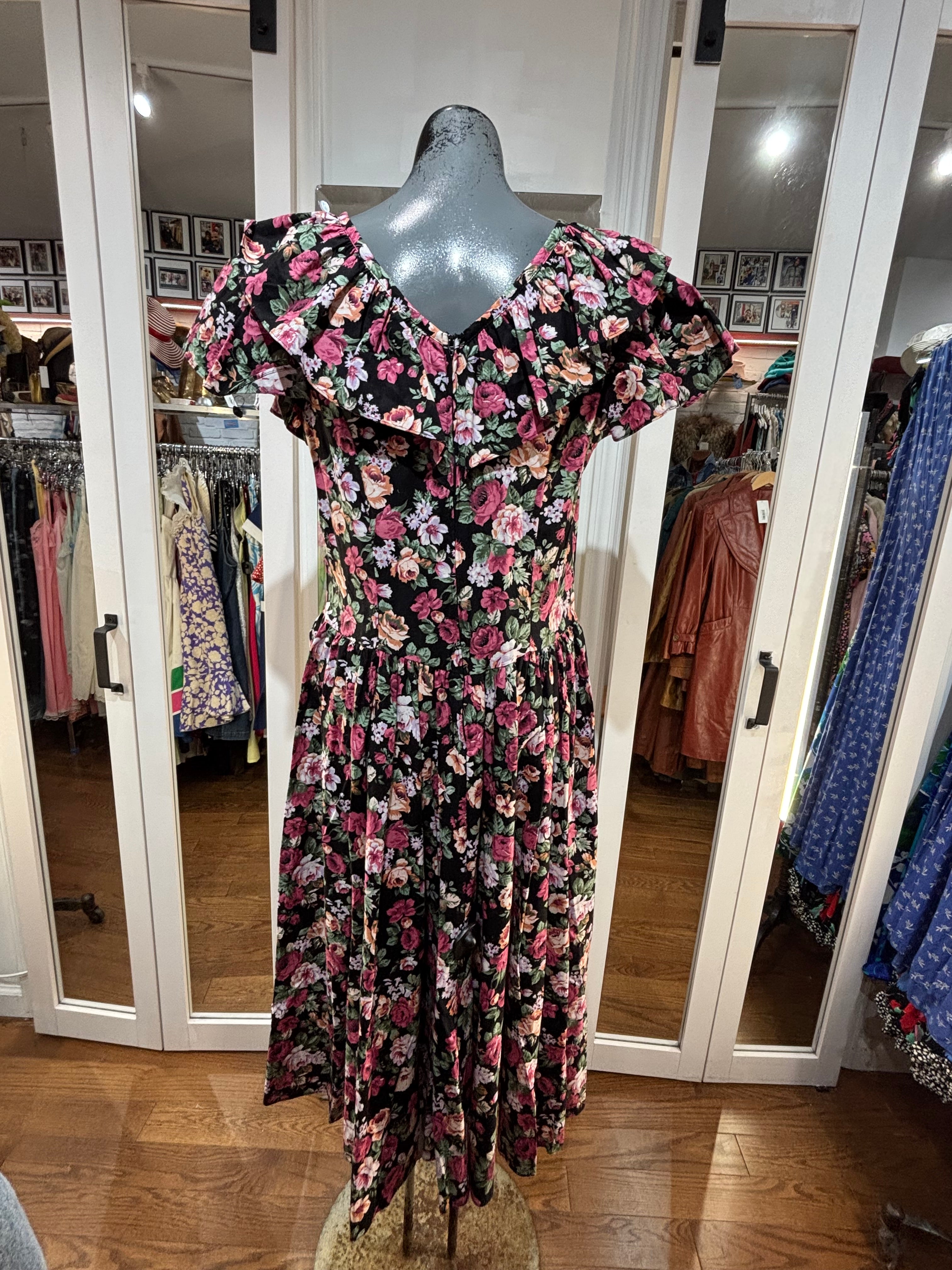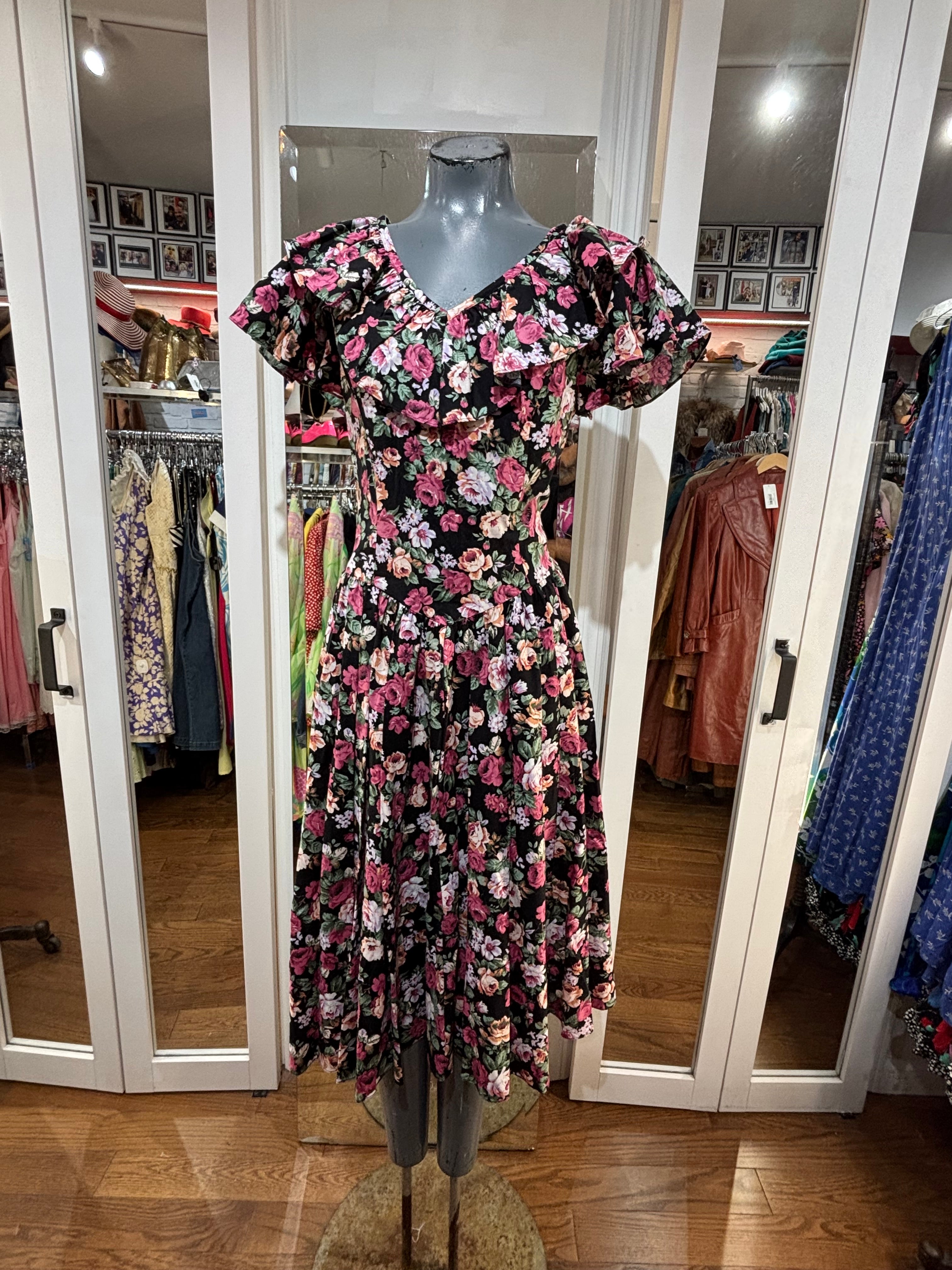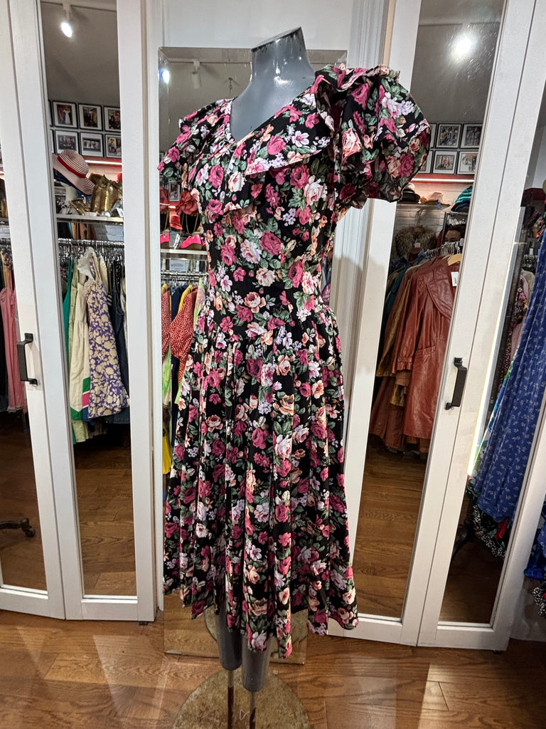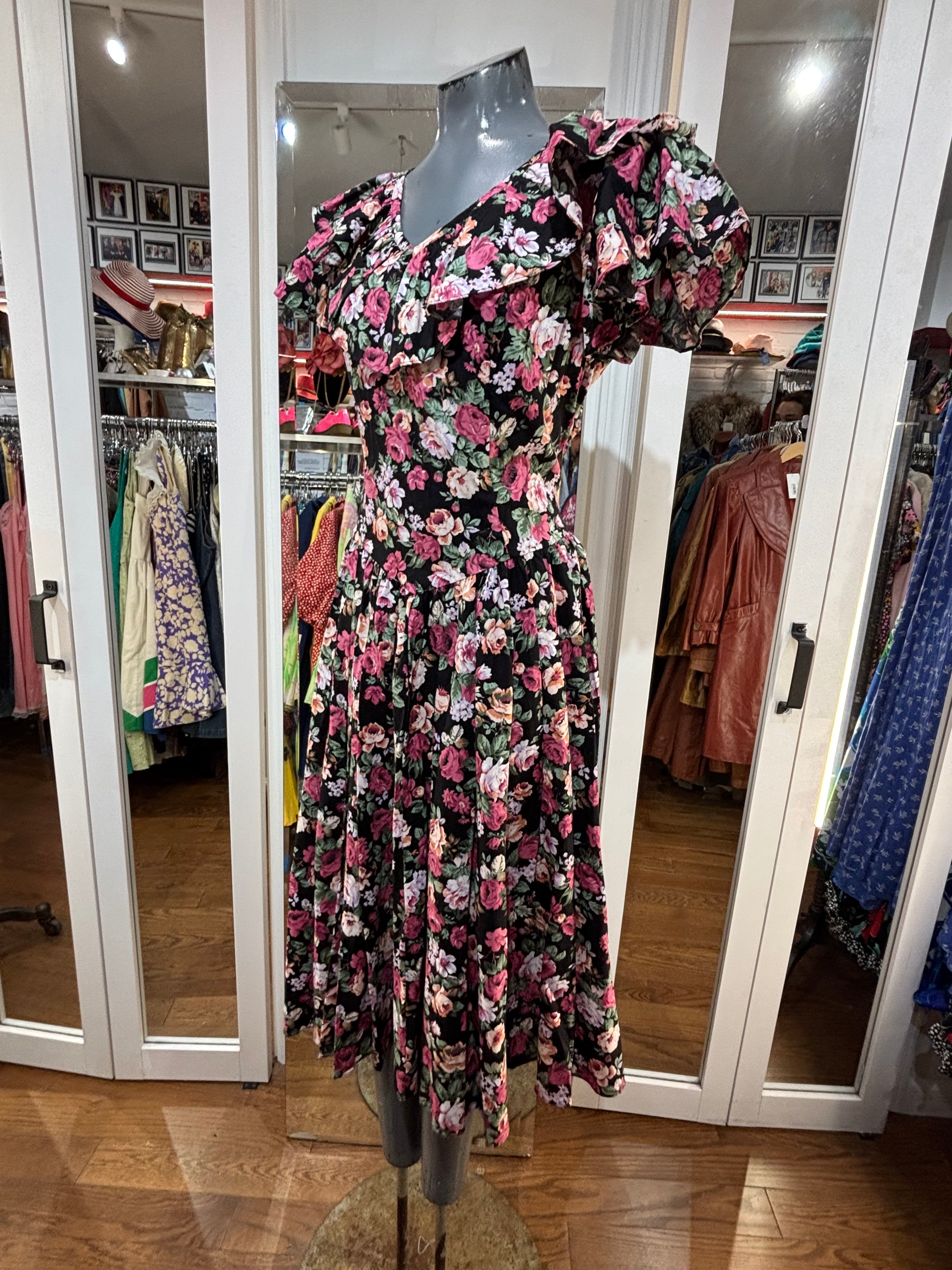 70’s Black And Pink Flower Print Full Skirt Dress With Ruffle Sleeves By Positive Attitude