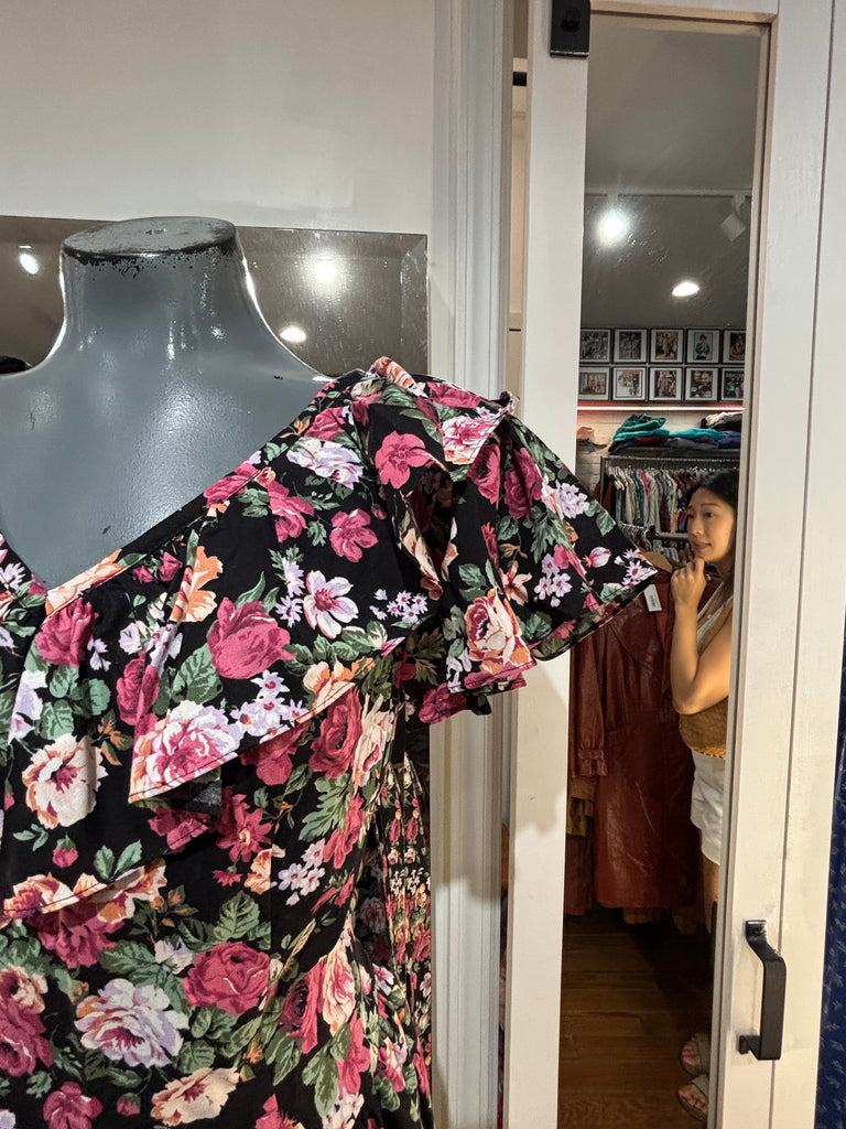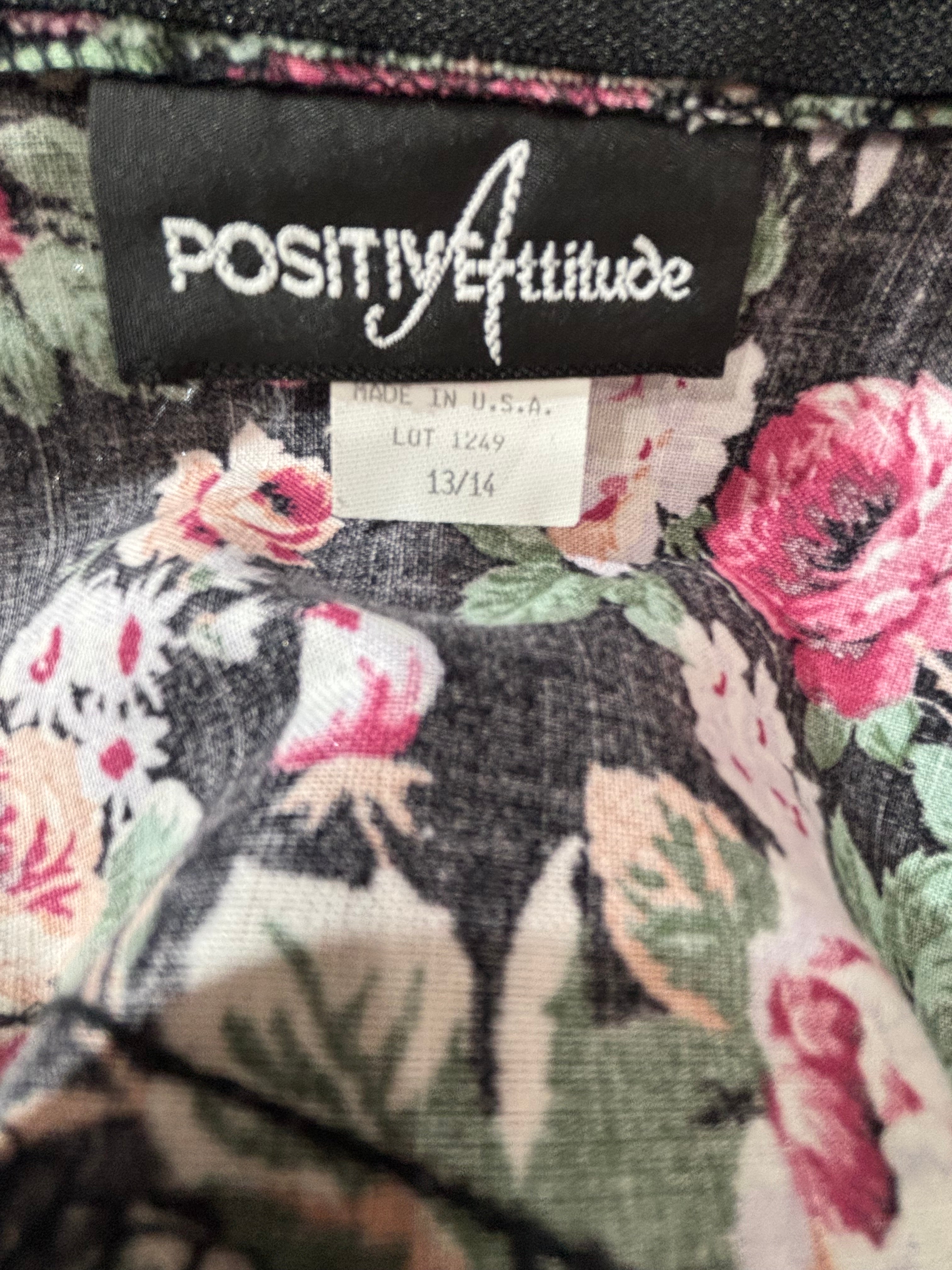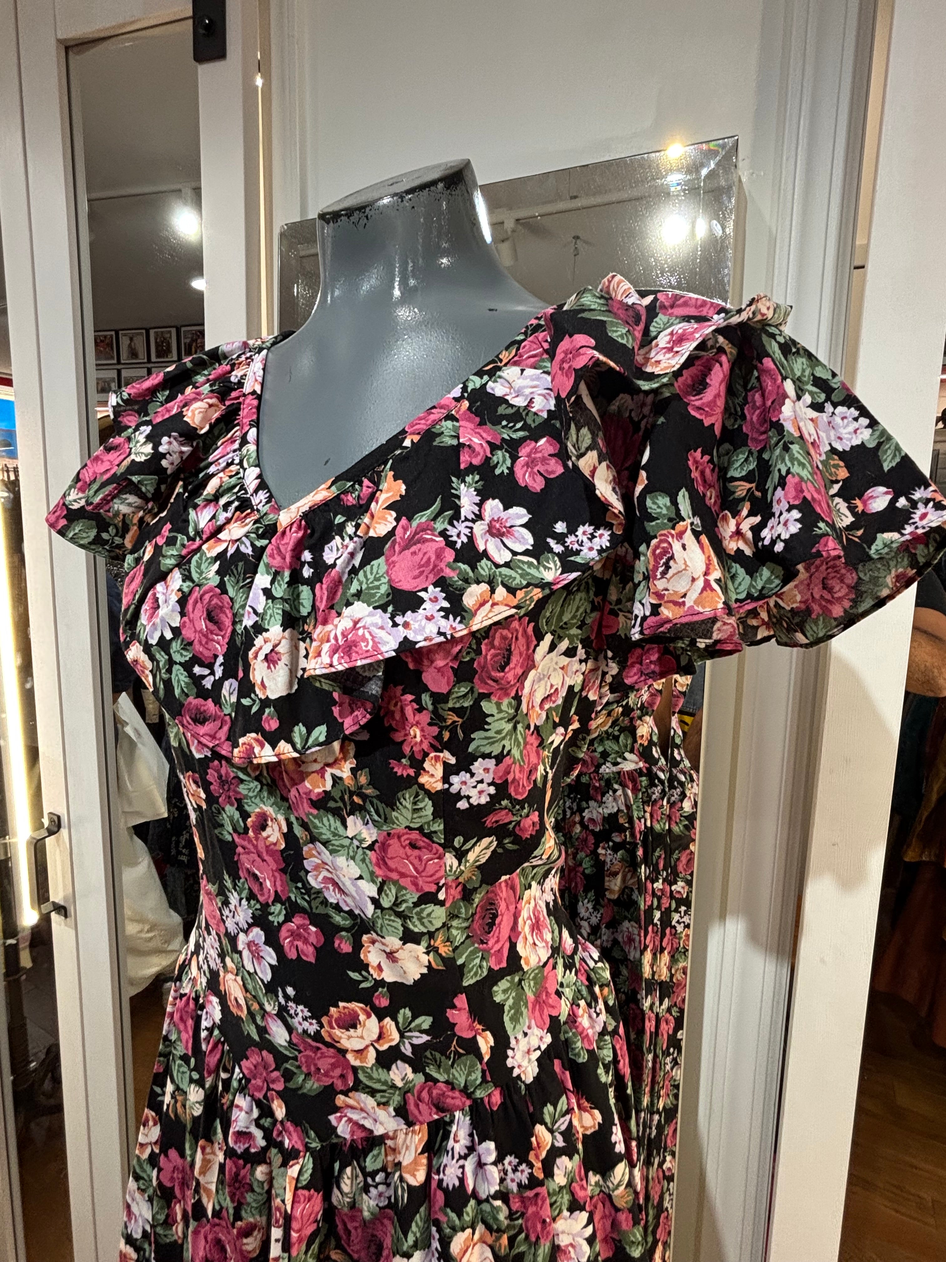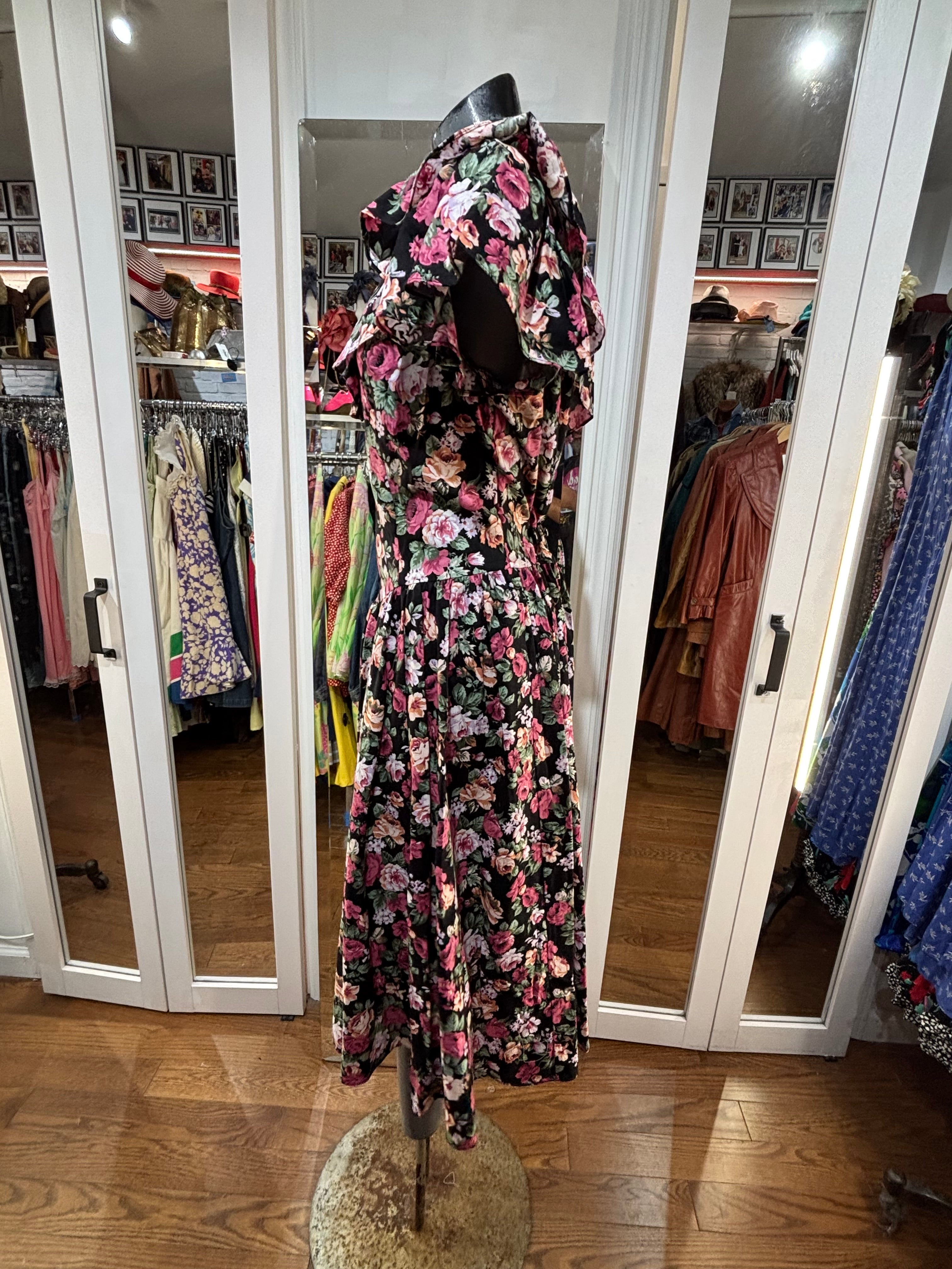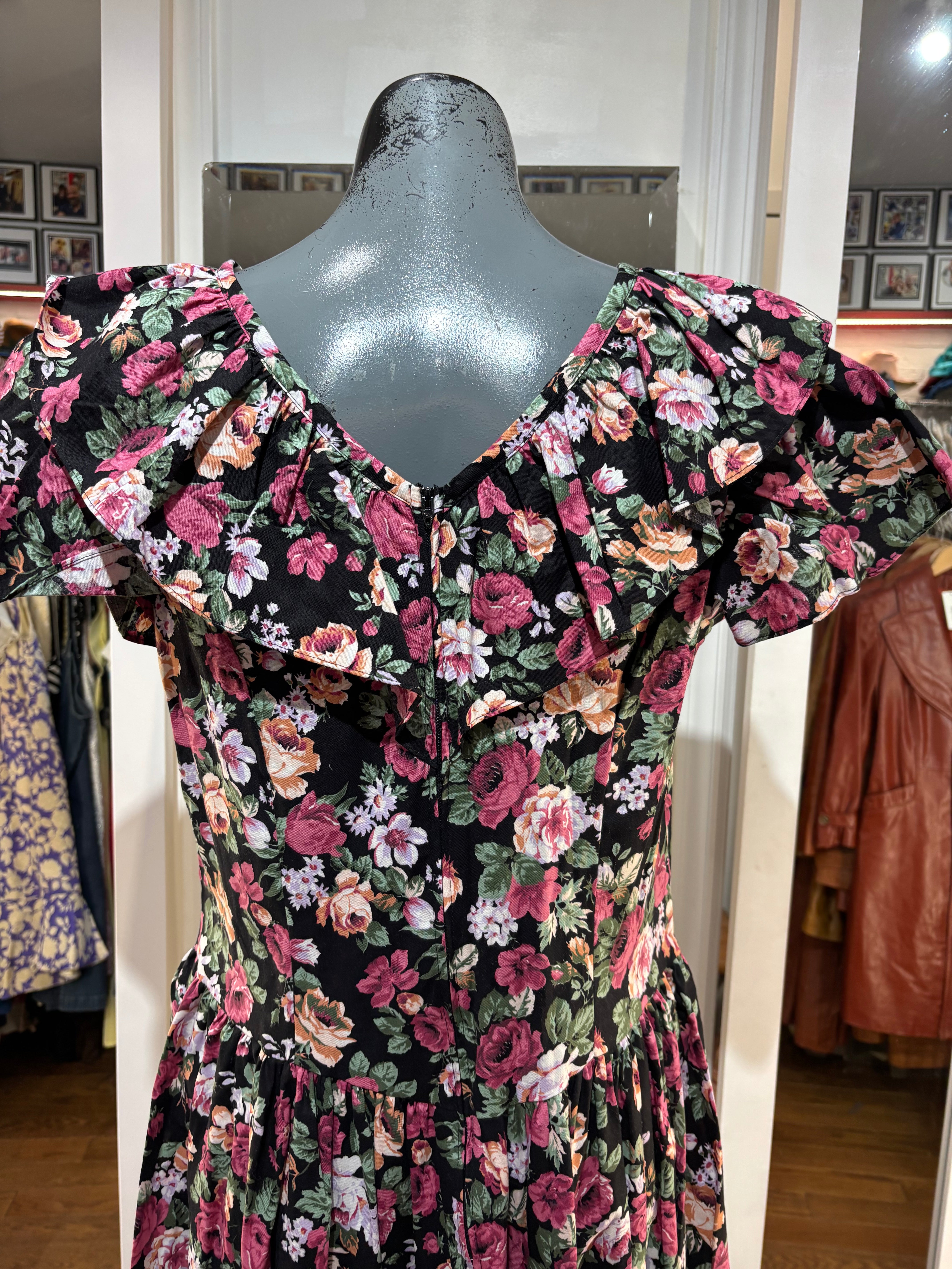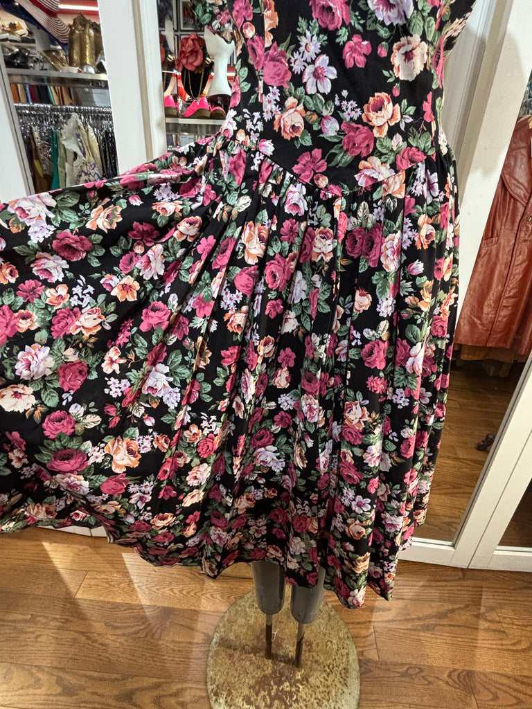 70’s Black And Pink Flower Print Full Skirt Dress With Ruffle Sleeves By Positive Attitude