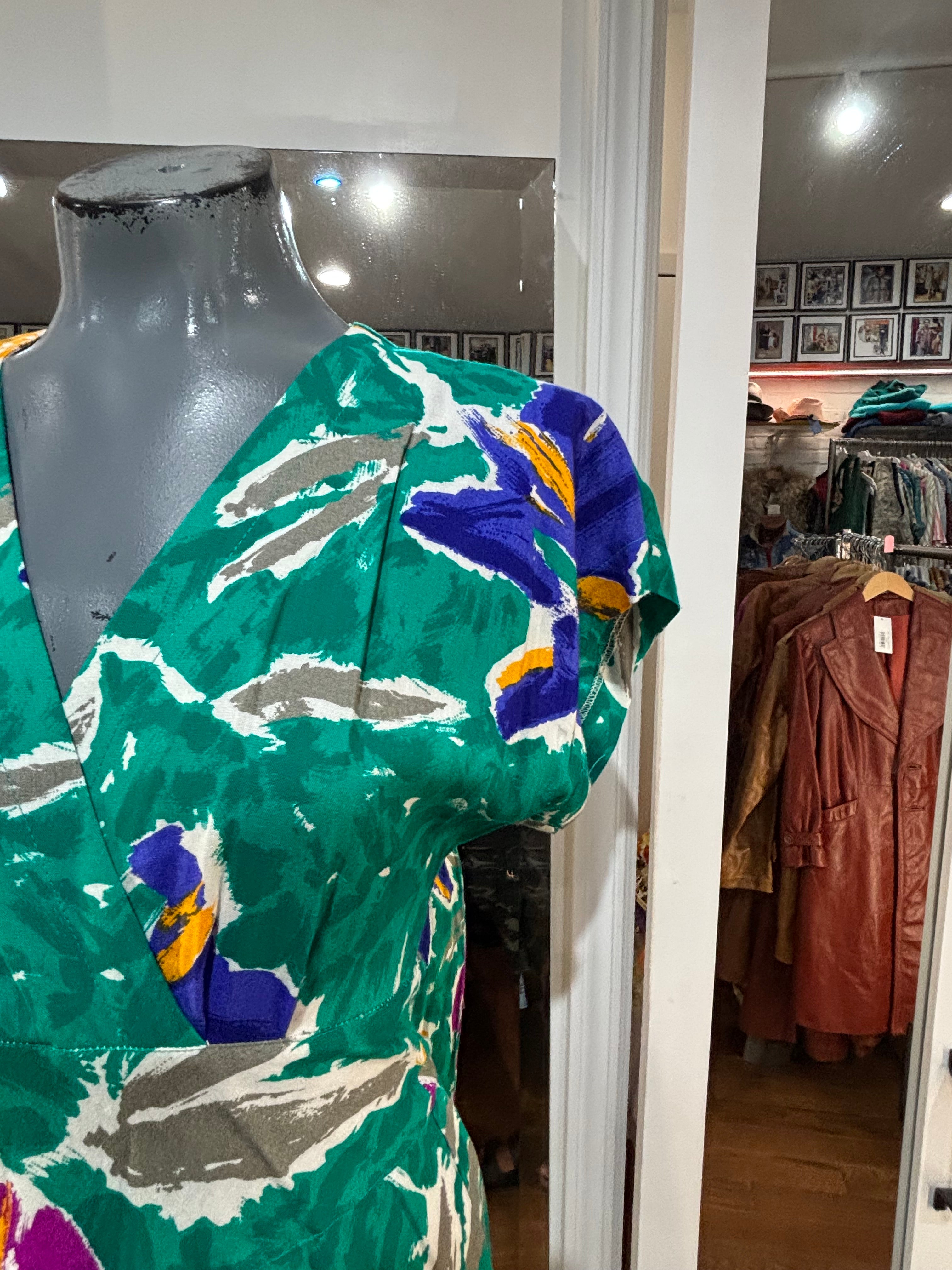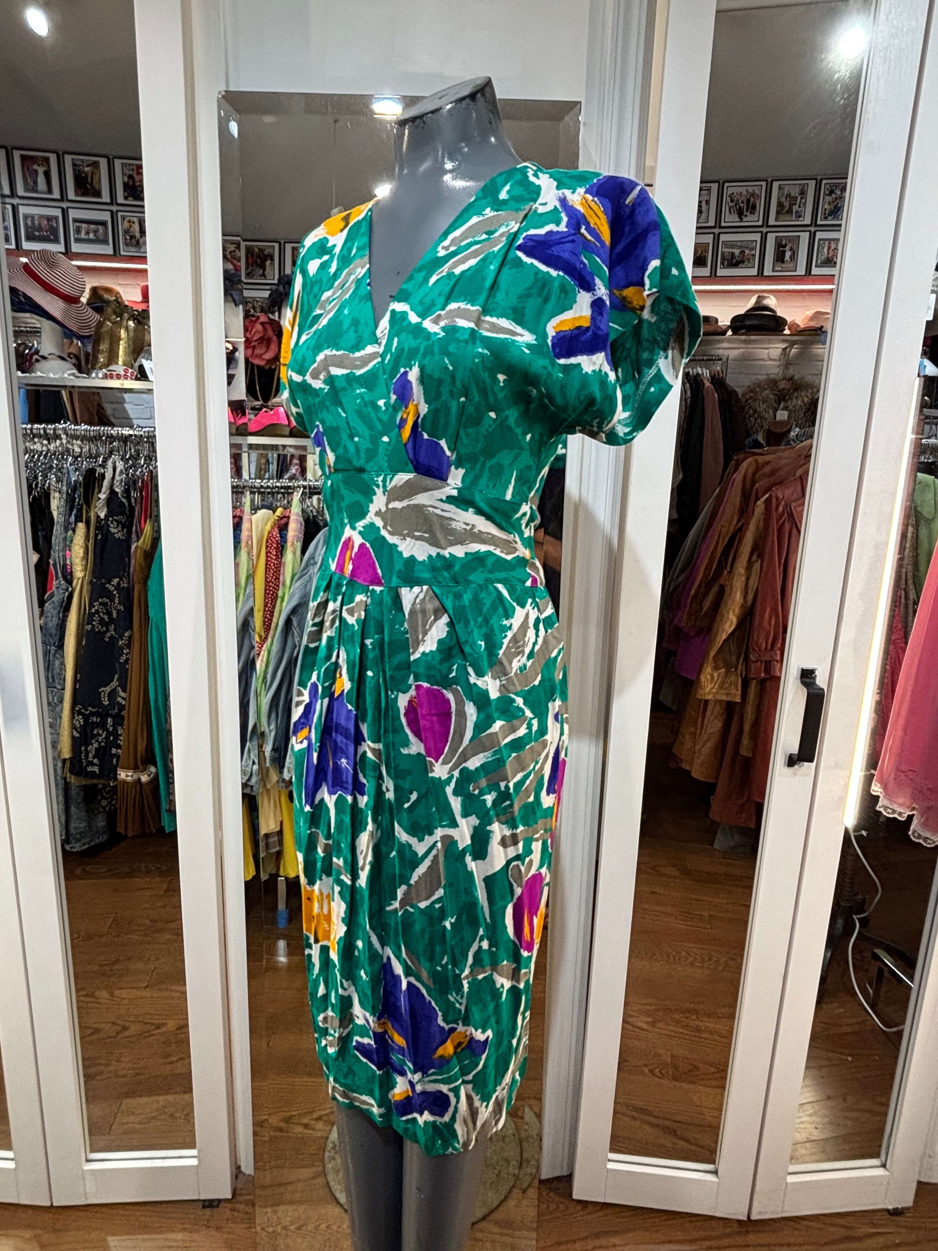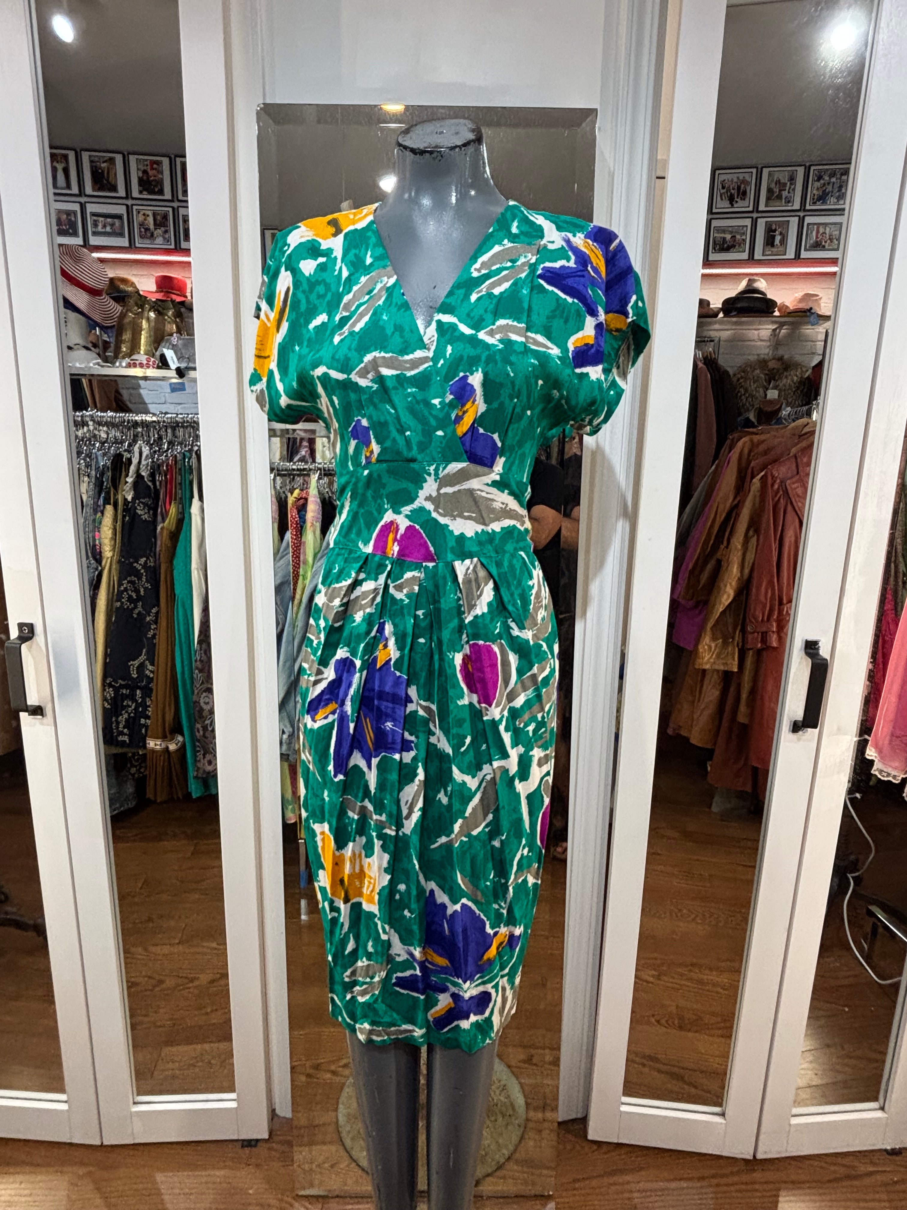 80’s Going 40’s Green Multicolor V Neck Dress By VLP Petites