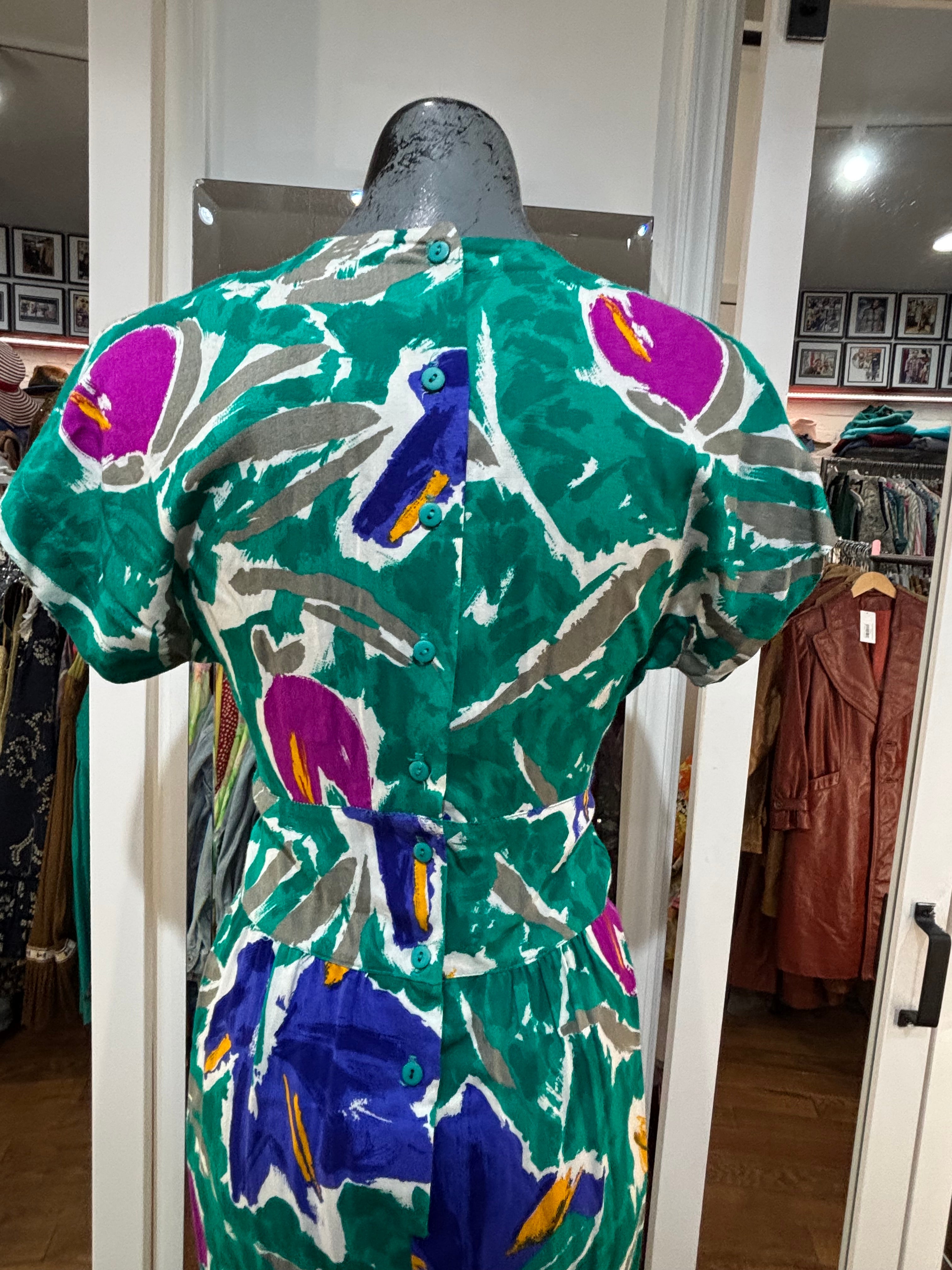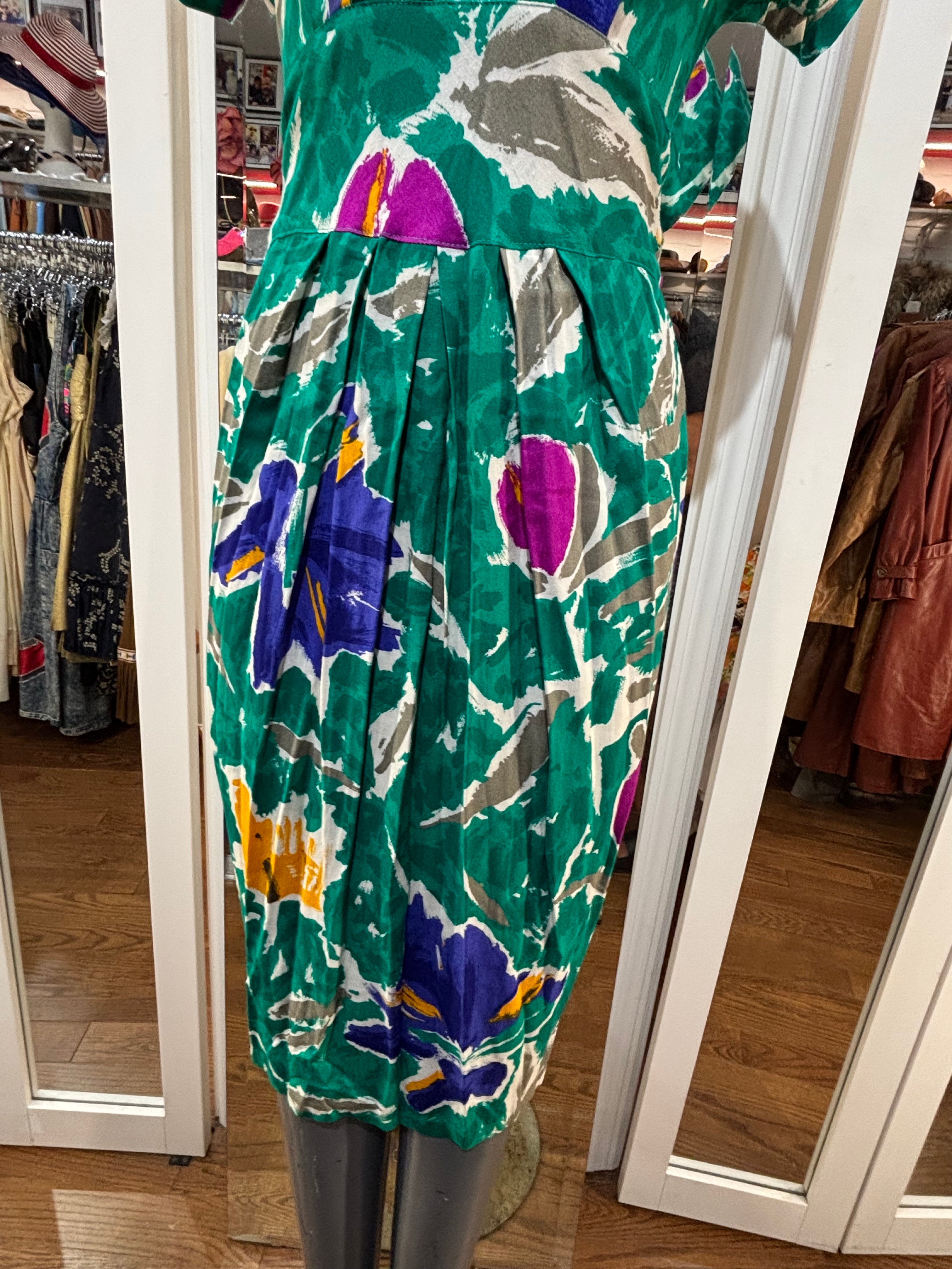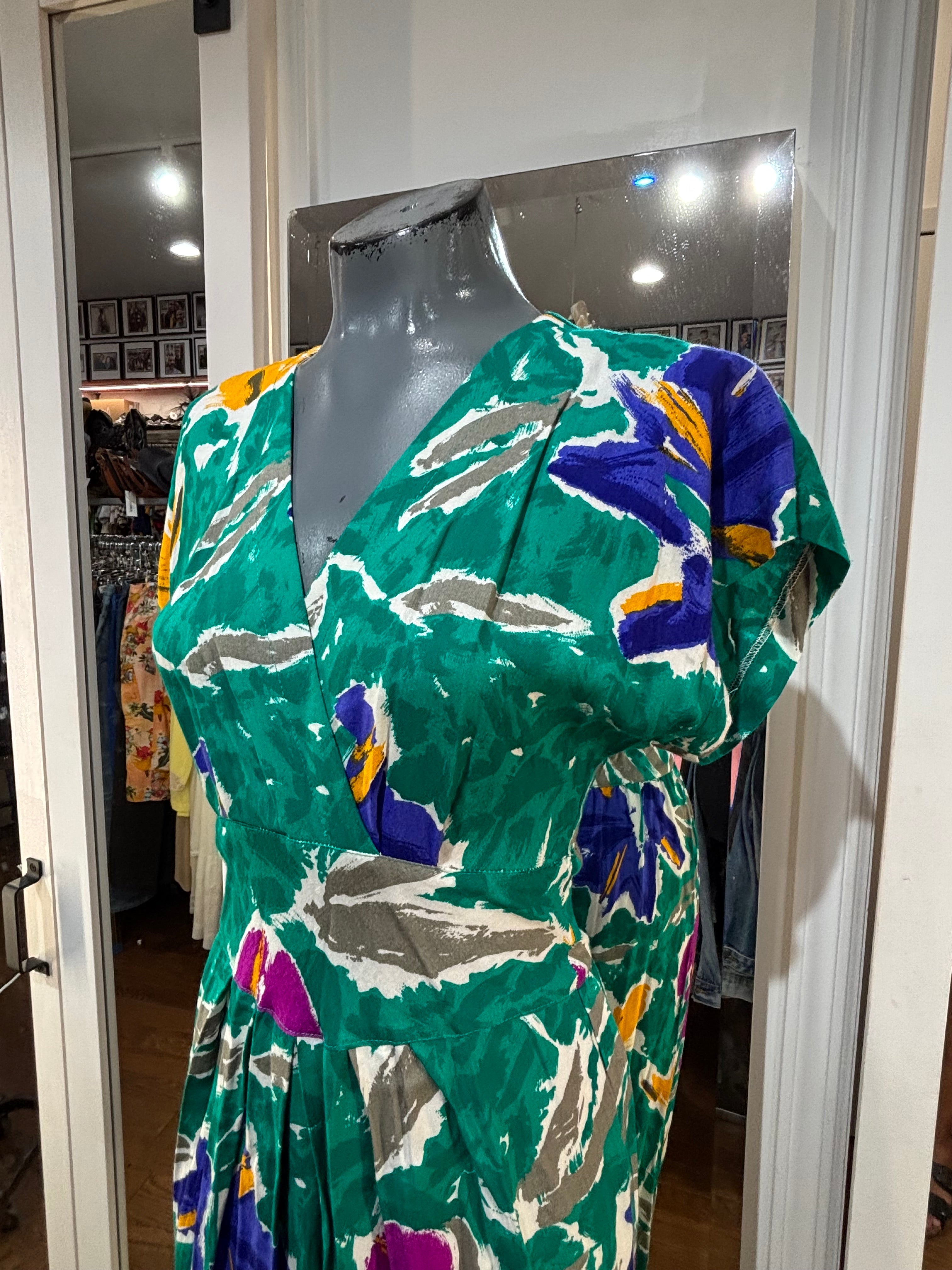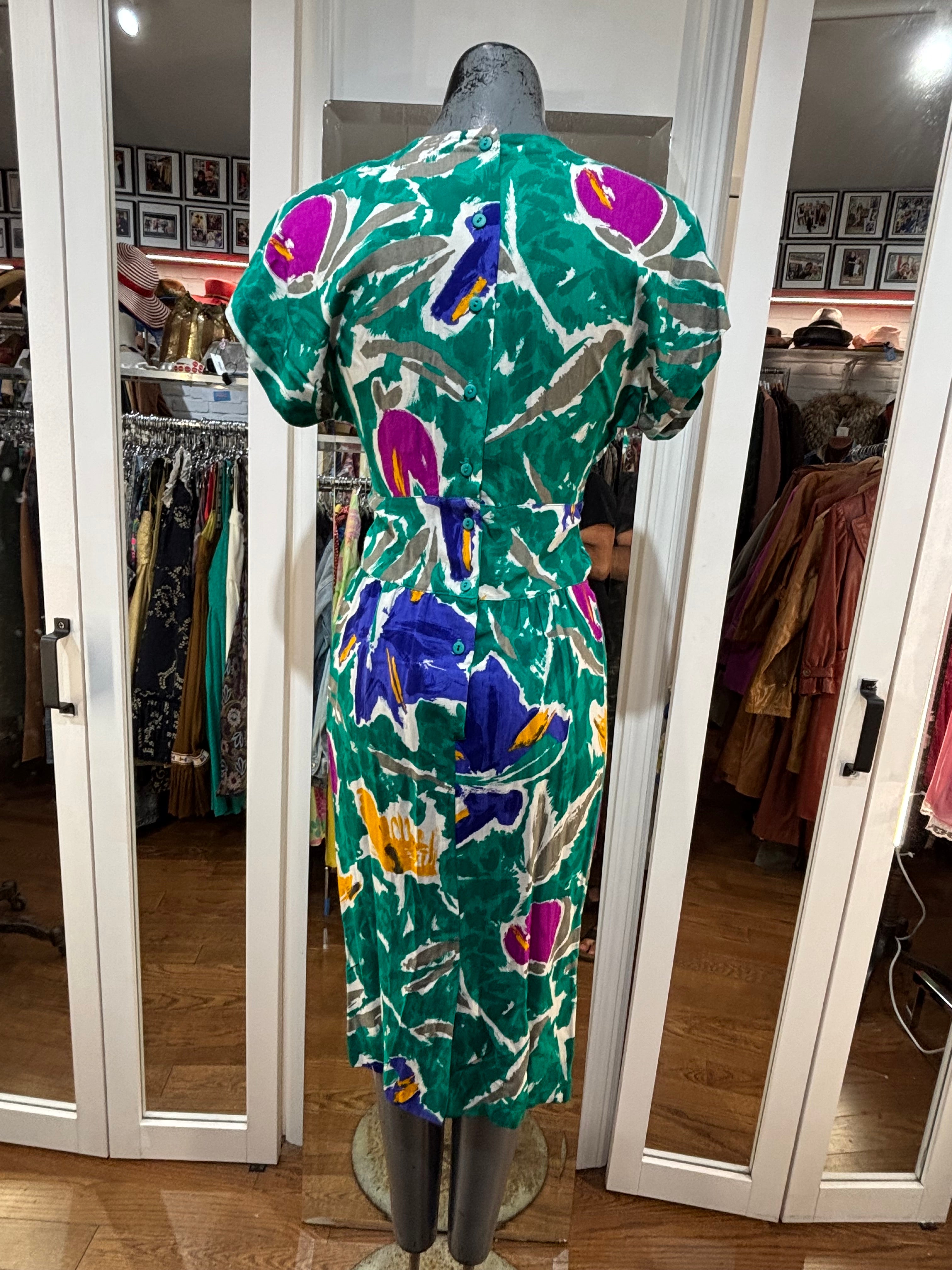 80’s Going 40’s Green Multicolor V Neck Dress By VLP Petites