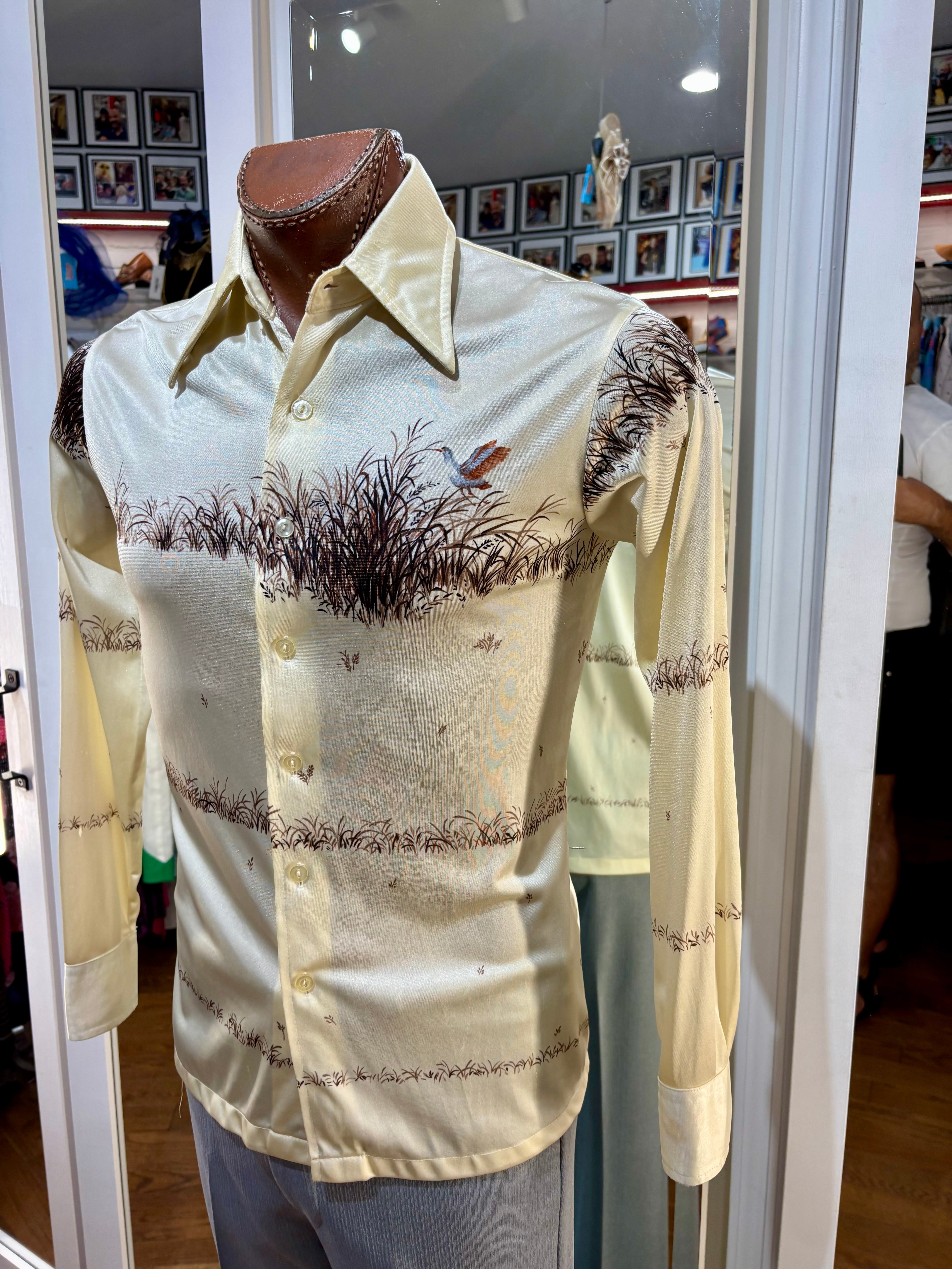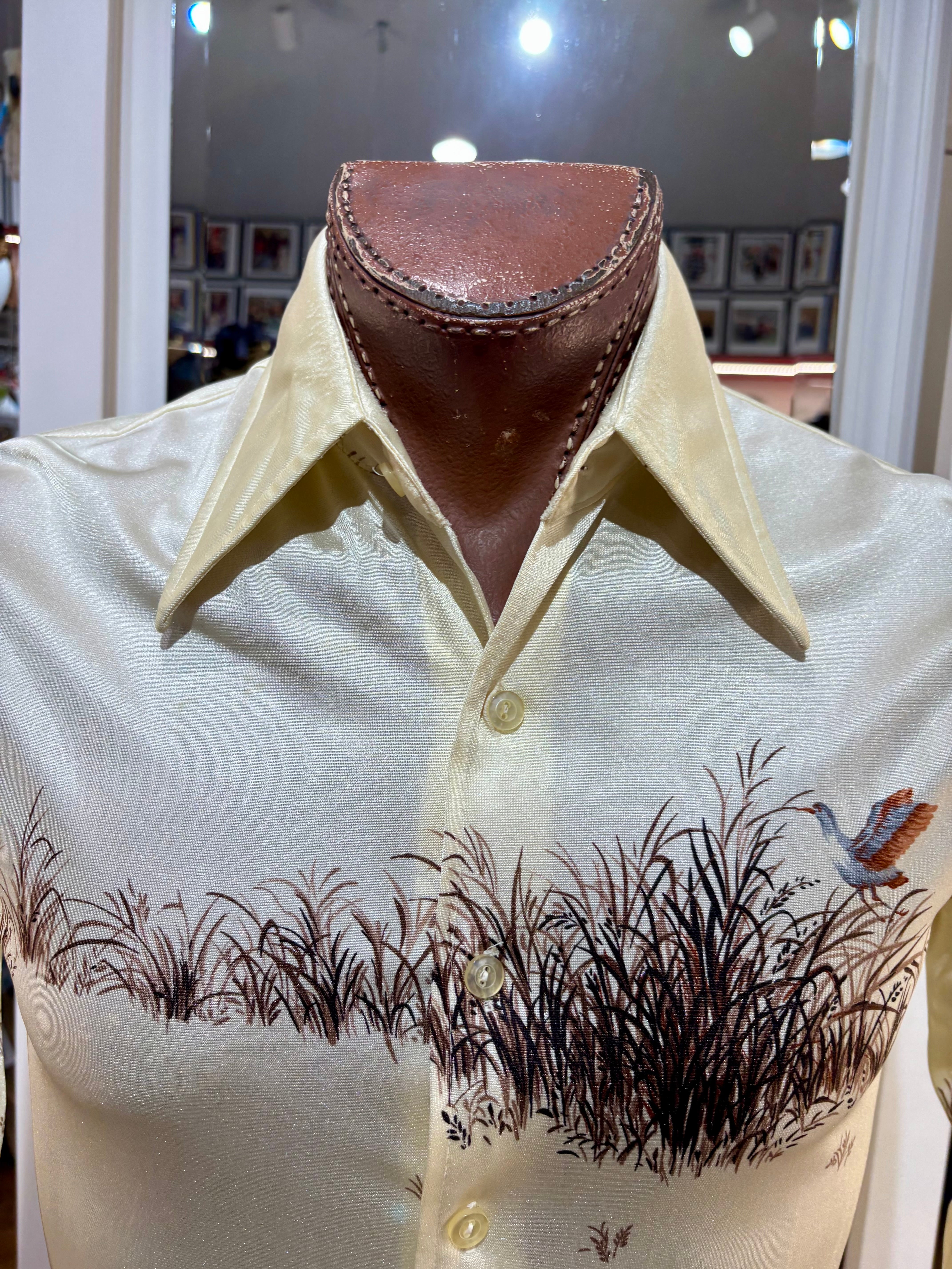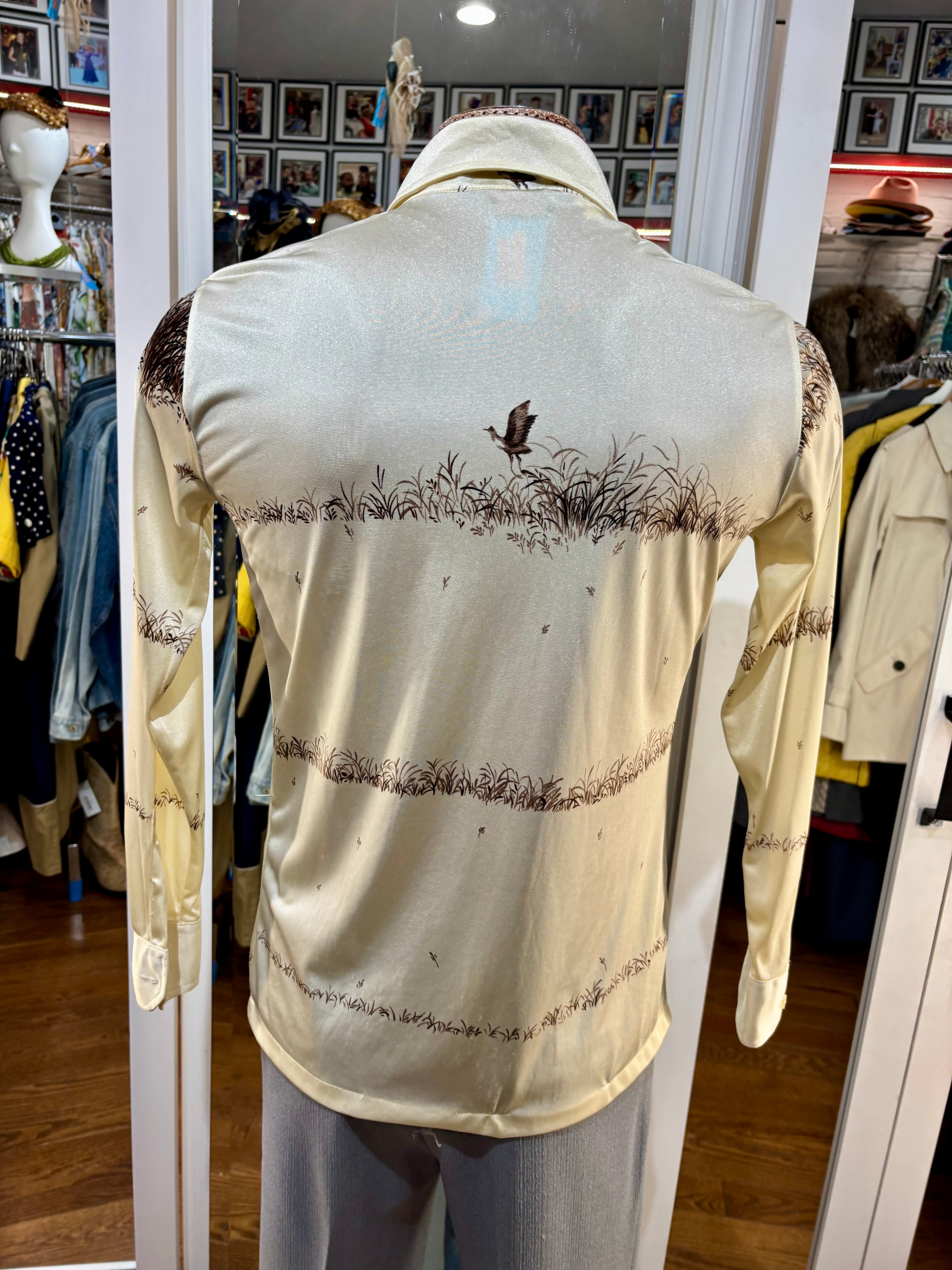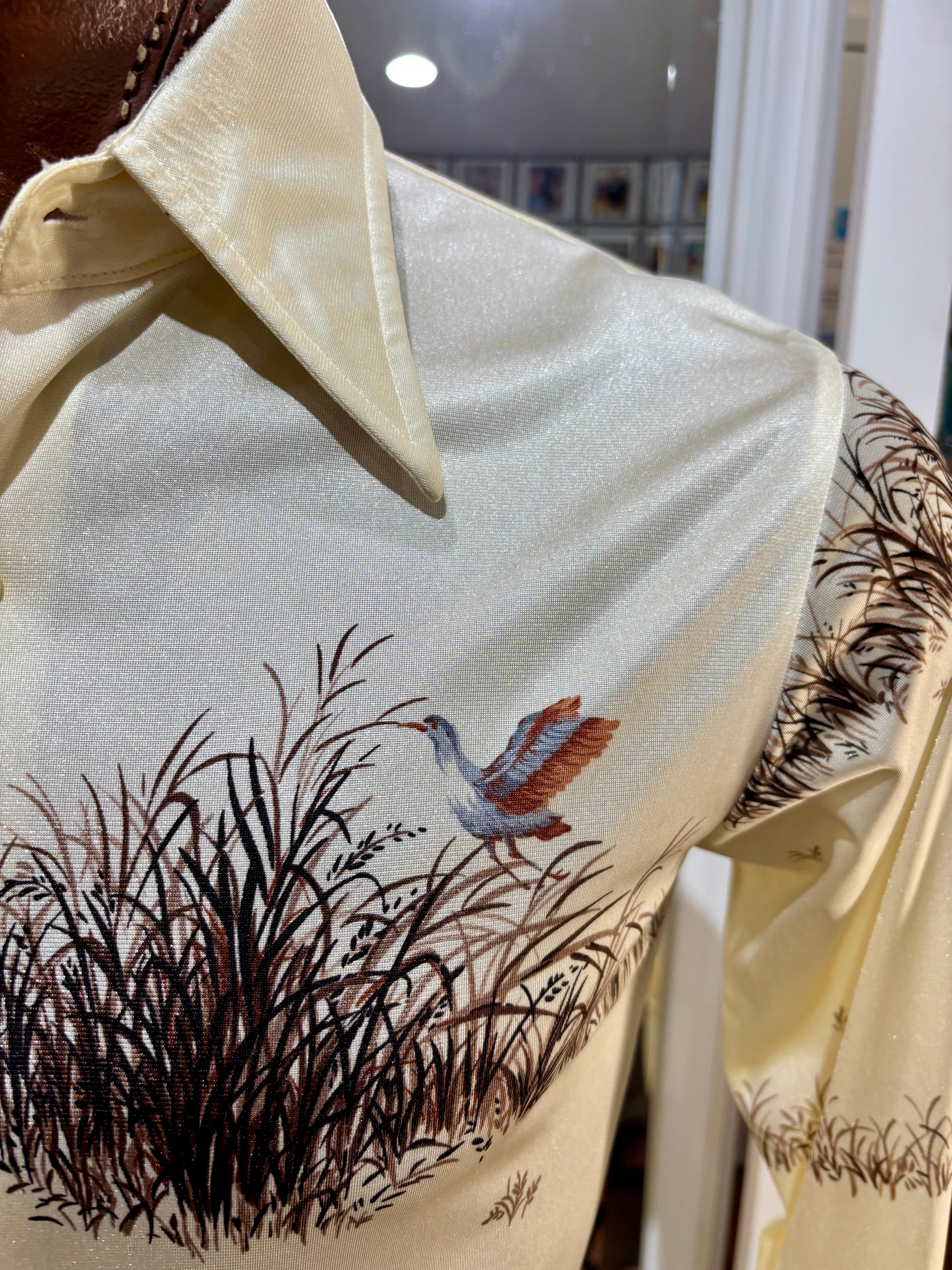 70’s Off White And Brown Duck Scenery Print Disco Shirt By Chemise Et Cie