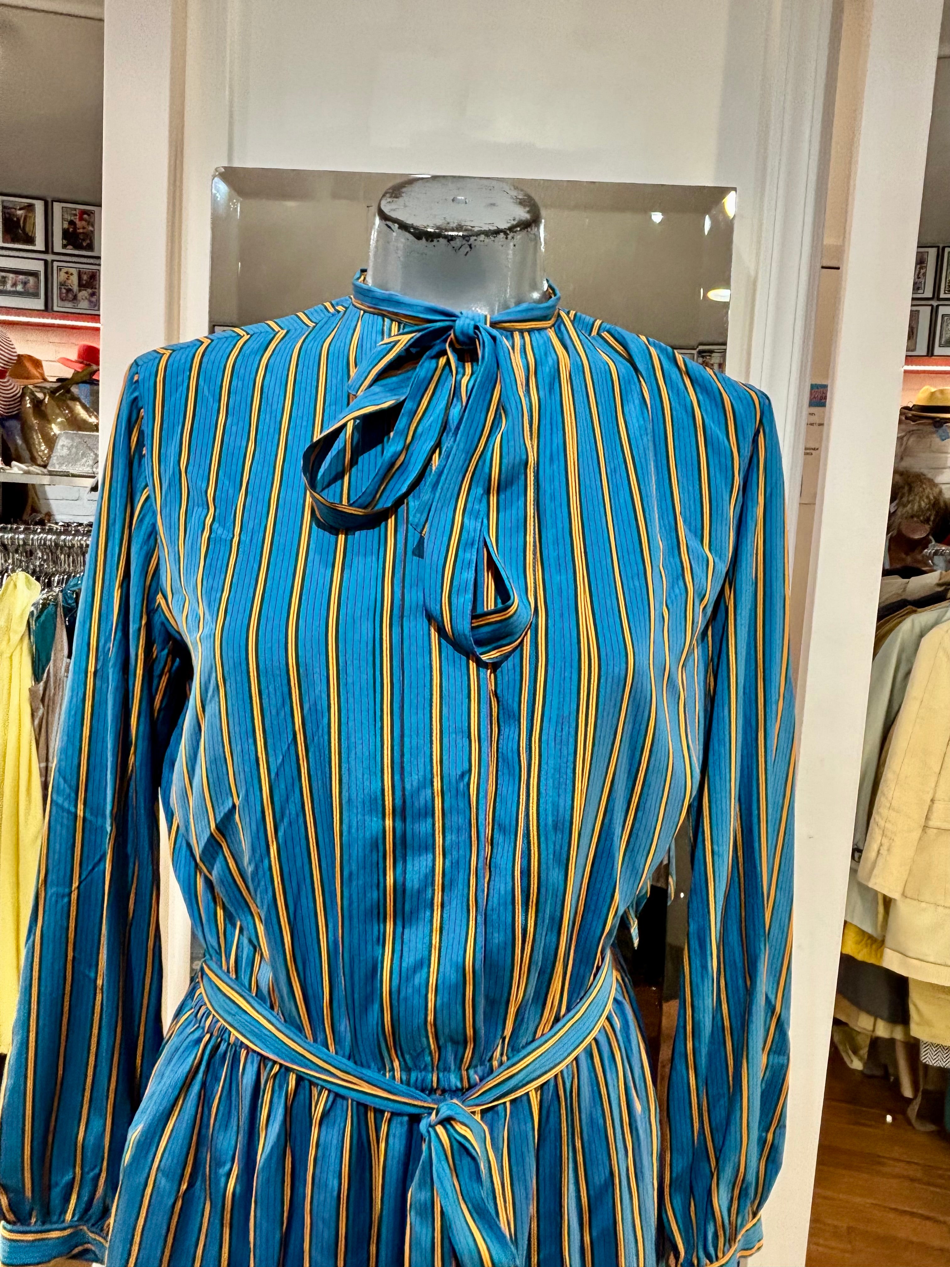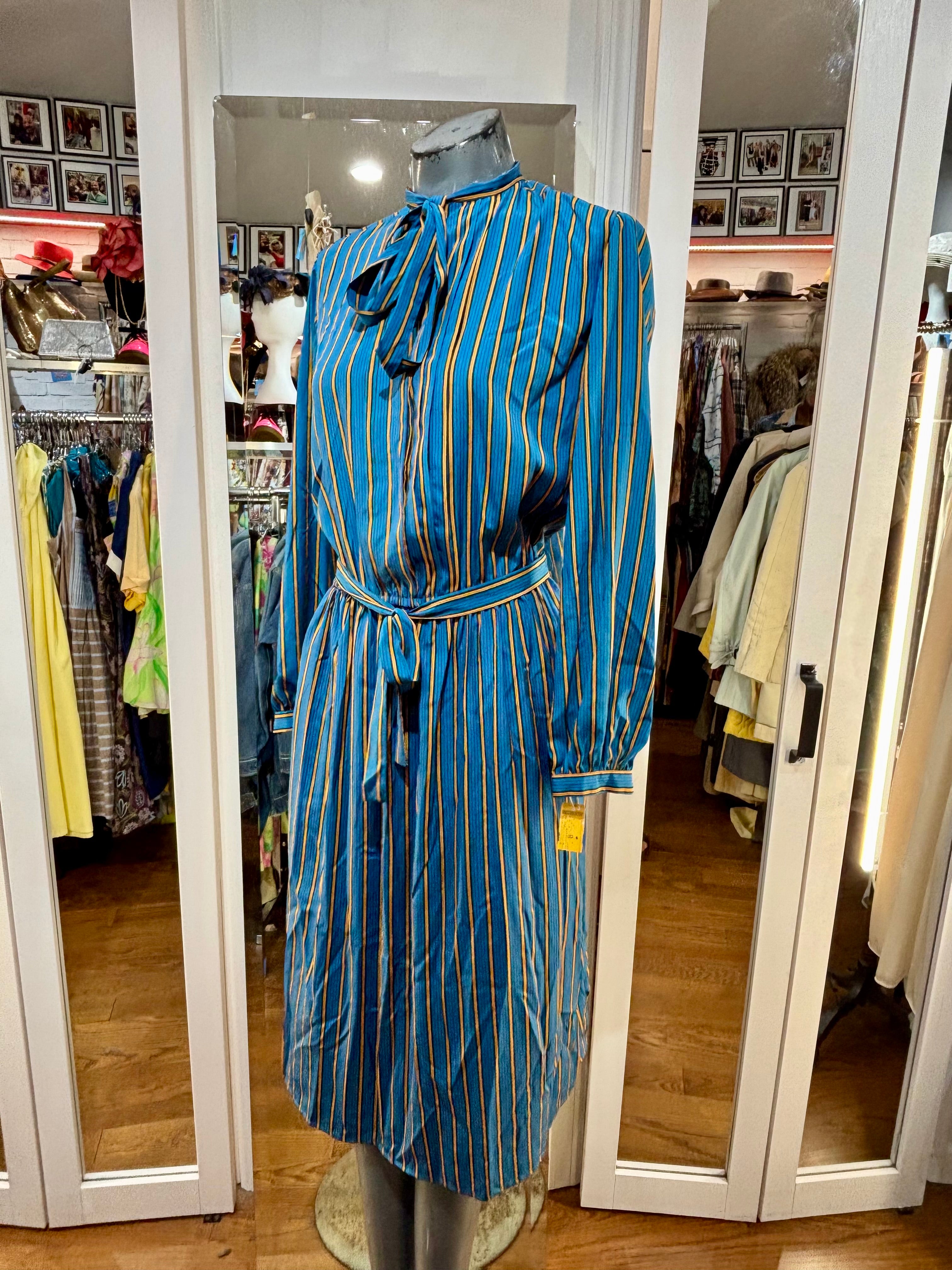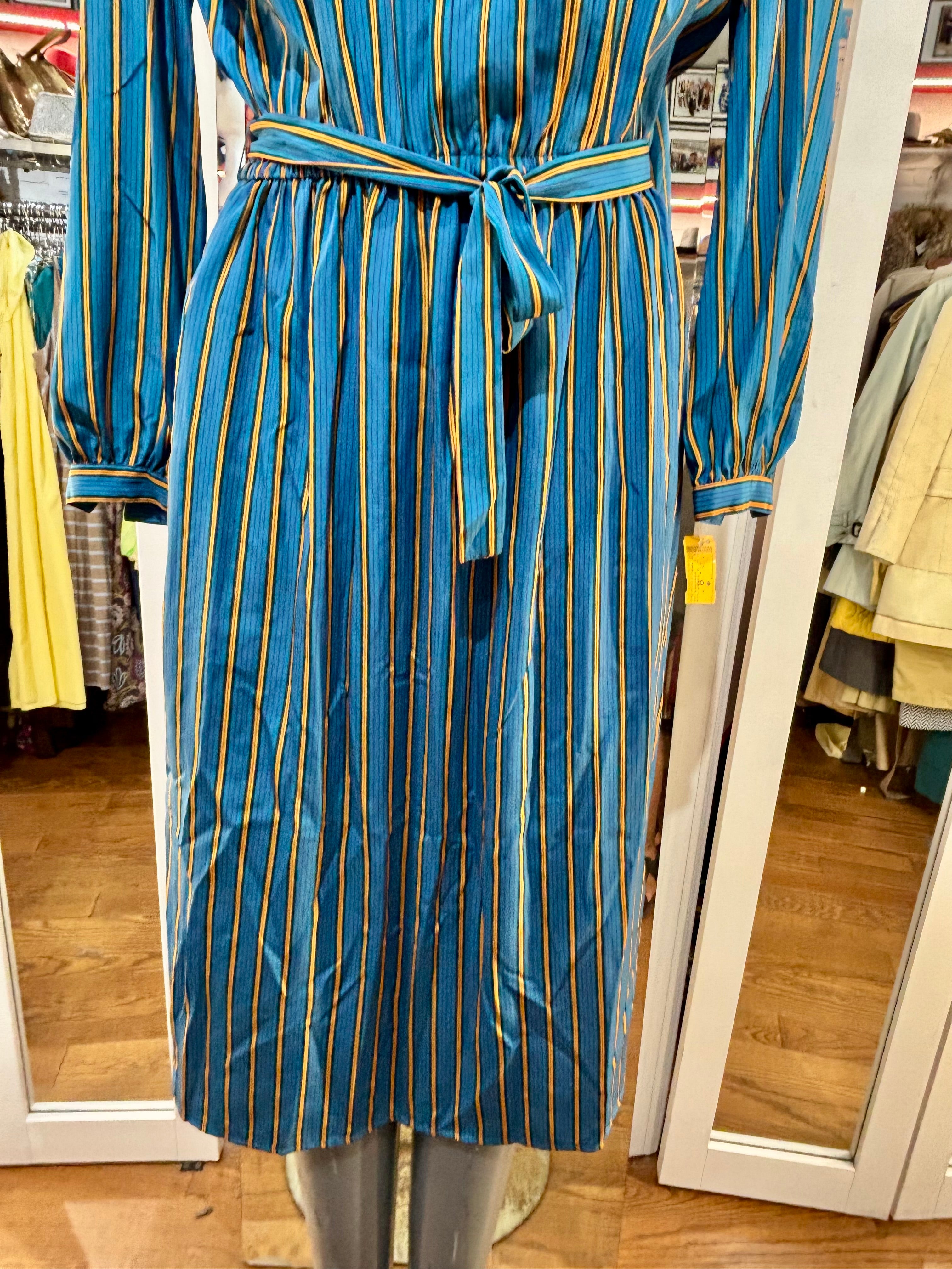 80’s Green And Gold Stripes Long Sleeve Secretary Dress
