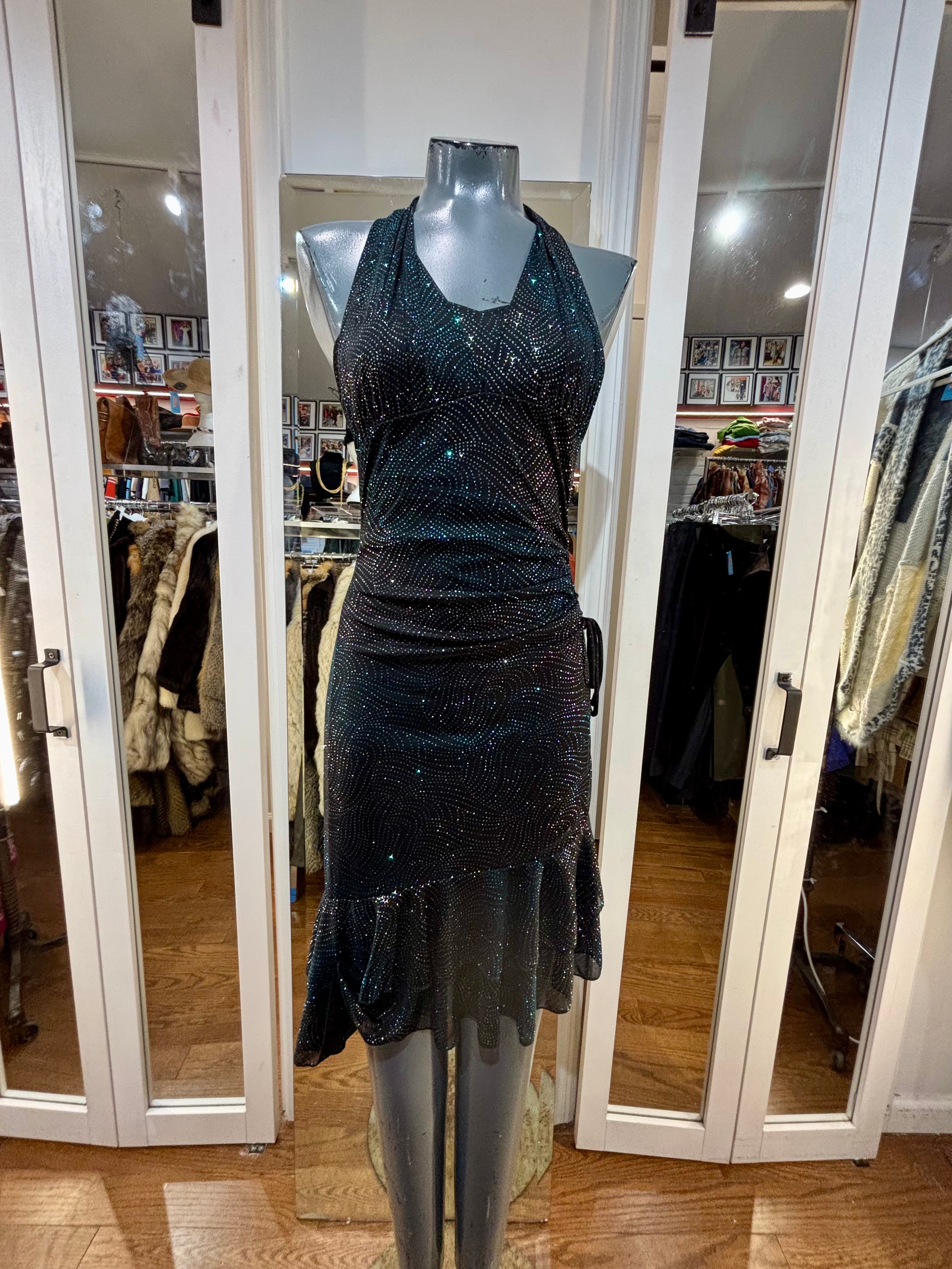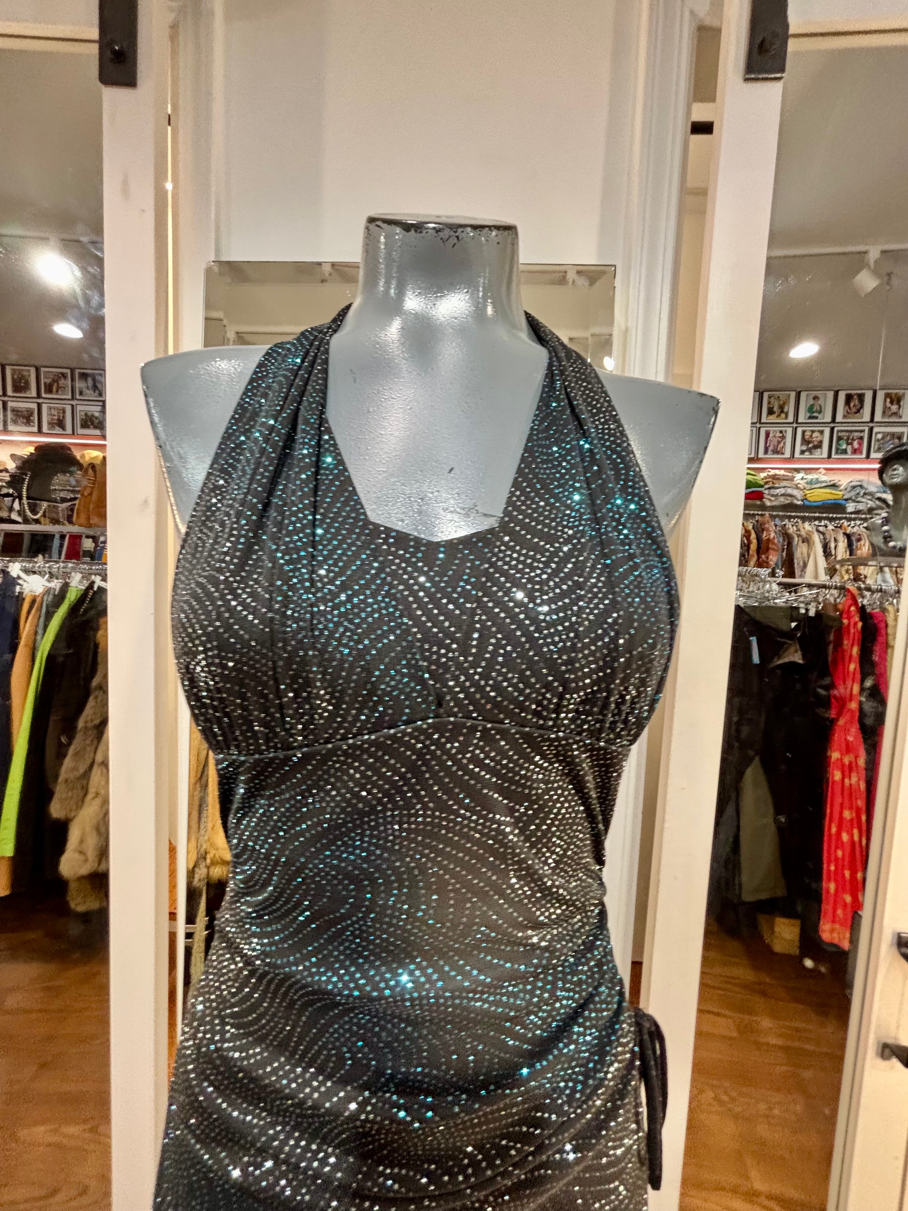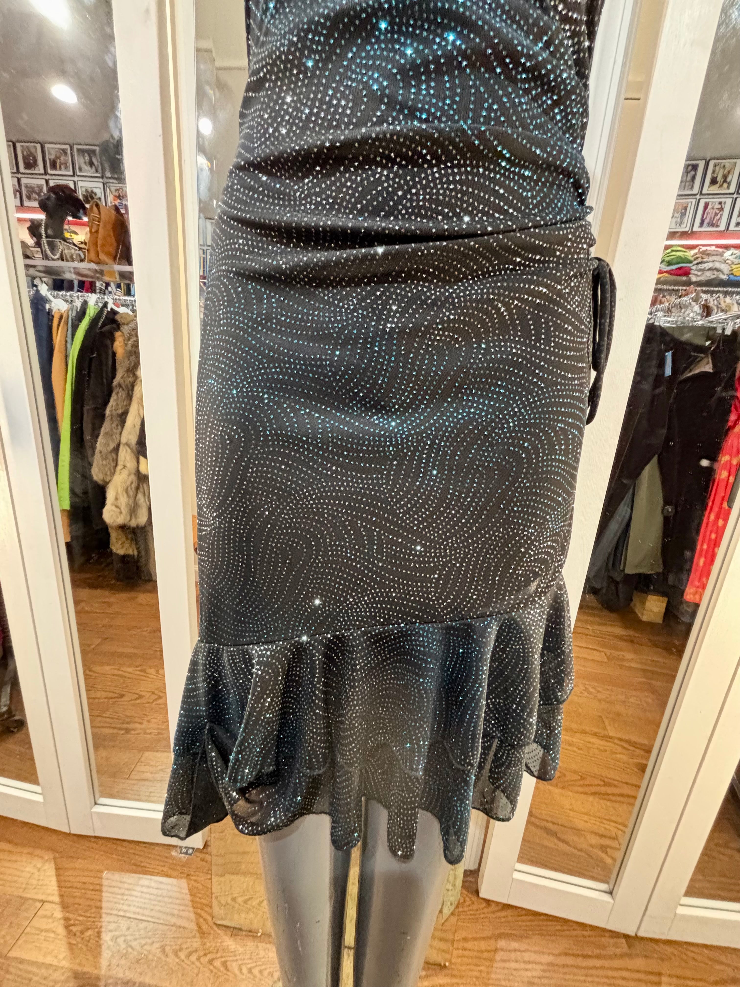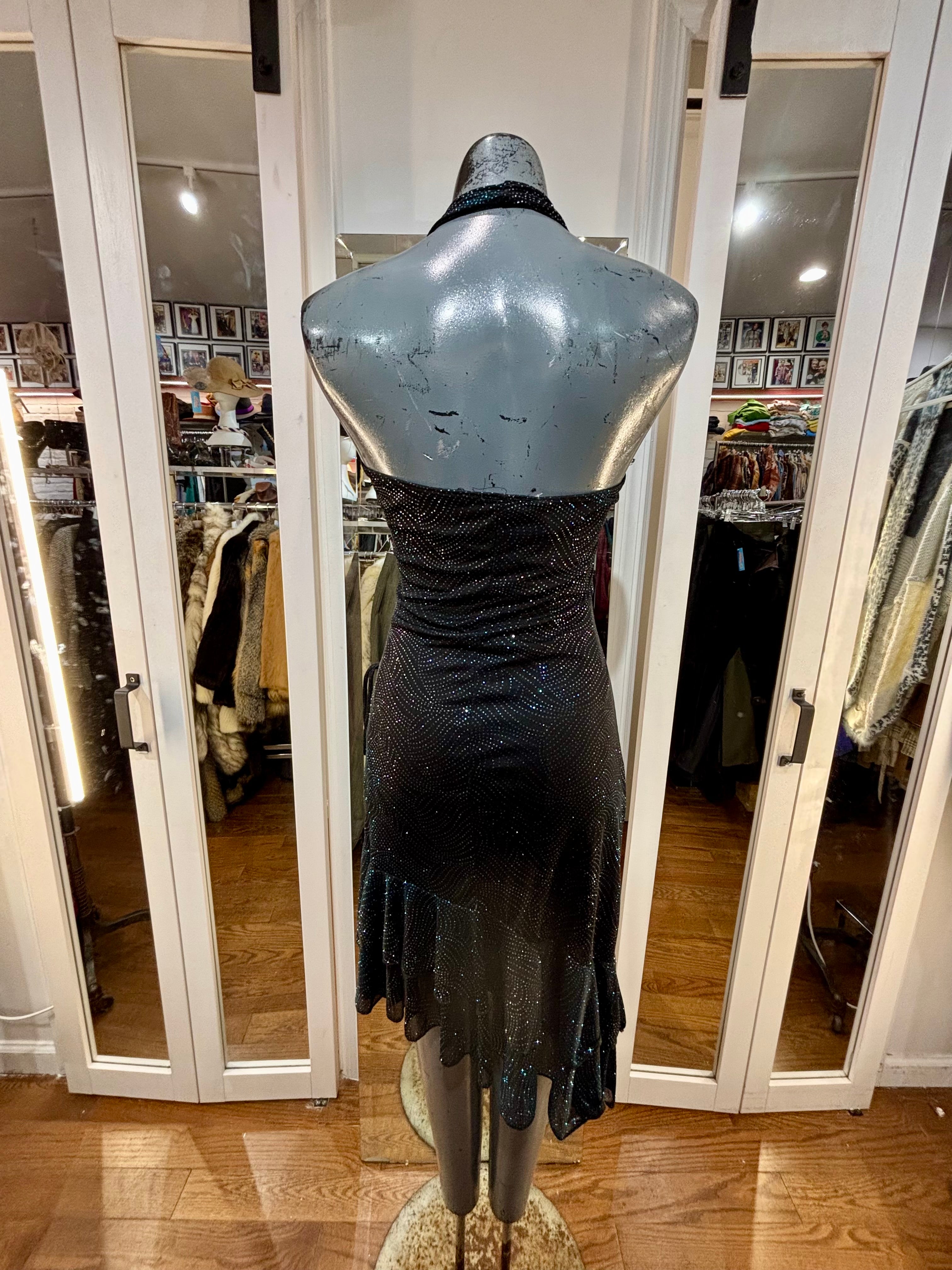 90’s Black Halter And Ruffle Metallic Print Layer Dress By Entrancy