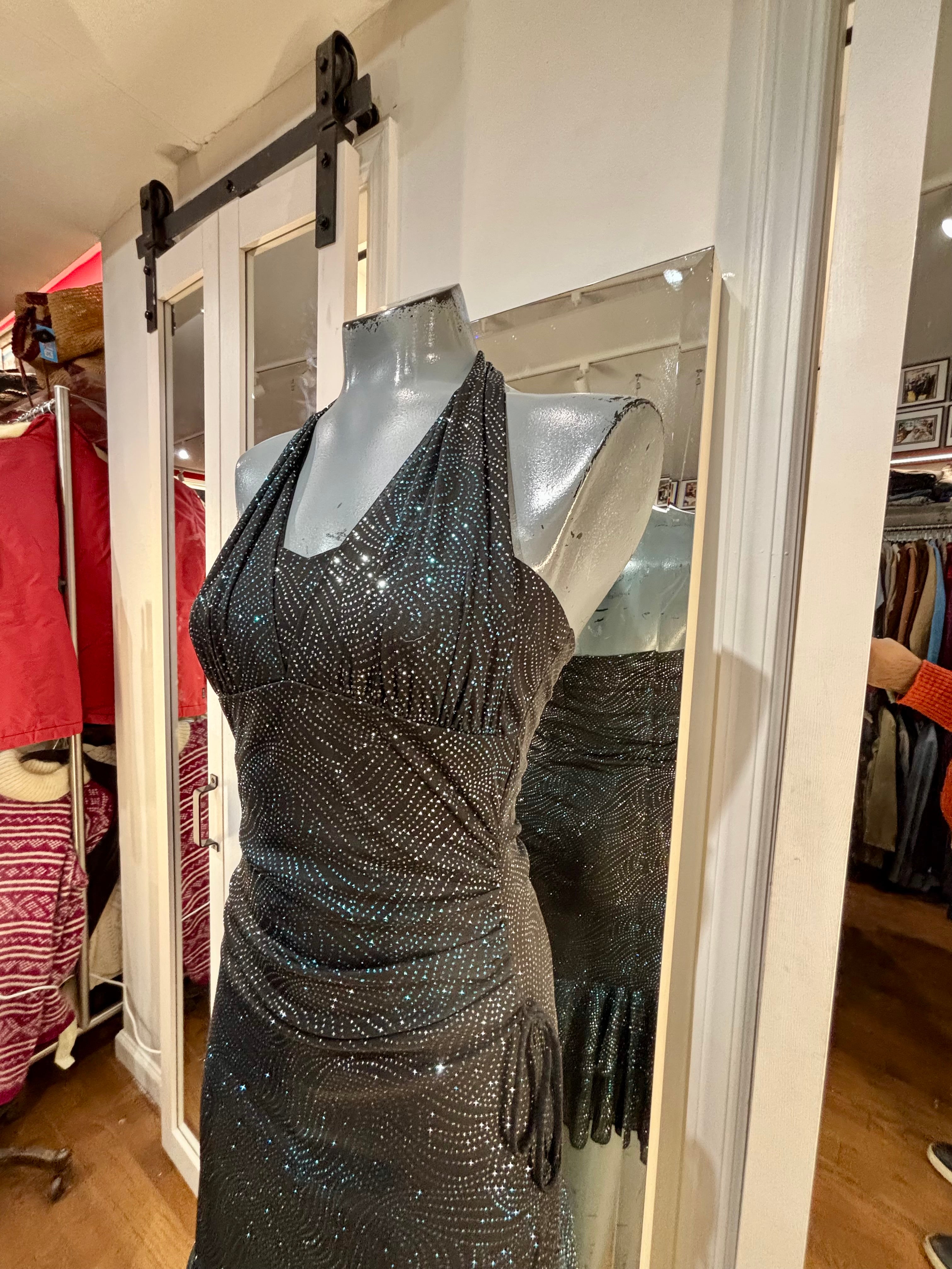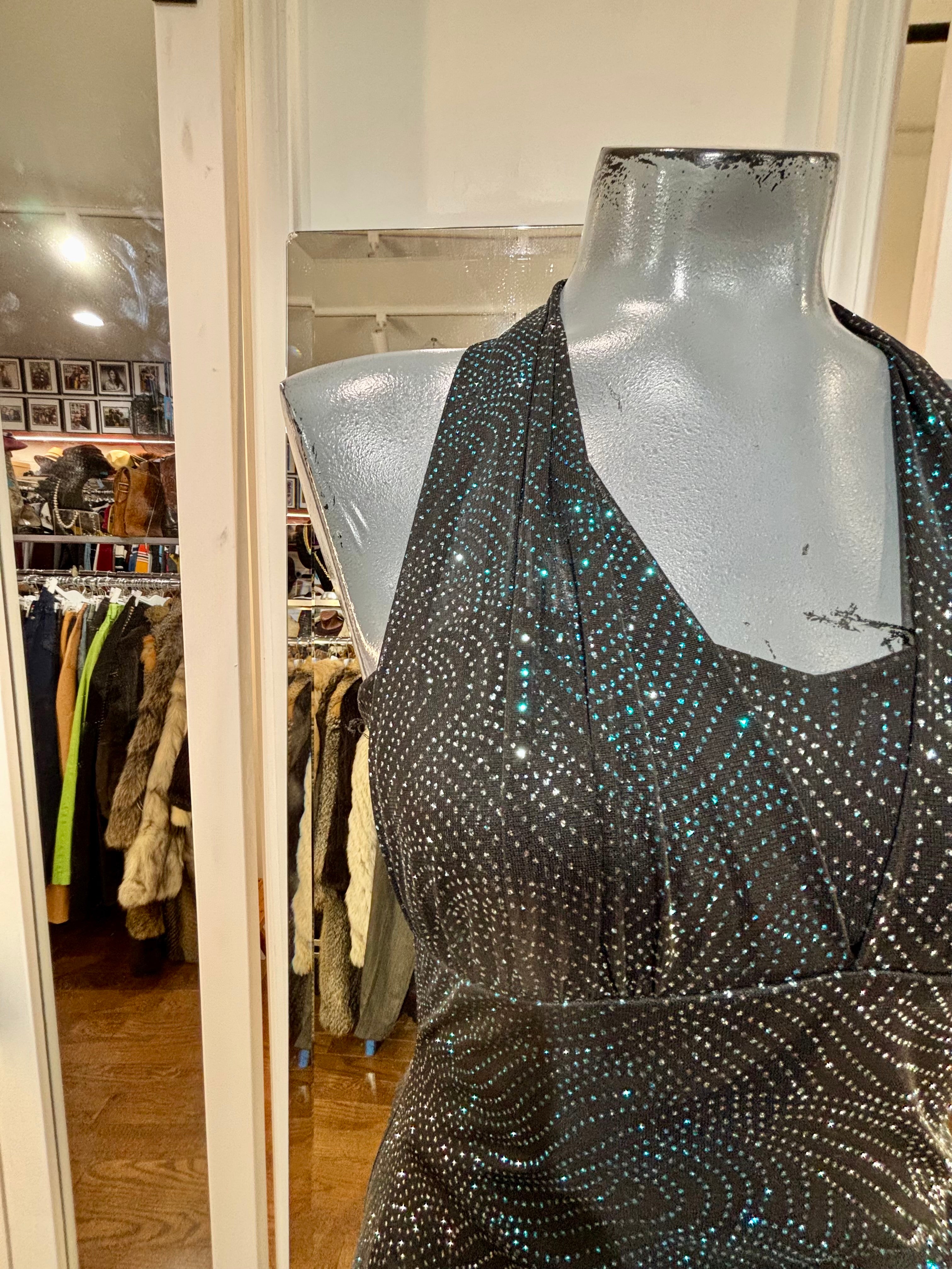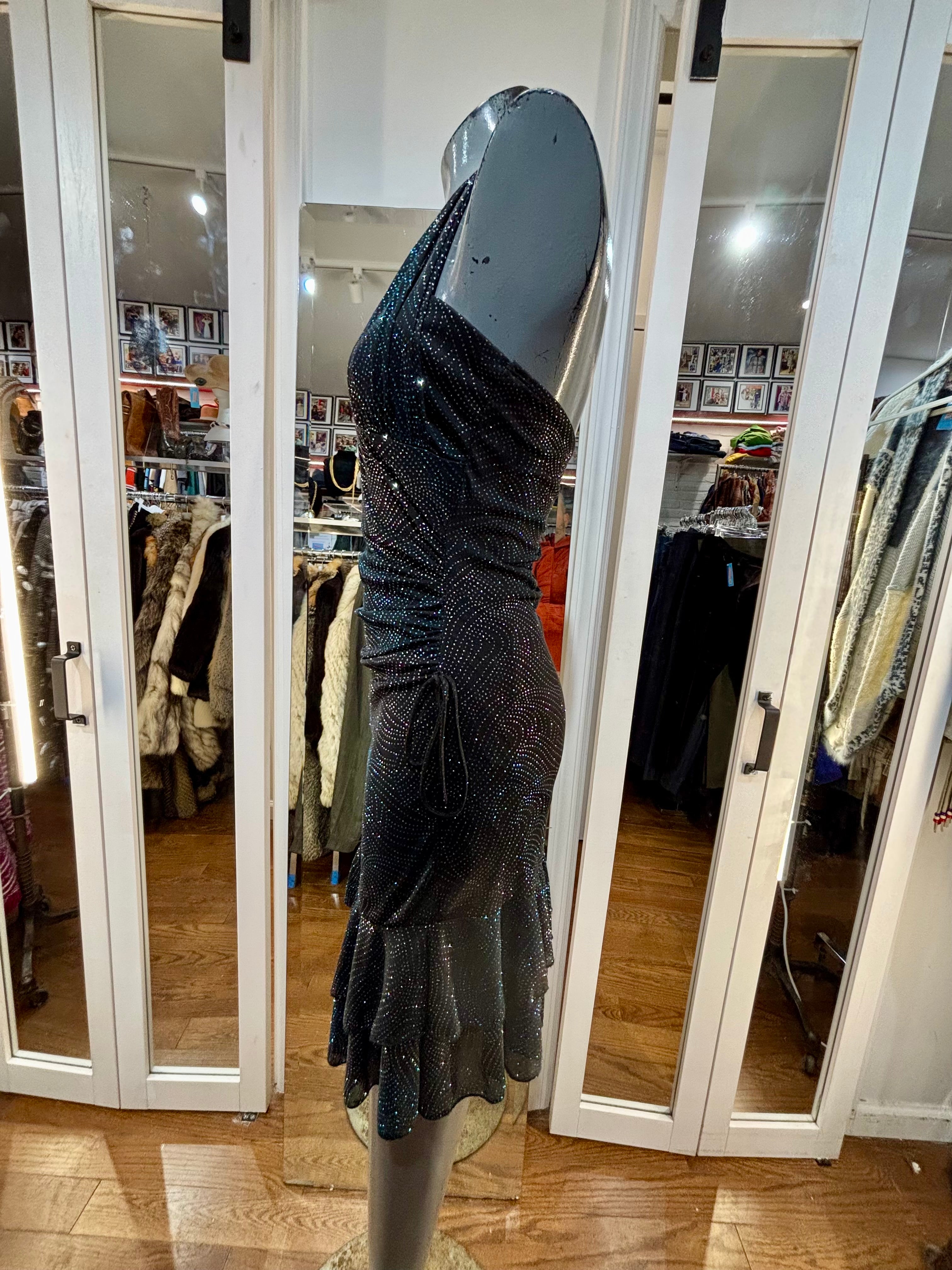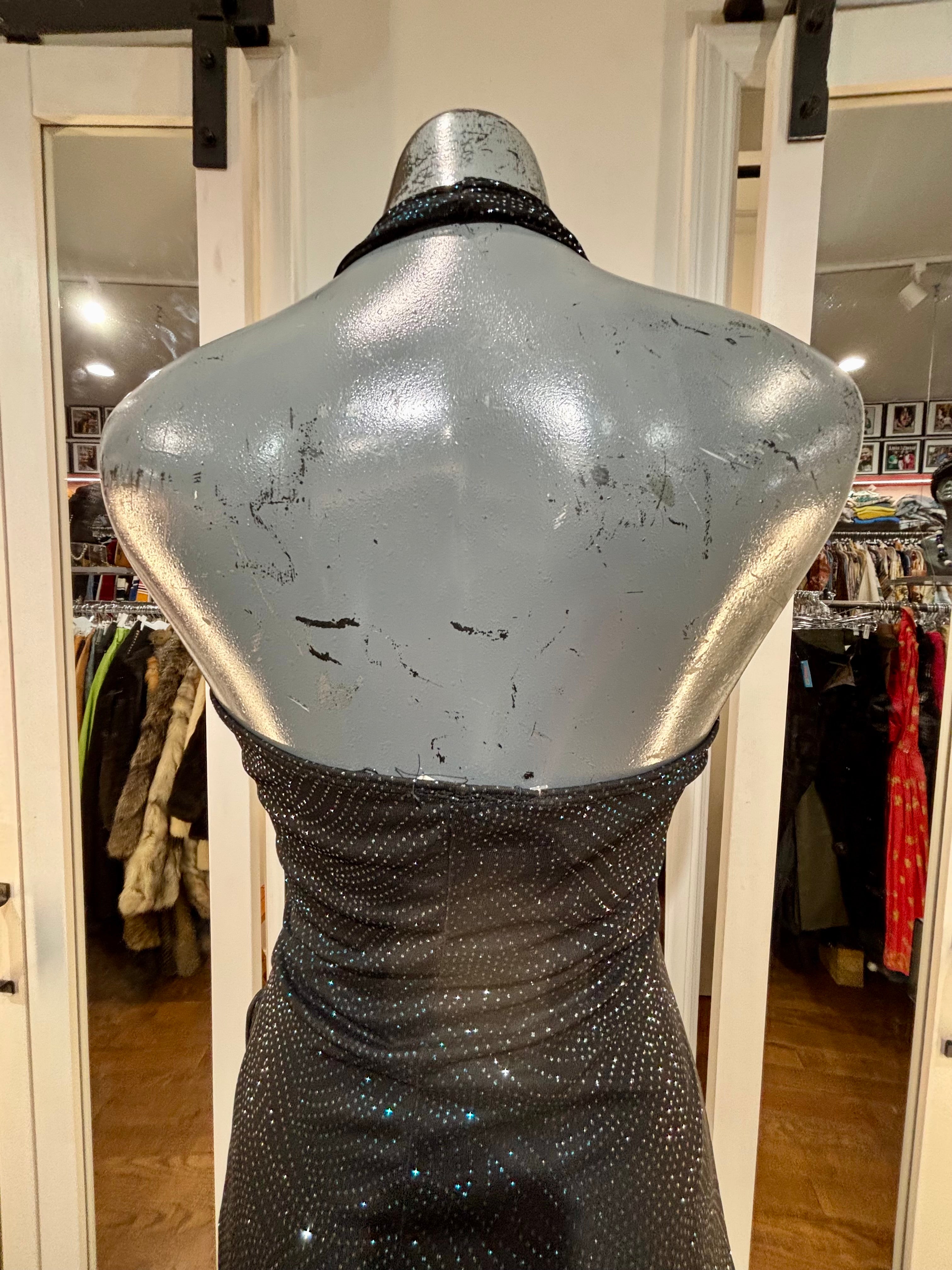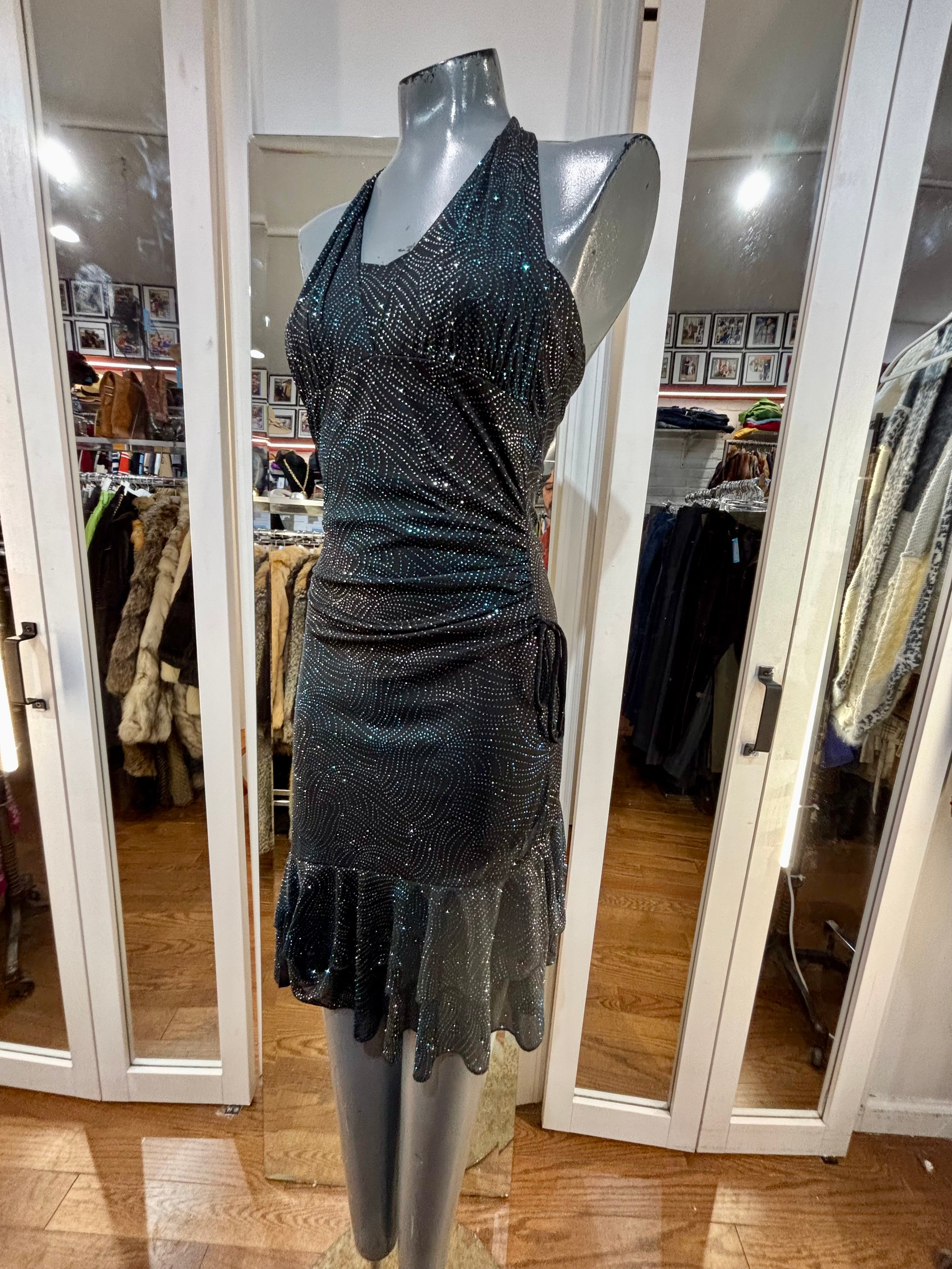 90’s Black Halter And Ruffle Metallic Print Layer Dress By Entrancy