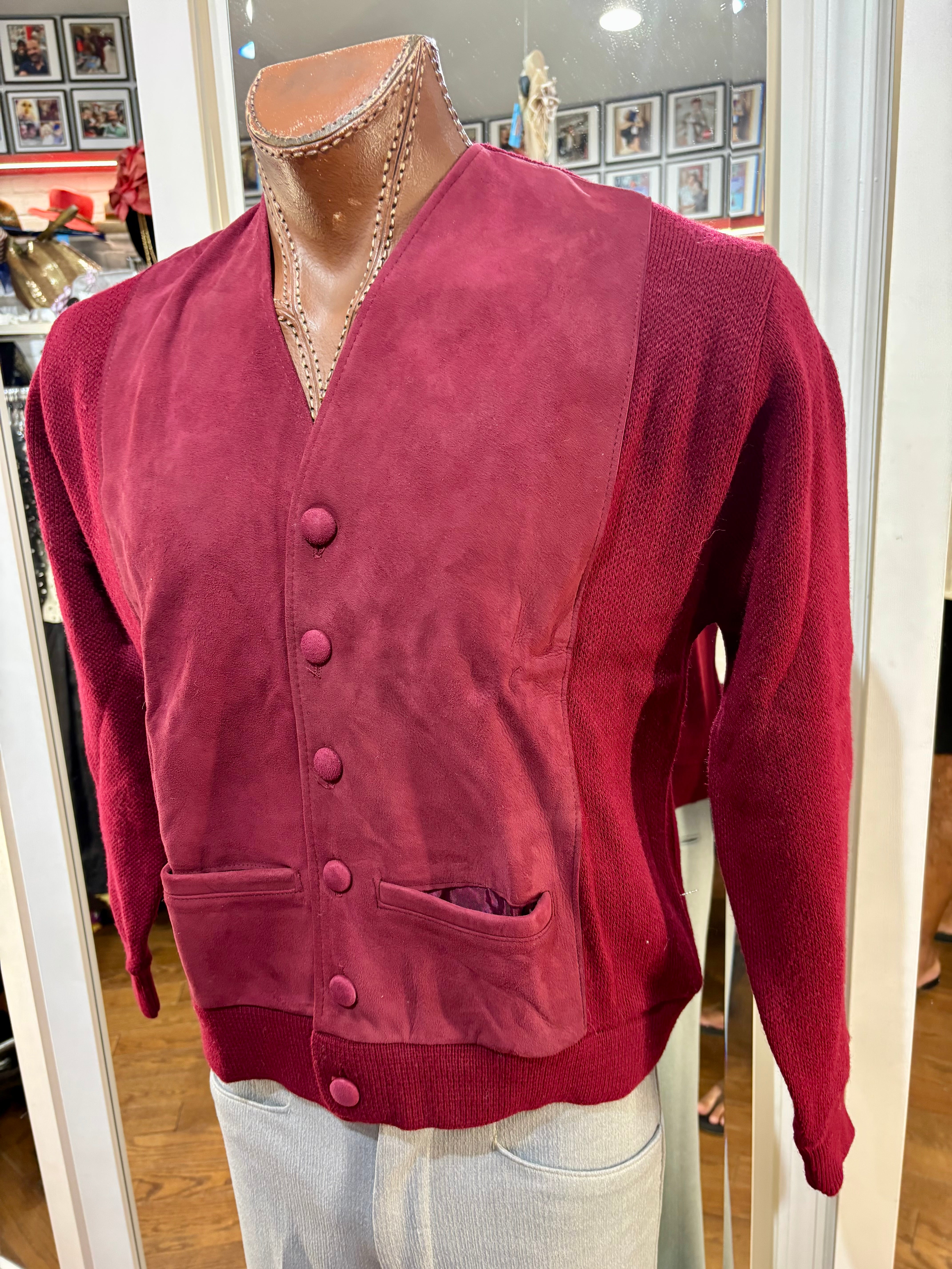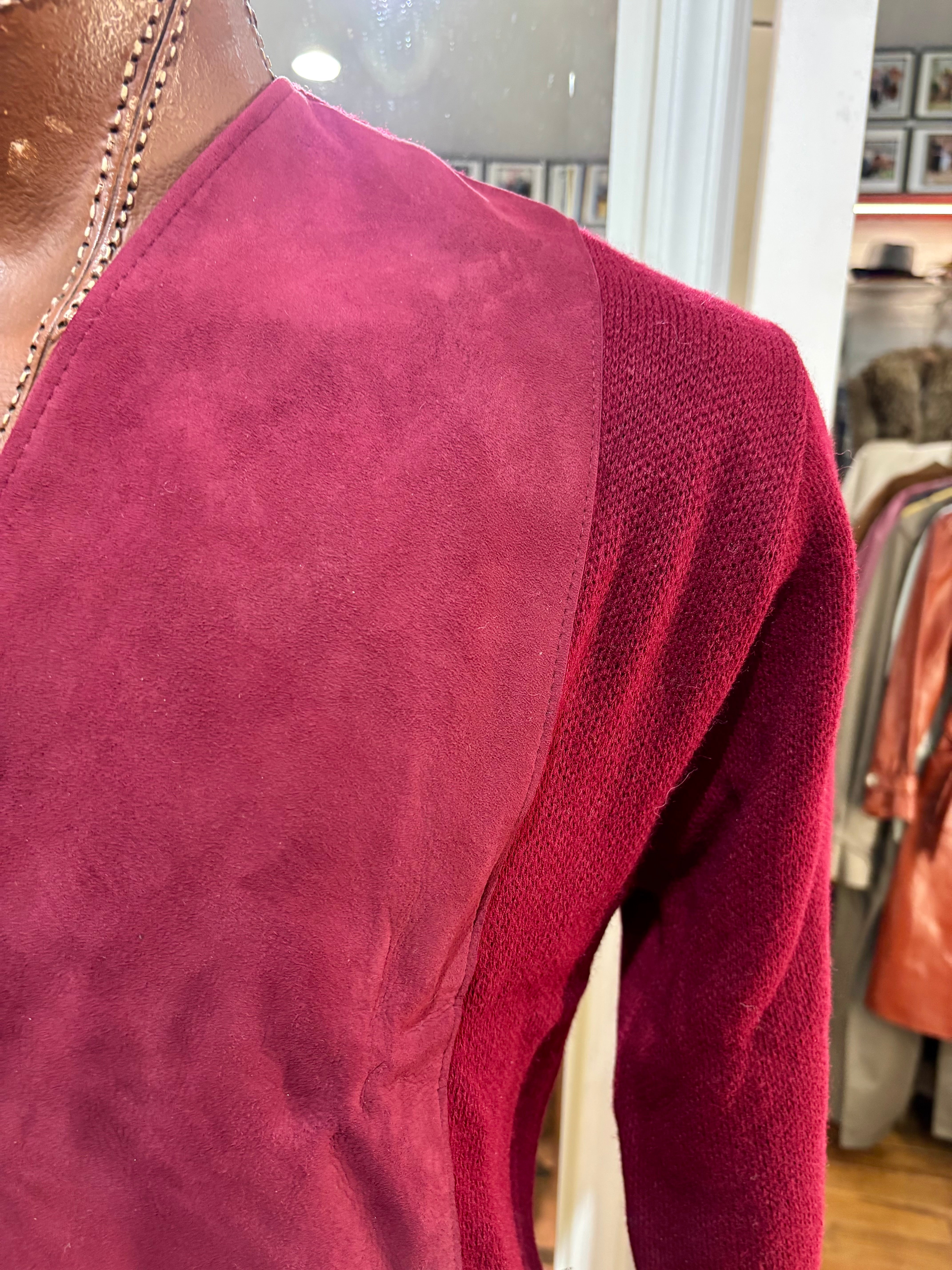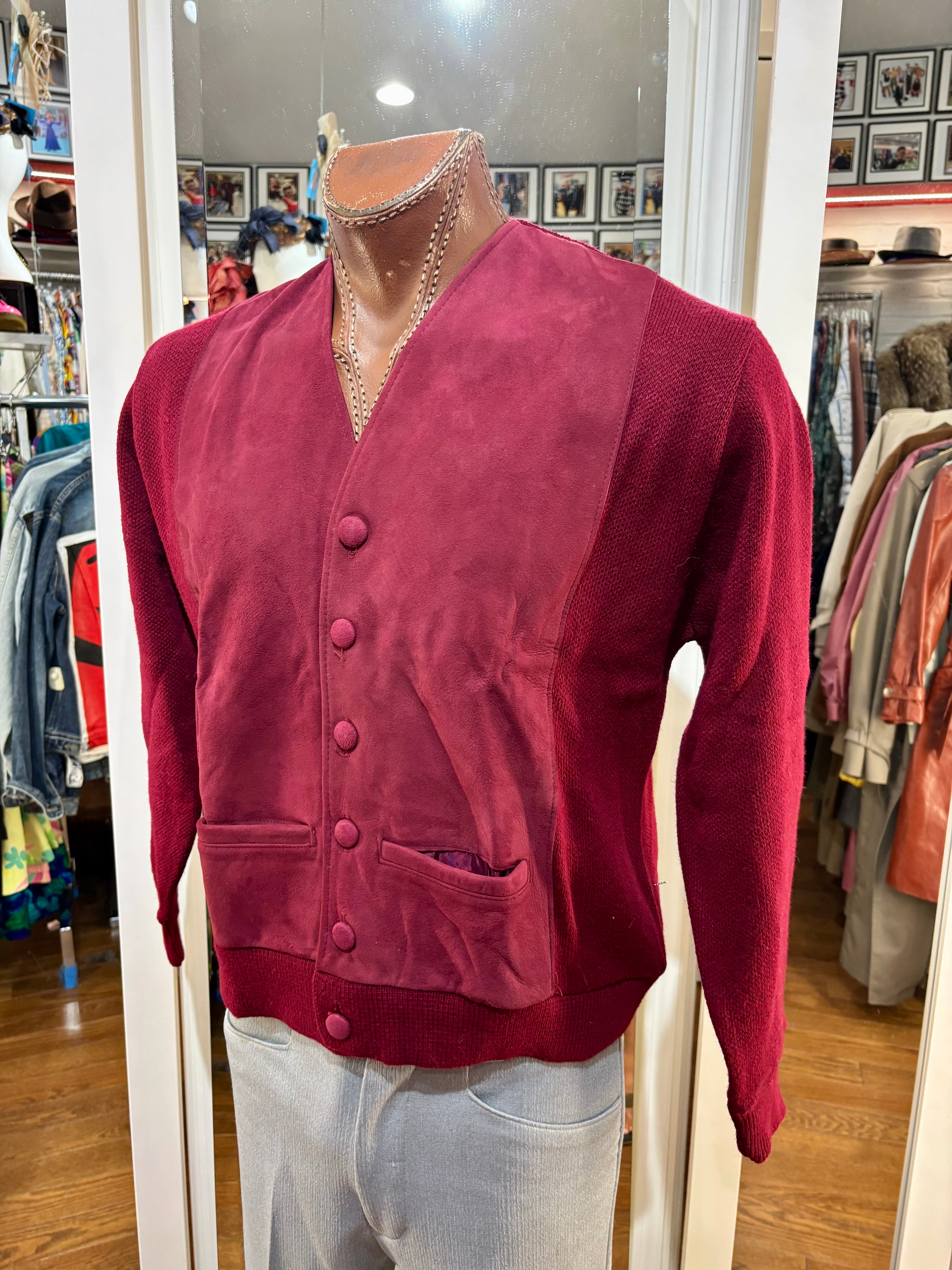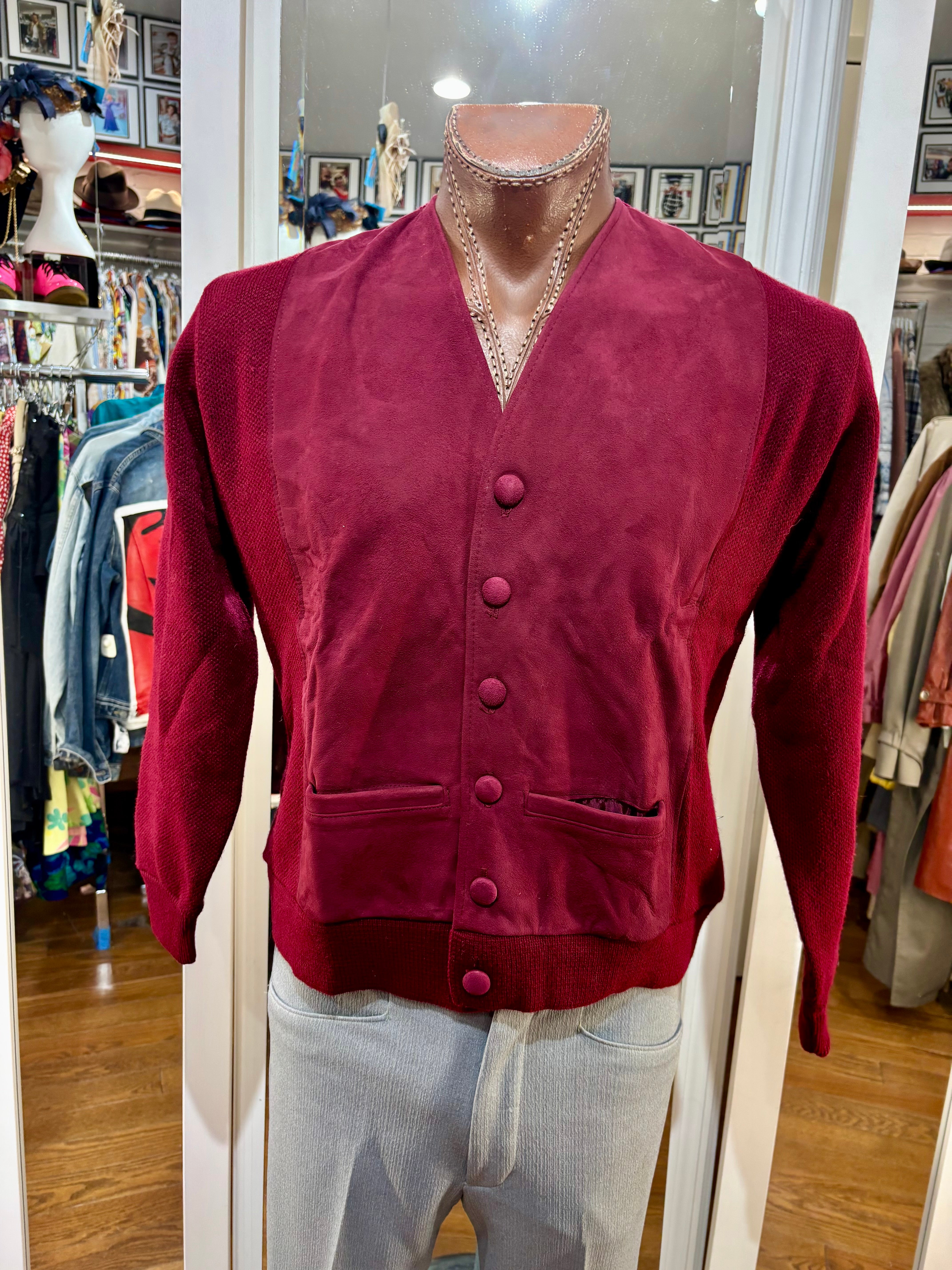 60’s Burgundy Knit And Suede Bottom Cardigan By Sar-Dun