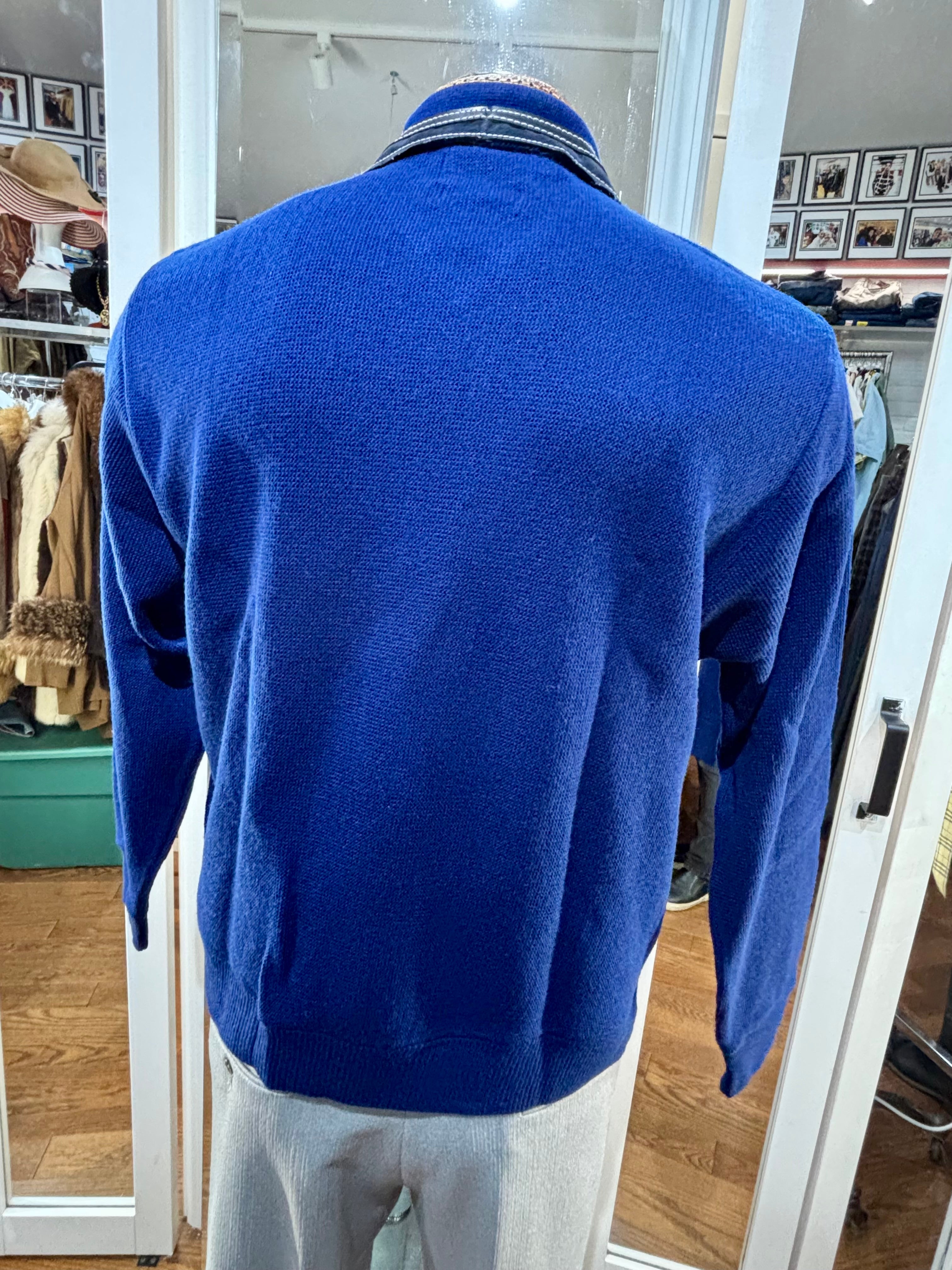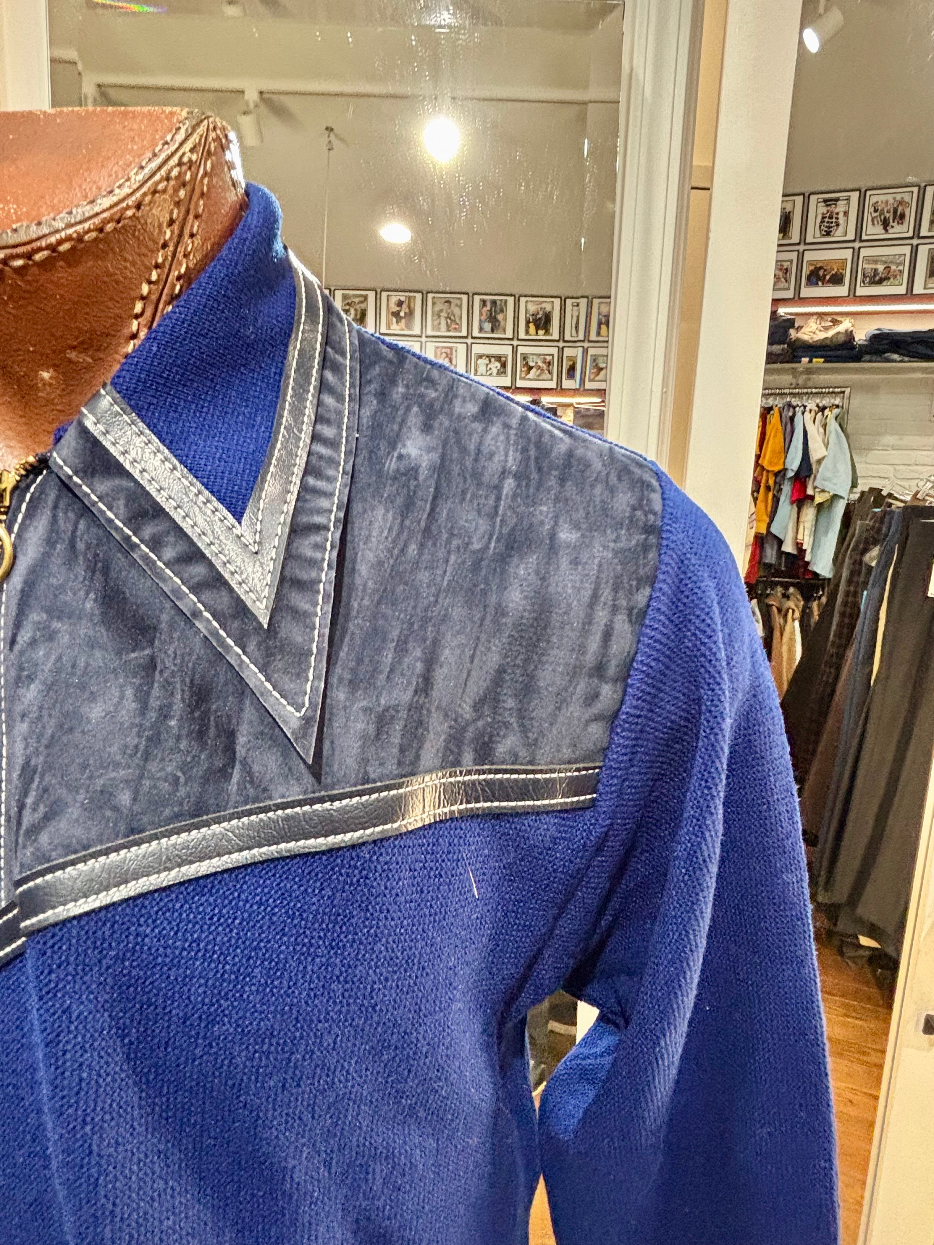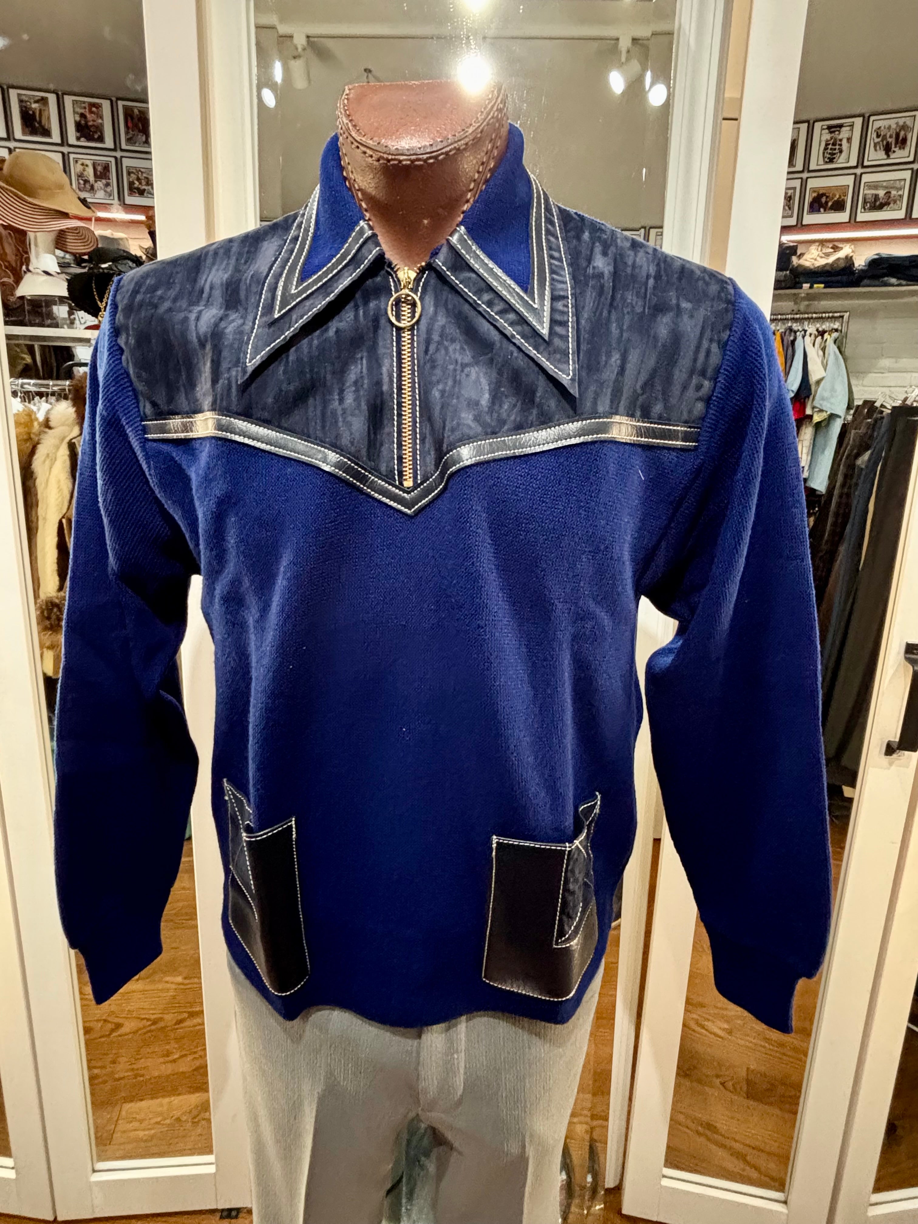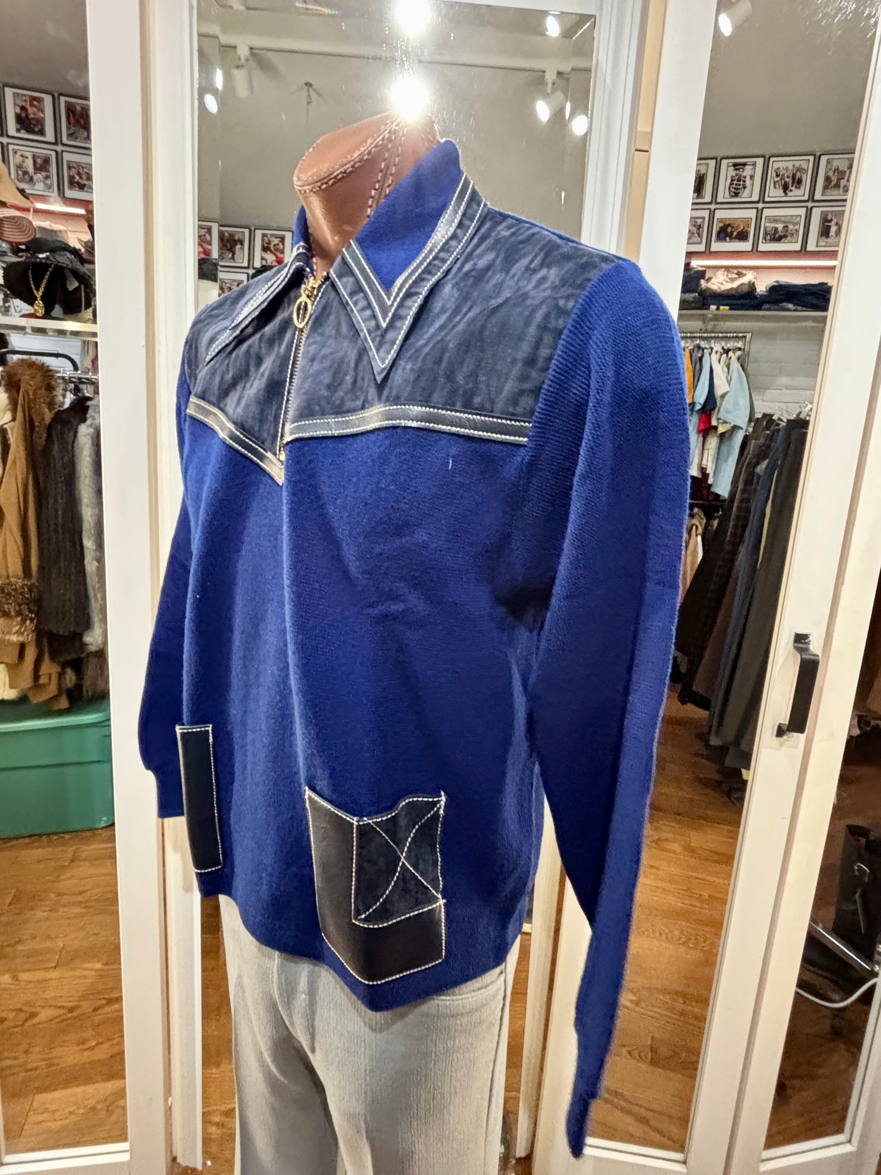 70’s Blue Old Stock Zip Collar Pull Sweater With Applications By Mc Brian