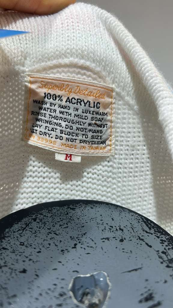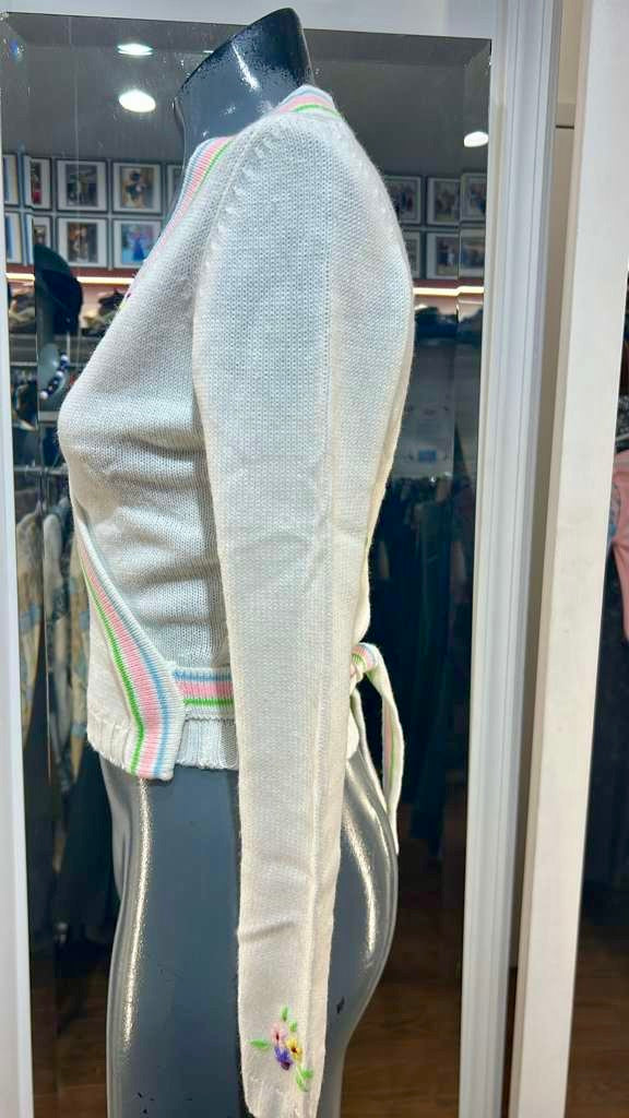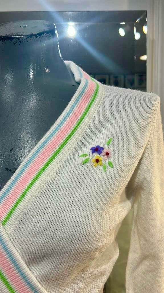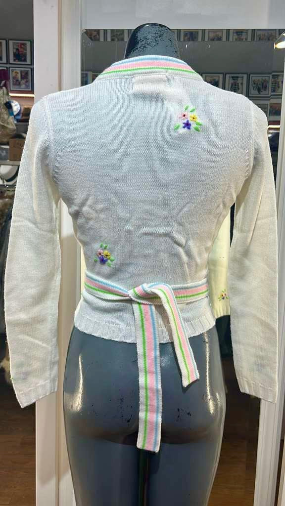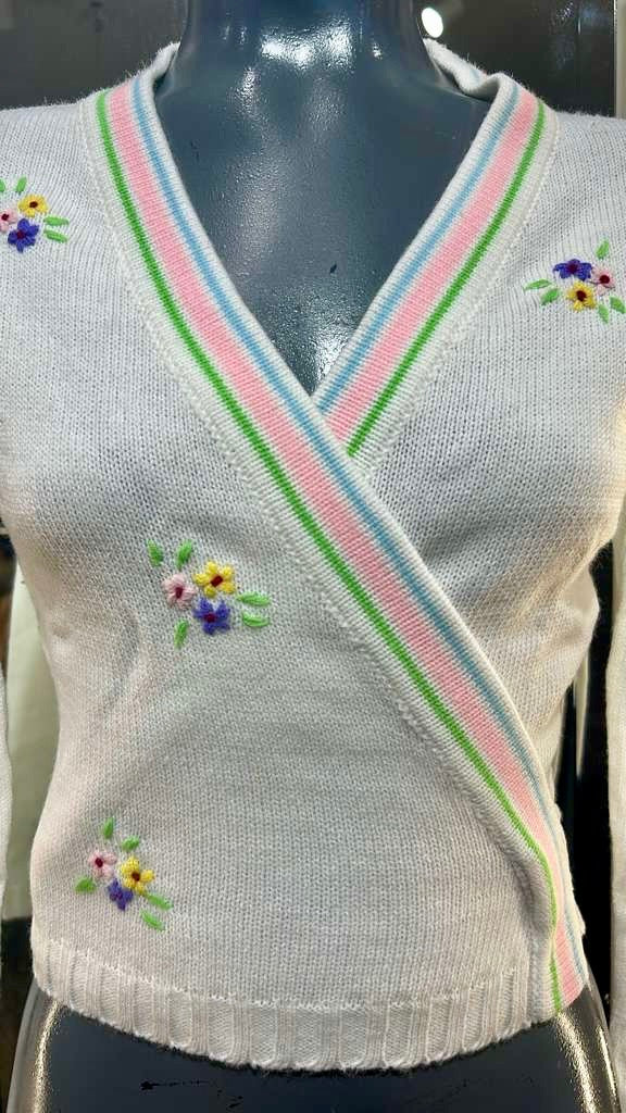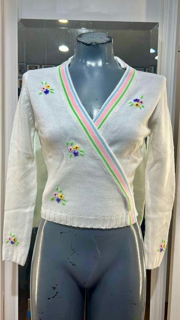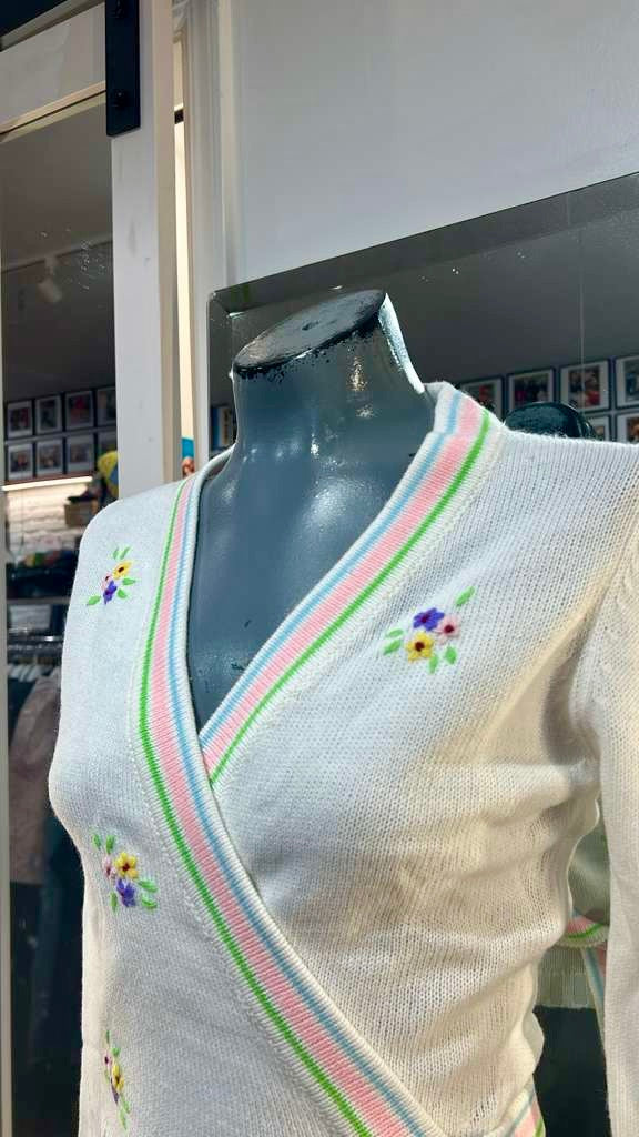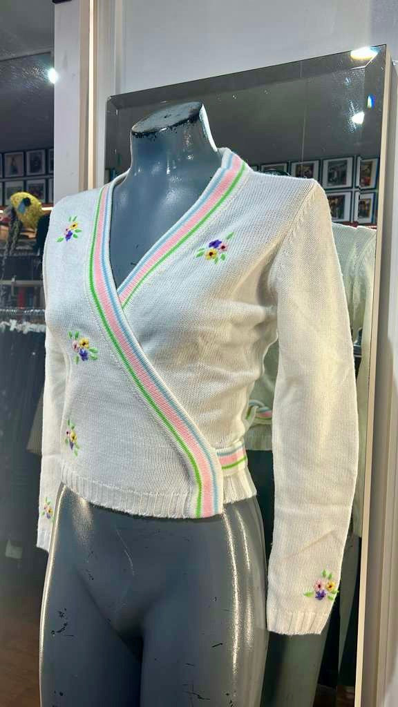70’s Off White Wrap Cardigan With Embroidery Details Long Sleeve knit Dead Stock