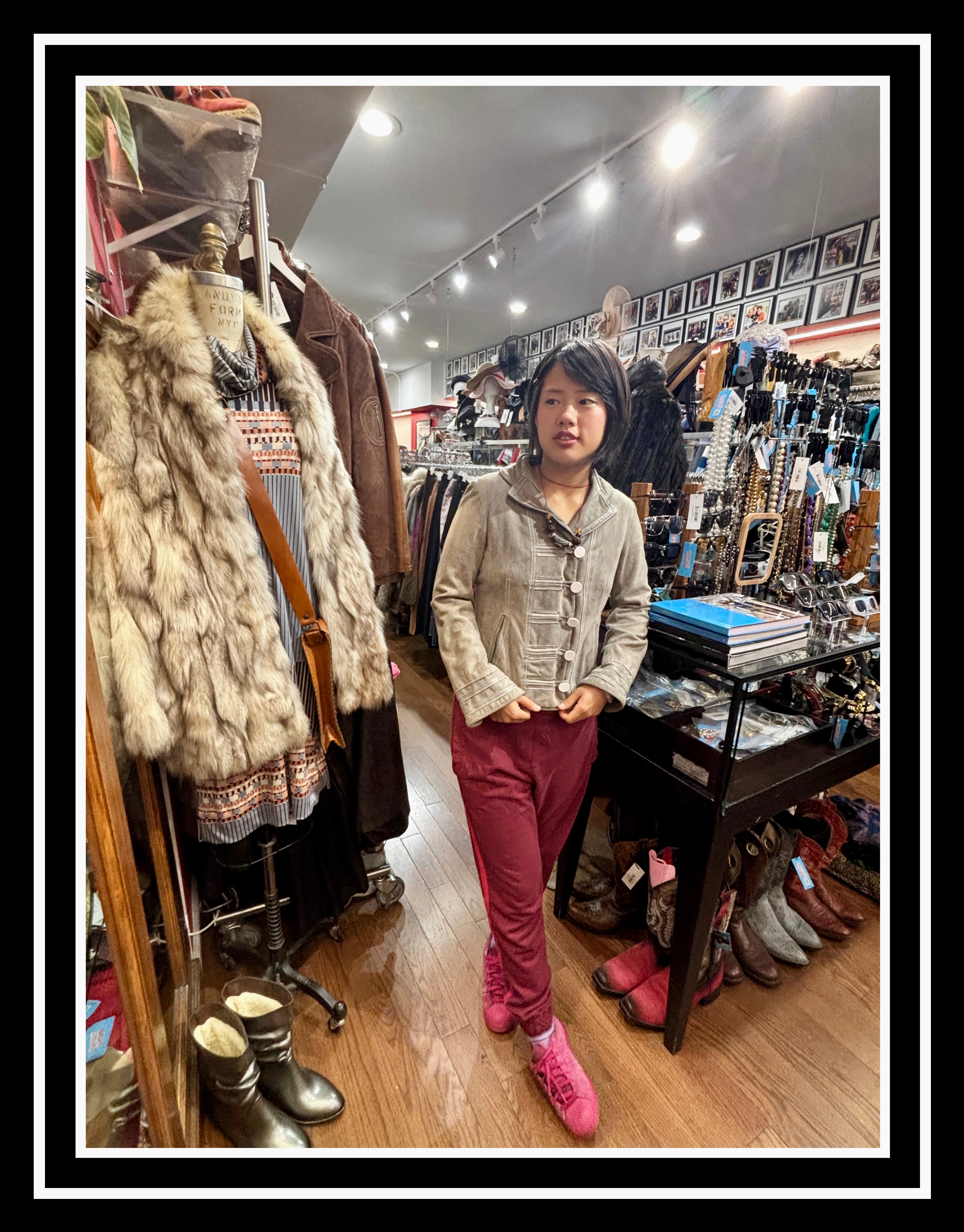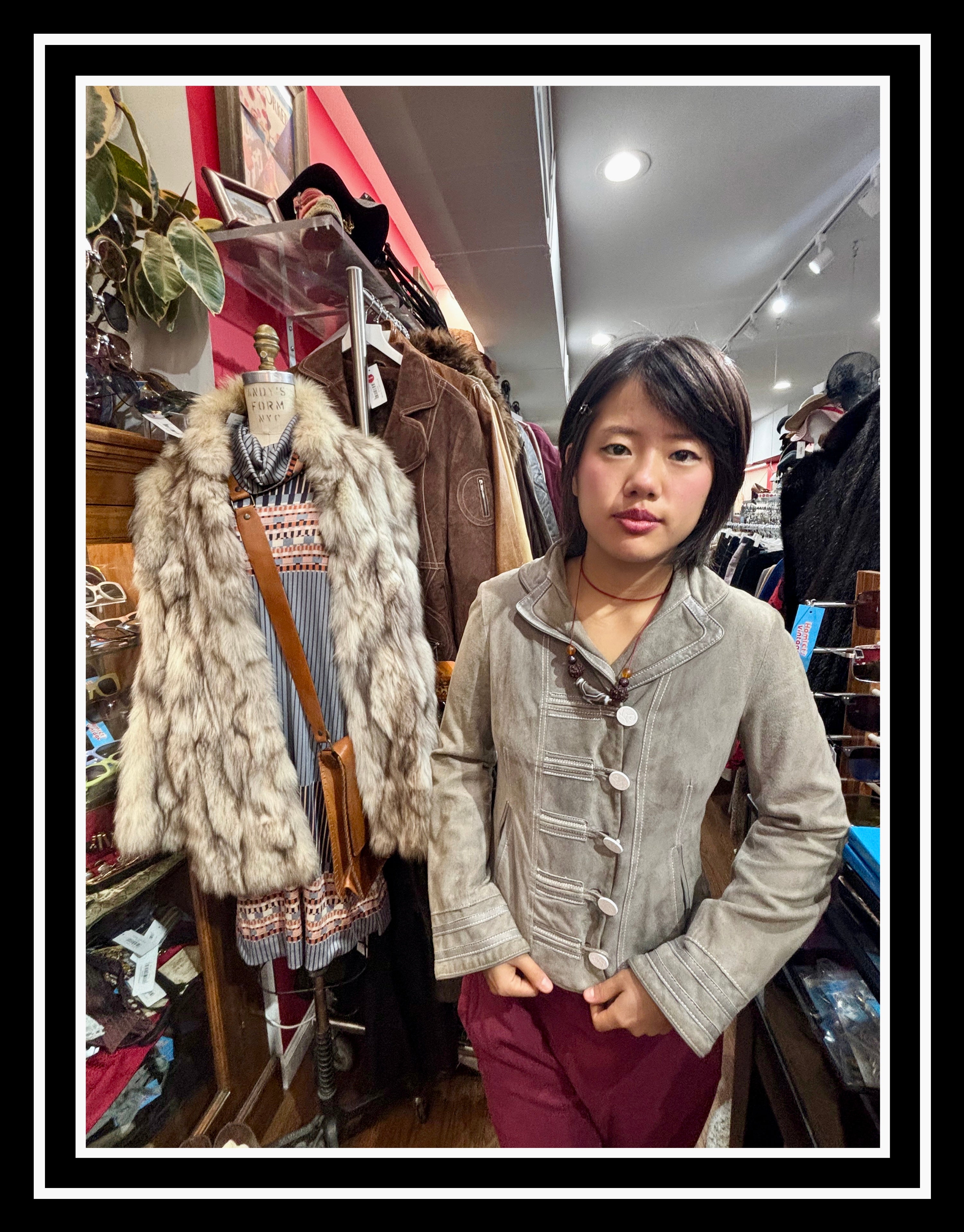 2000’s Z Spoke by Zac Posen grey suede jacket with white plastic buttons on front and sleeves.