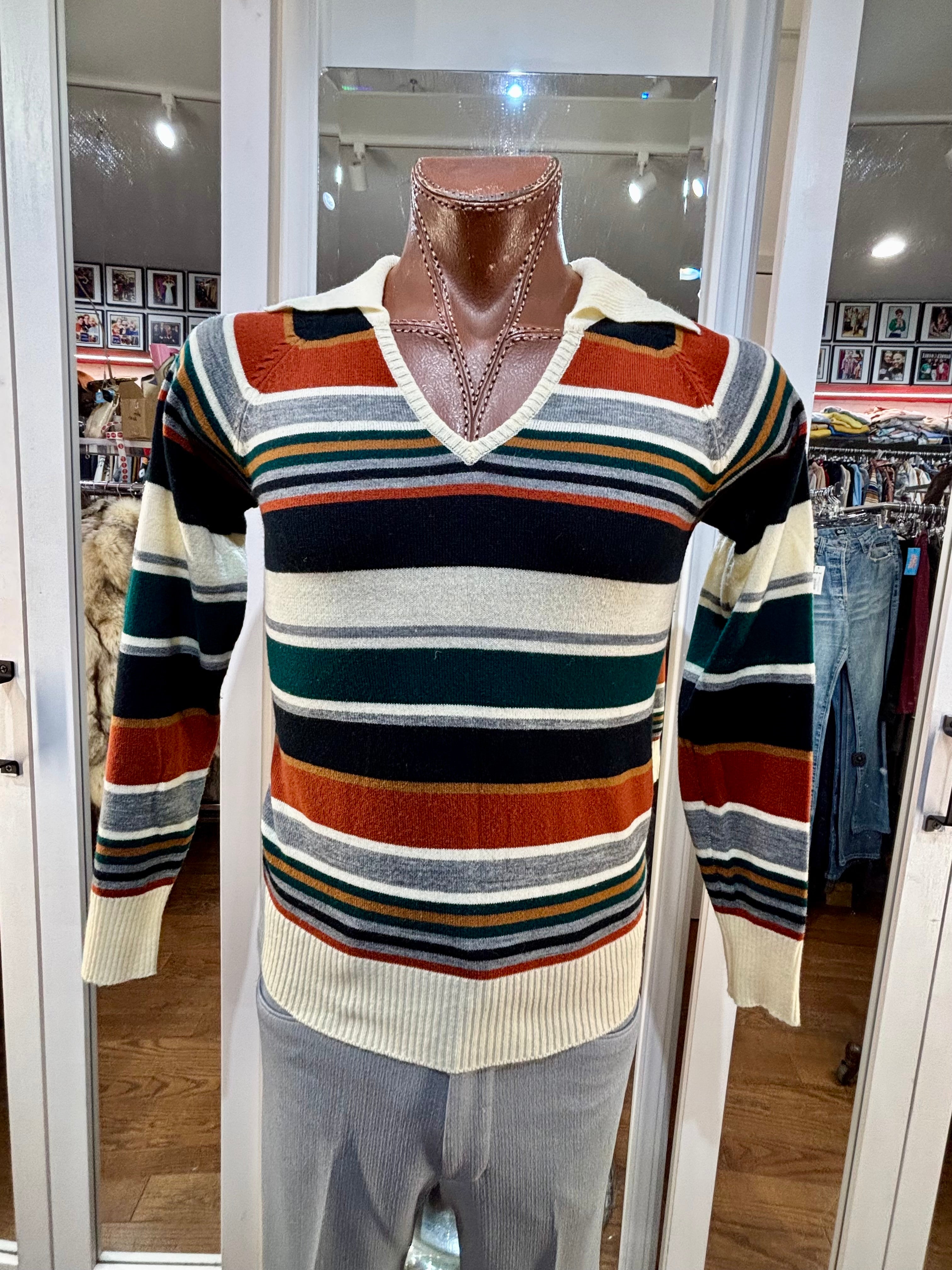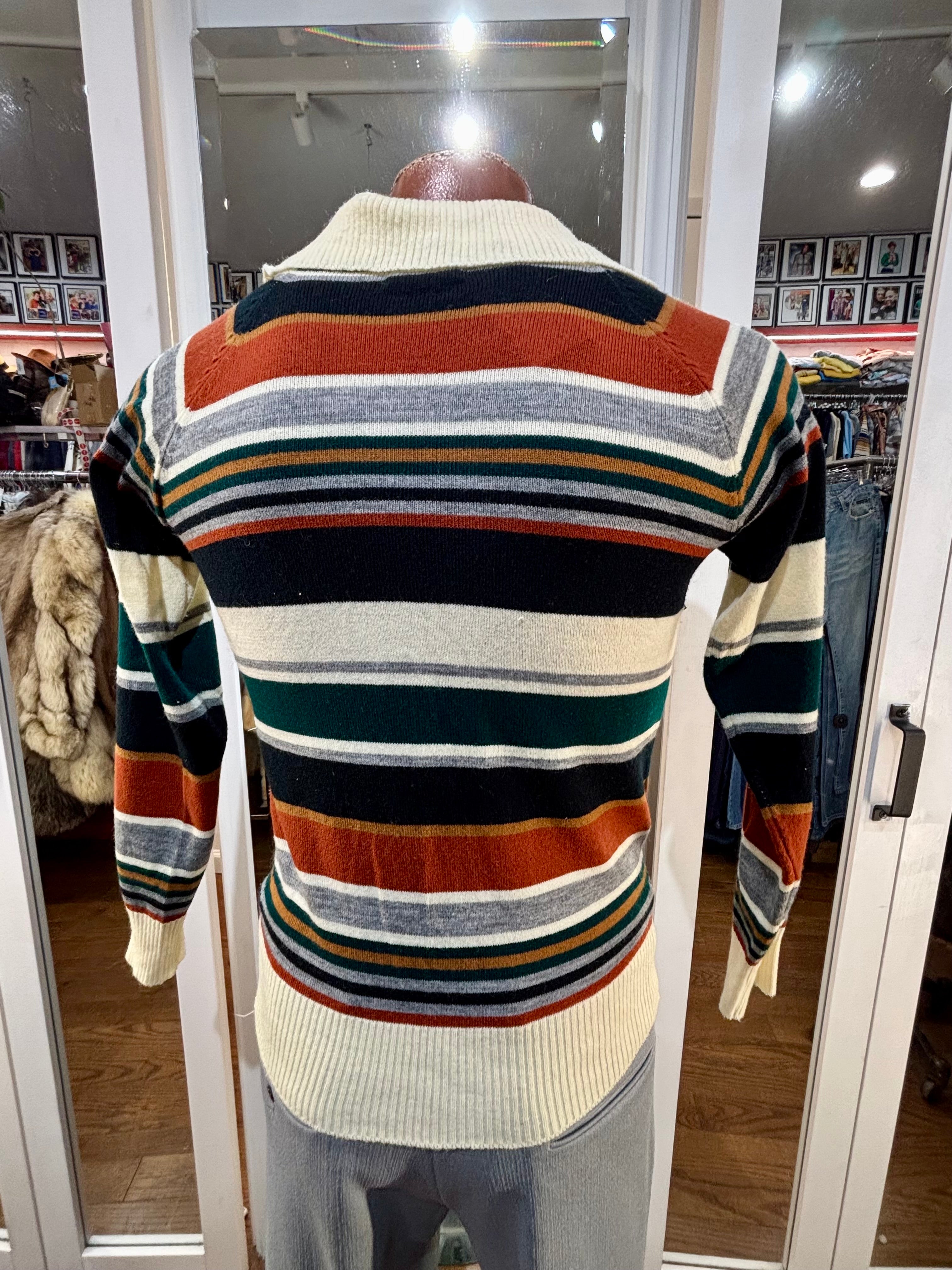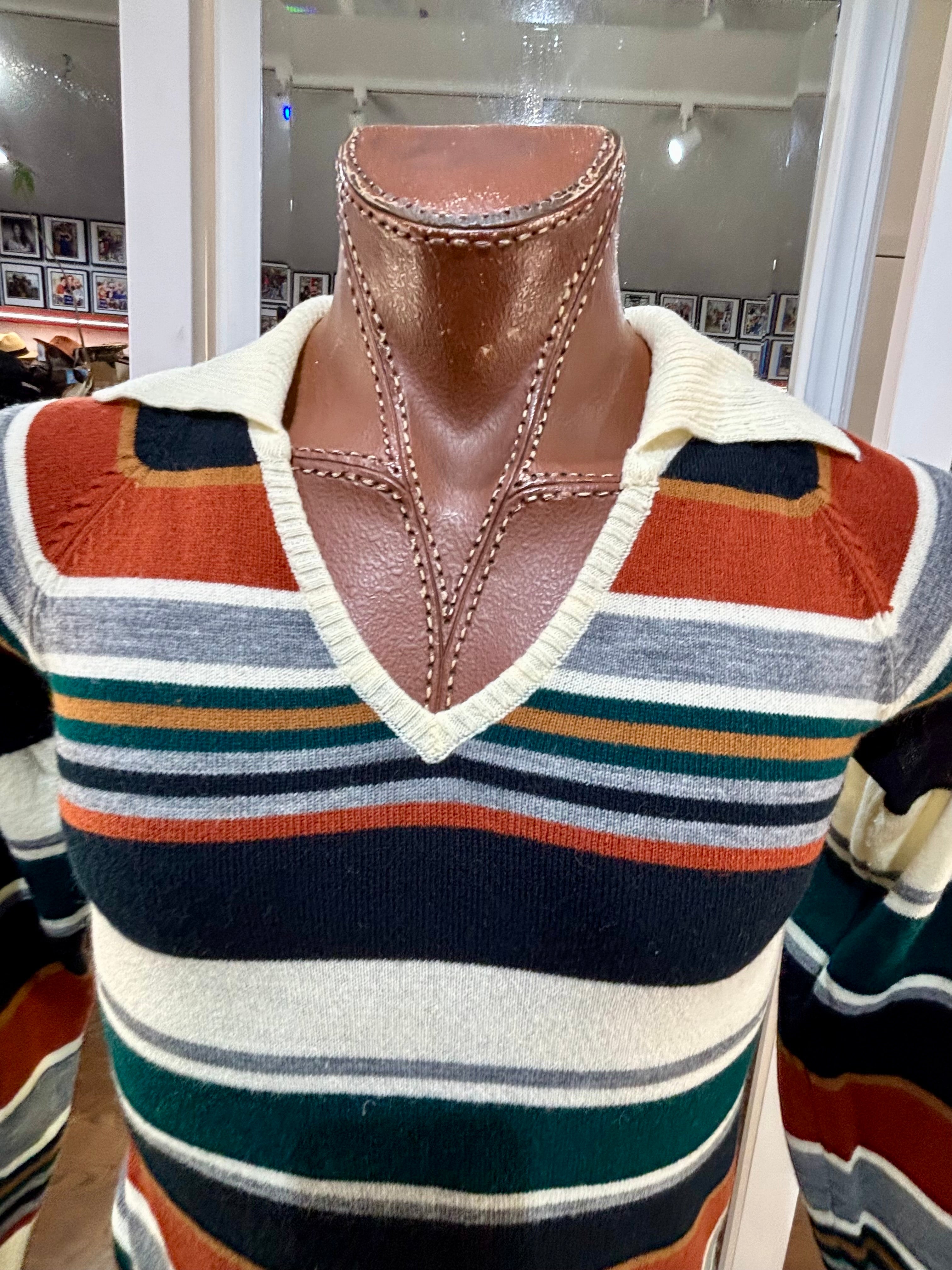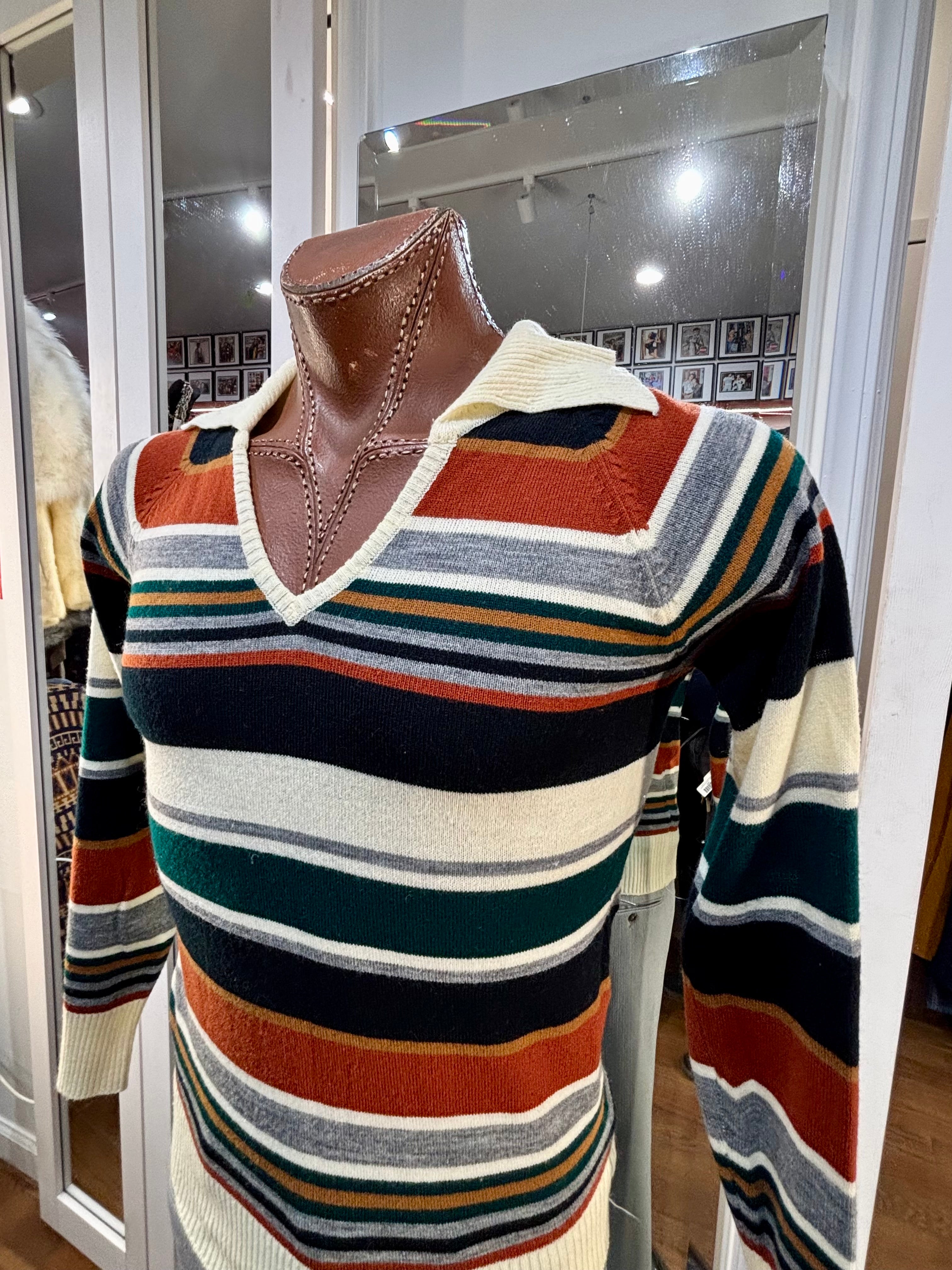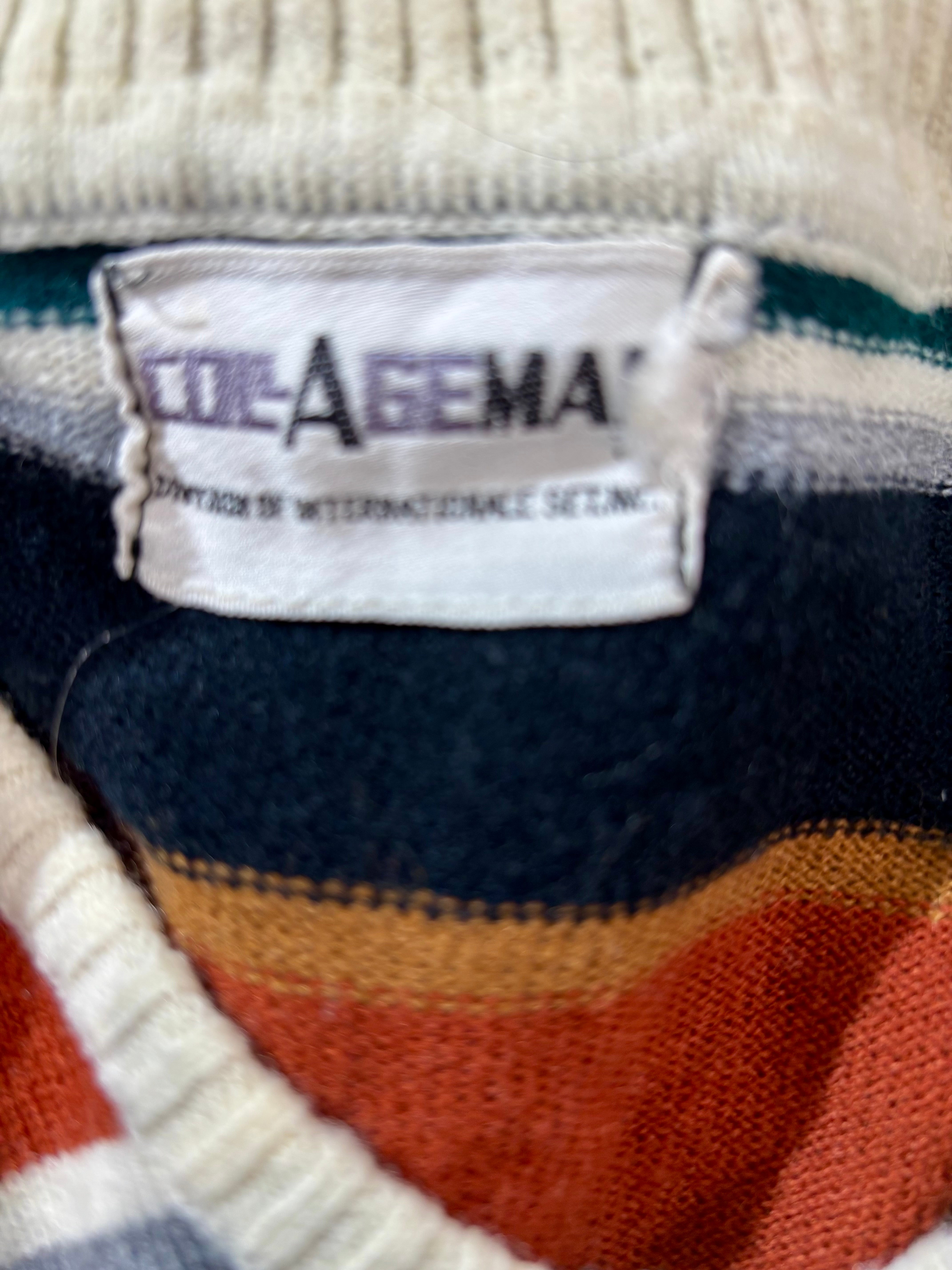 70’s Beige And Navy Multicolor Collared Striped Pull By Colageman