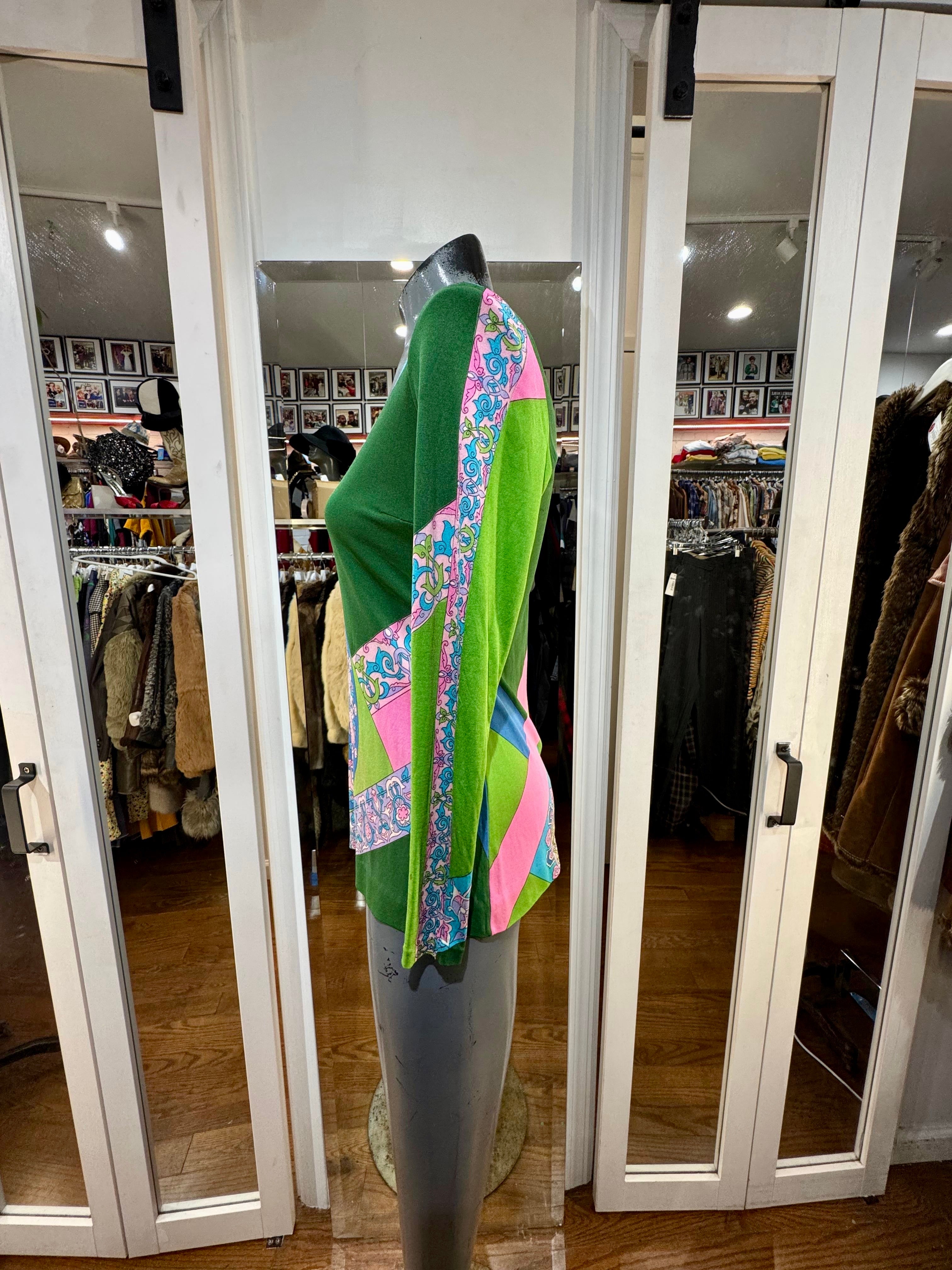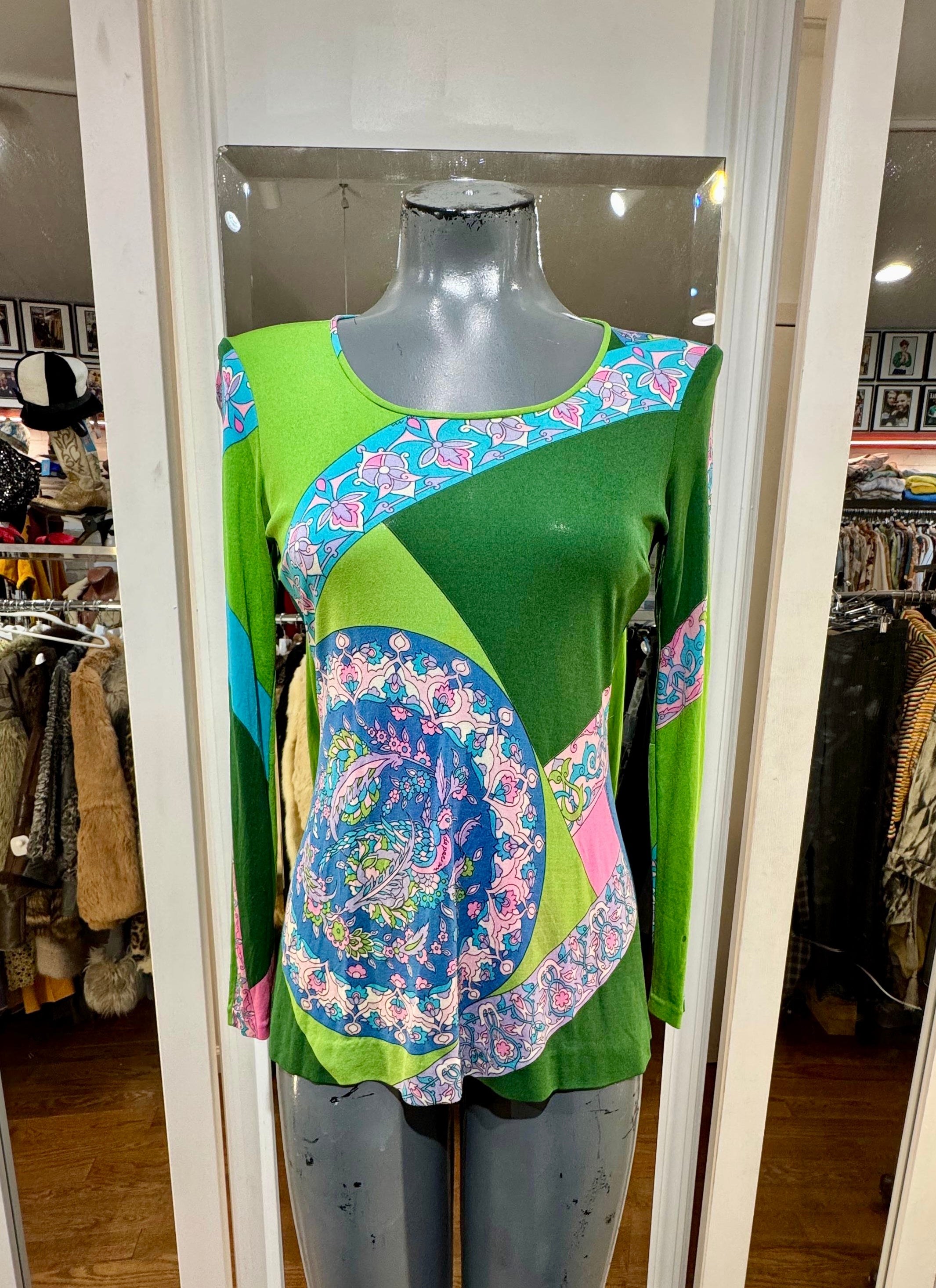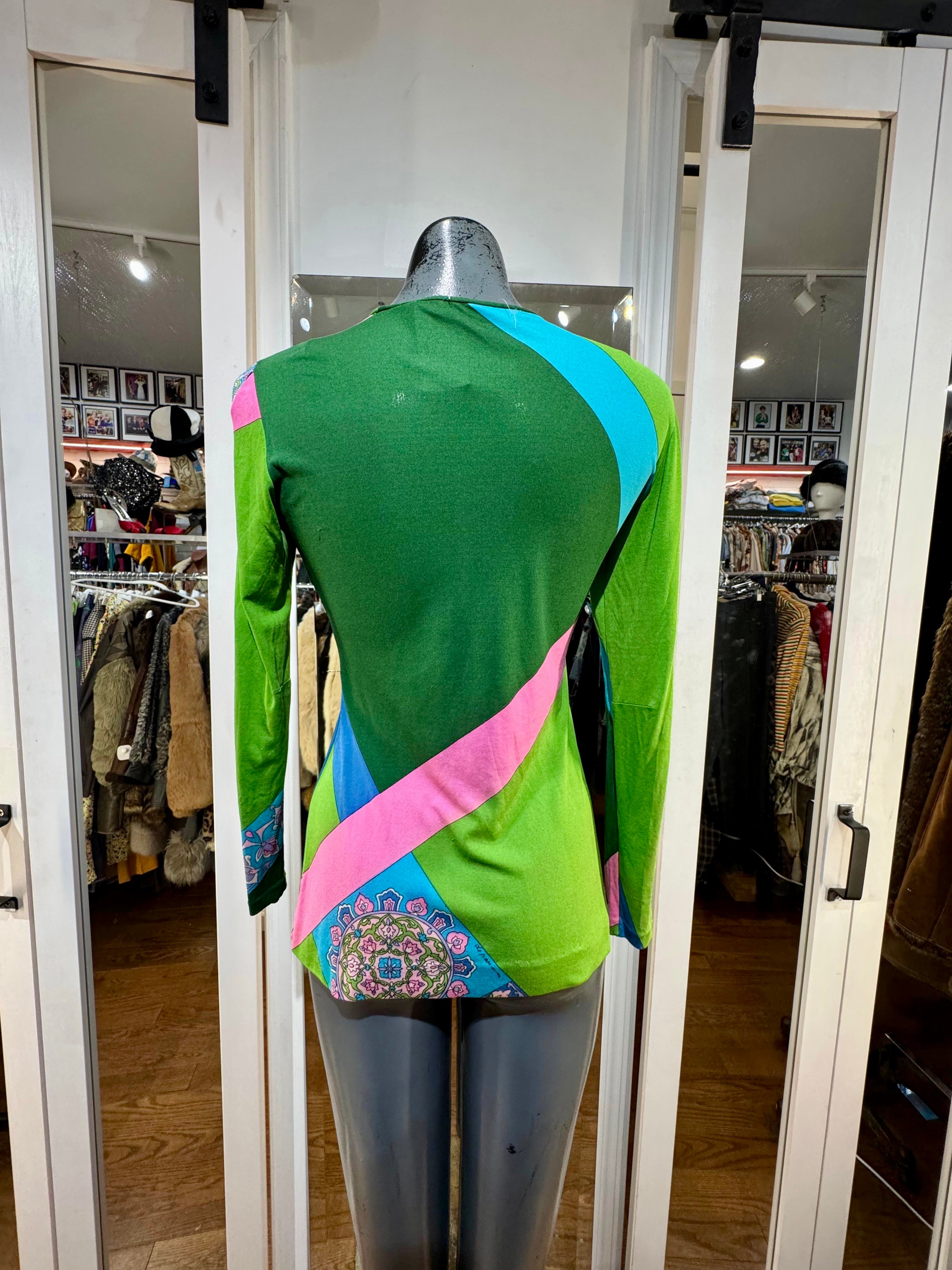 70’s Green Multicolor Print Round Neck Top By De Parisini