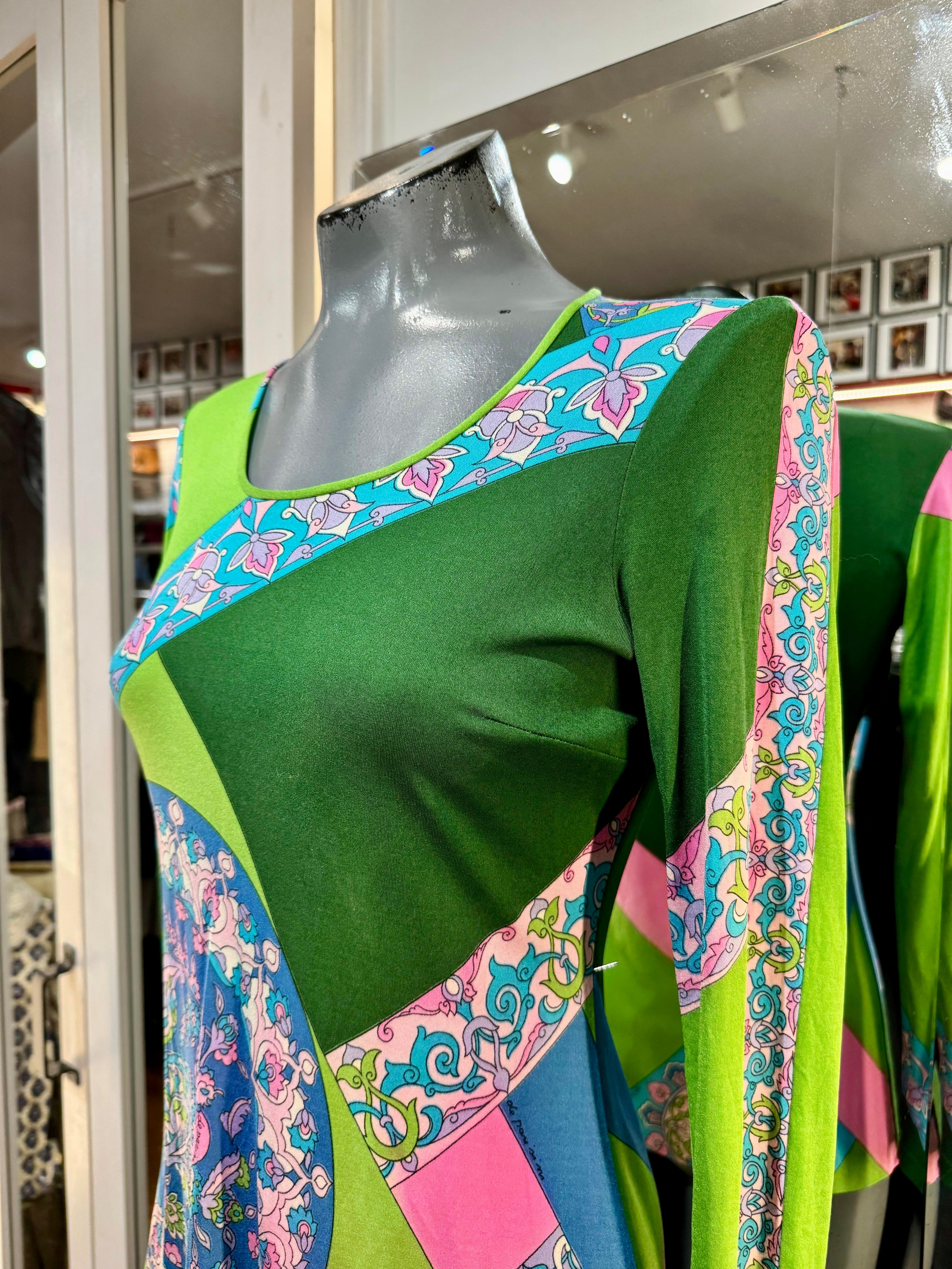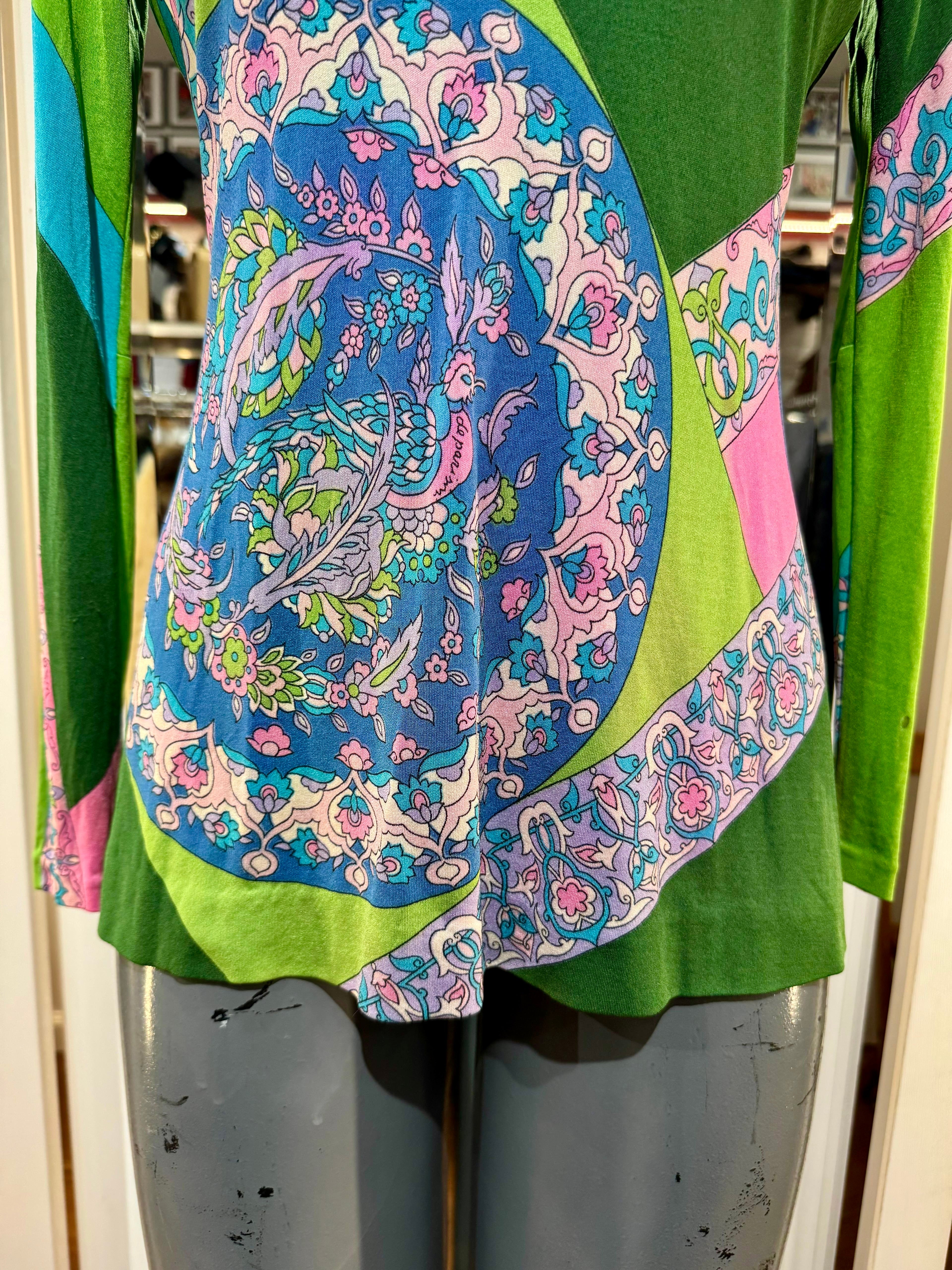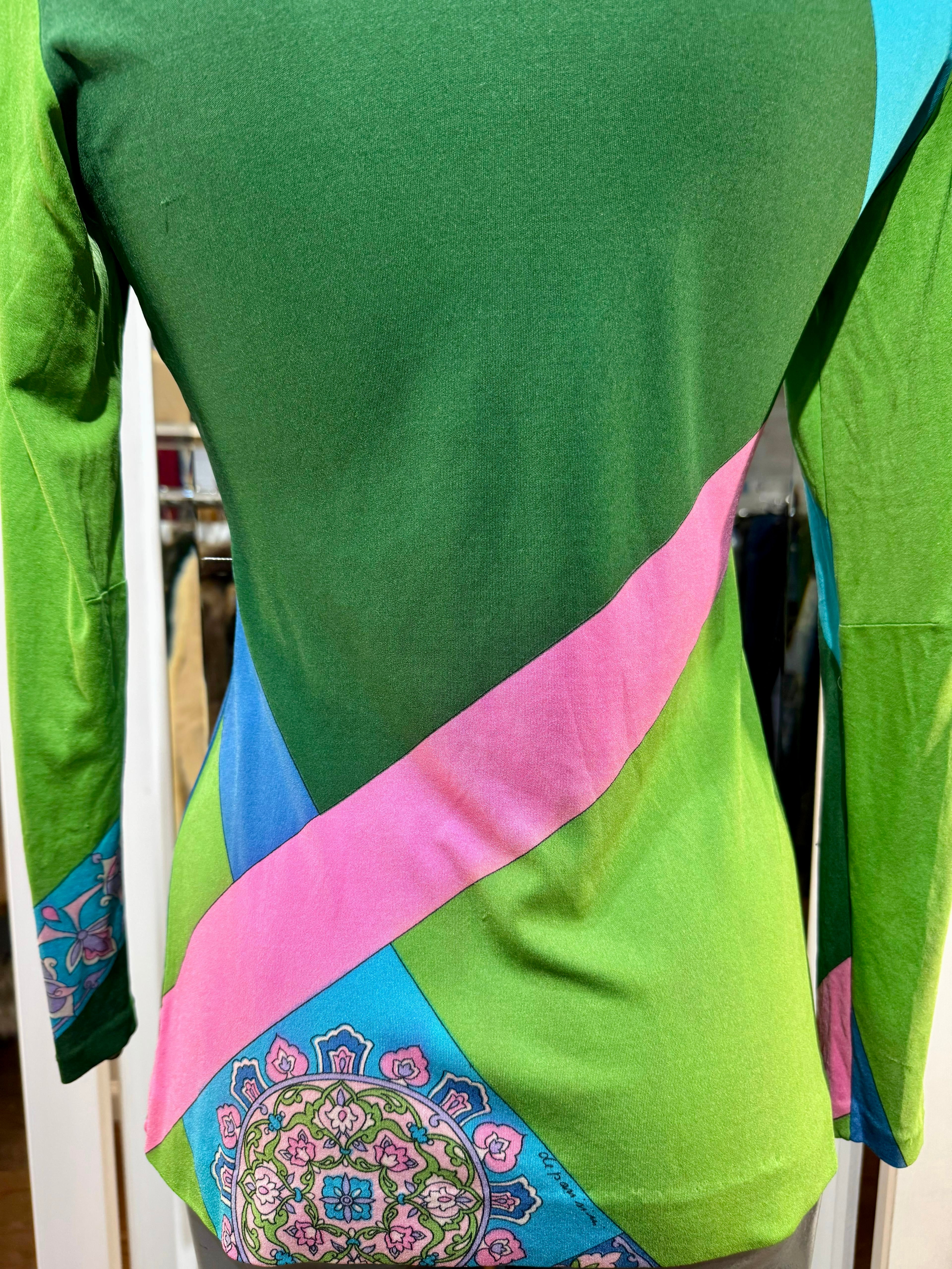 70’s Green Multicolor Print Round Neck Top By De Parisini