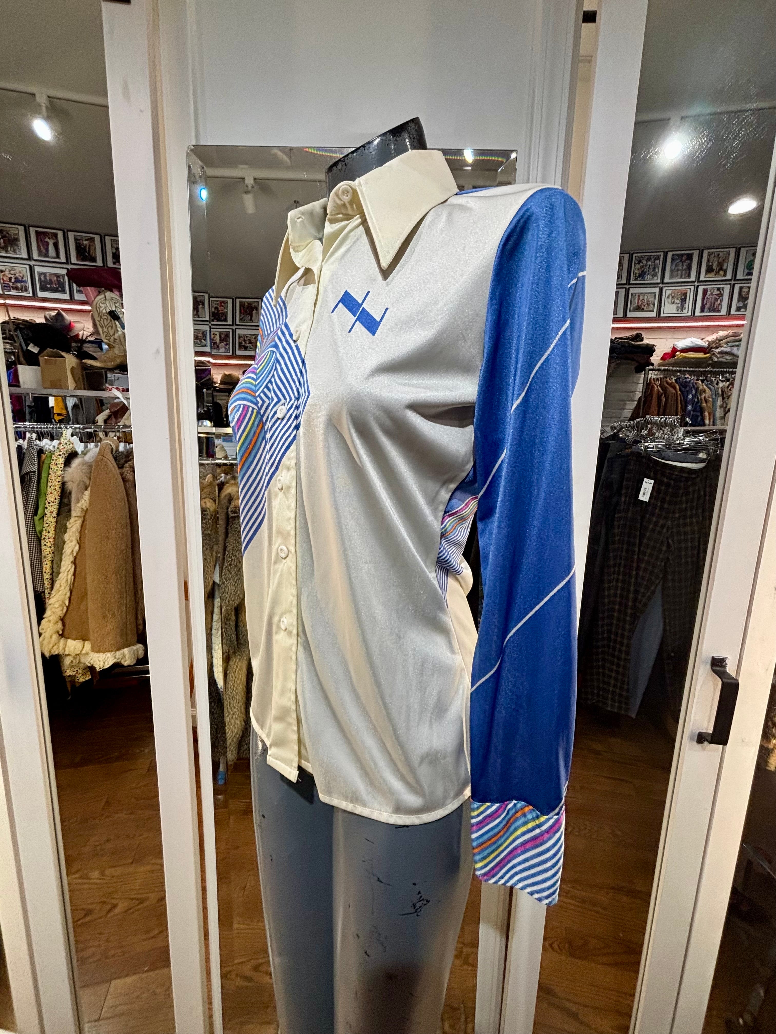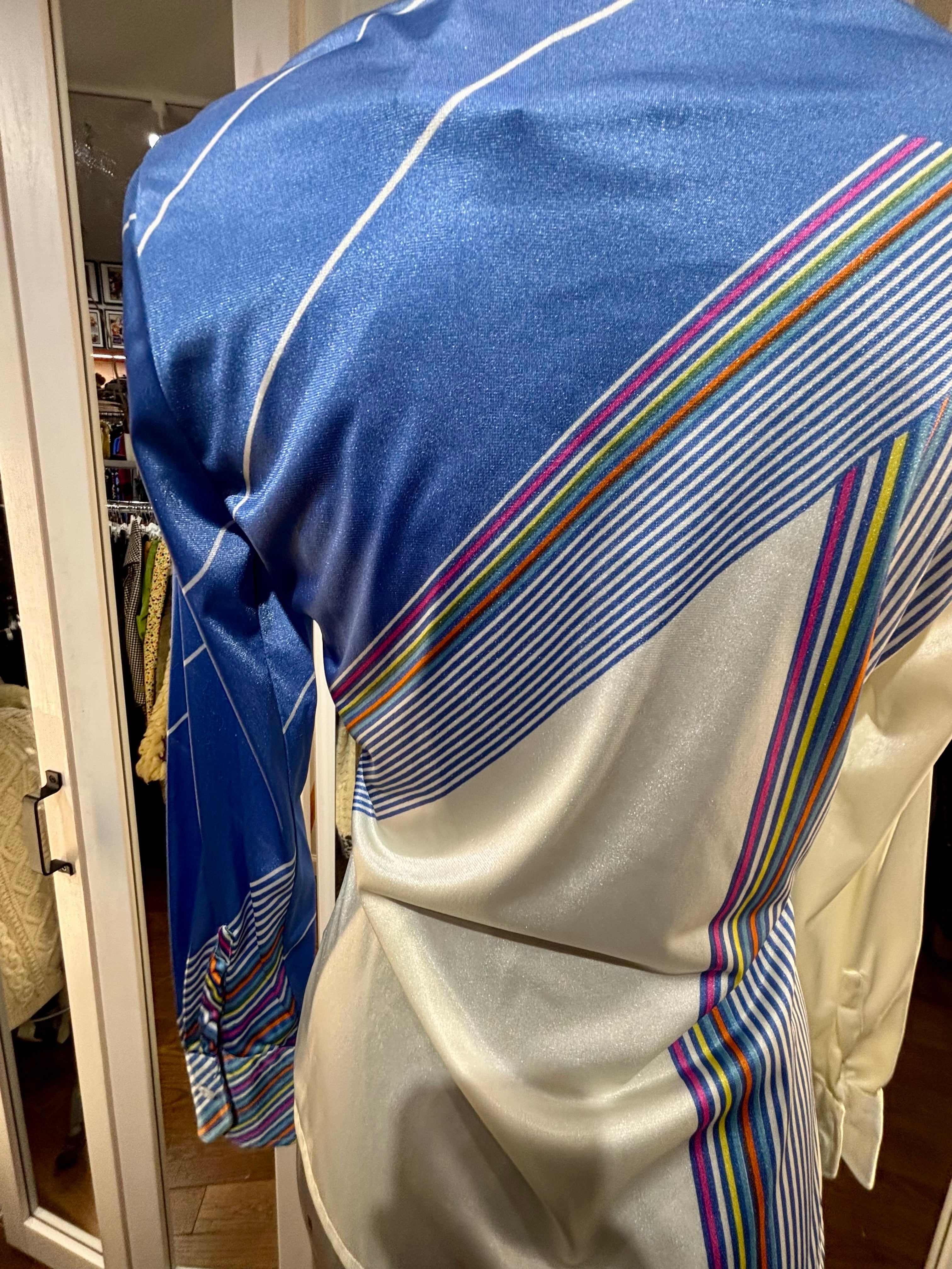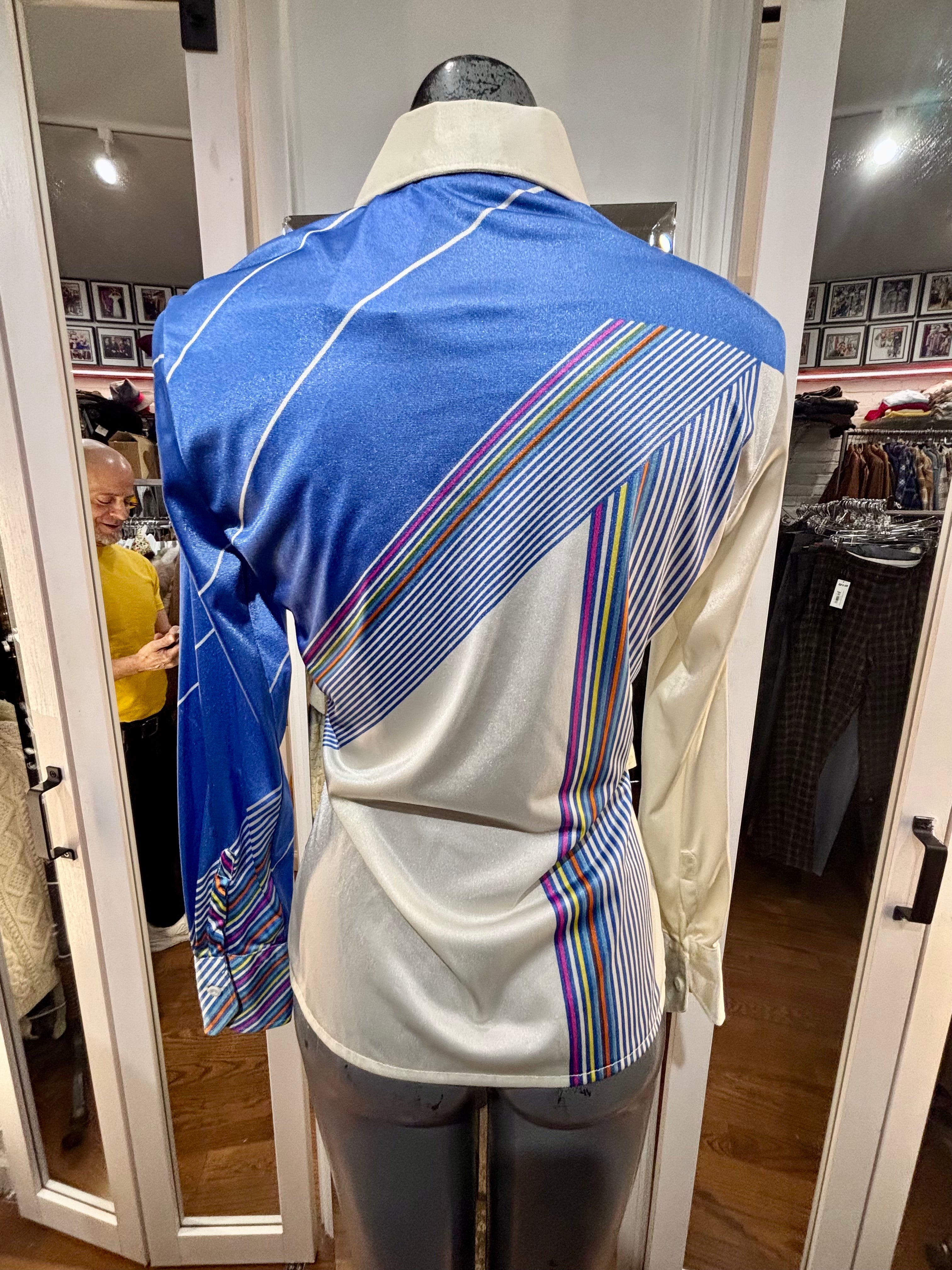 70’s Off White And Blue Geometric Print Disco Blouse By Nik Nik