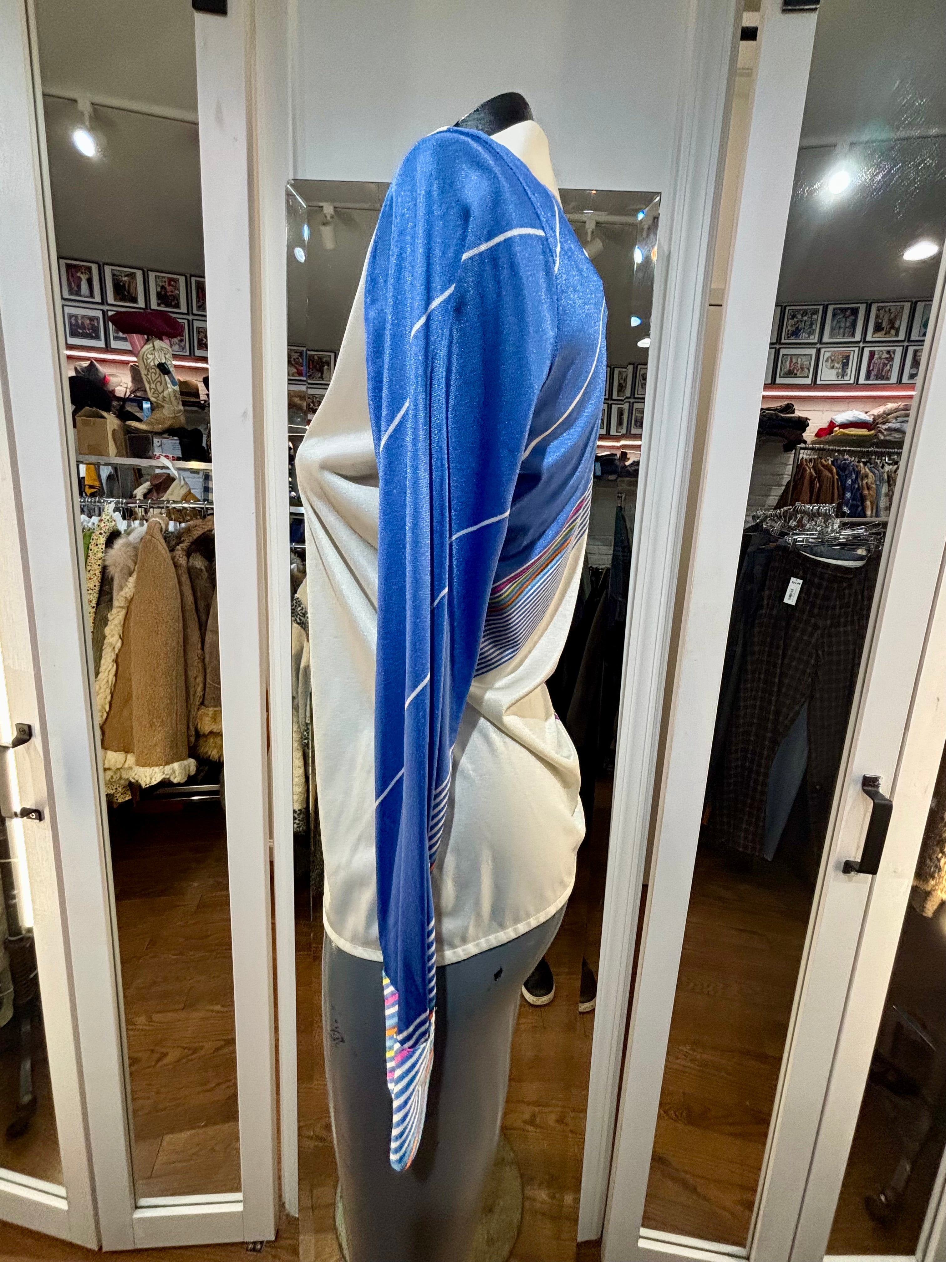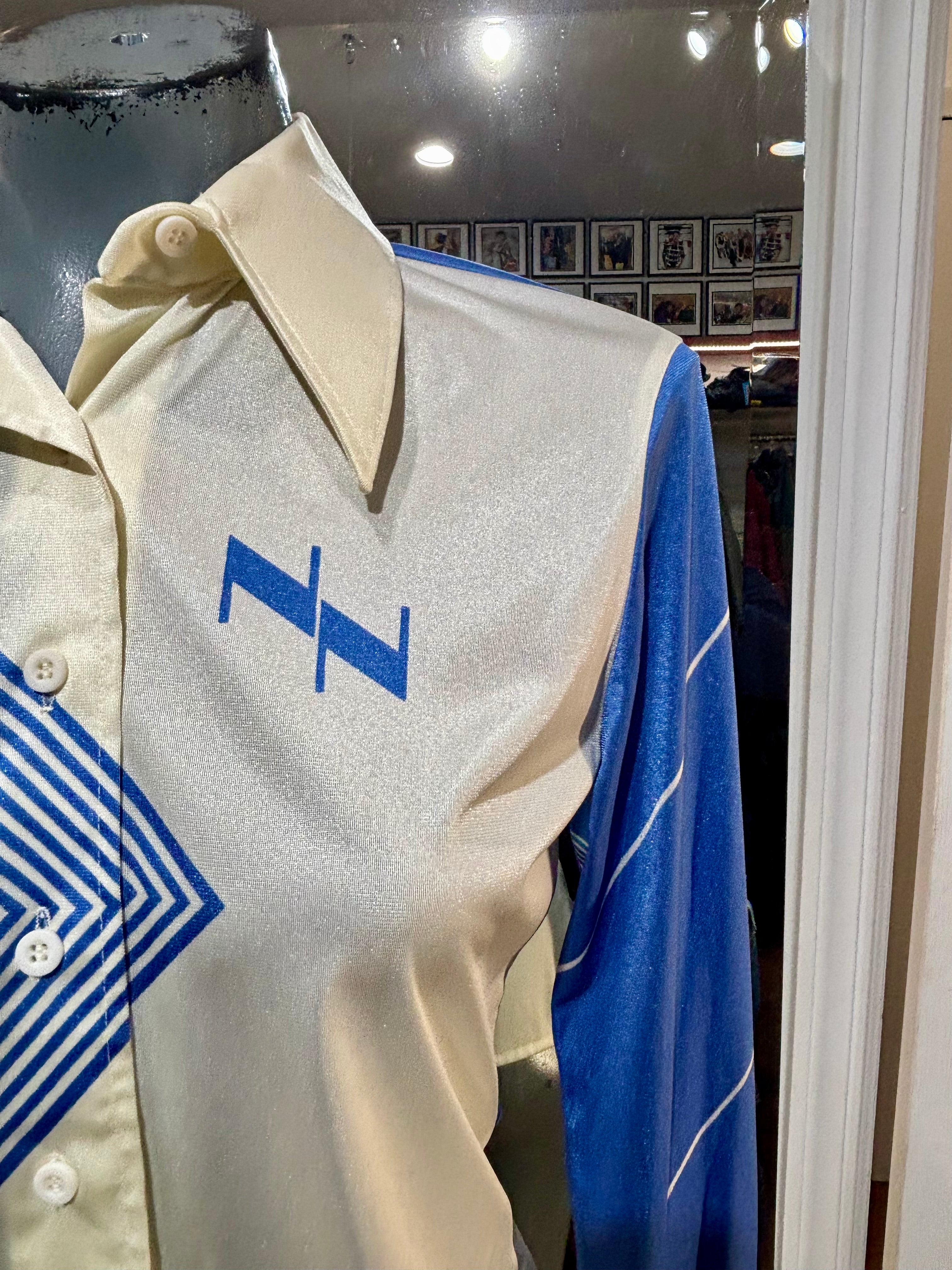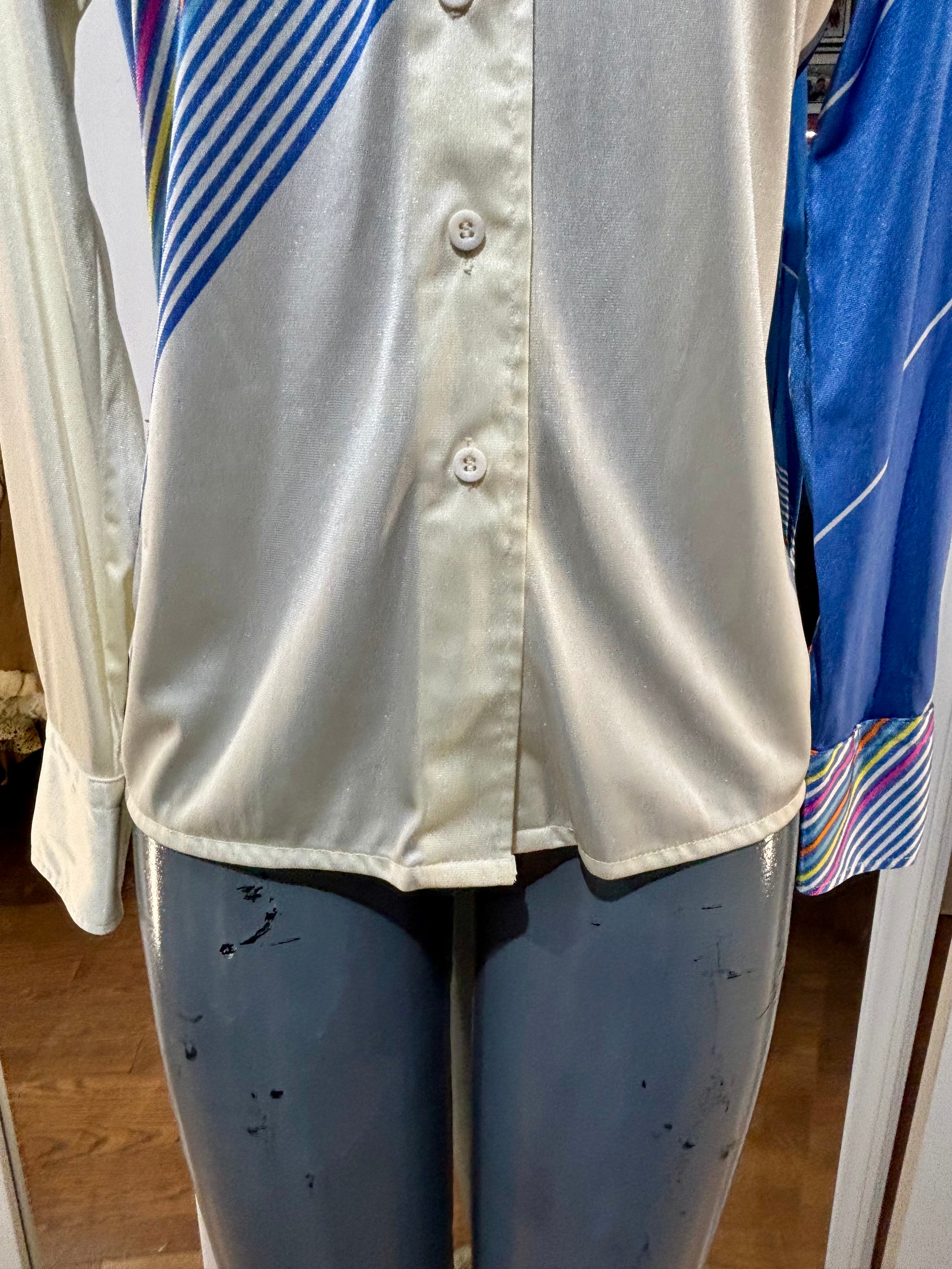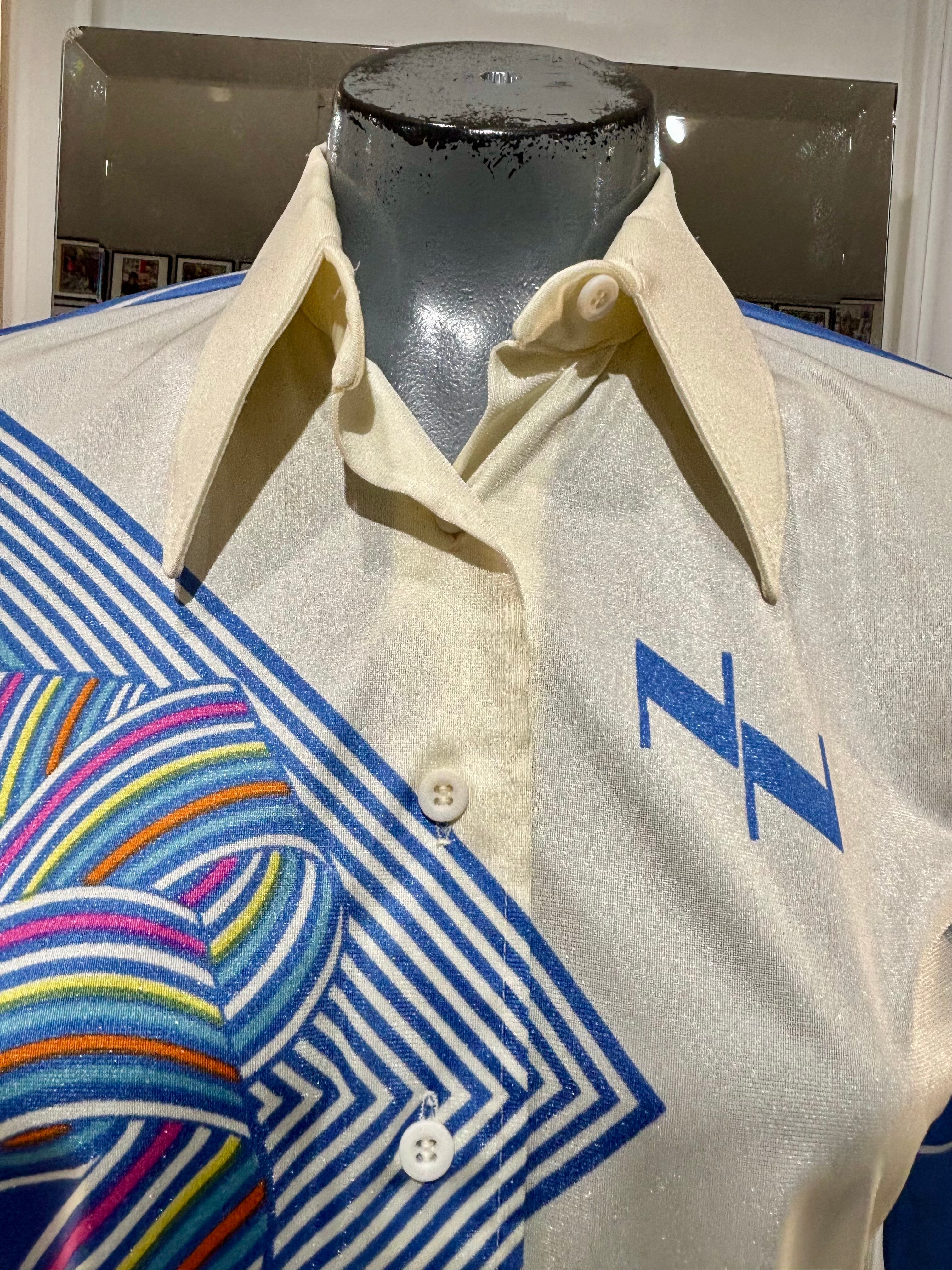 70’s Off White And Blue Geometric Print Disco Blouse By Nik Nik