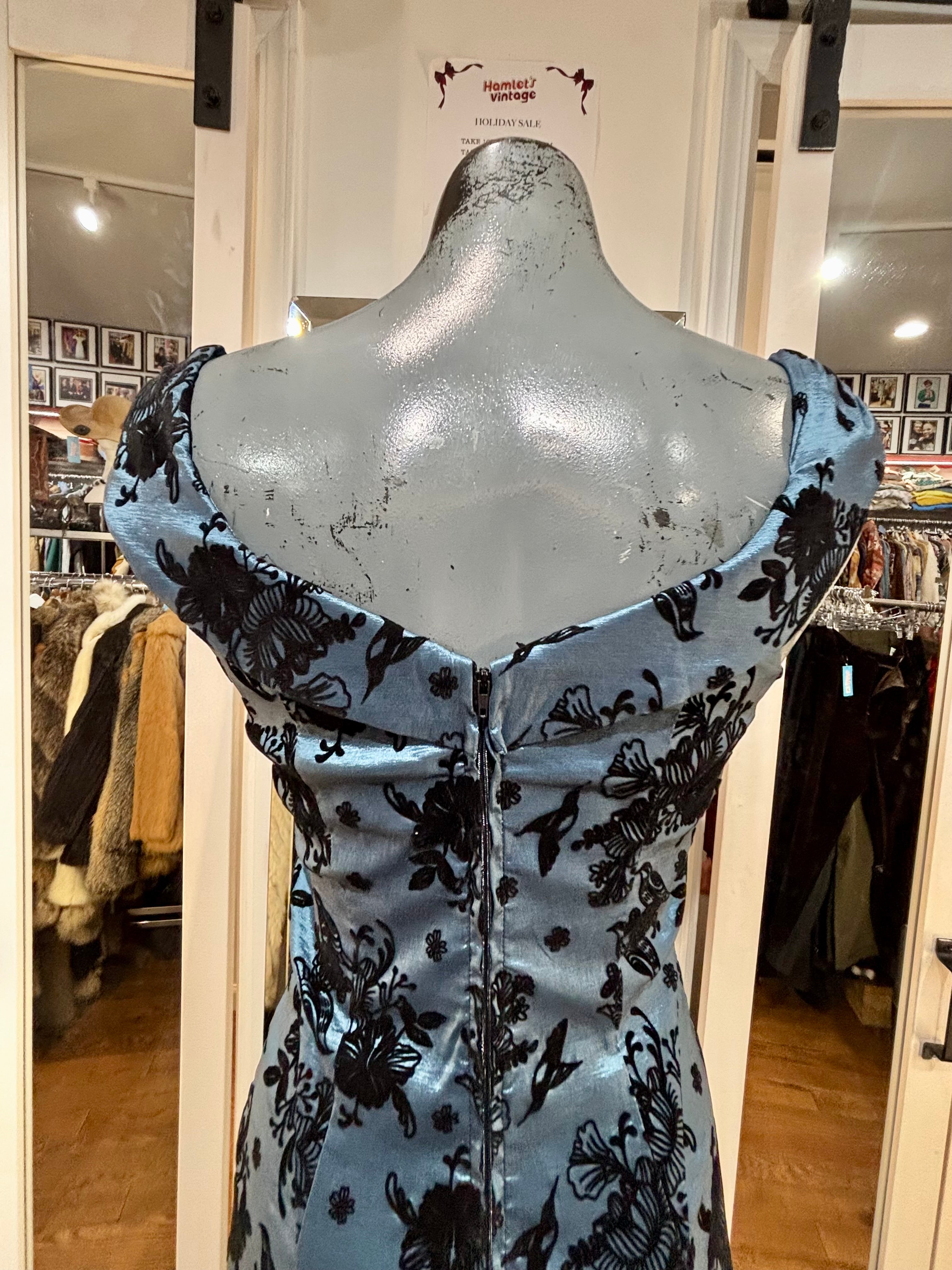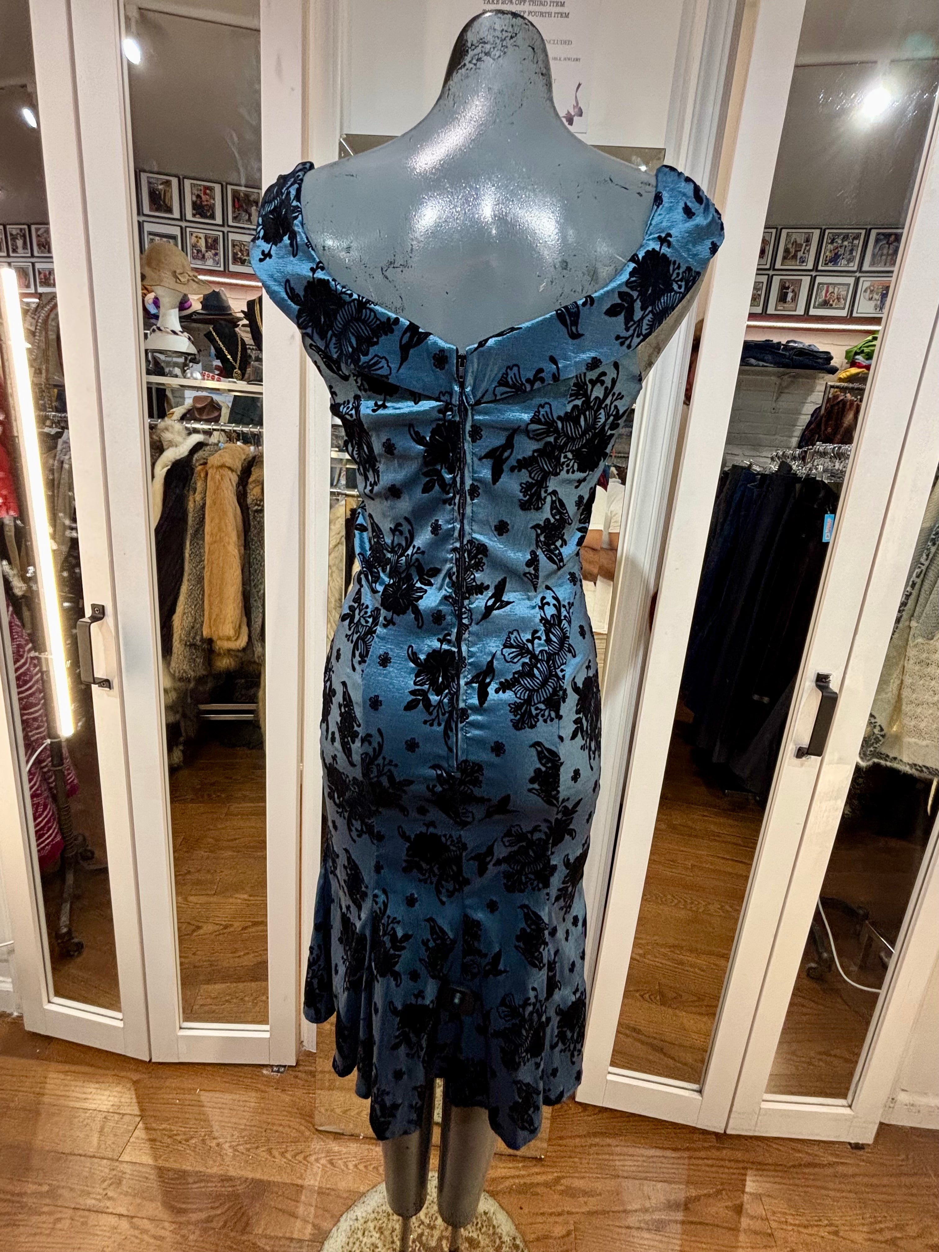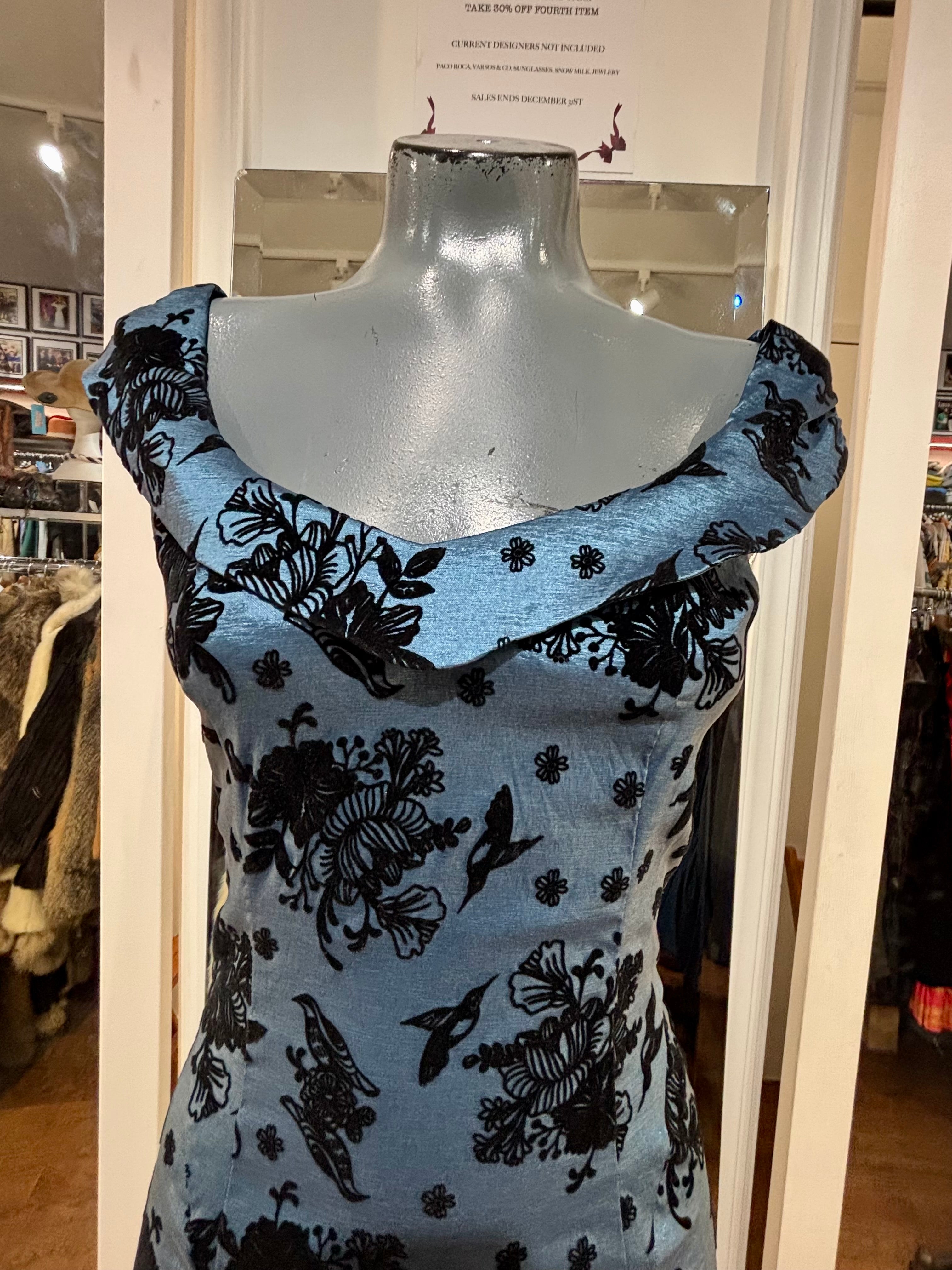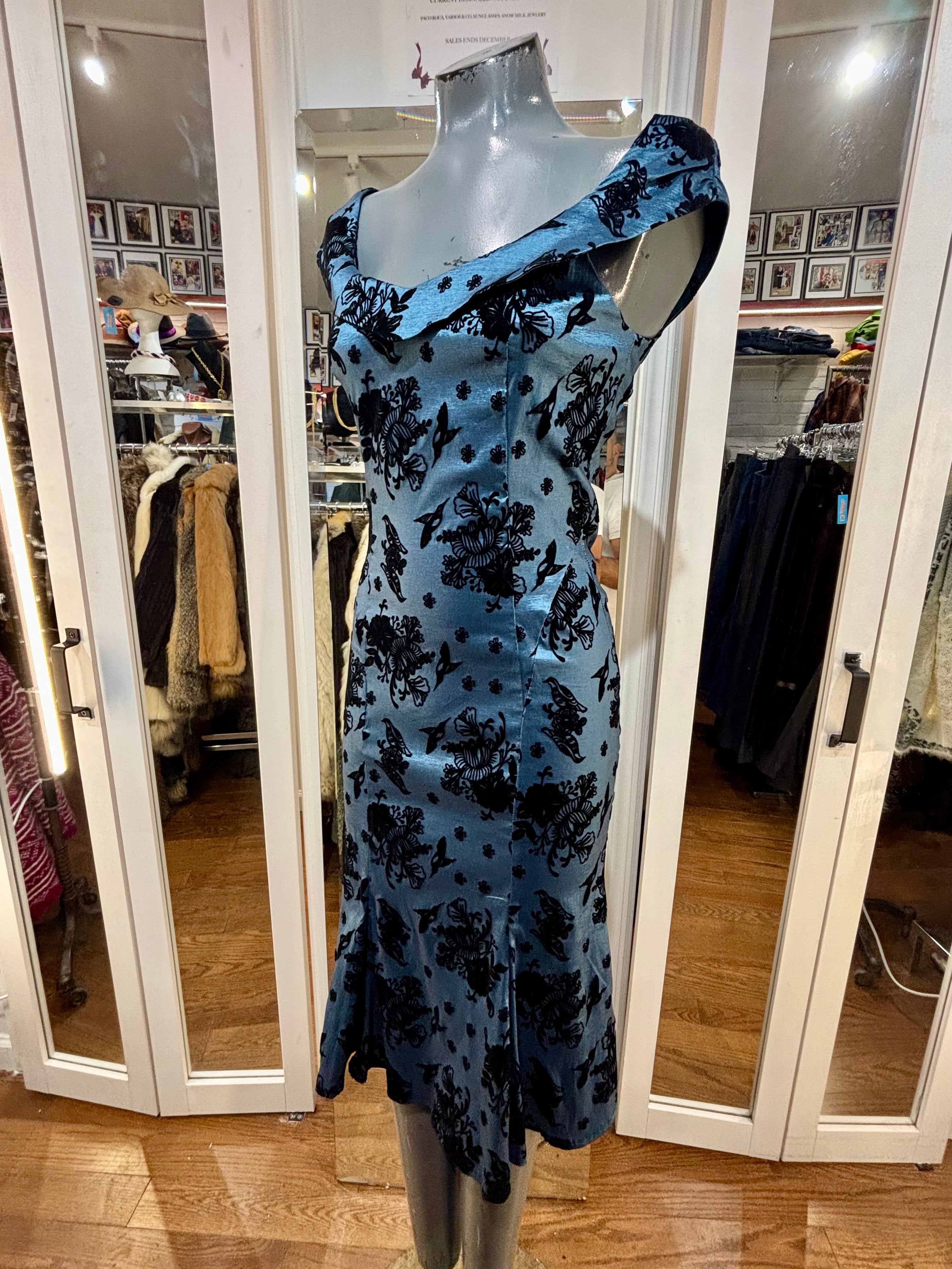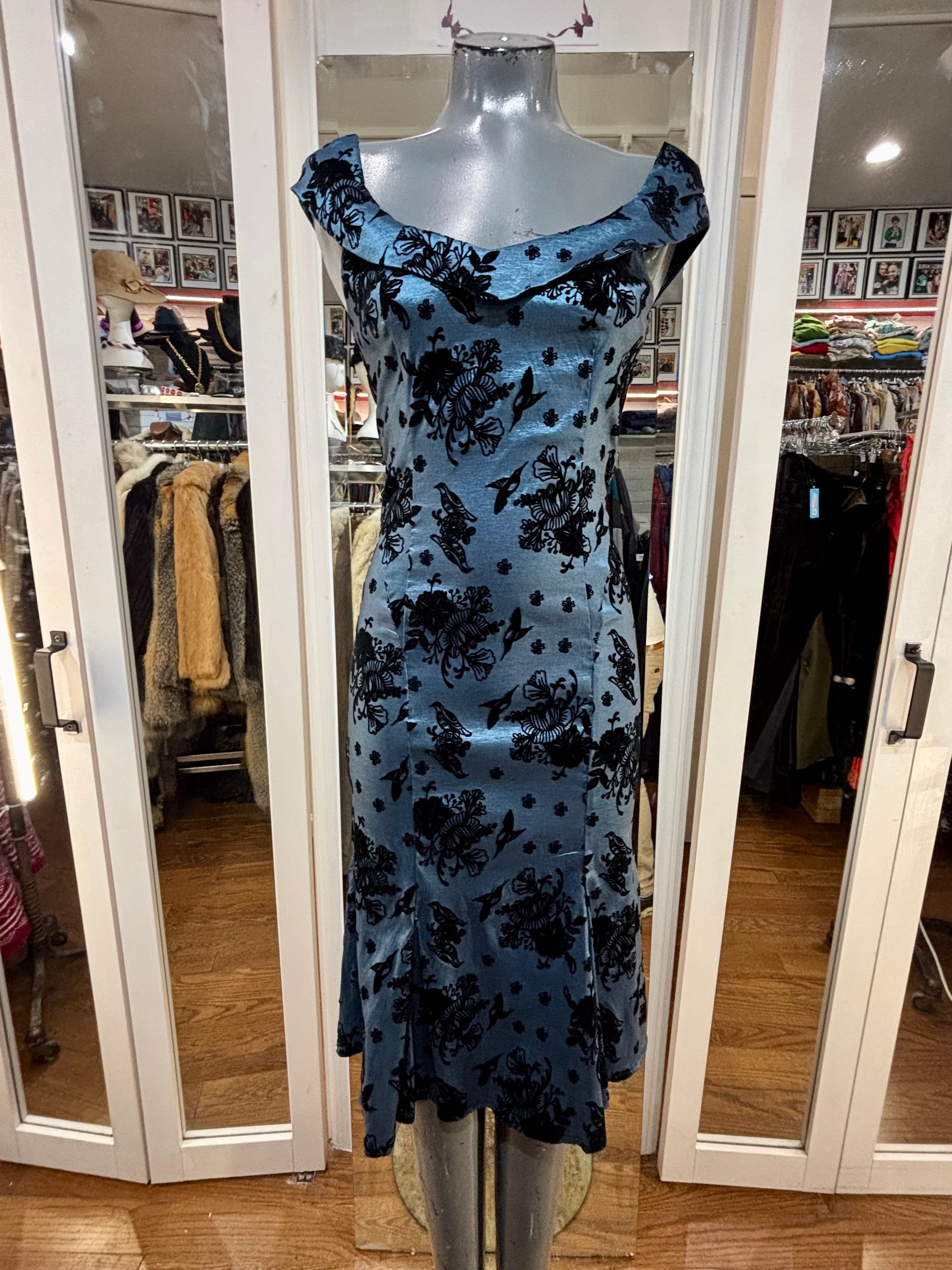 90’s Going 40’s Metallic Blue Dress With Black Printed Floral By Voodoo Vixen