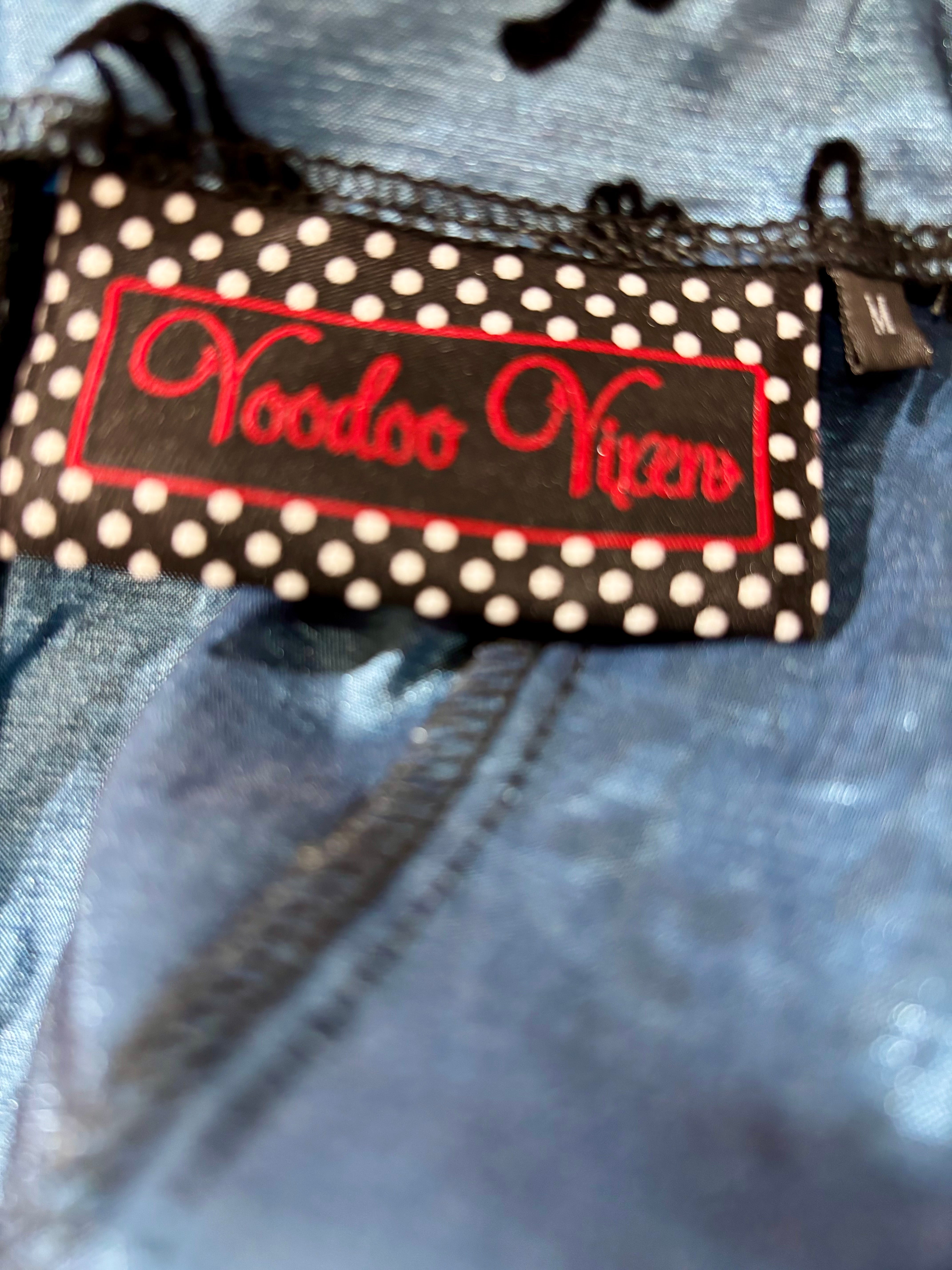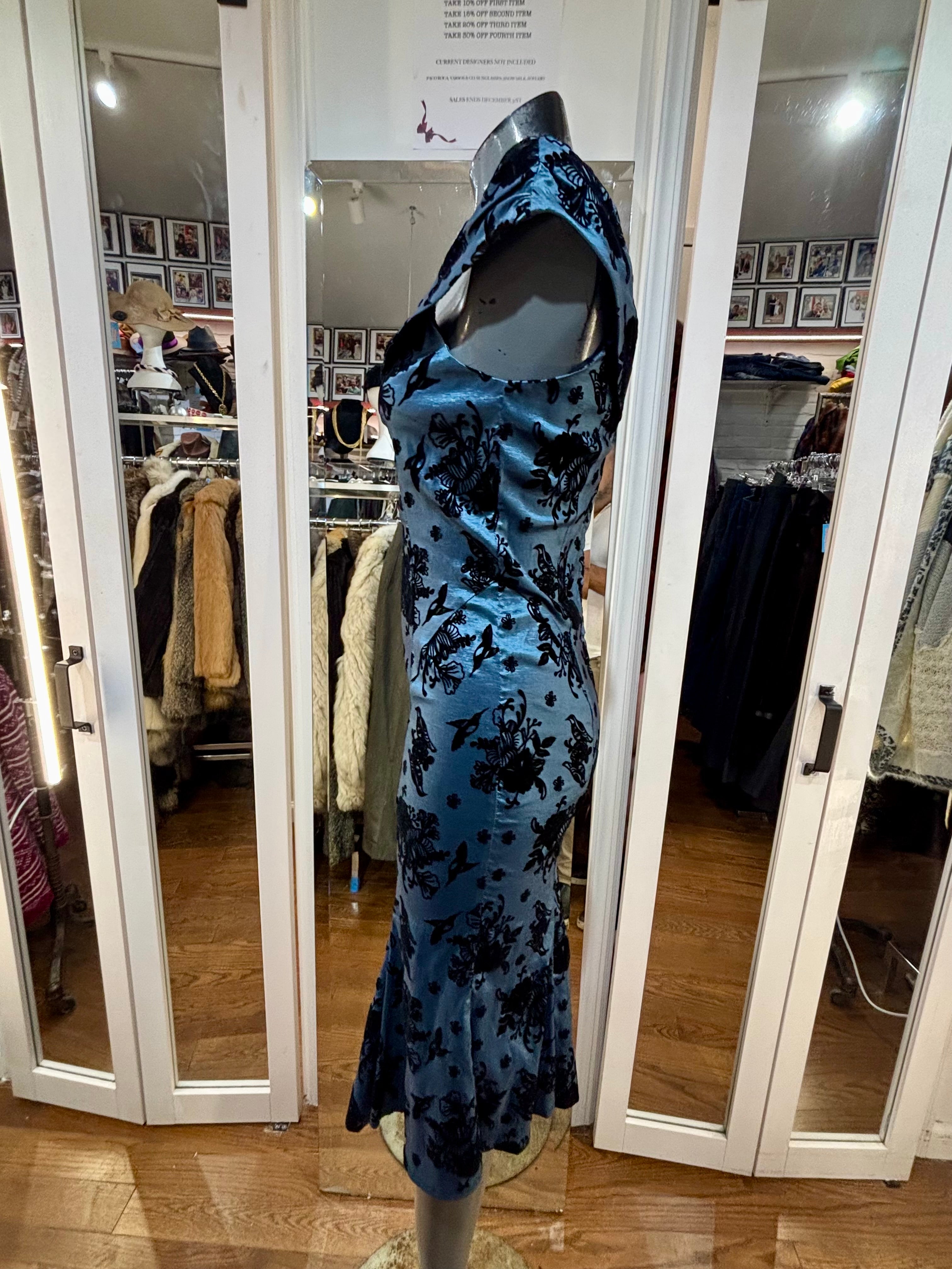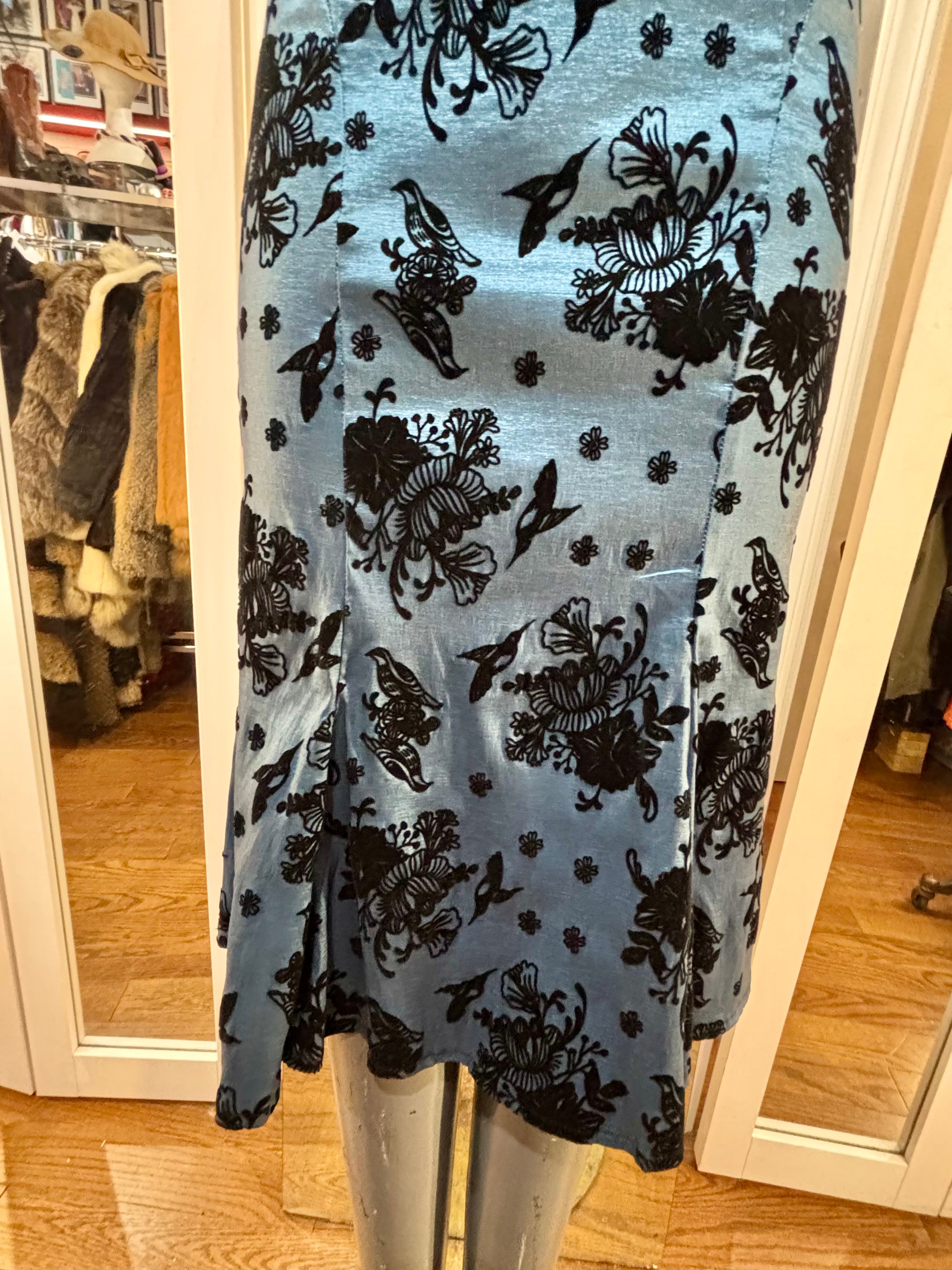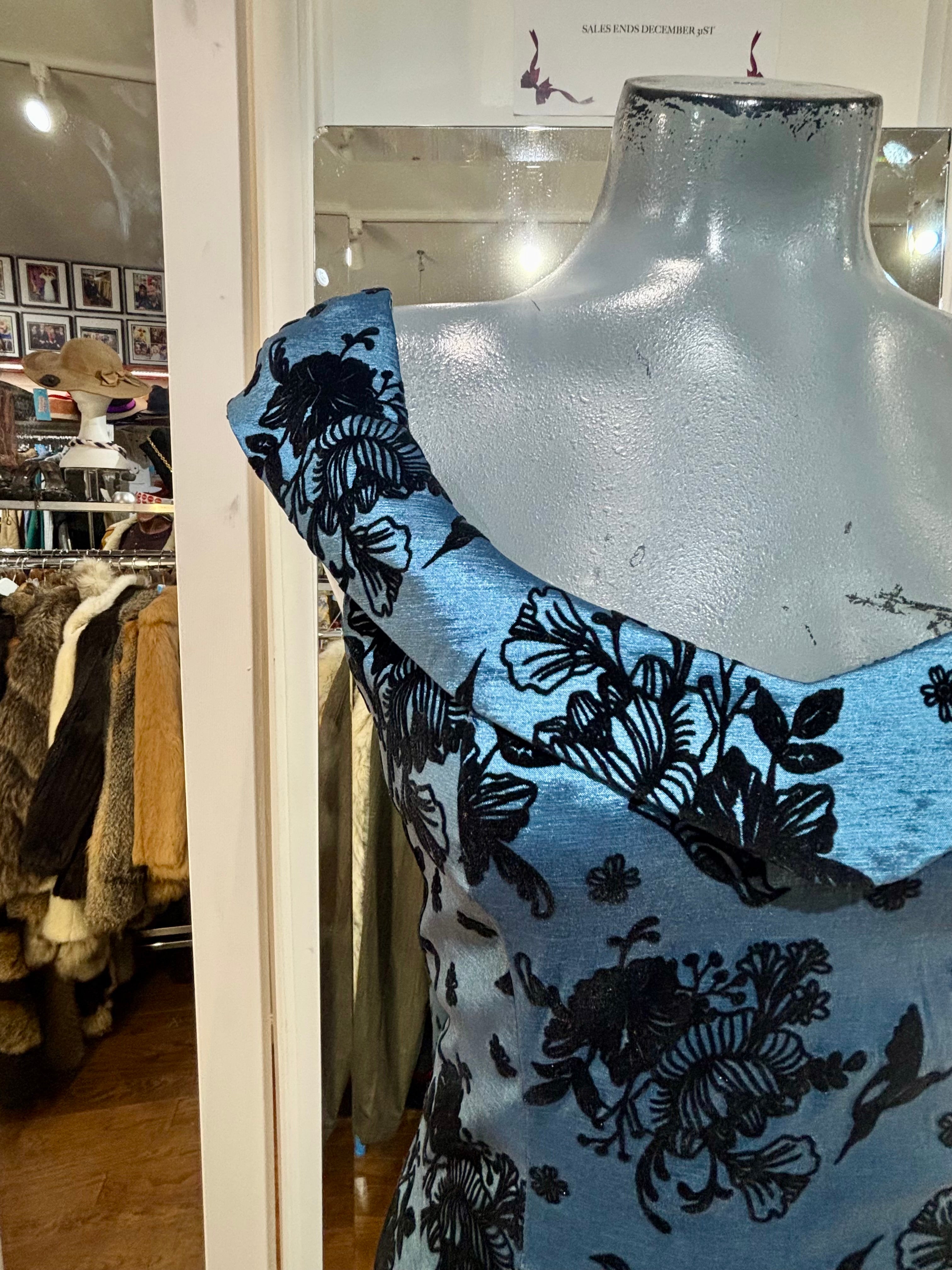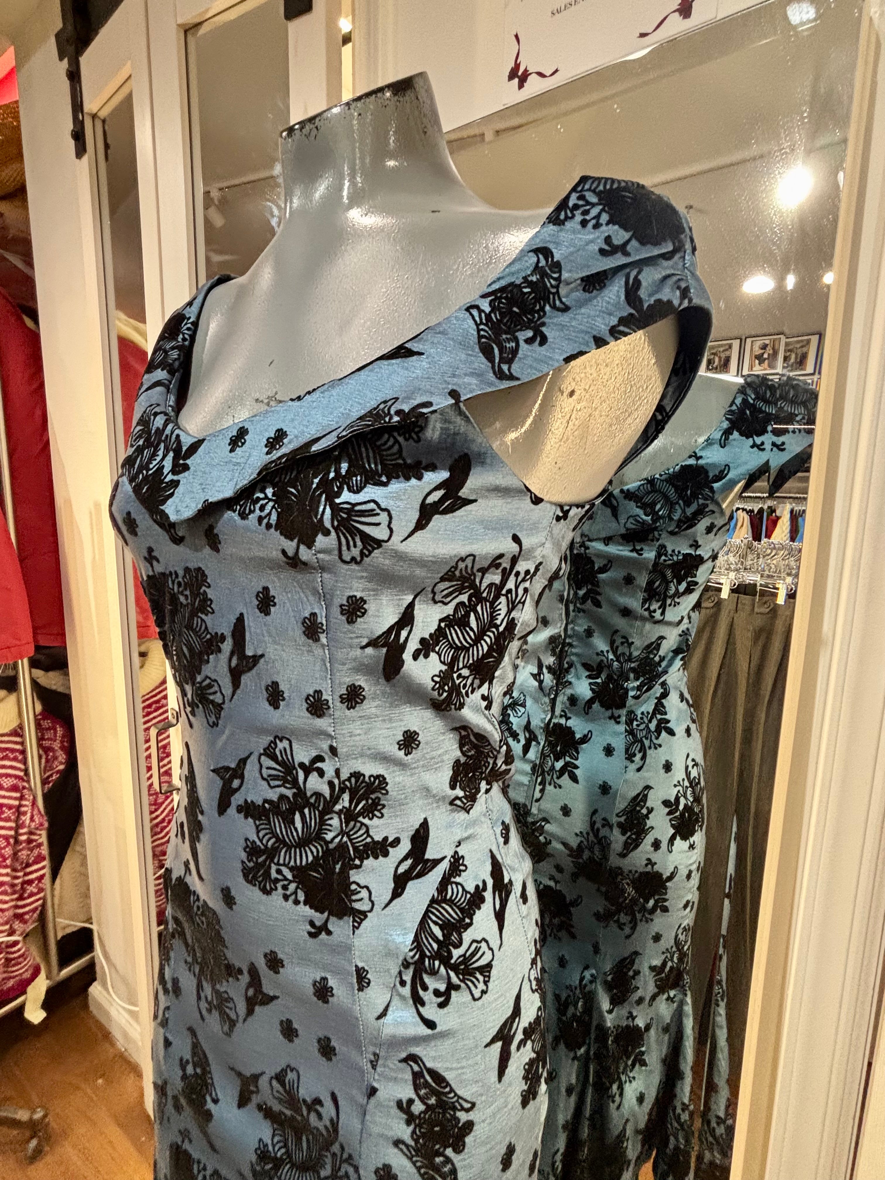 90’s Going 40’s Metallic Blue Dress With Black Printed Floral By Voodoo Vixen