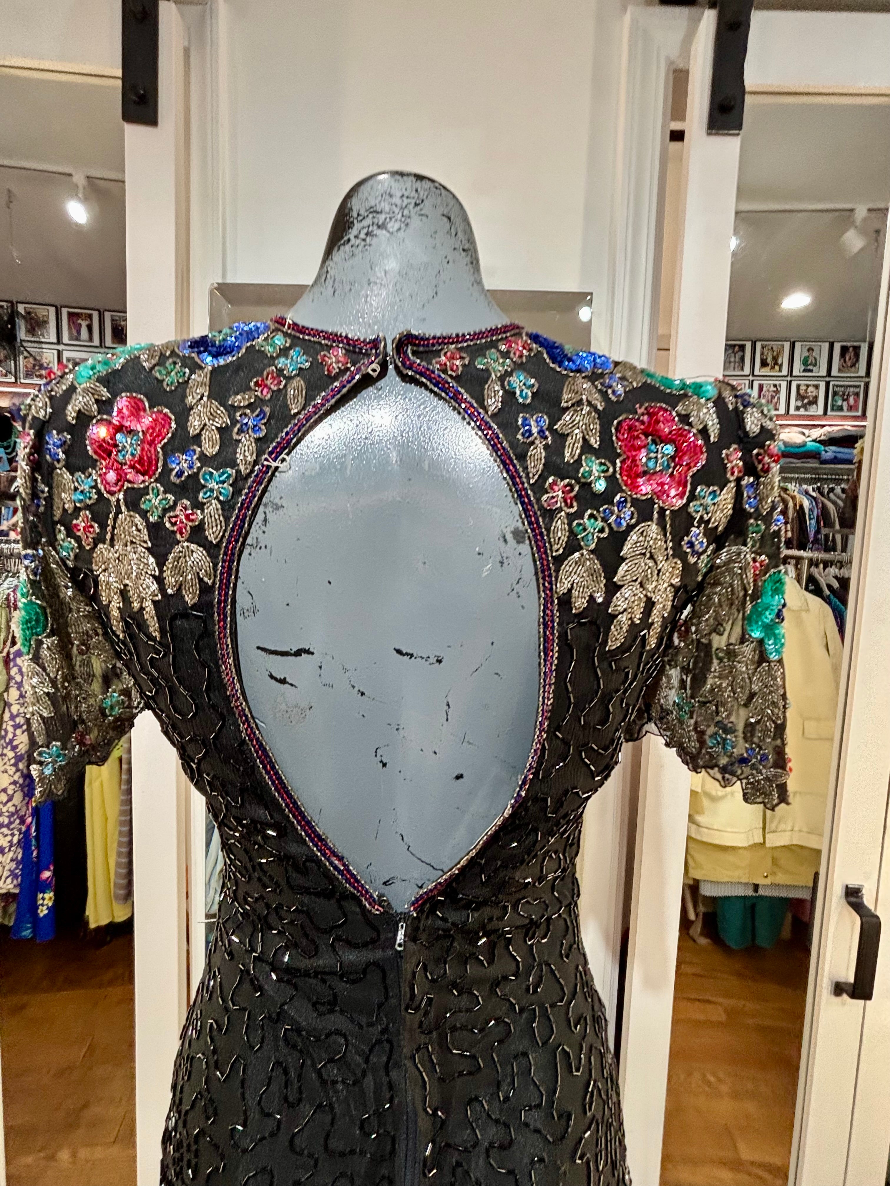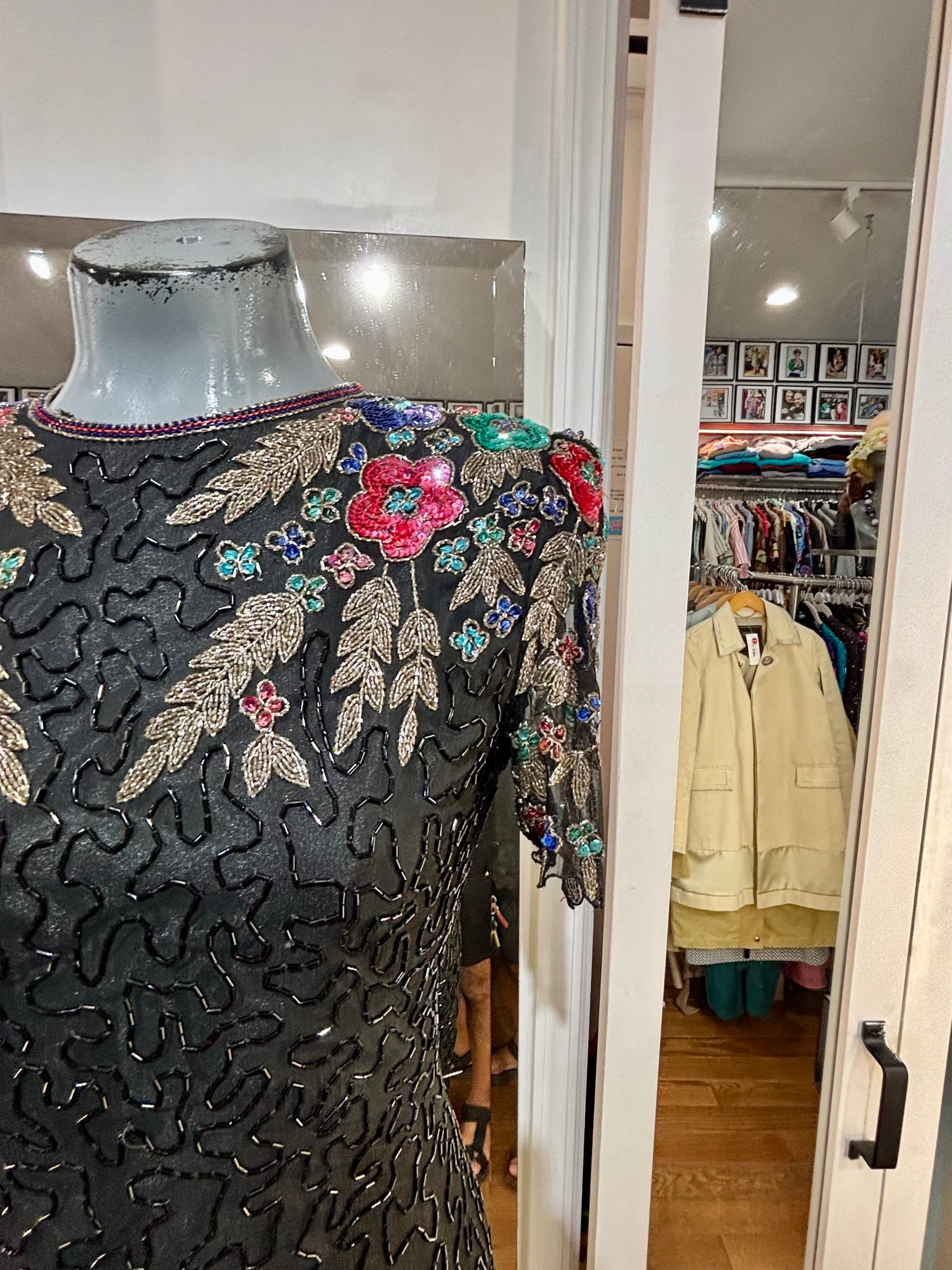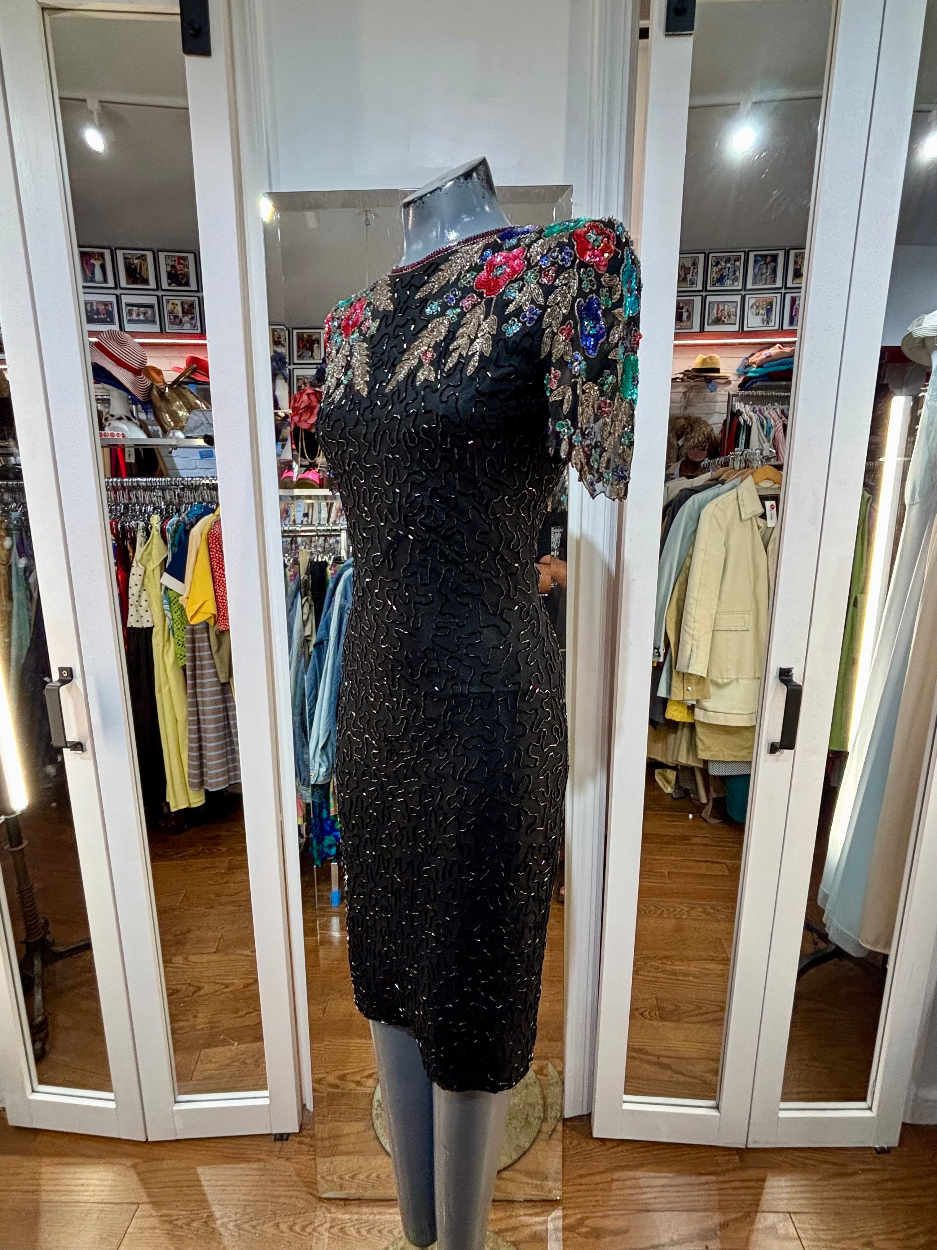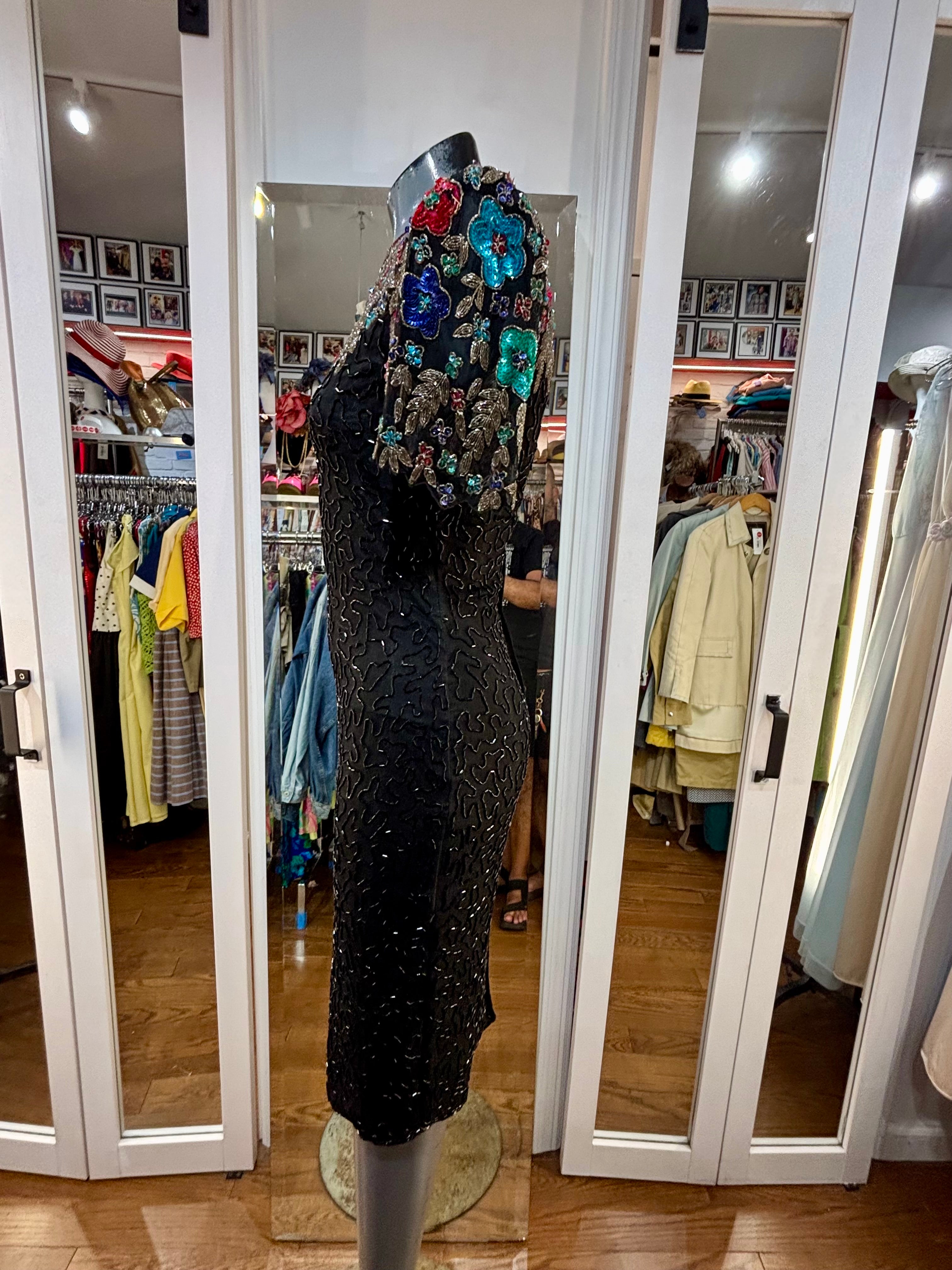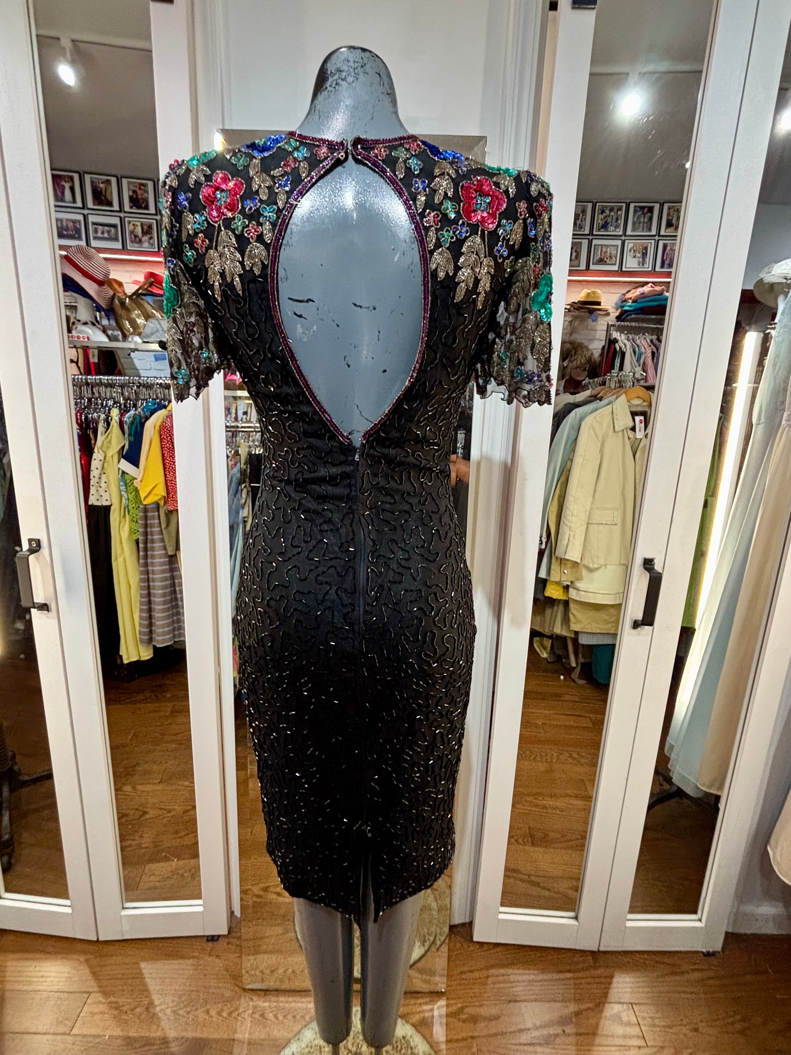 80’s Black Beaded Dress With Multicolored Cap Sleeve Details By Scala