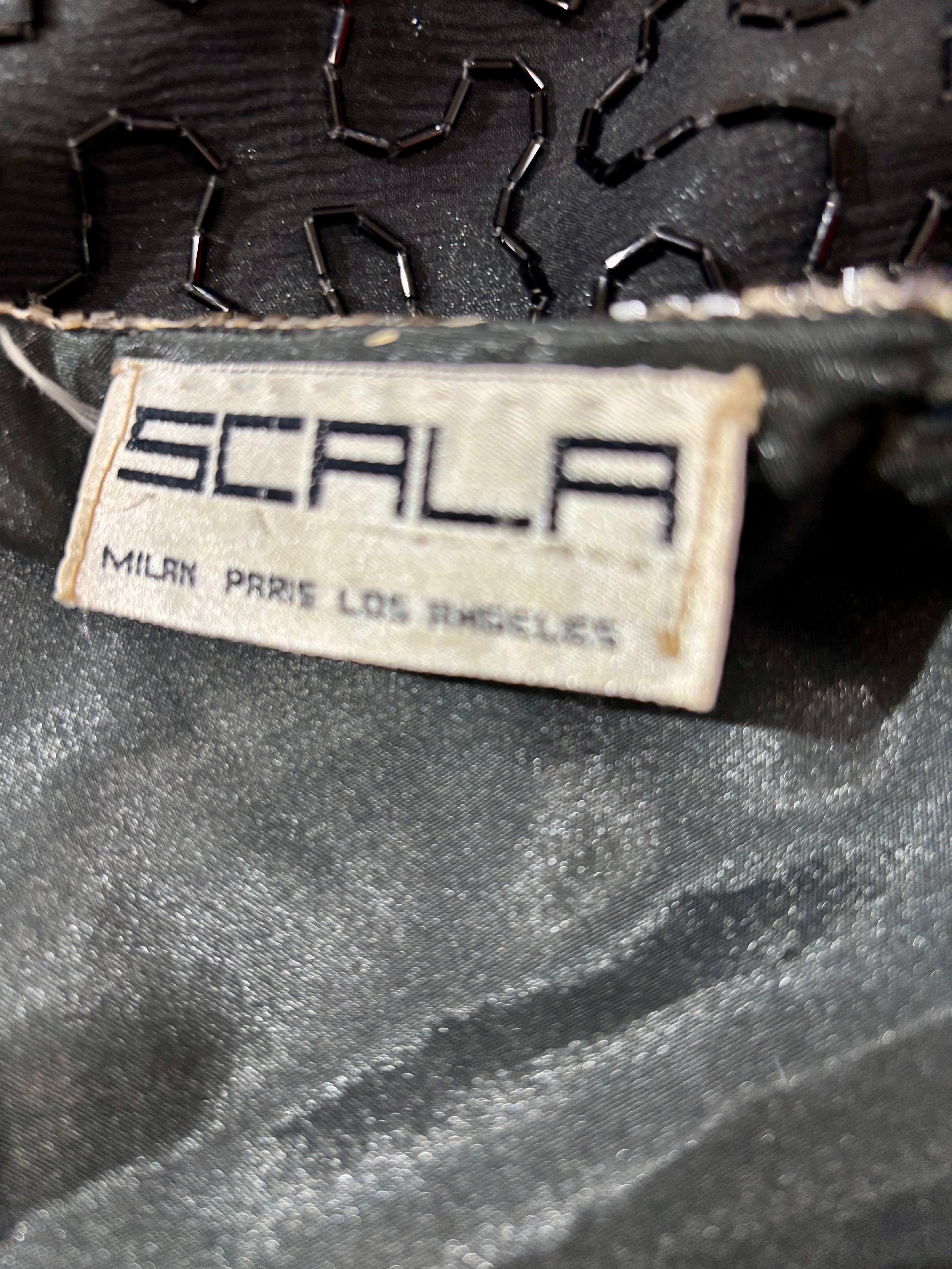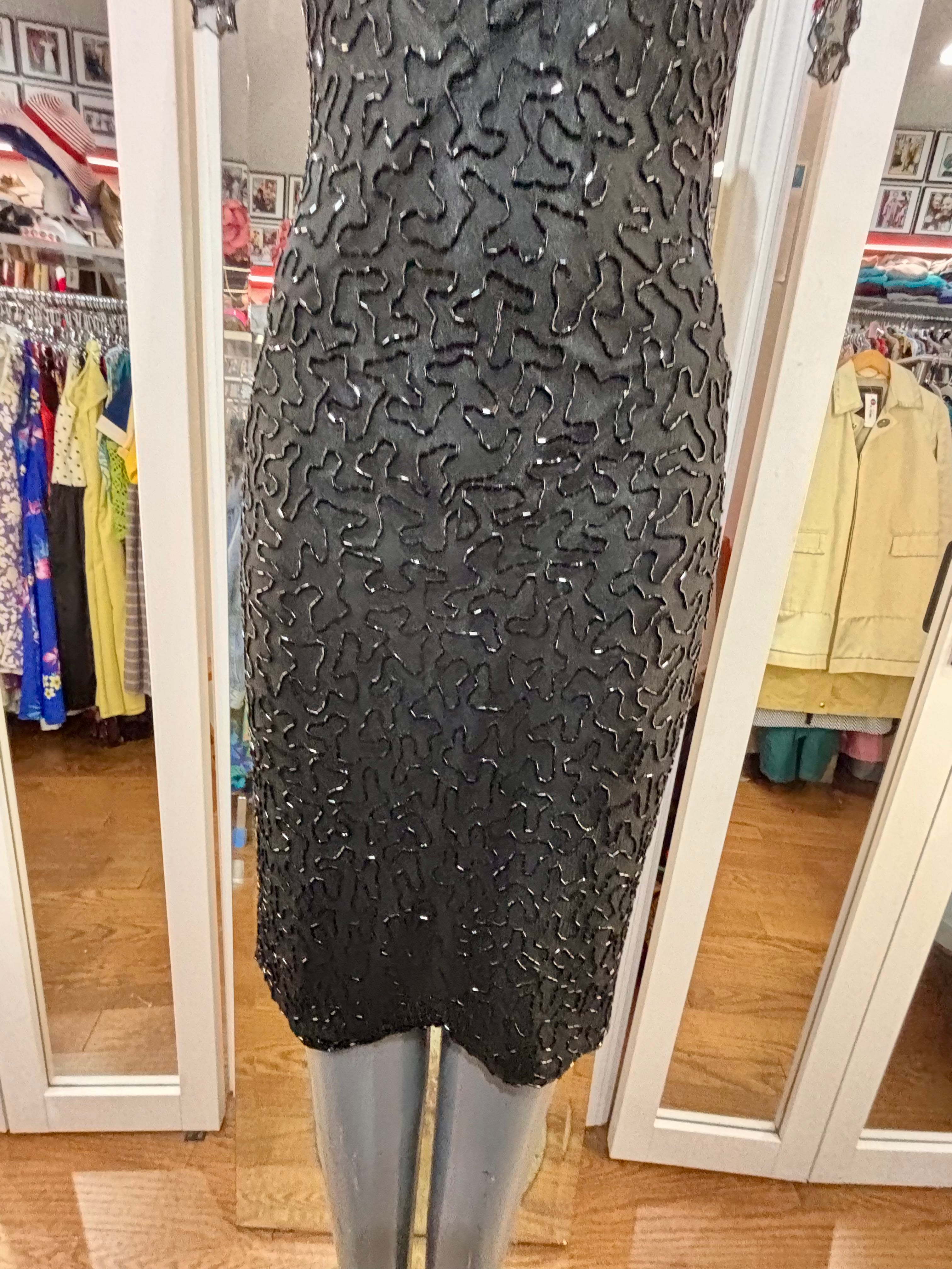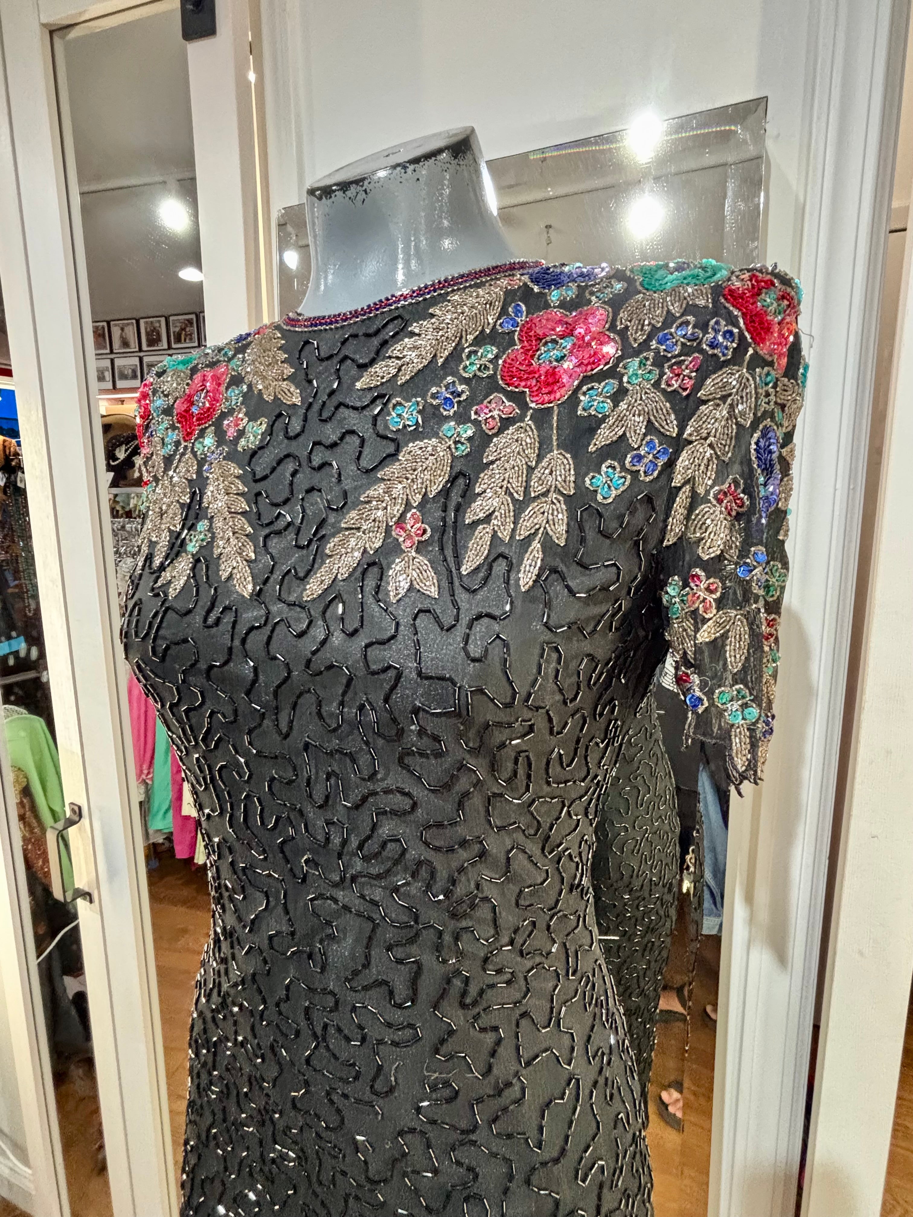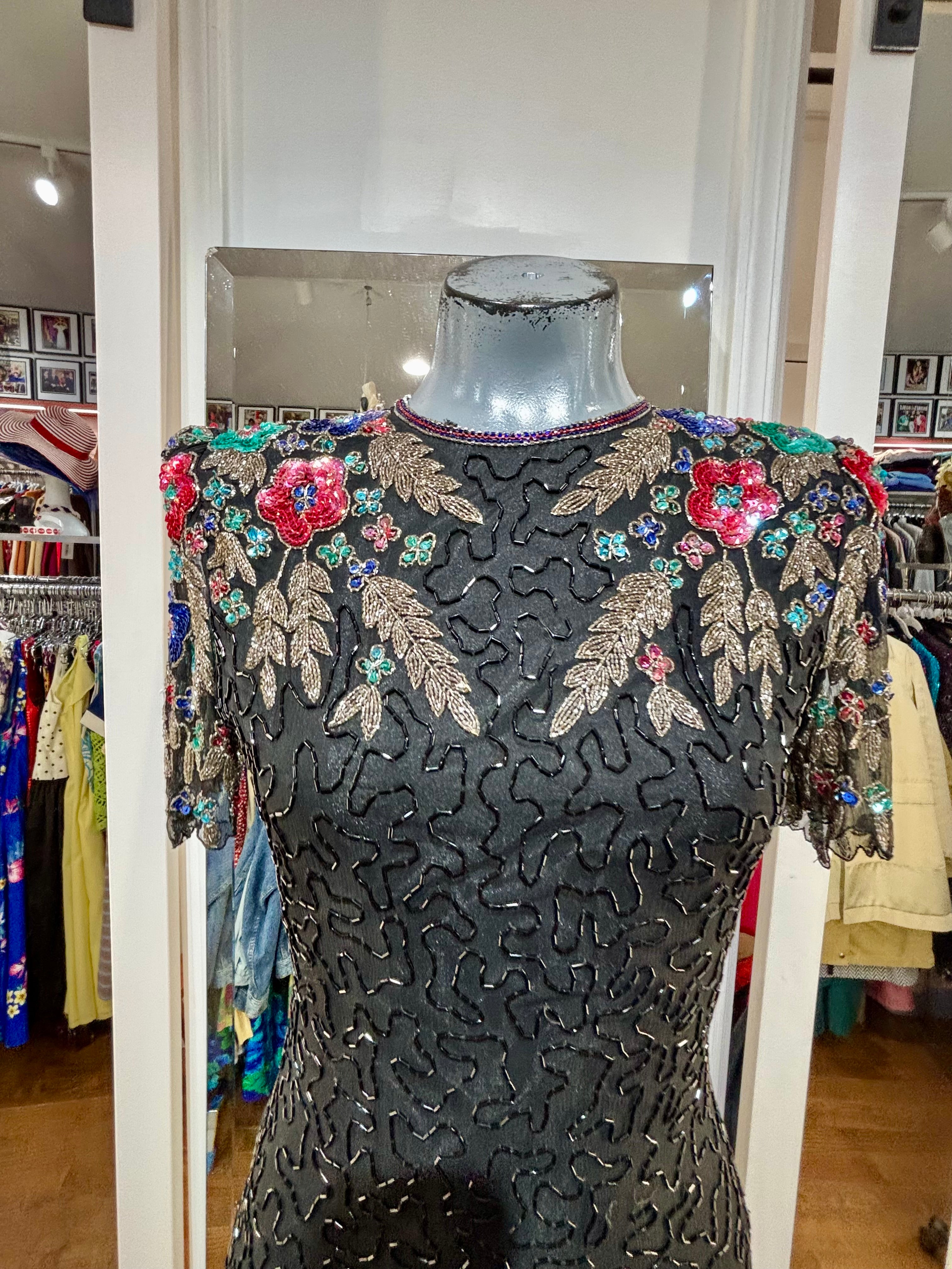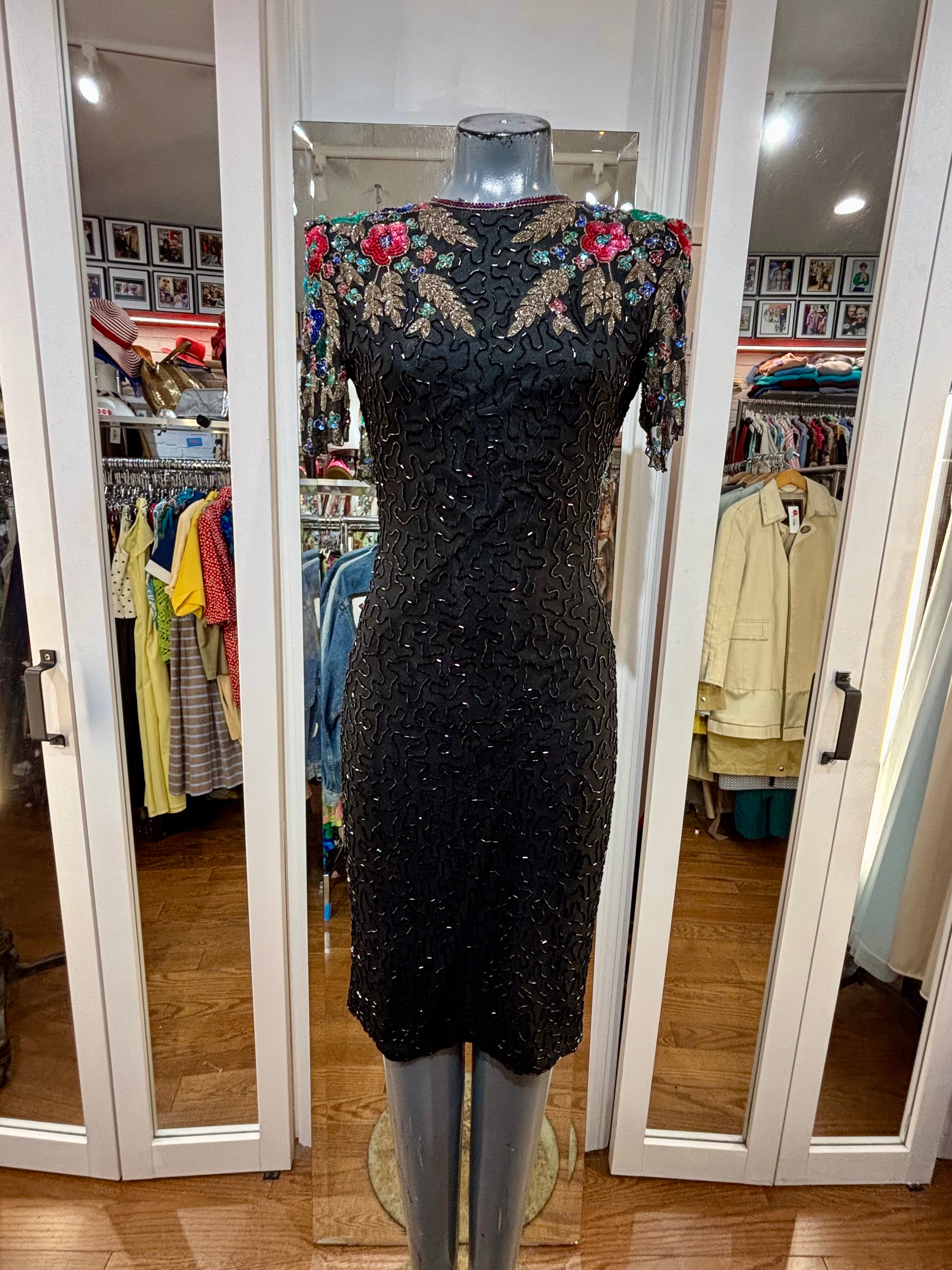 80’s Black Beaded Dress With Multicolored Cap Sleeve Details By Scala