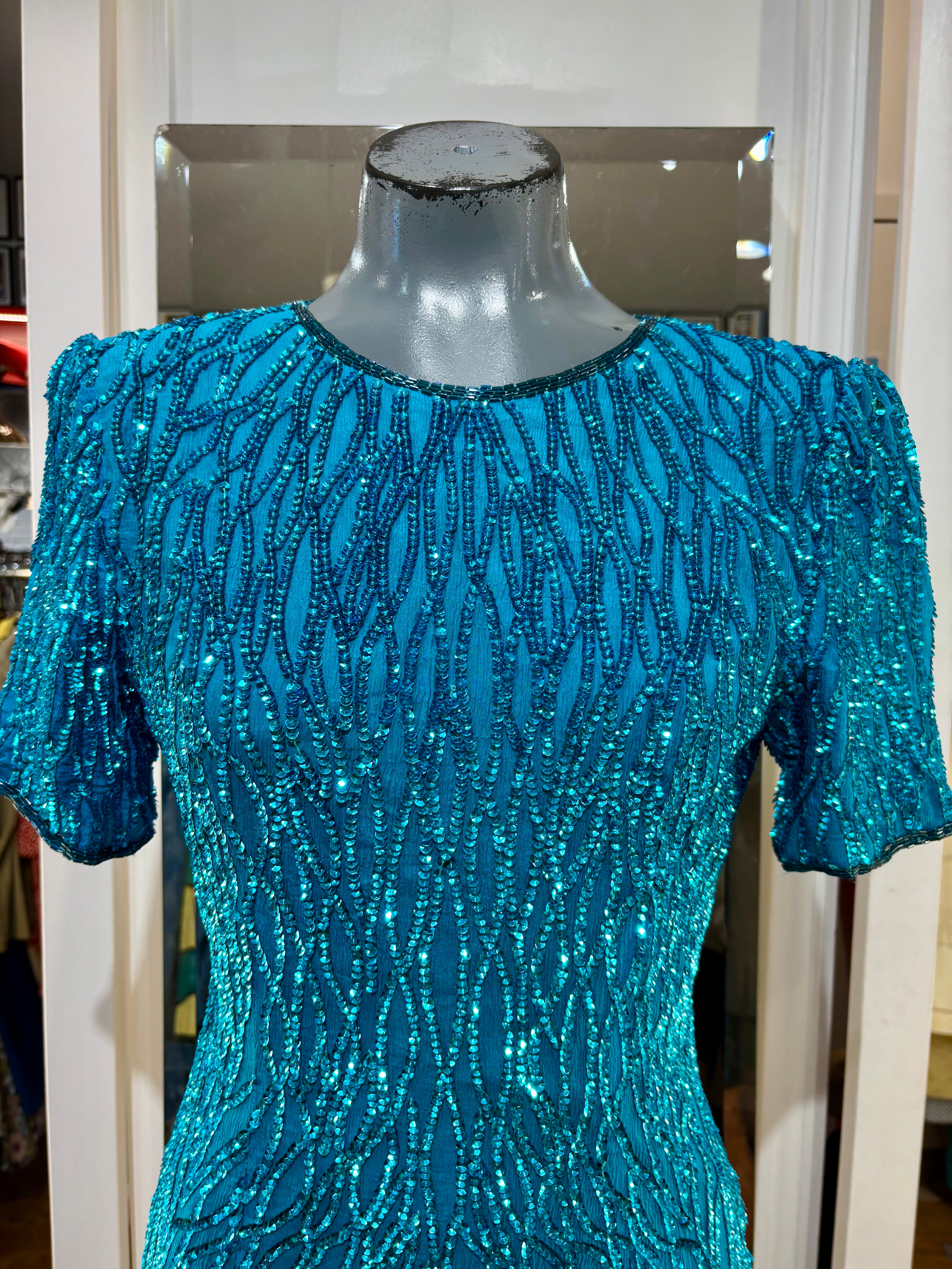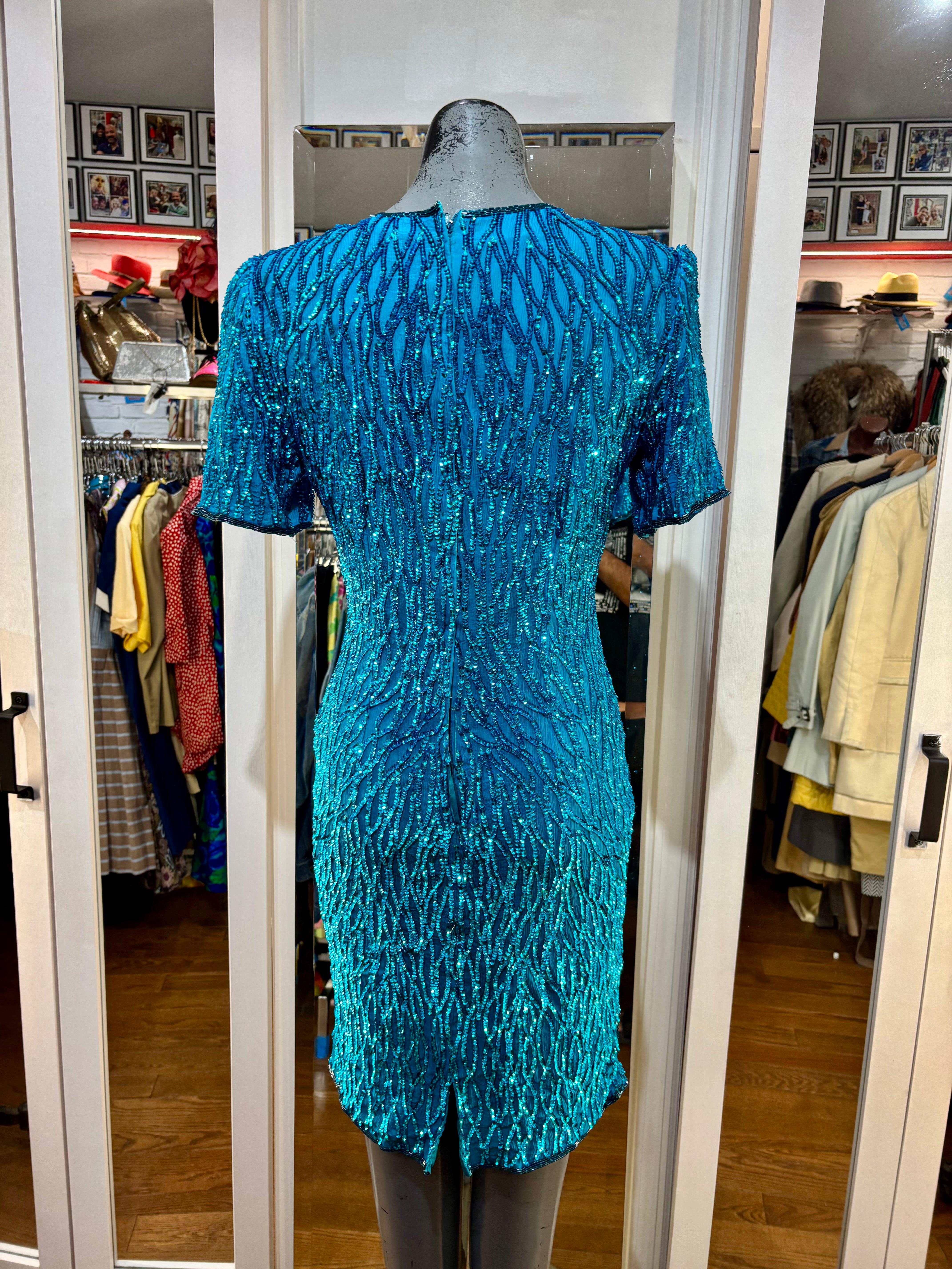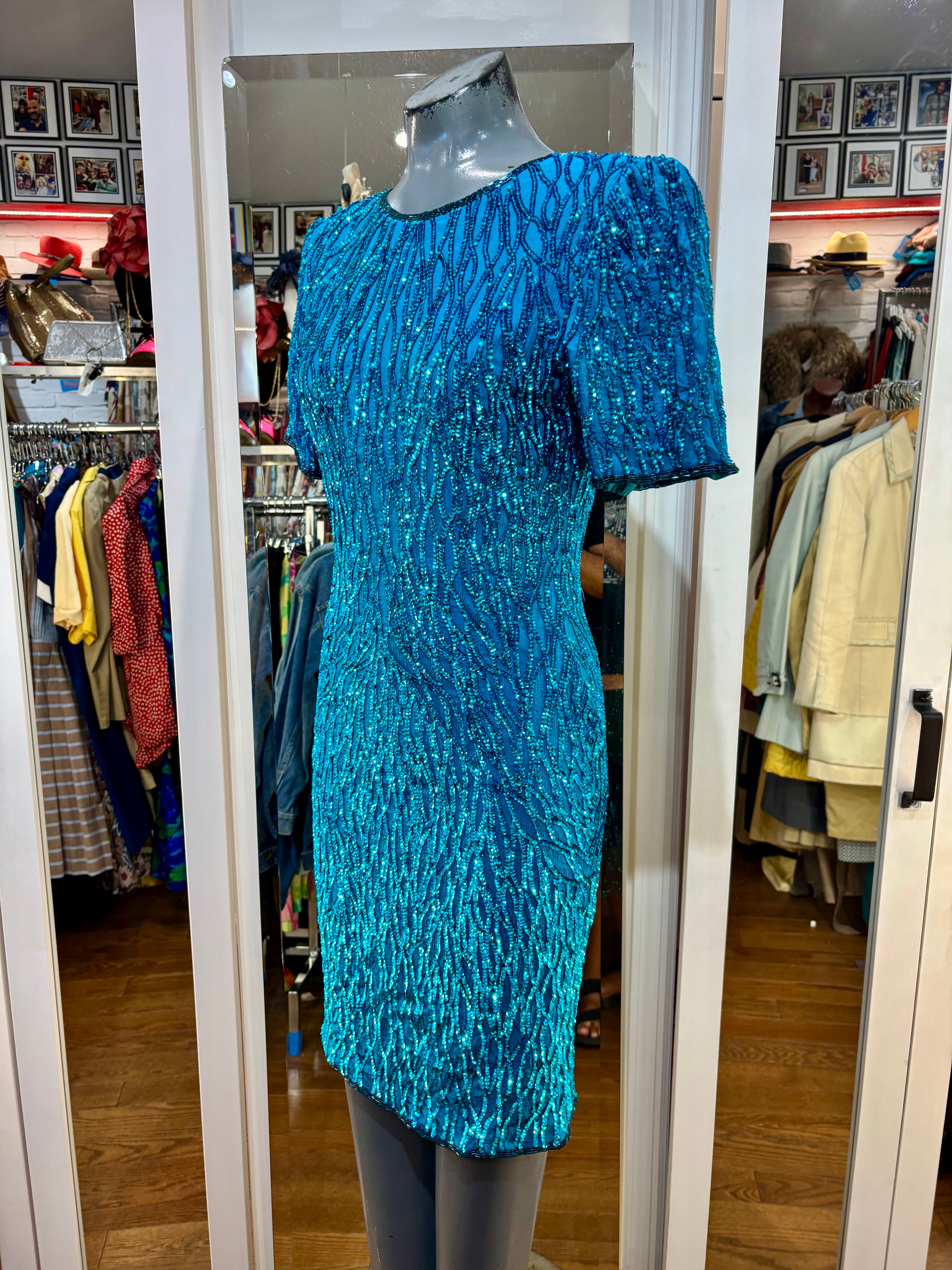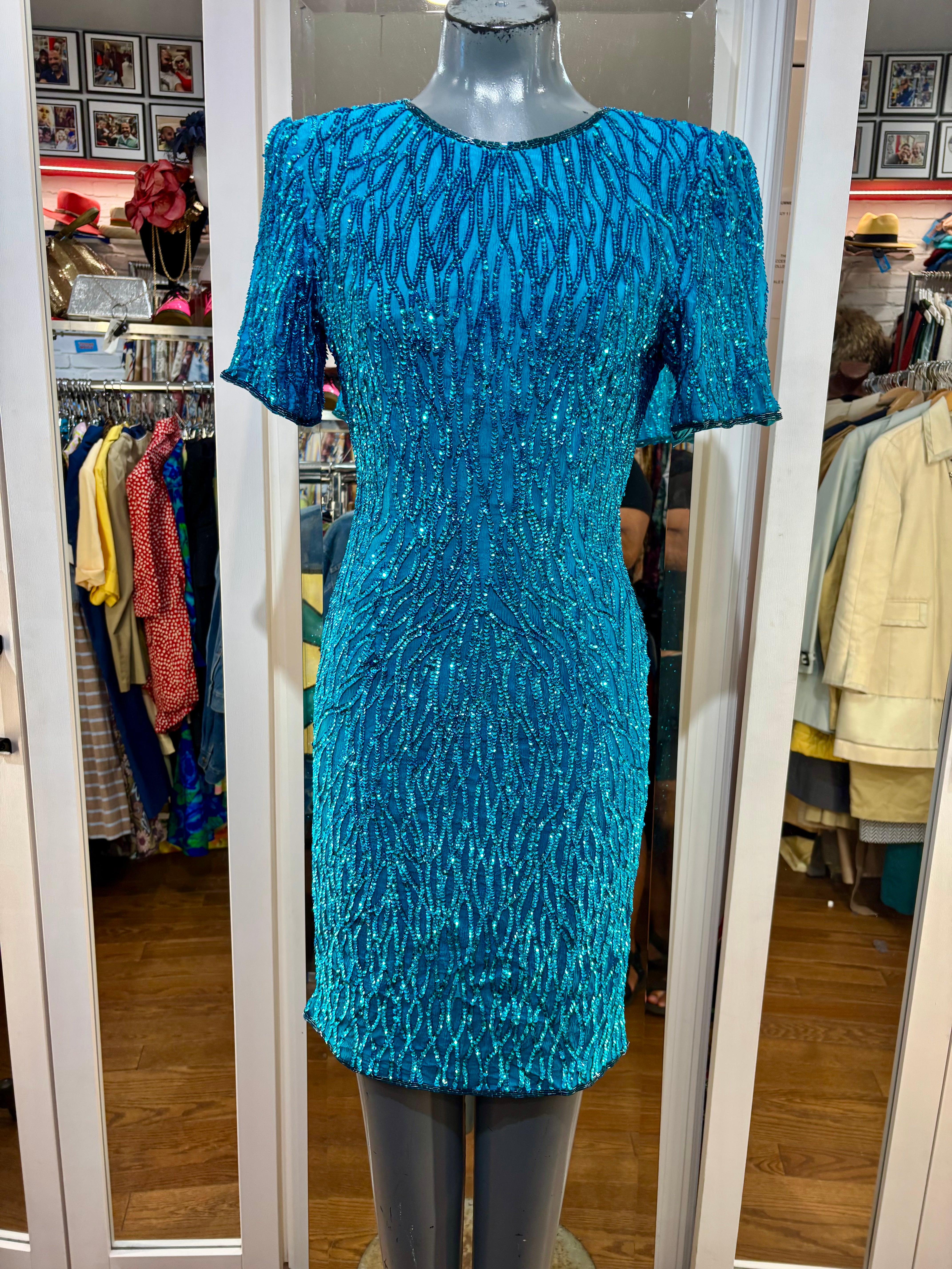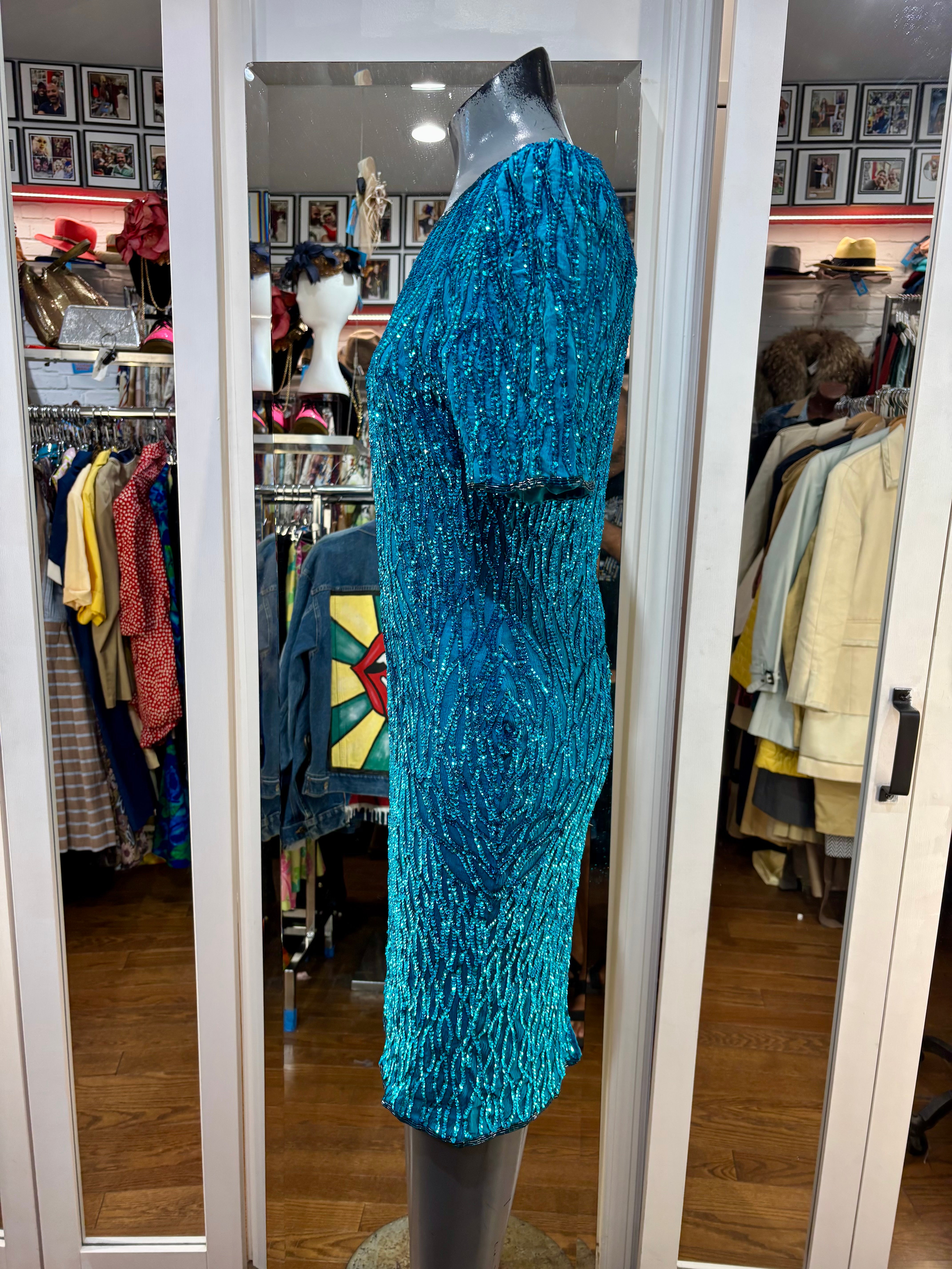 80’s Turquoise Beaded Short Sleeve Dress By Sténay