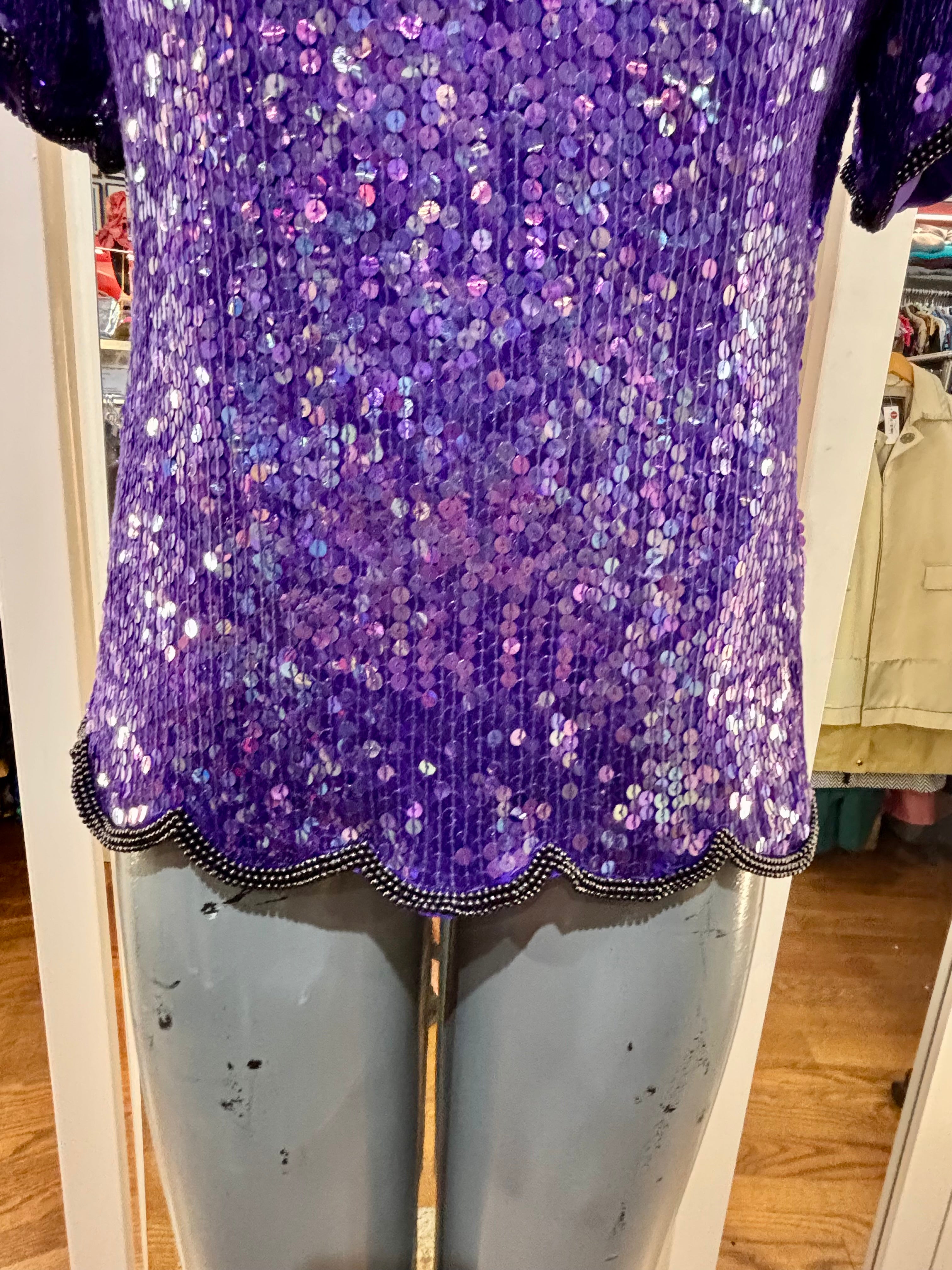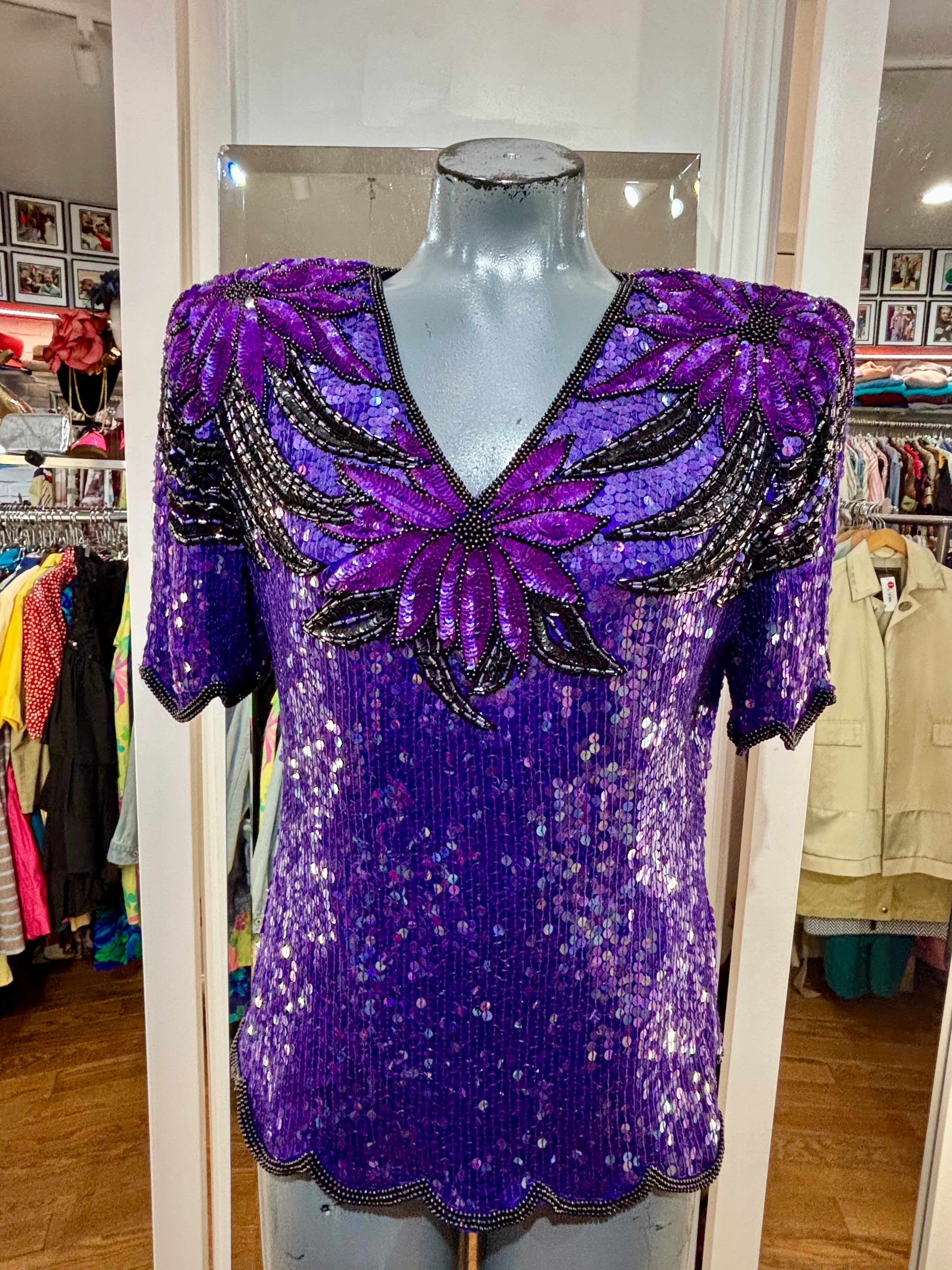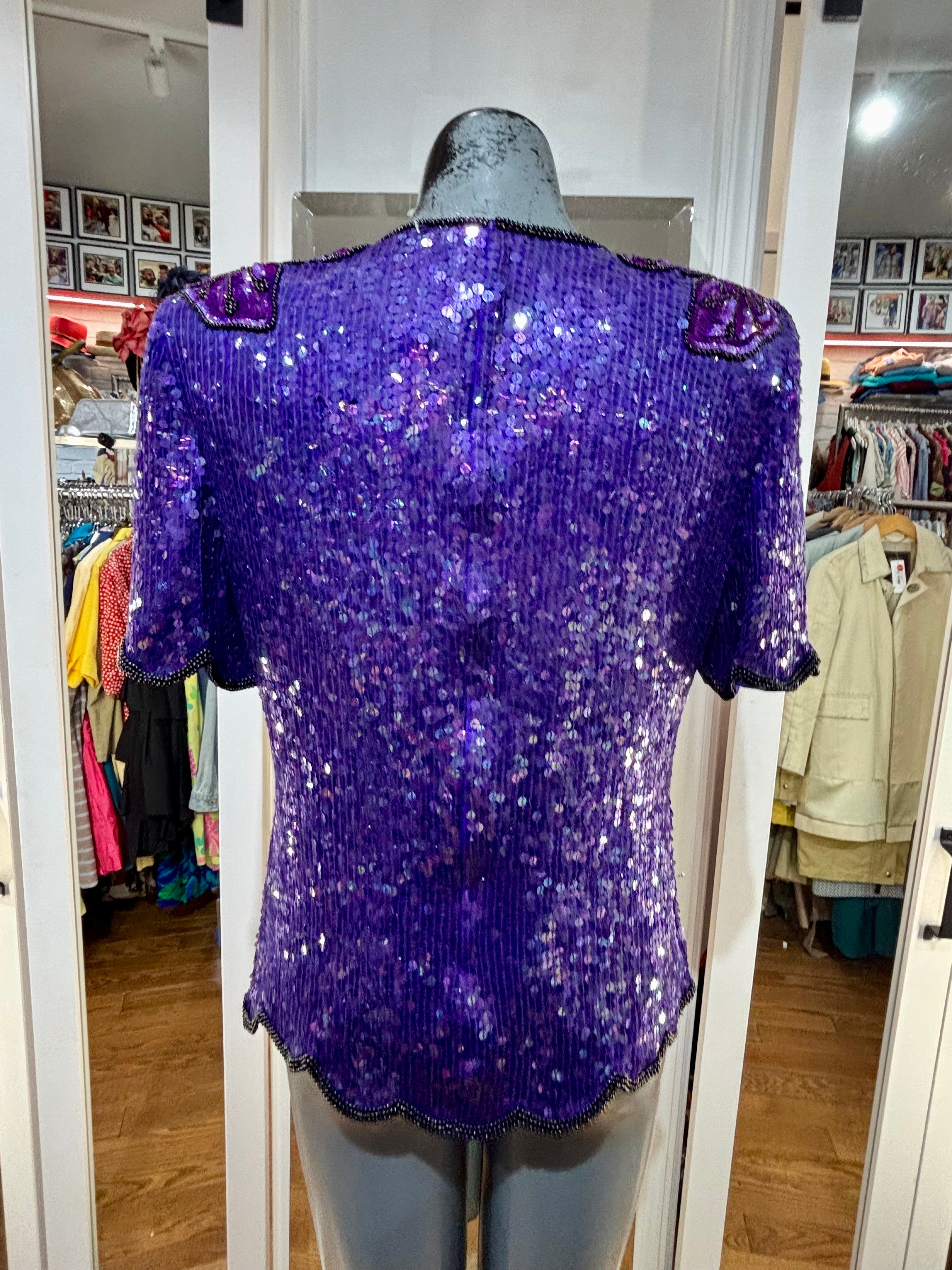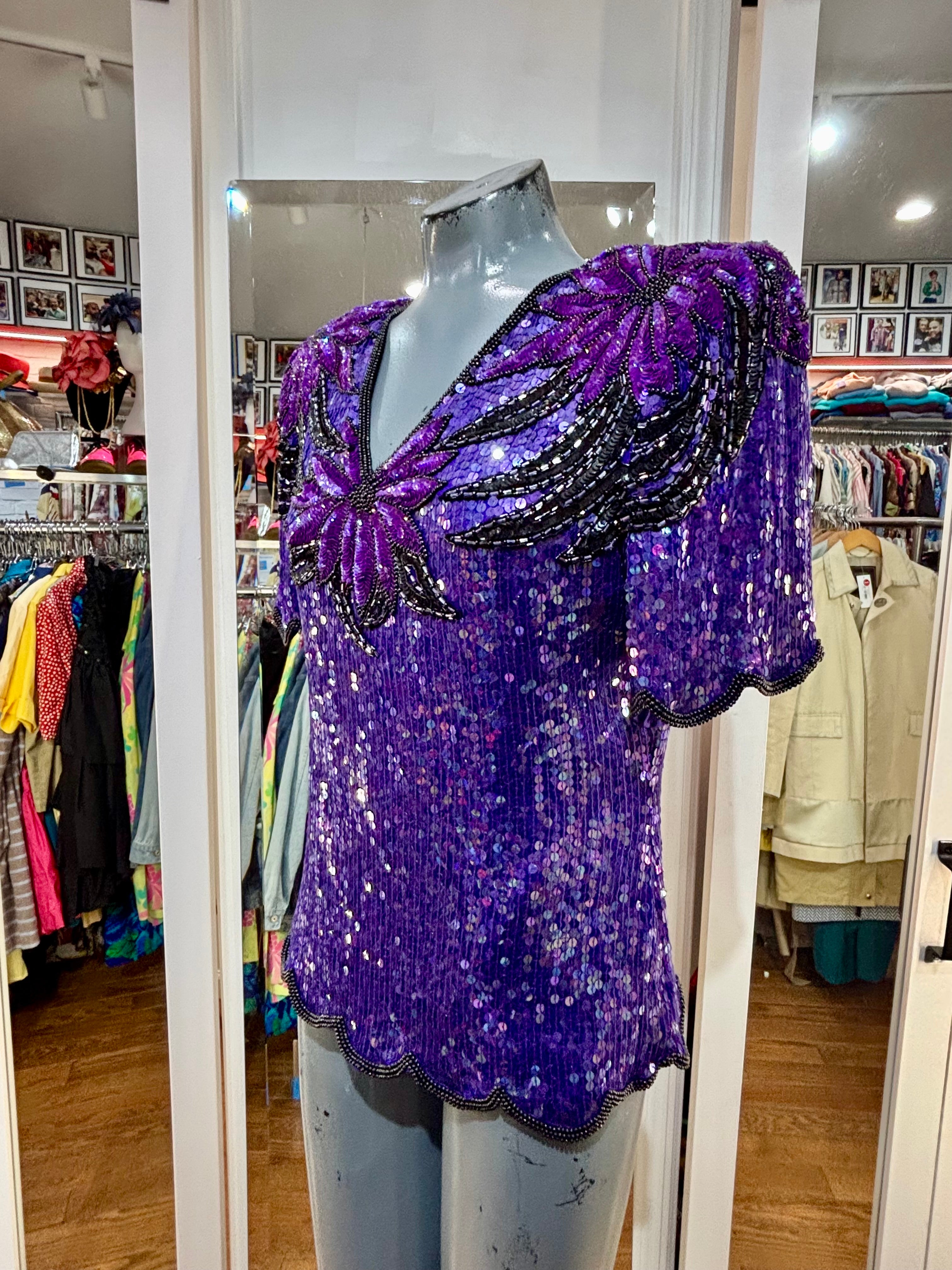 80’s Purple Flower Detailing Short Sleeve Sequins Top By Dominique