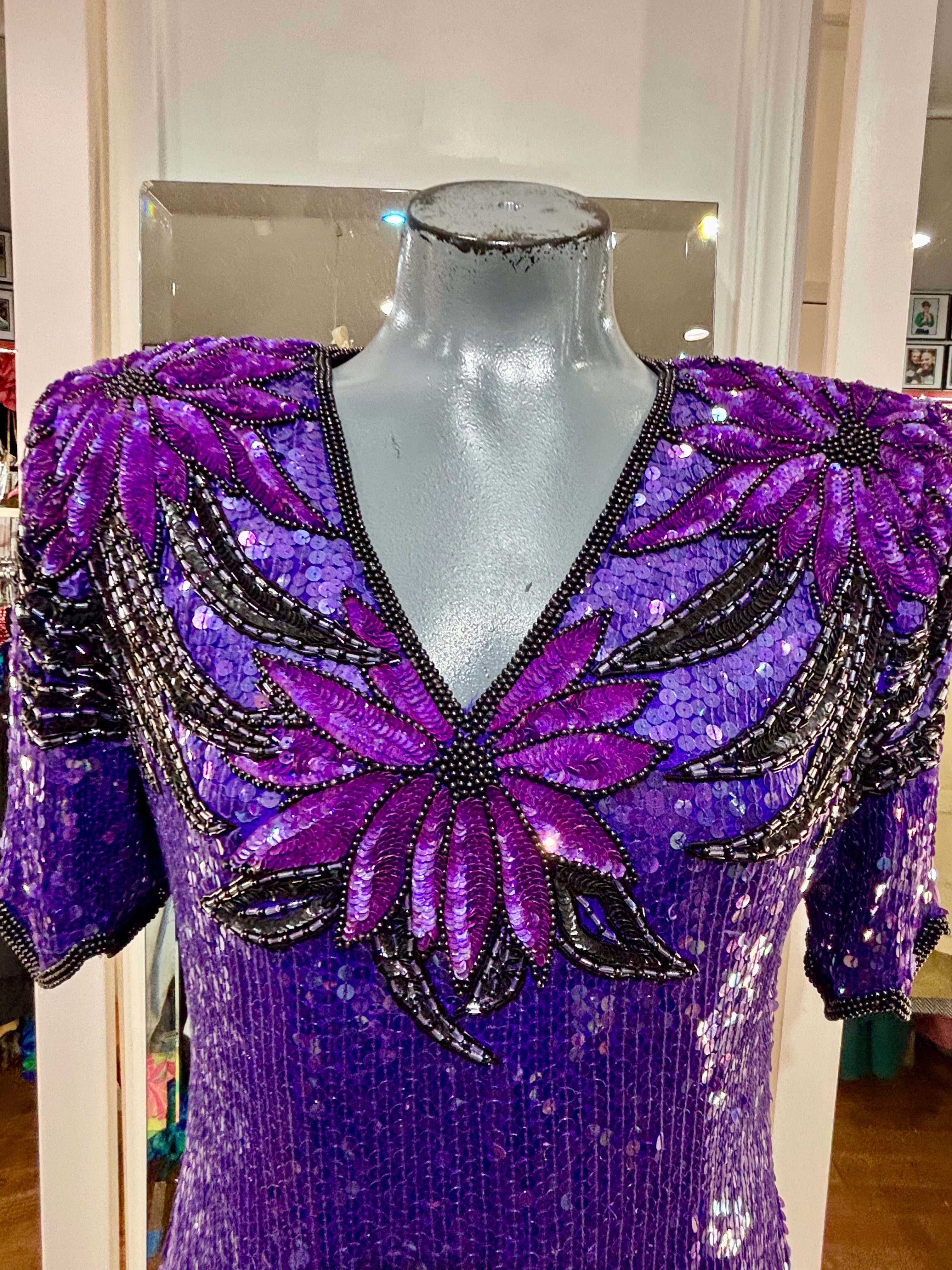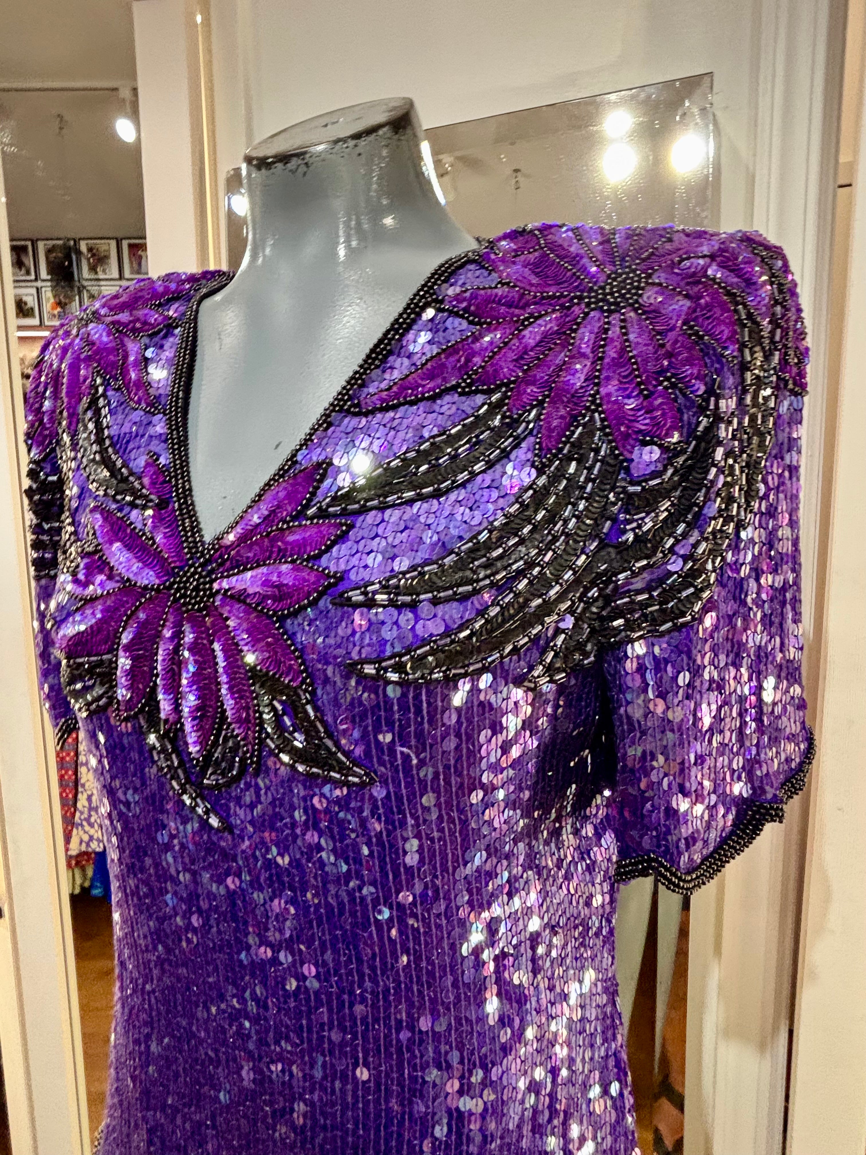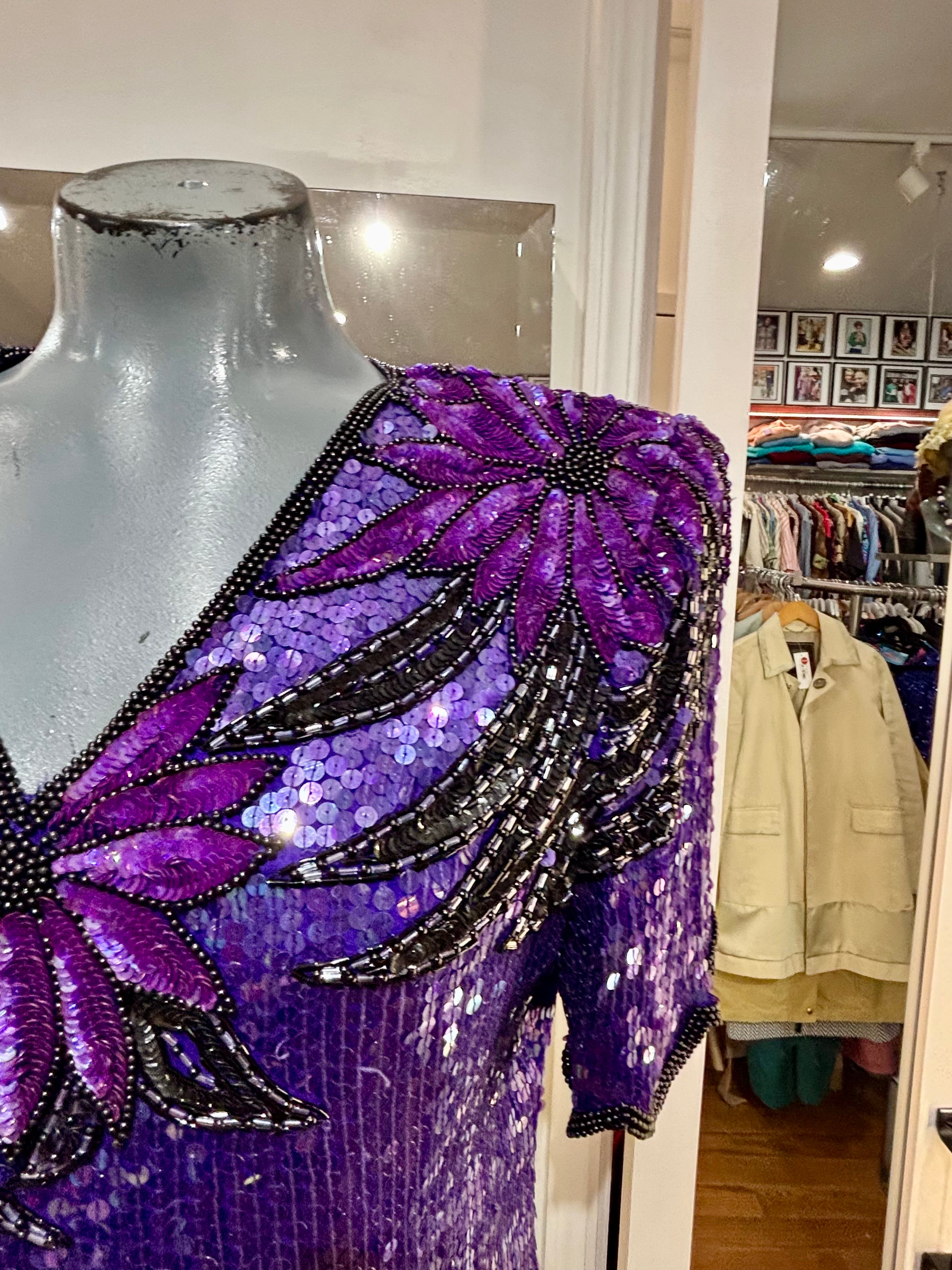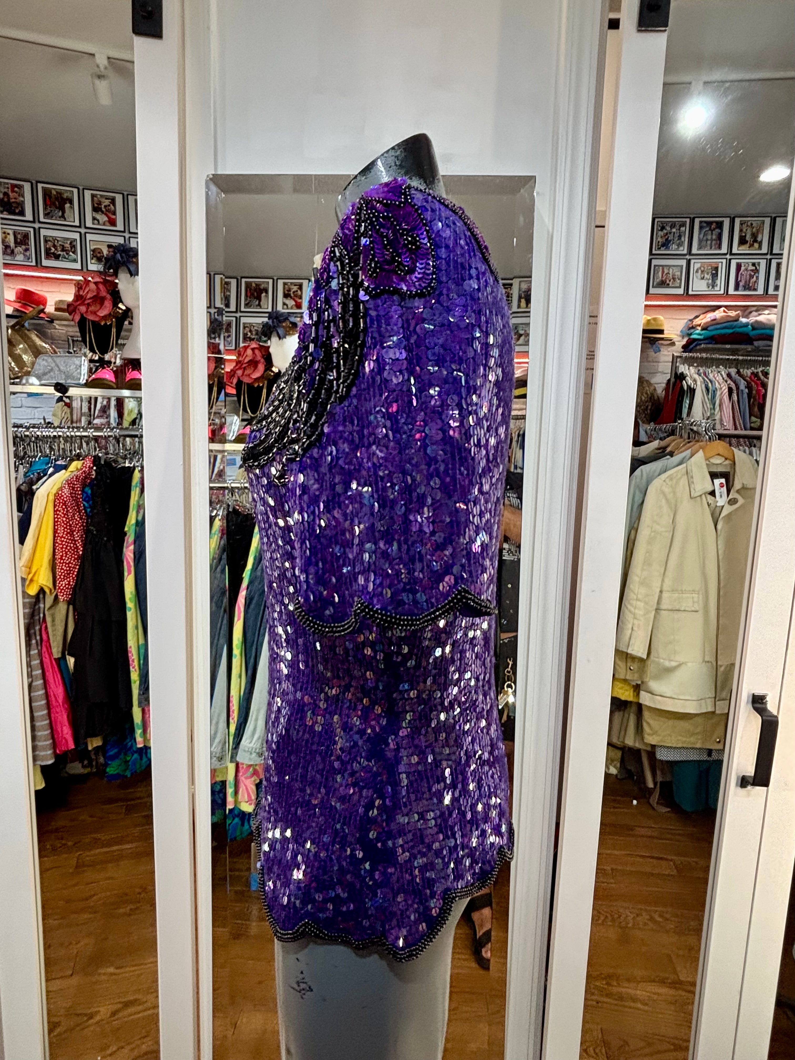 80’s Purple Flower Detailing Short Sleeve Sequins Top By Dominique