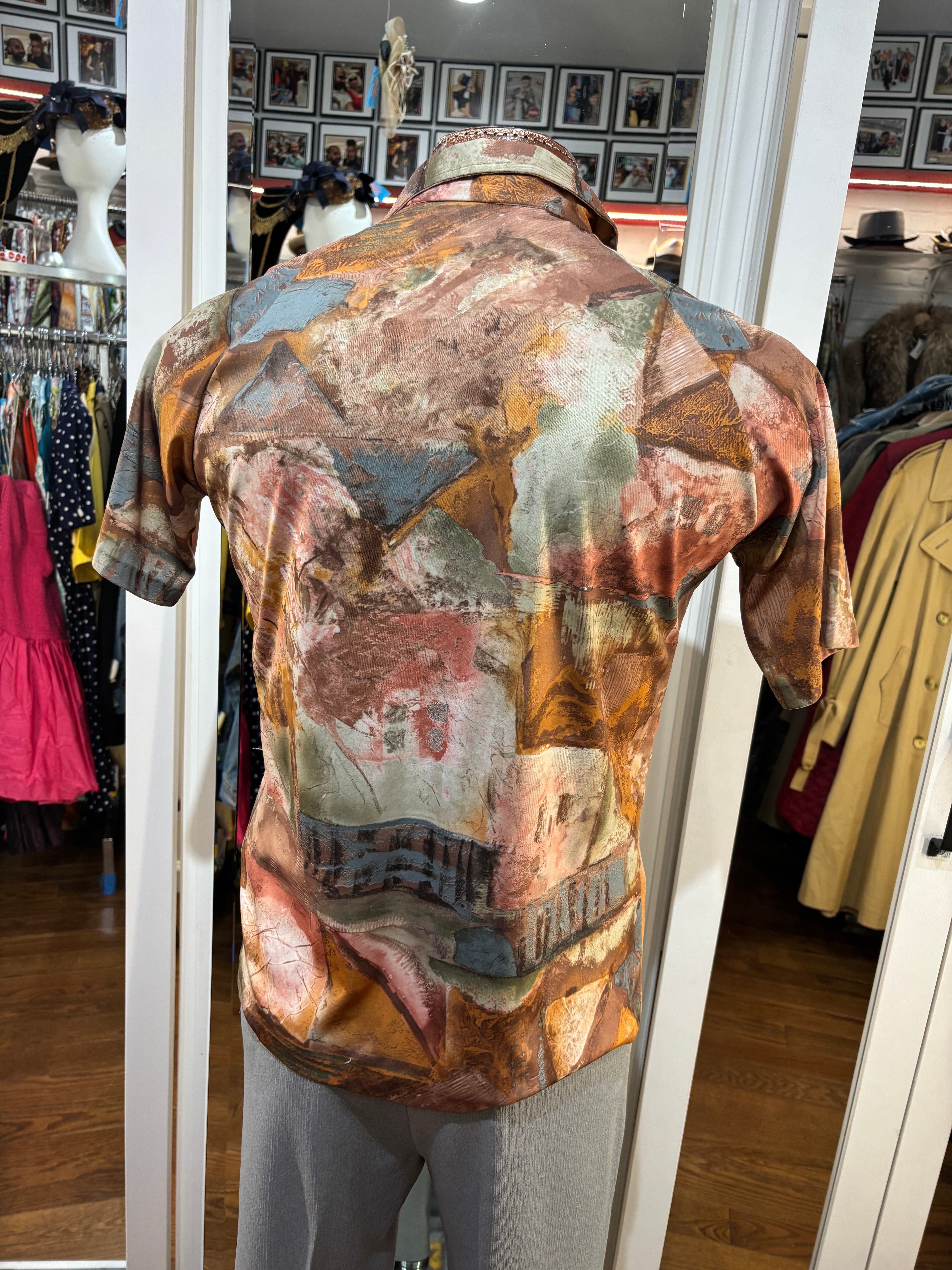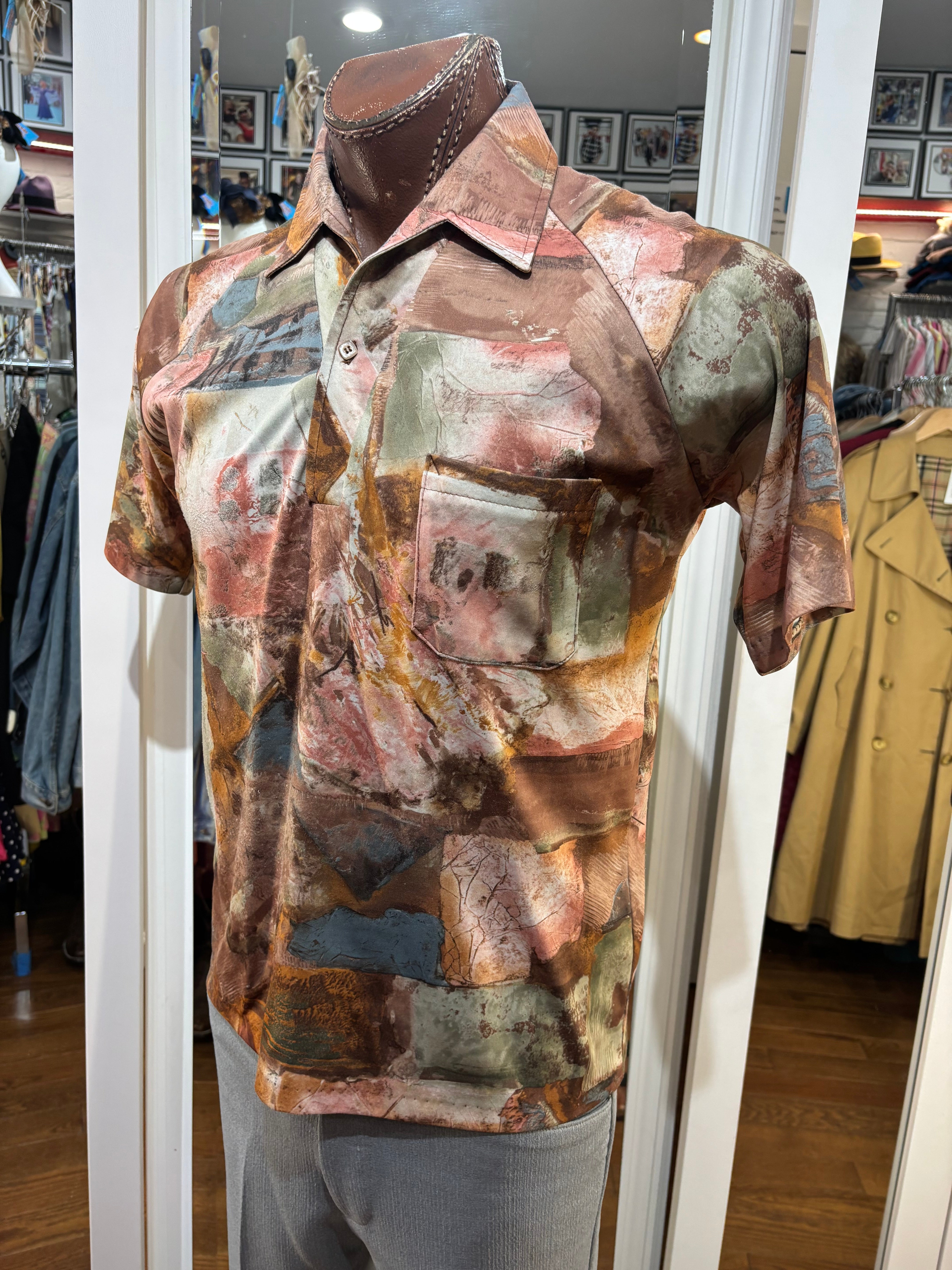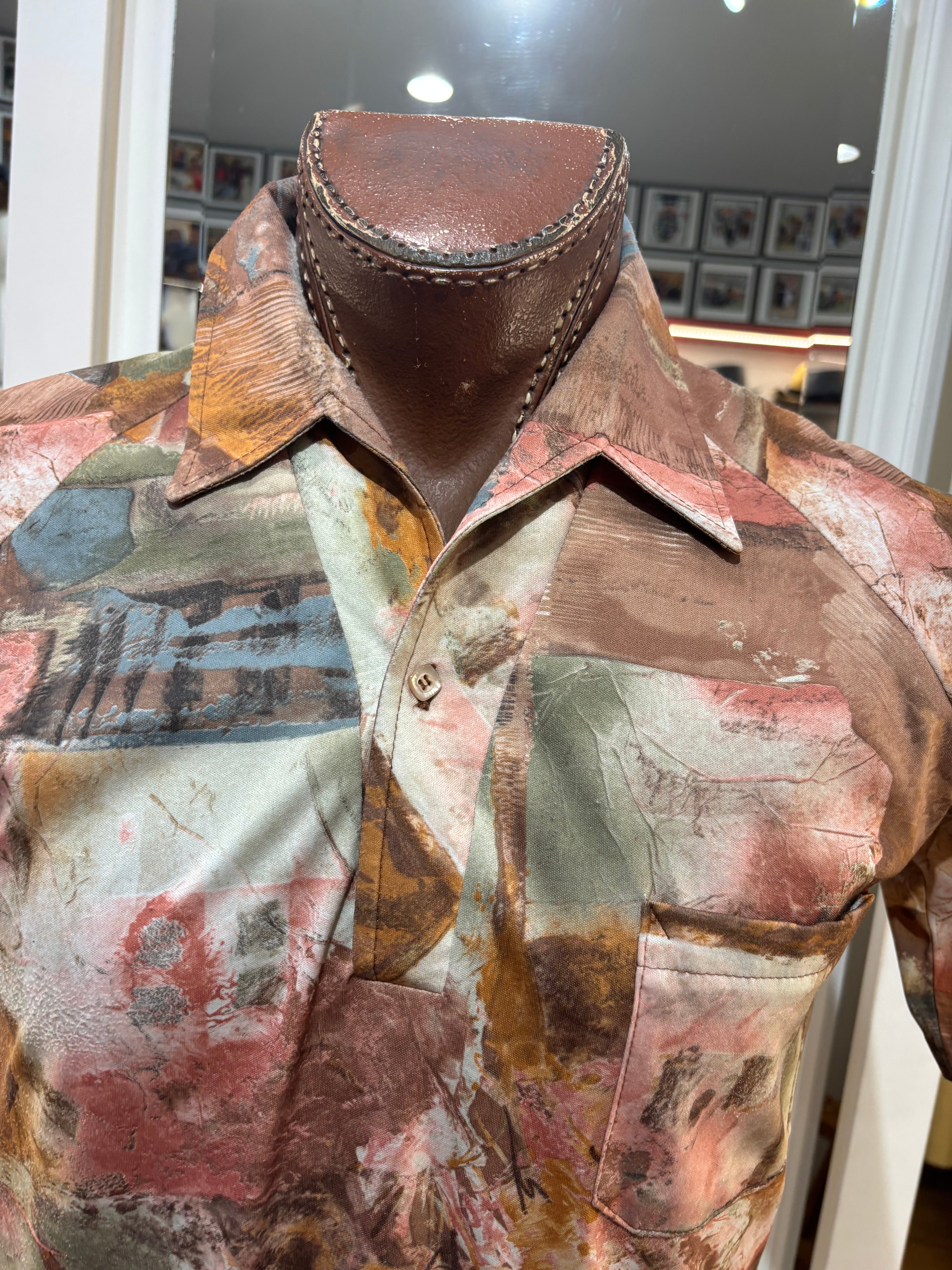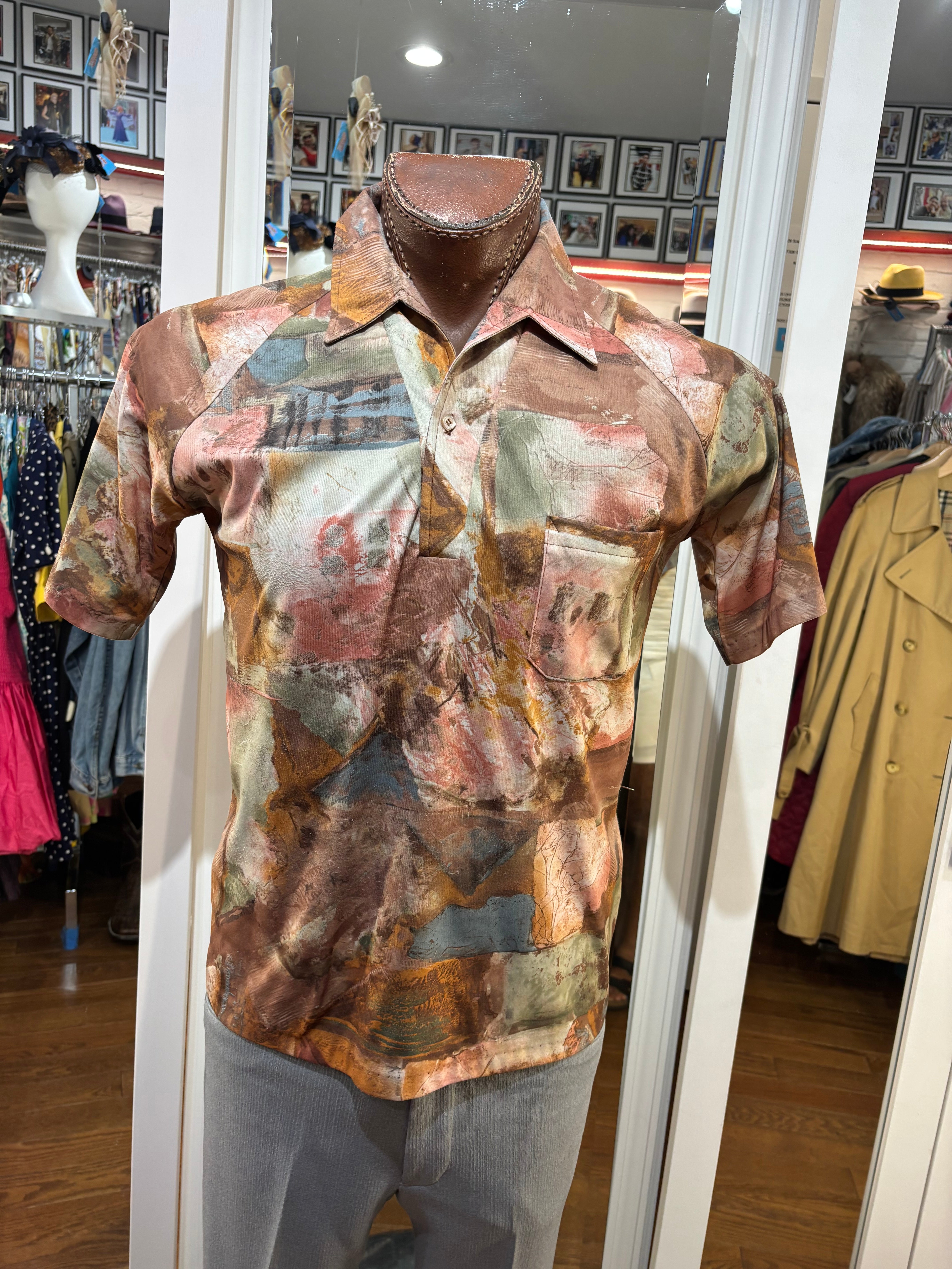 70’s Brown Abstract Multicolor Print Collared Disco Polo Shirt By Resort Ware
