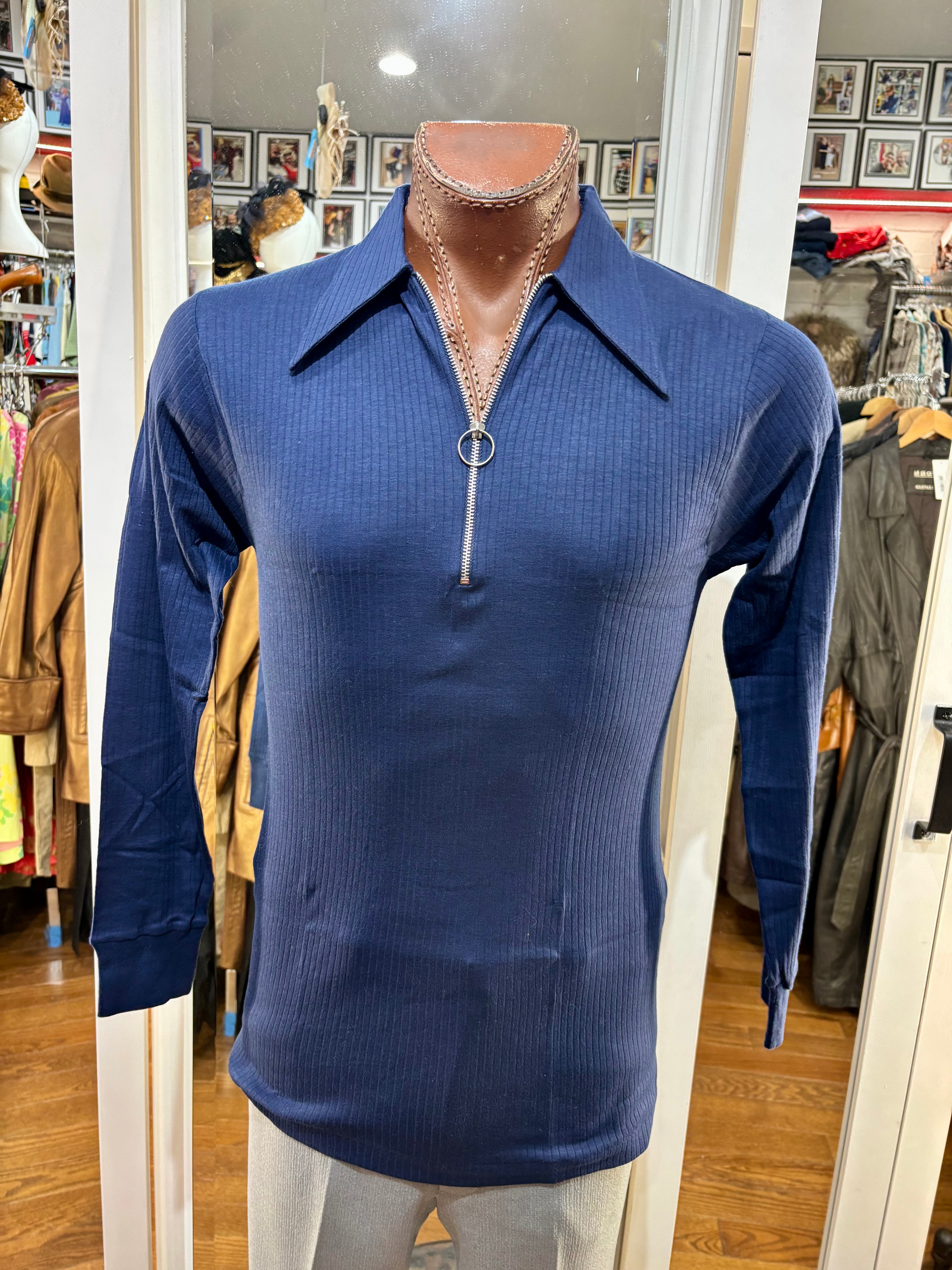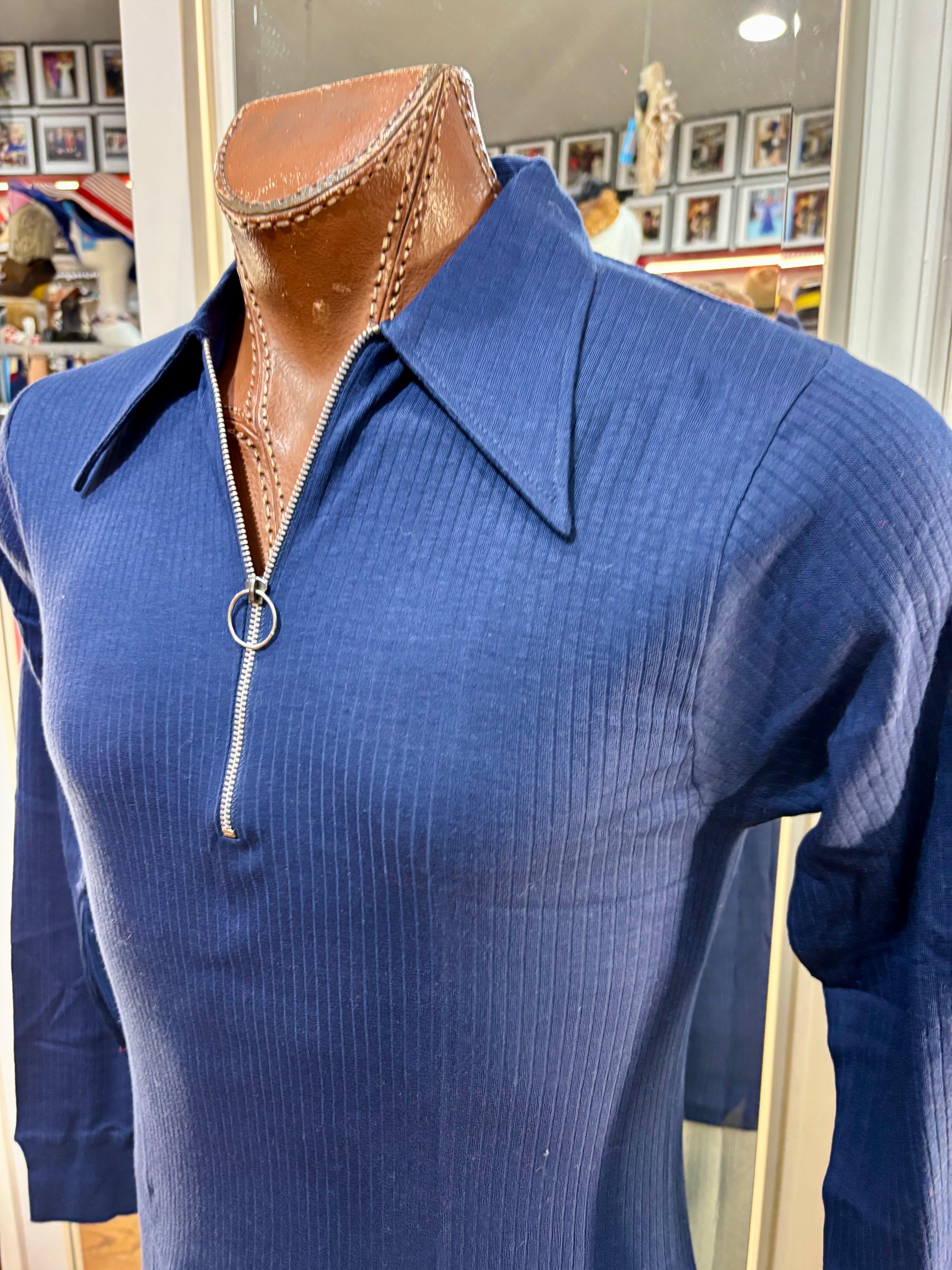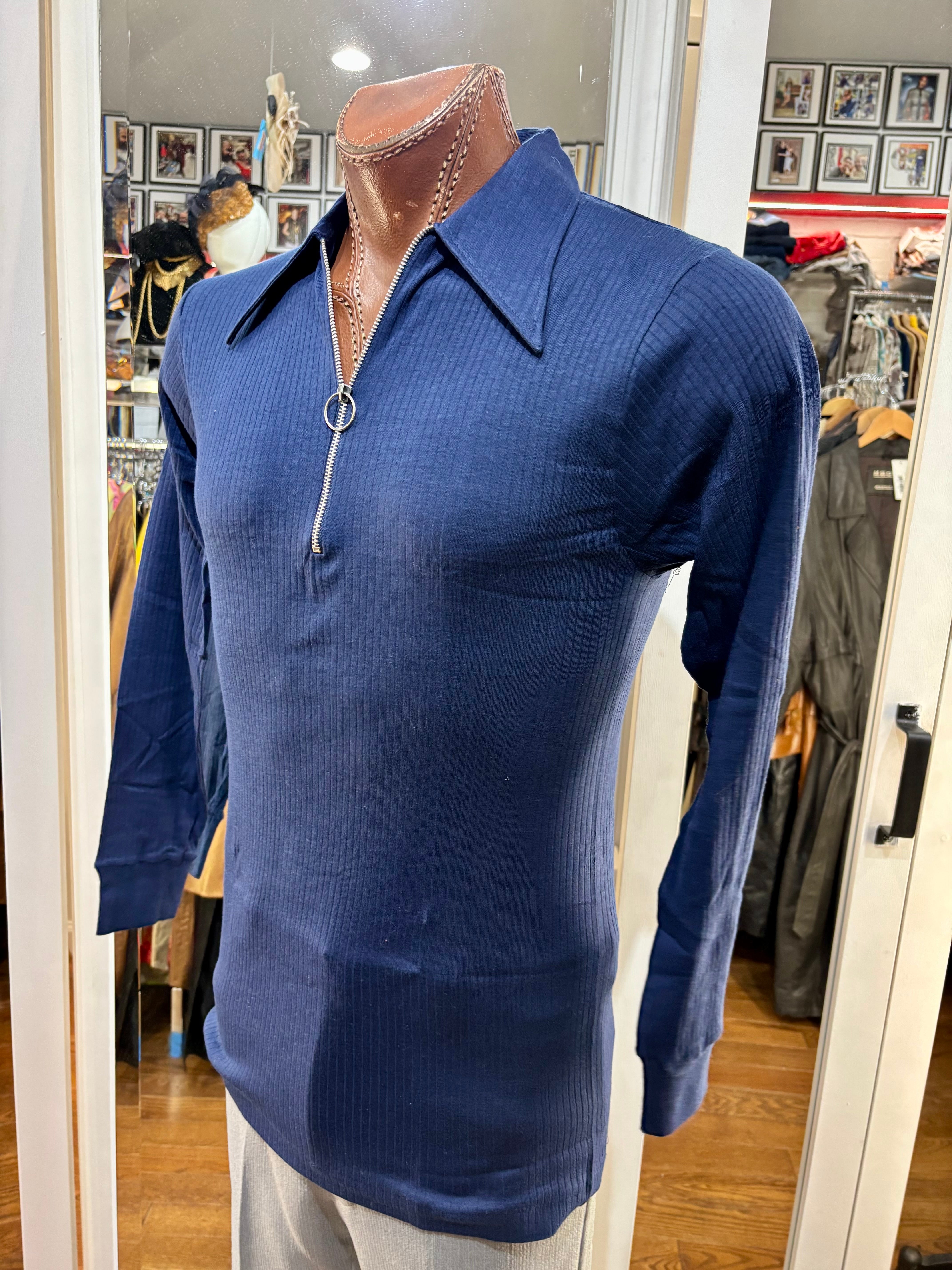 70’s Navy Zip Collar Collared Pull By Smartex Combed