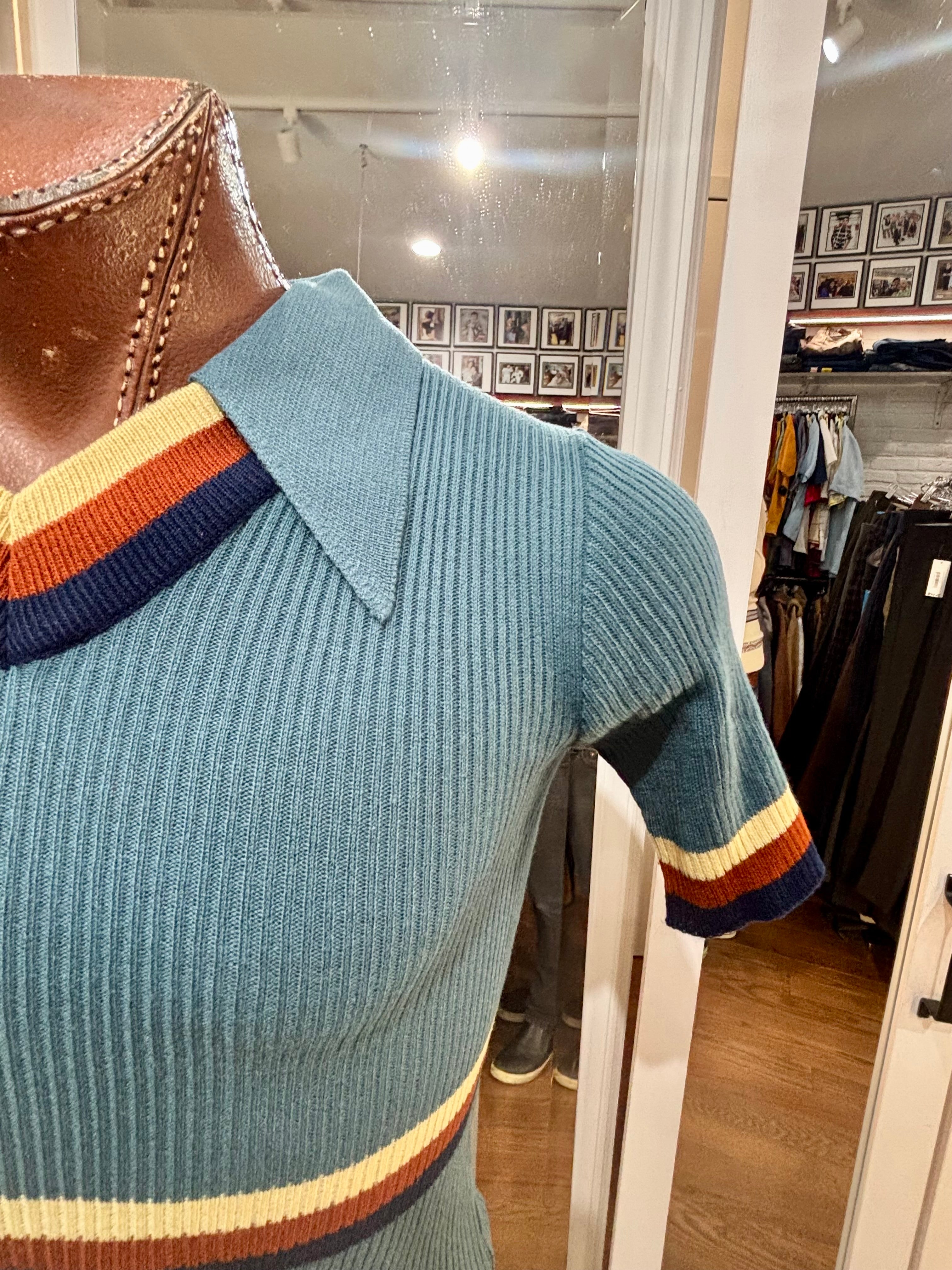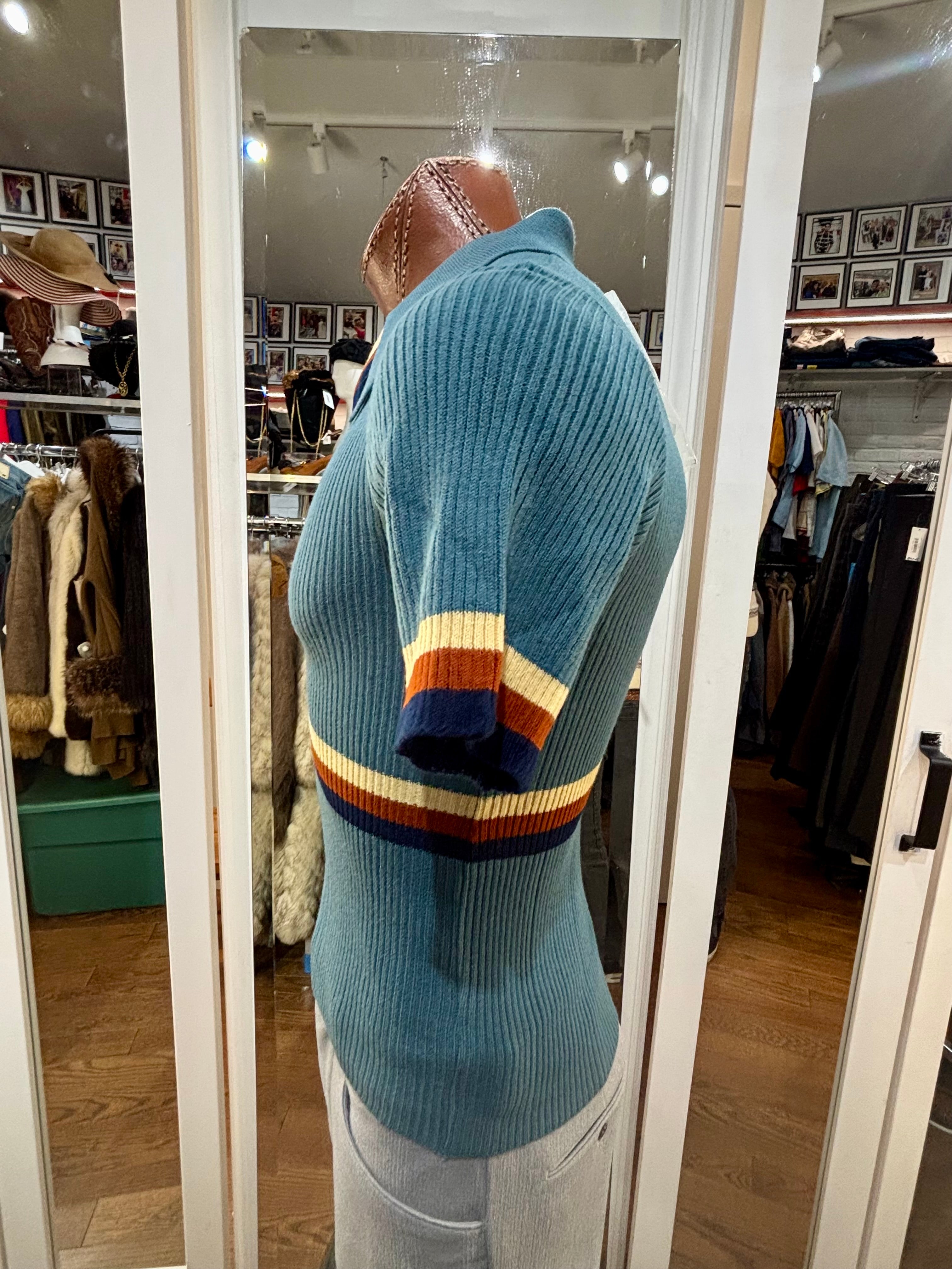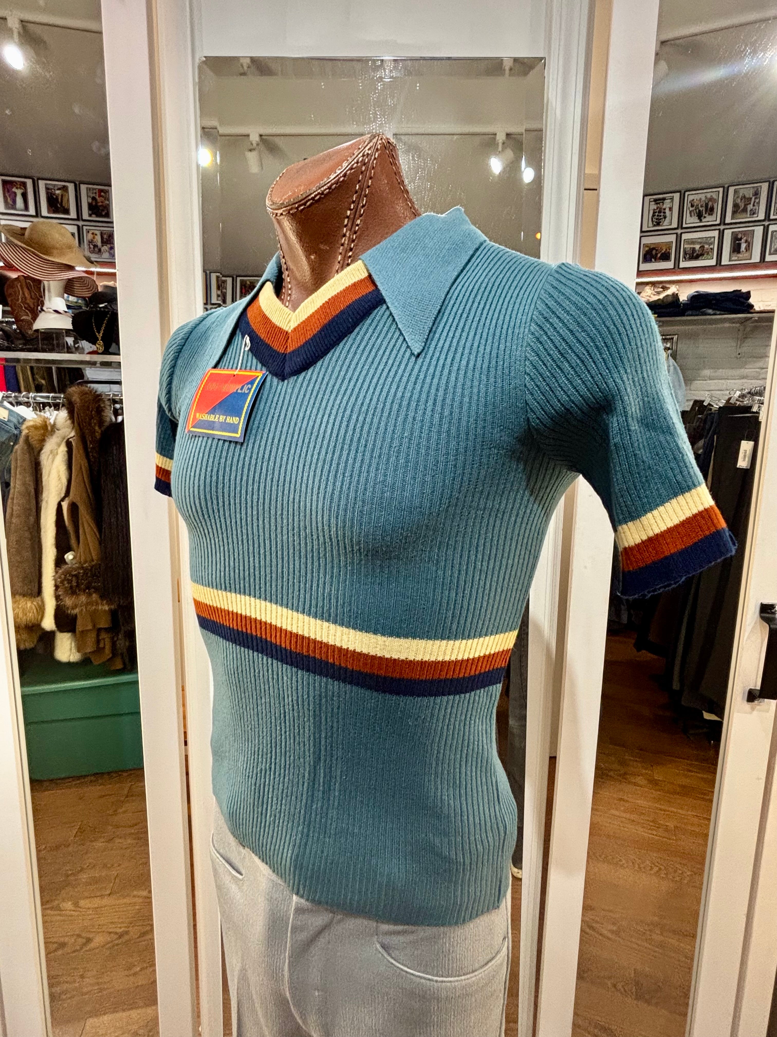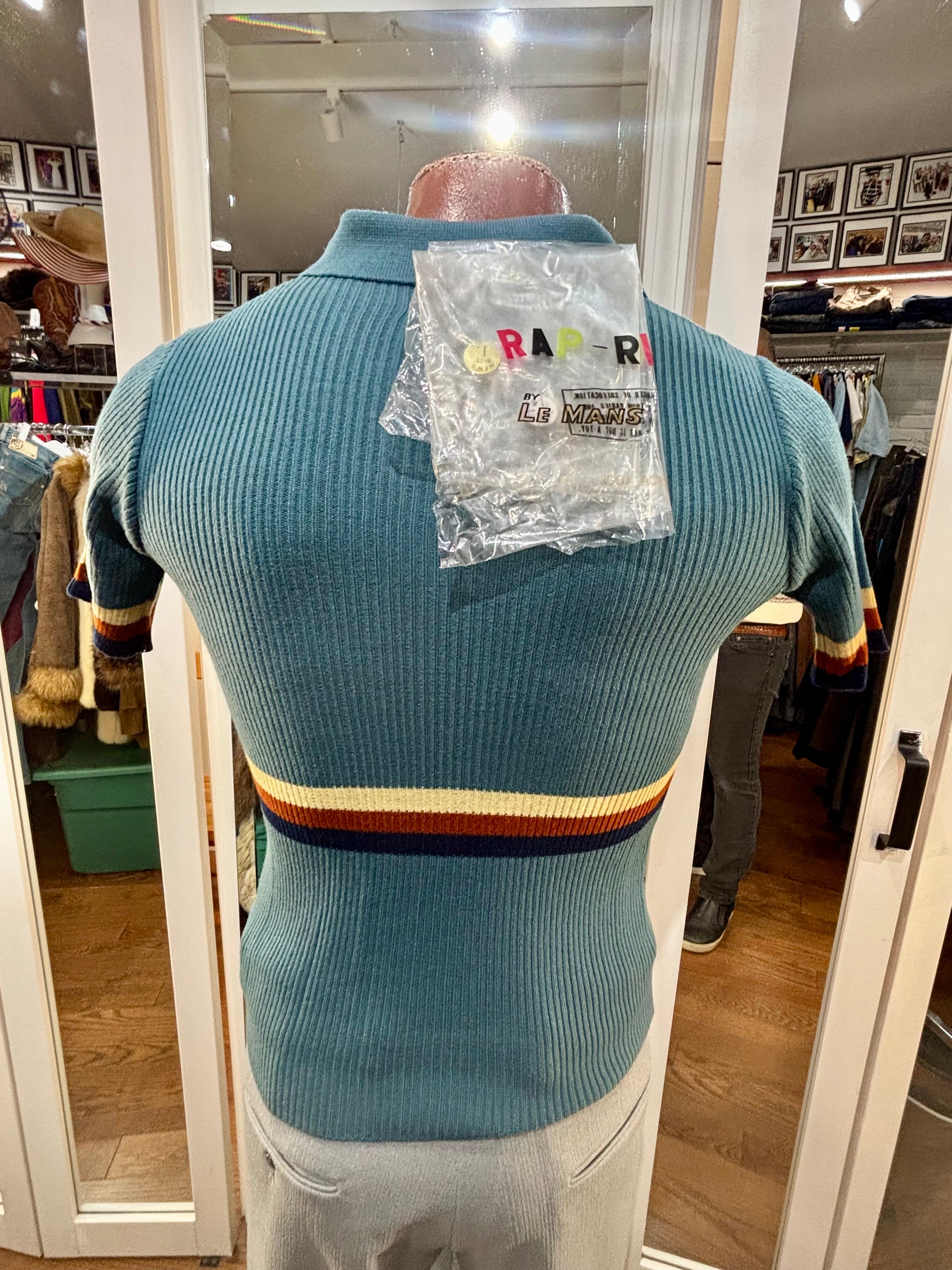 70’s Blue Multicolor Stripe Old Stock Collared Knit Pull By Rap Bibs