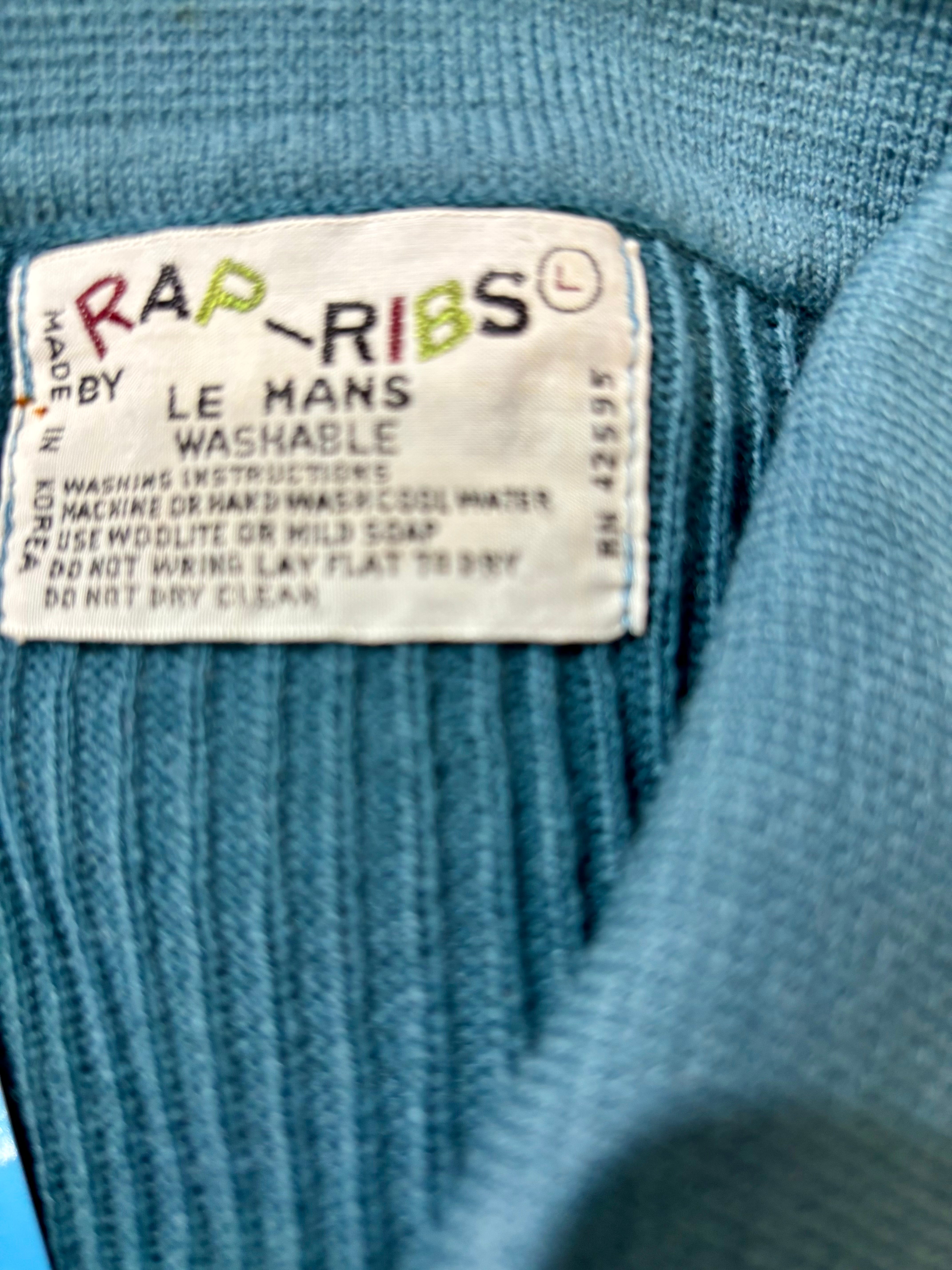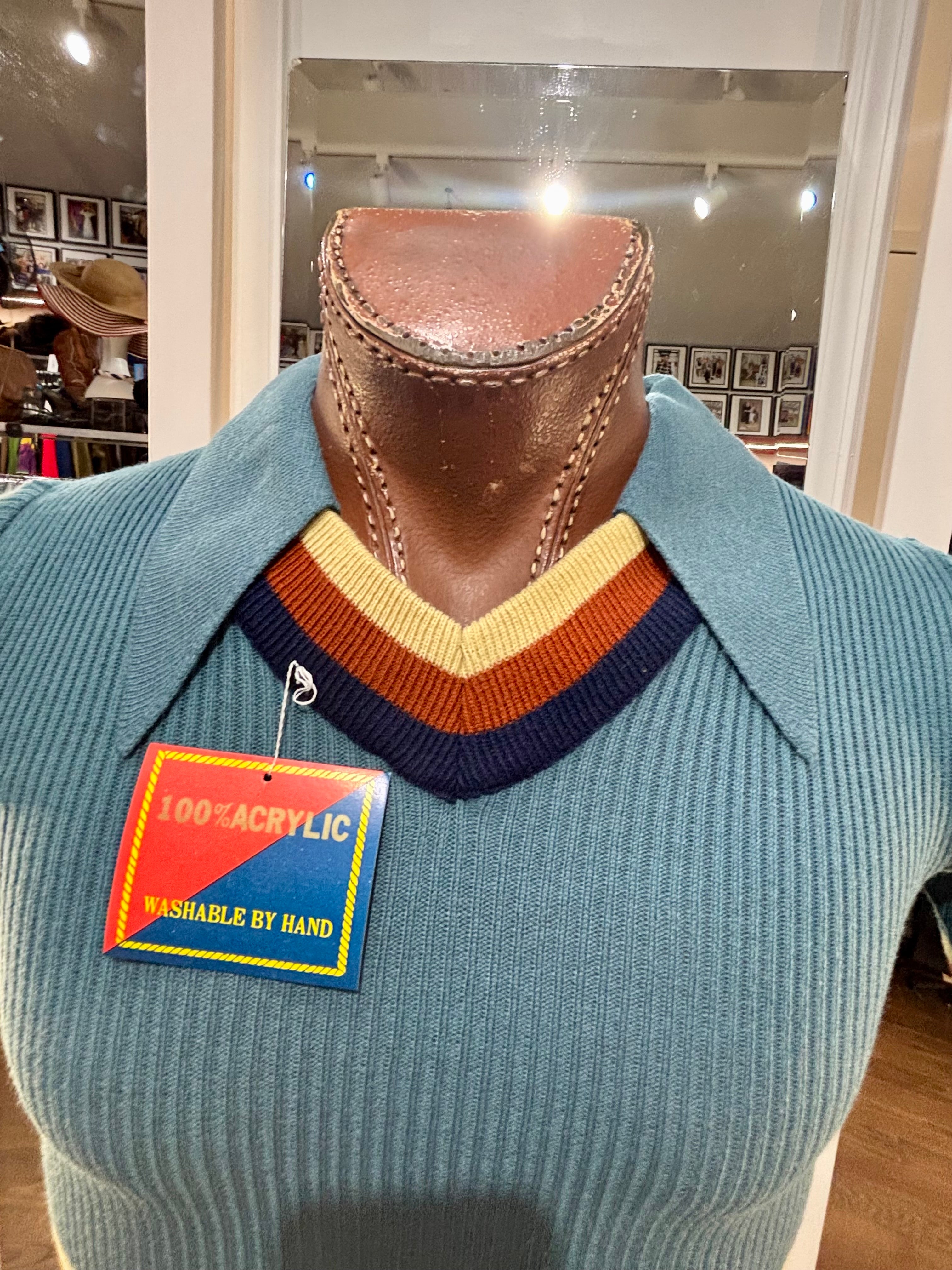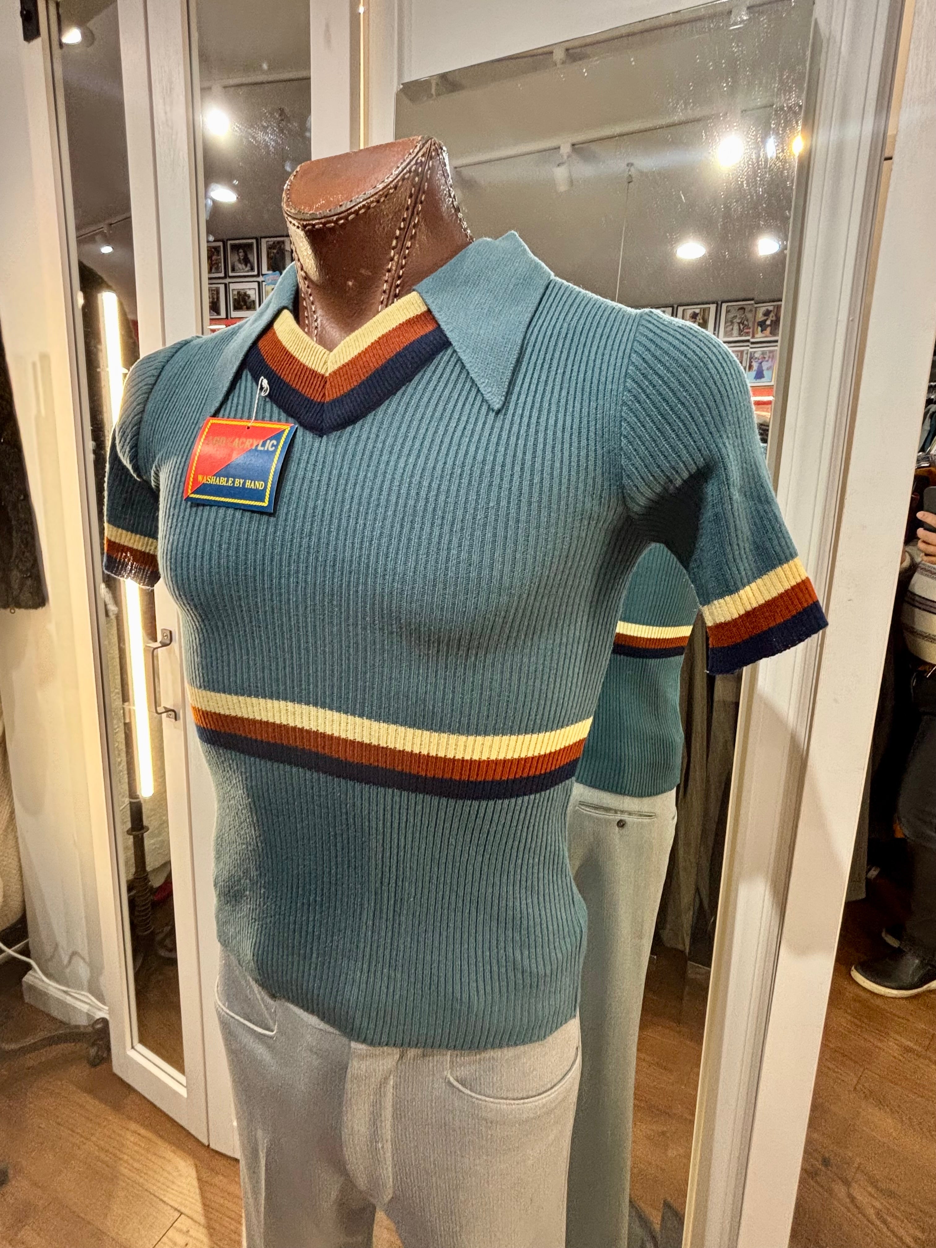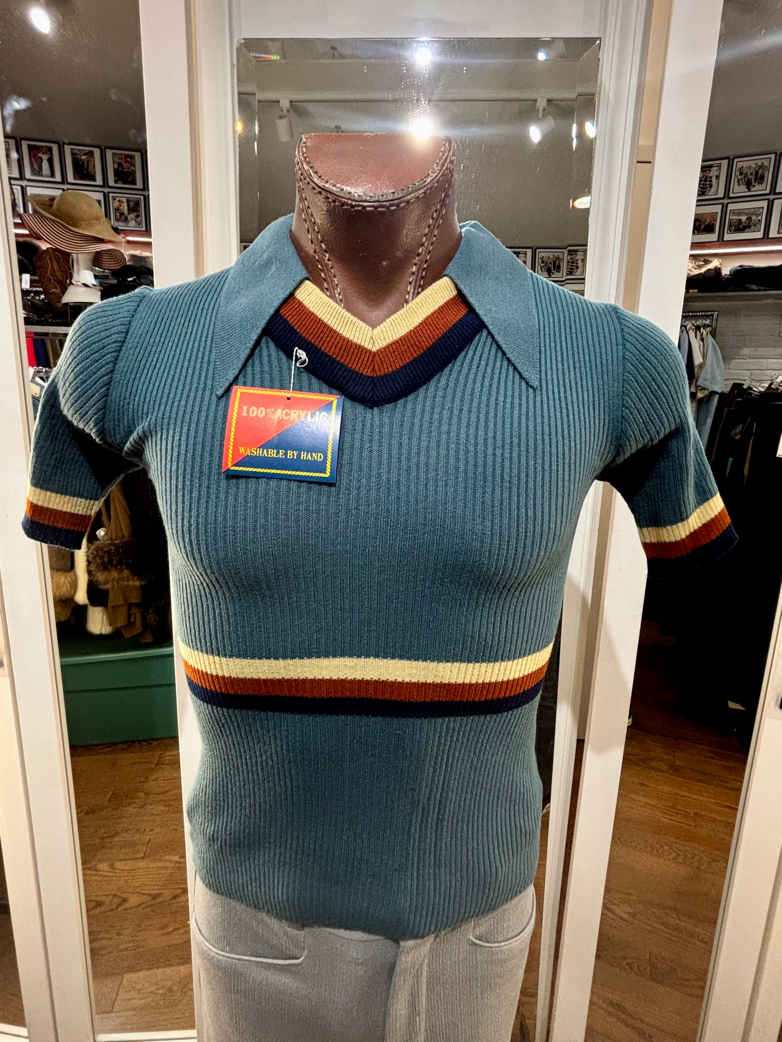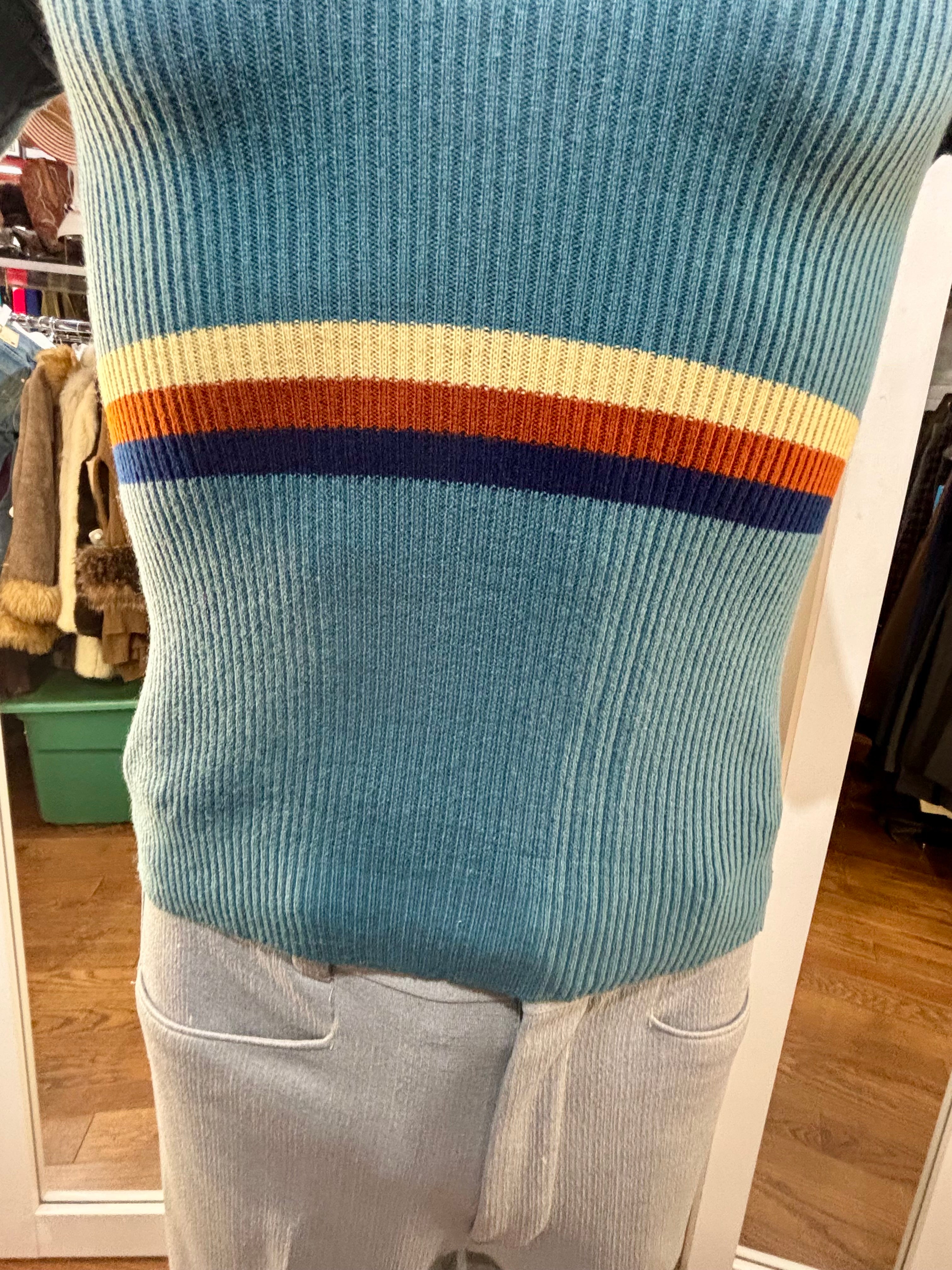 70’s Blue Multicolor Stripe Old Stock Collared Knit Pull By Rap Bibs