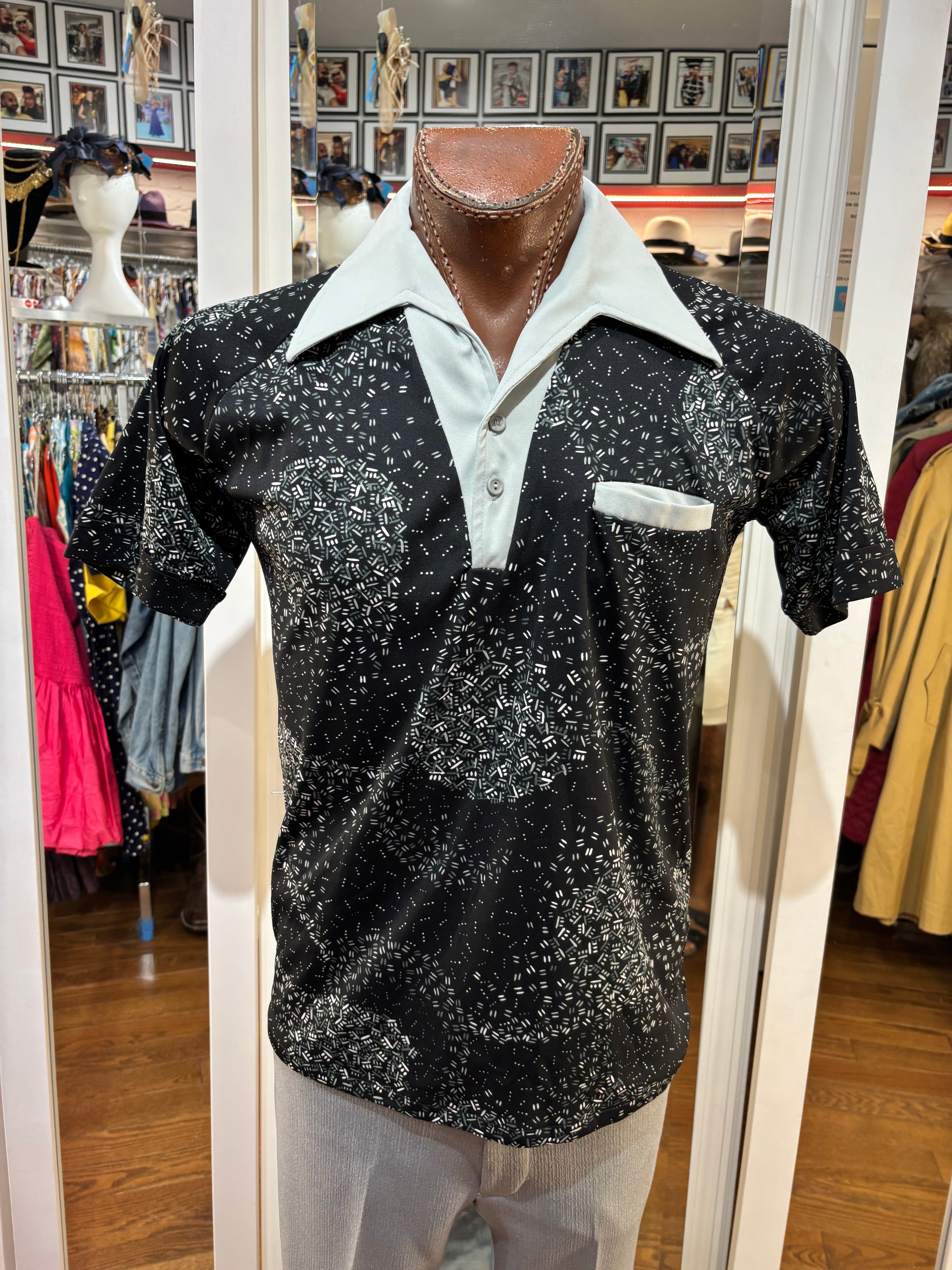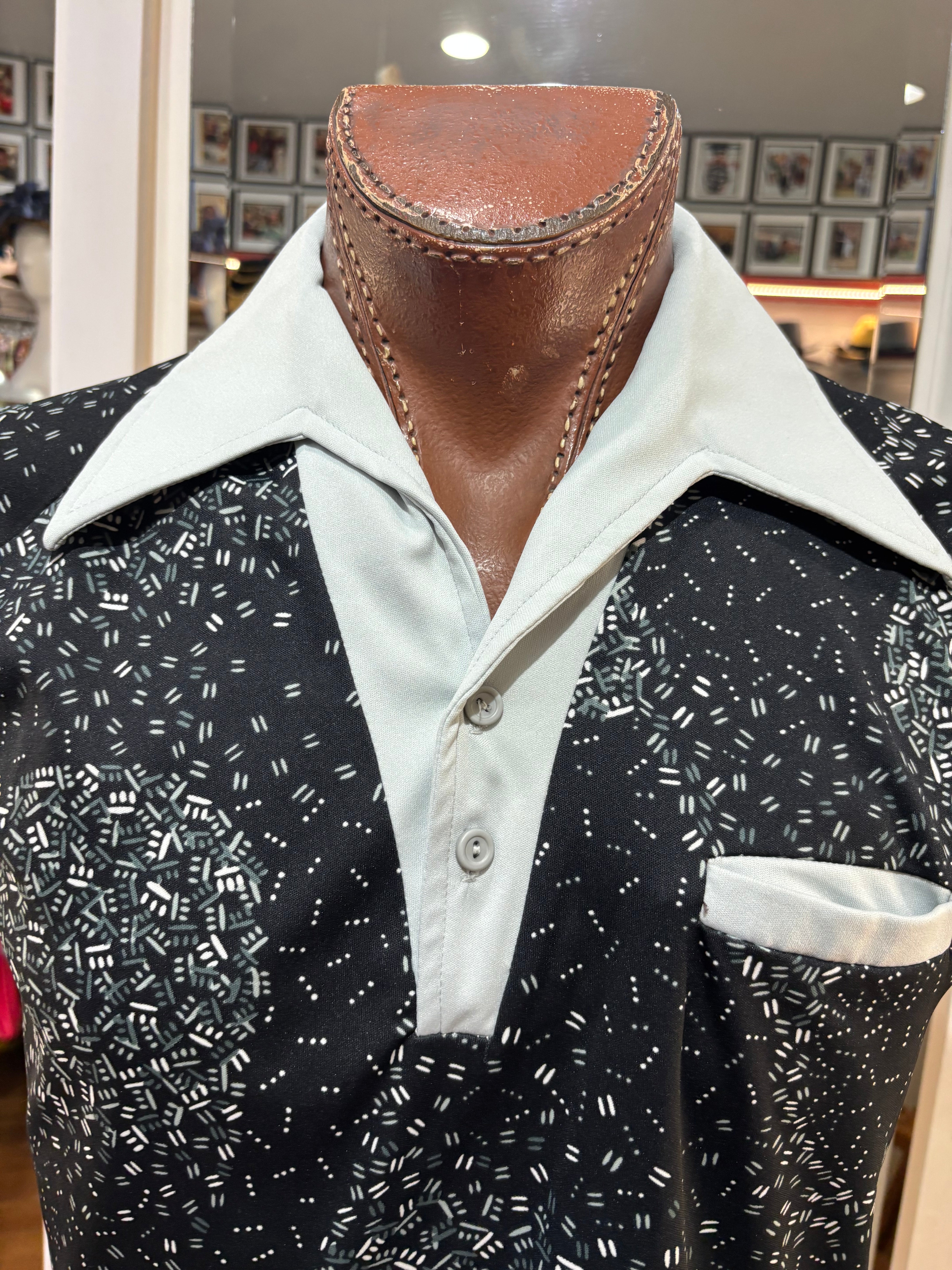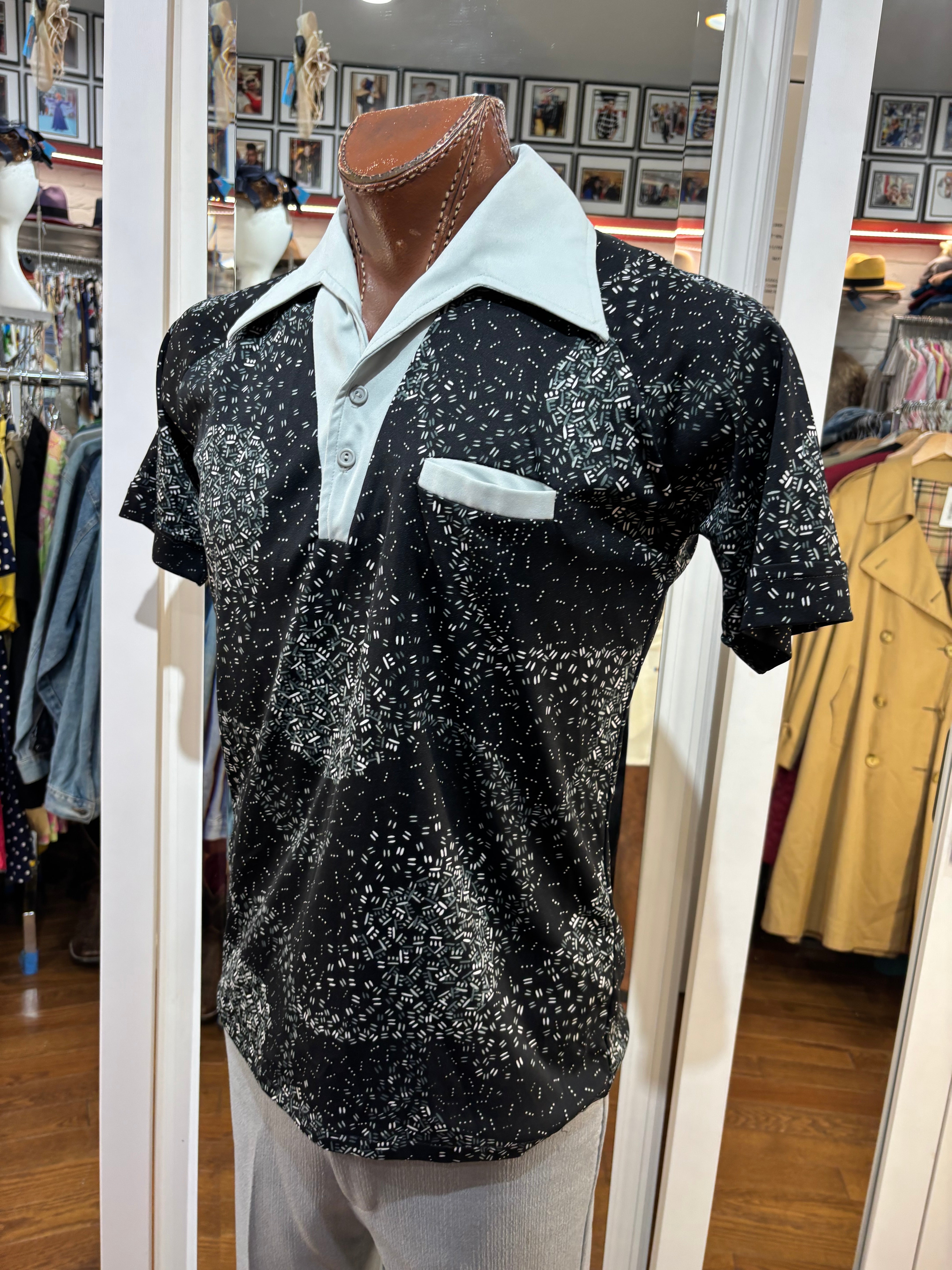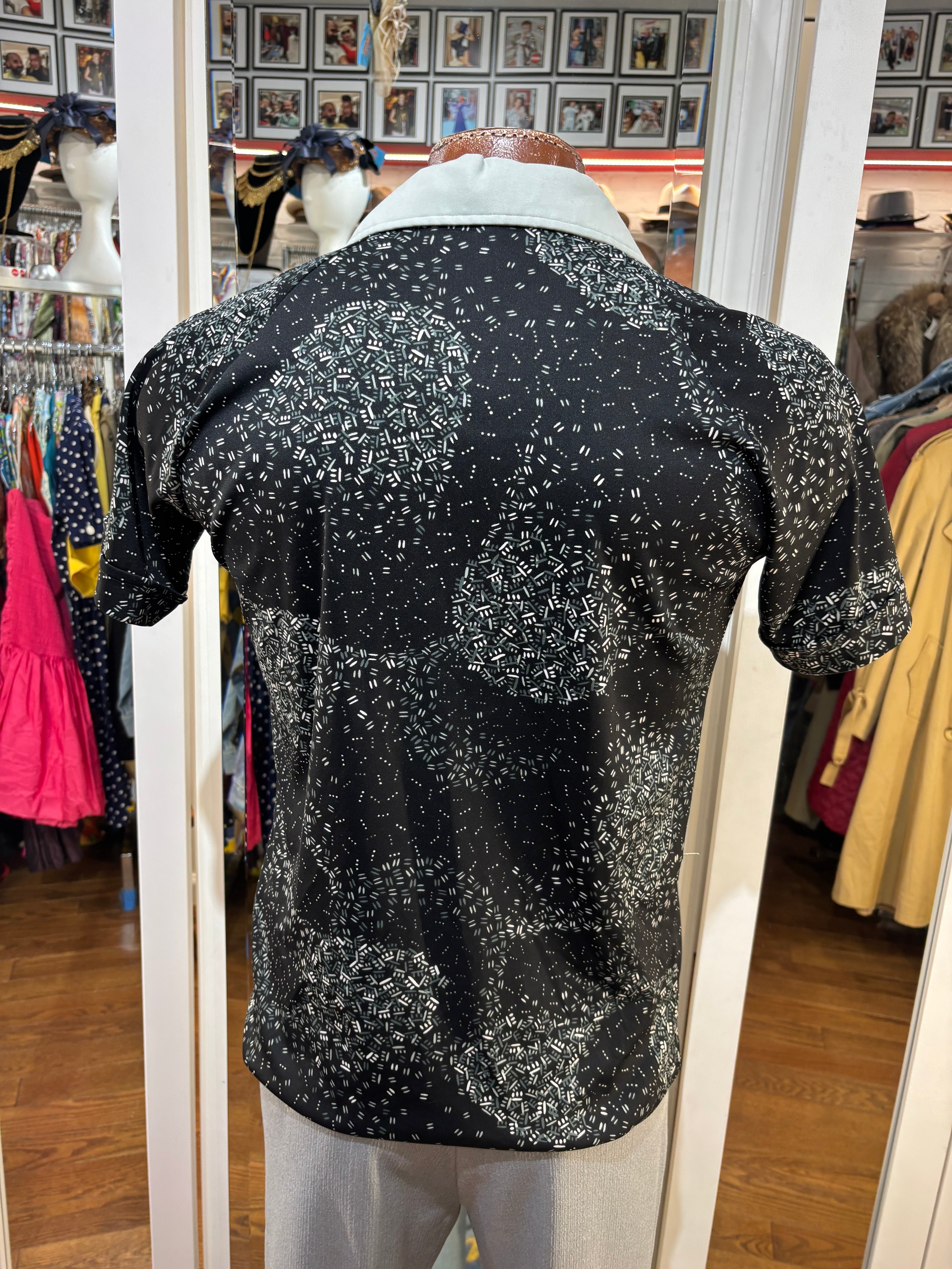 70’s Black And Grey Abstract Multicolor Print Collared Disco Polo Shirt By Da Vinci