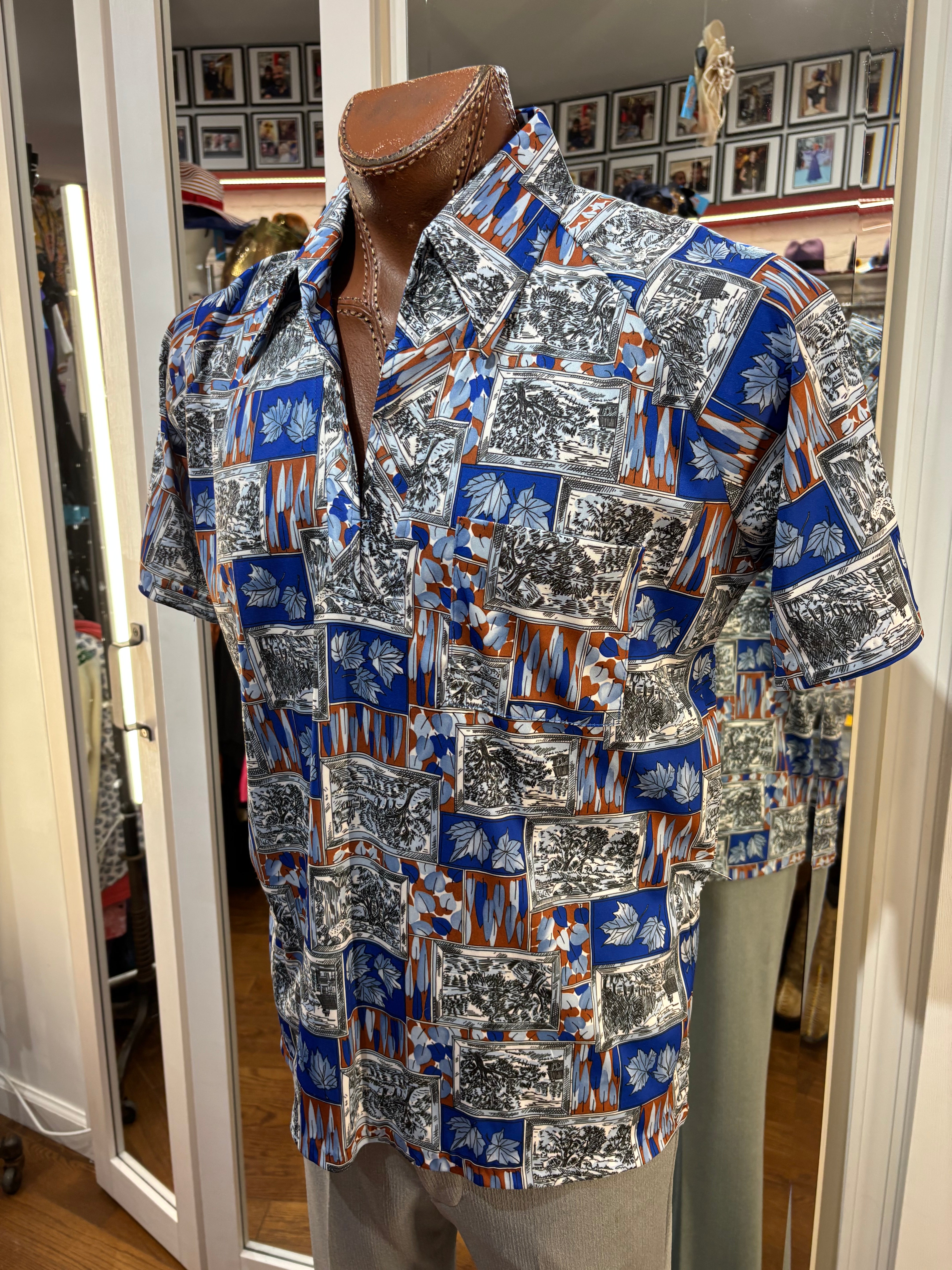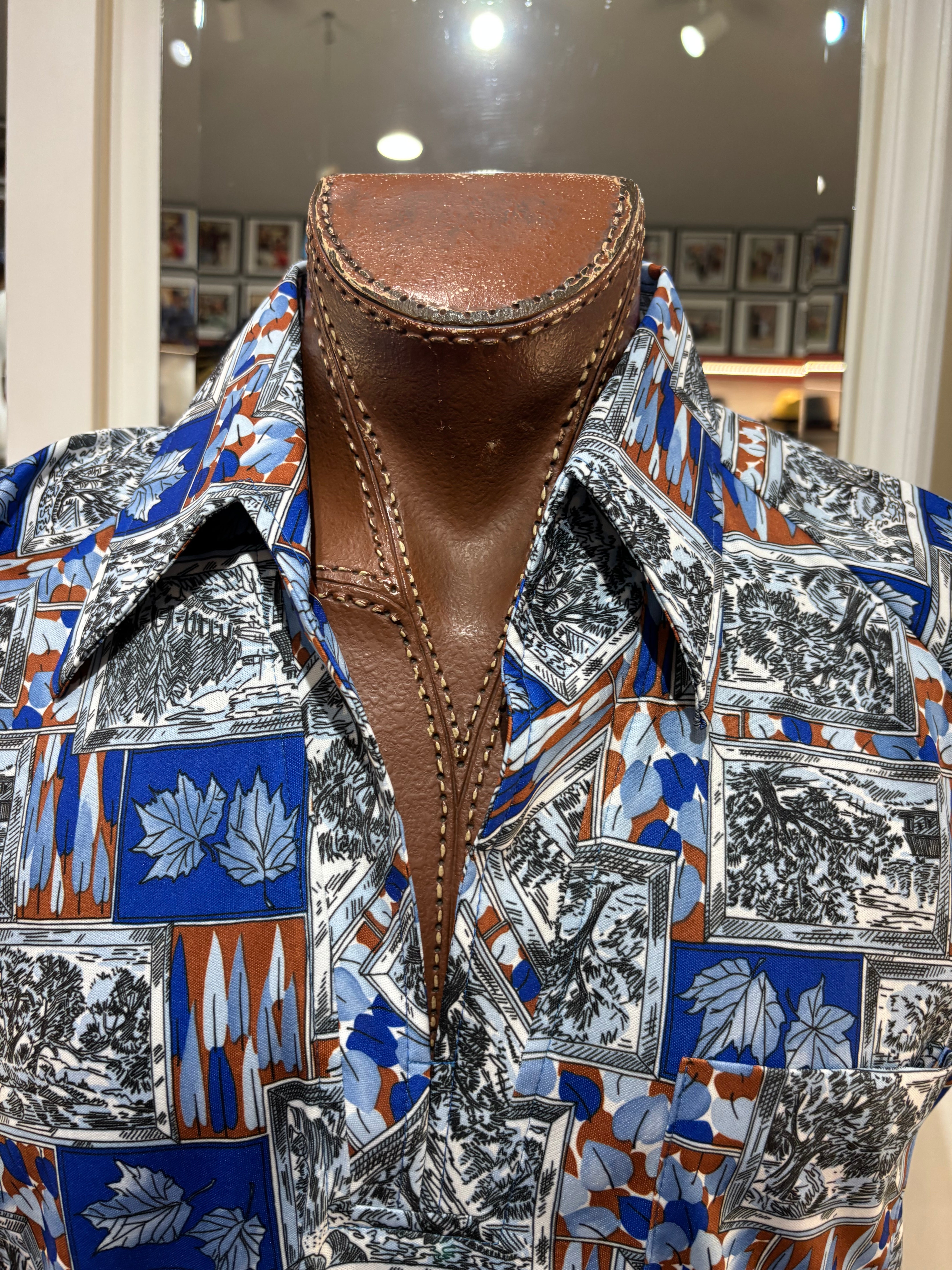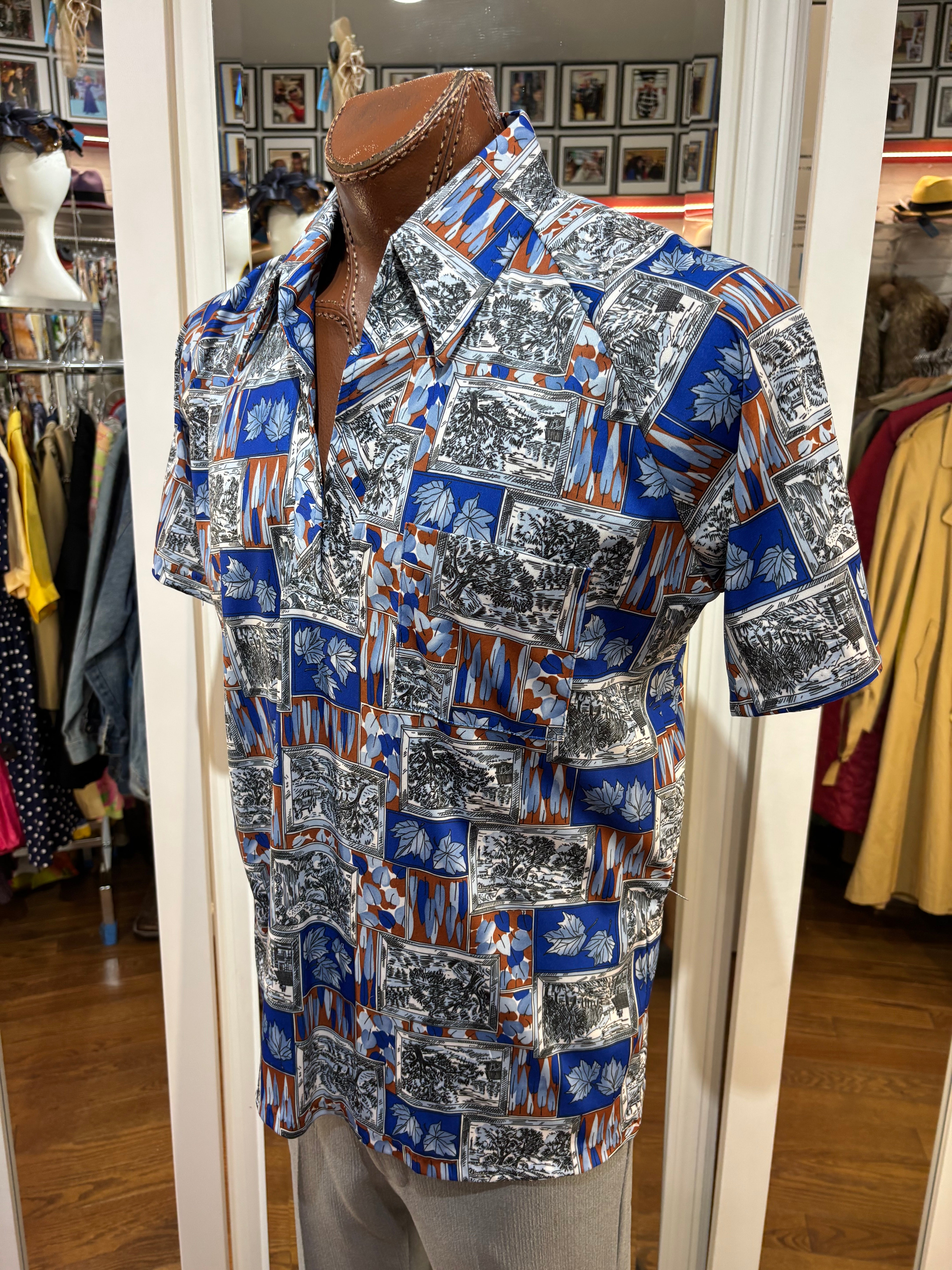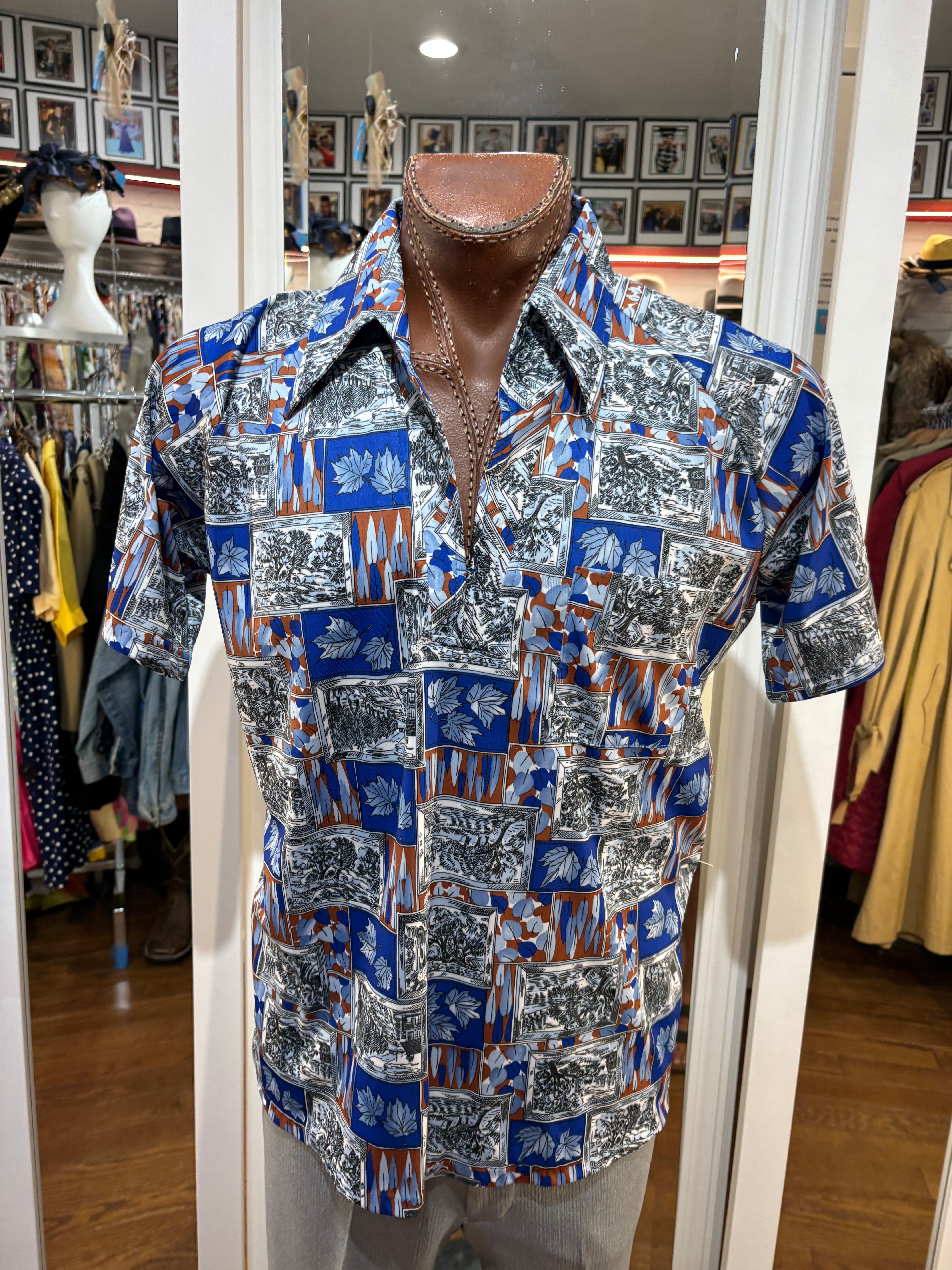 70’s Blue Flowers Abstract Multicolor Print Collared Disco Polo Shirt By Lilly Daché