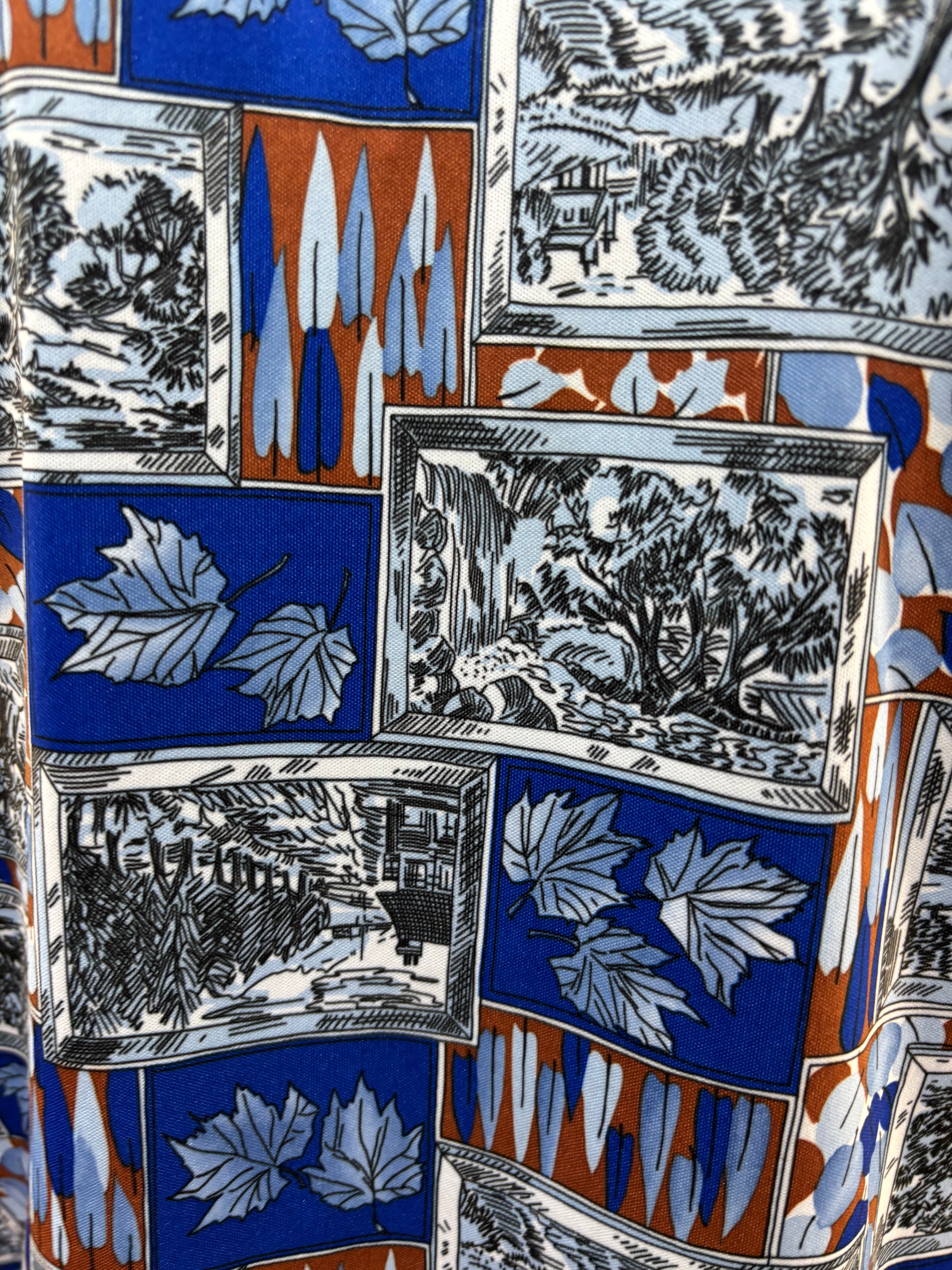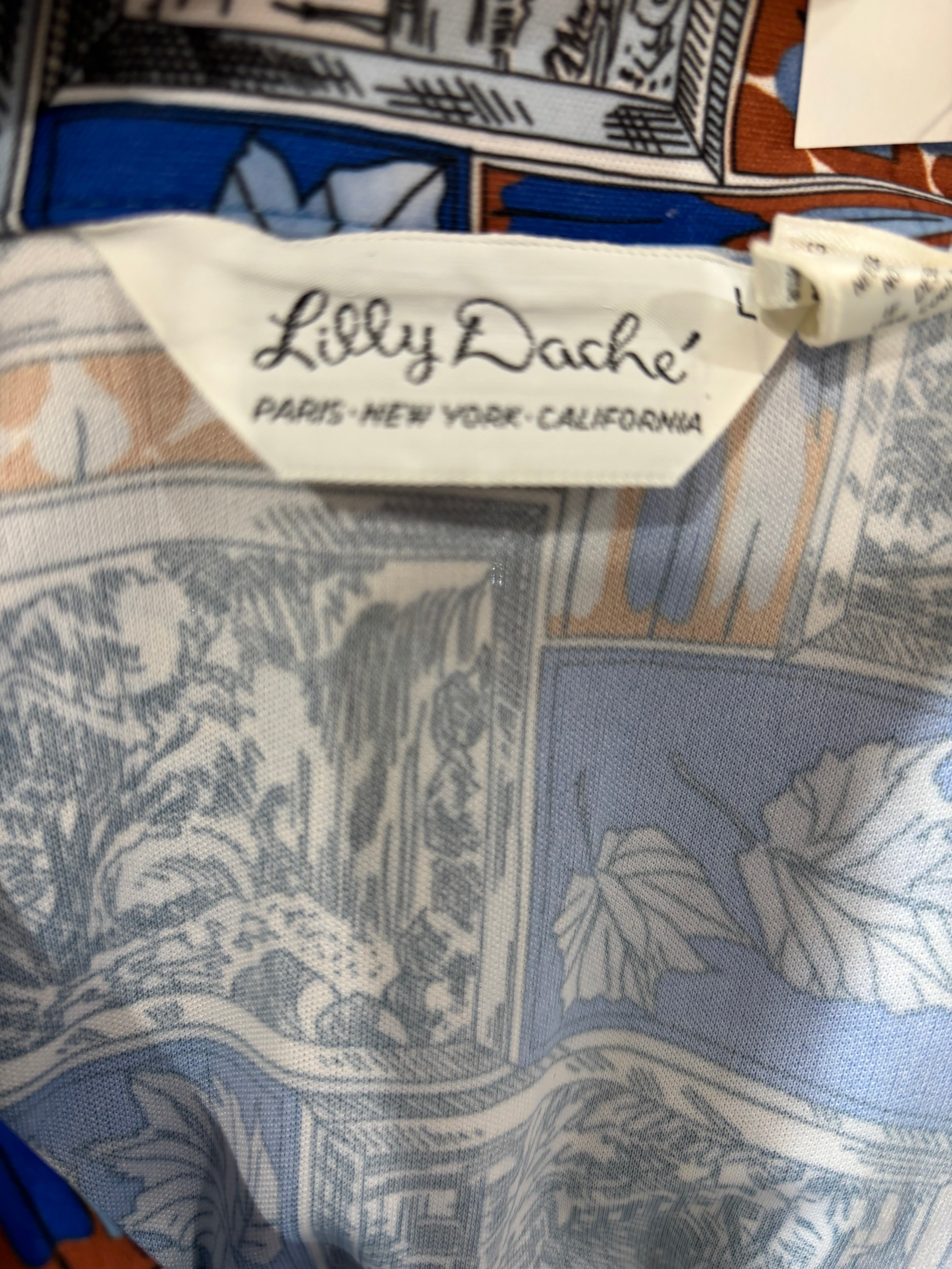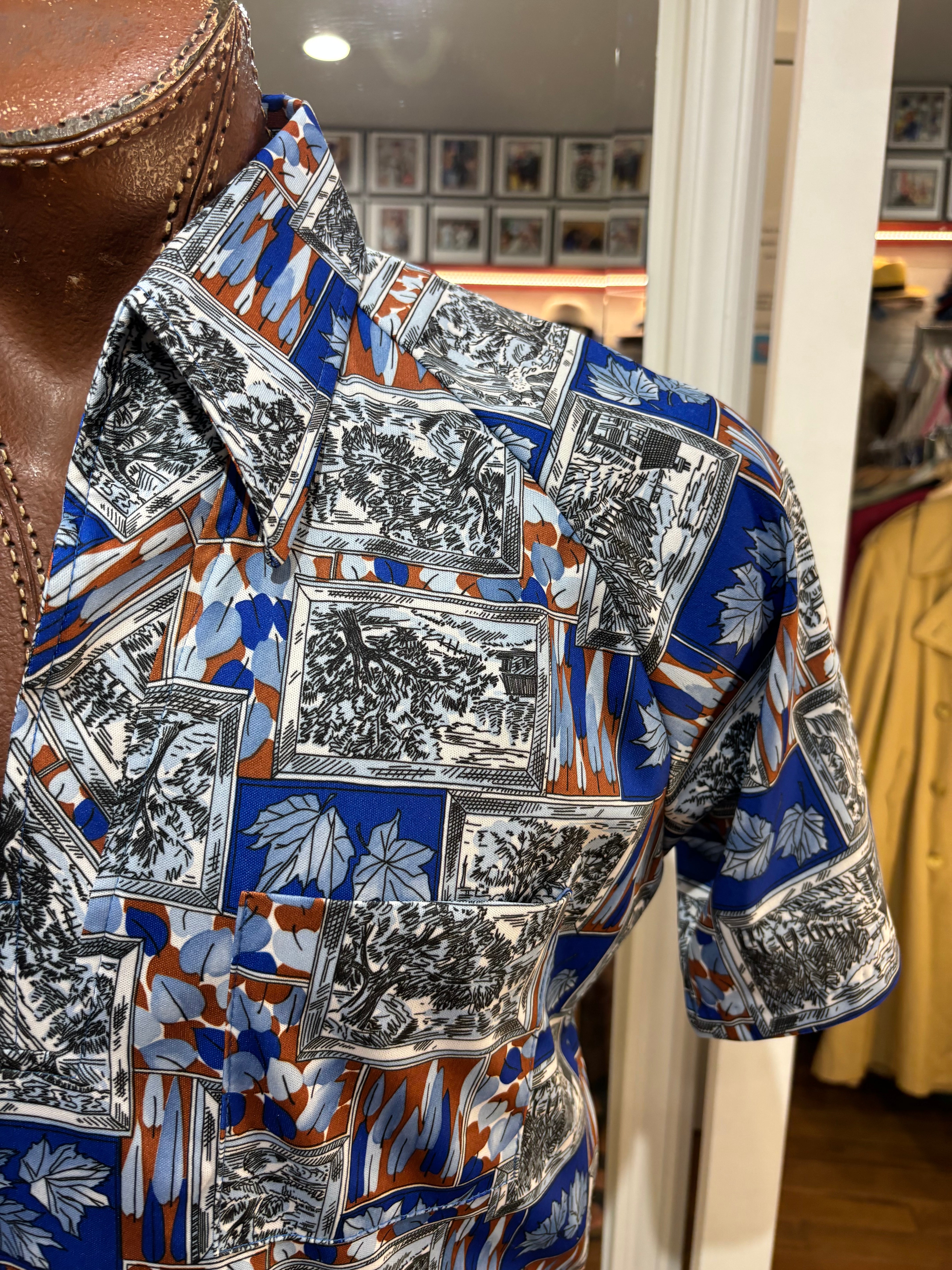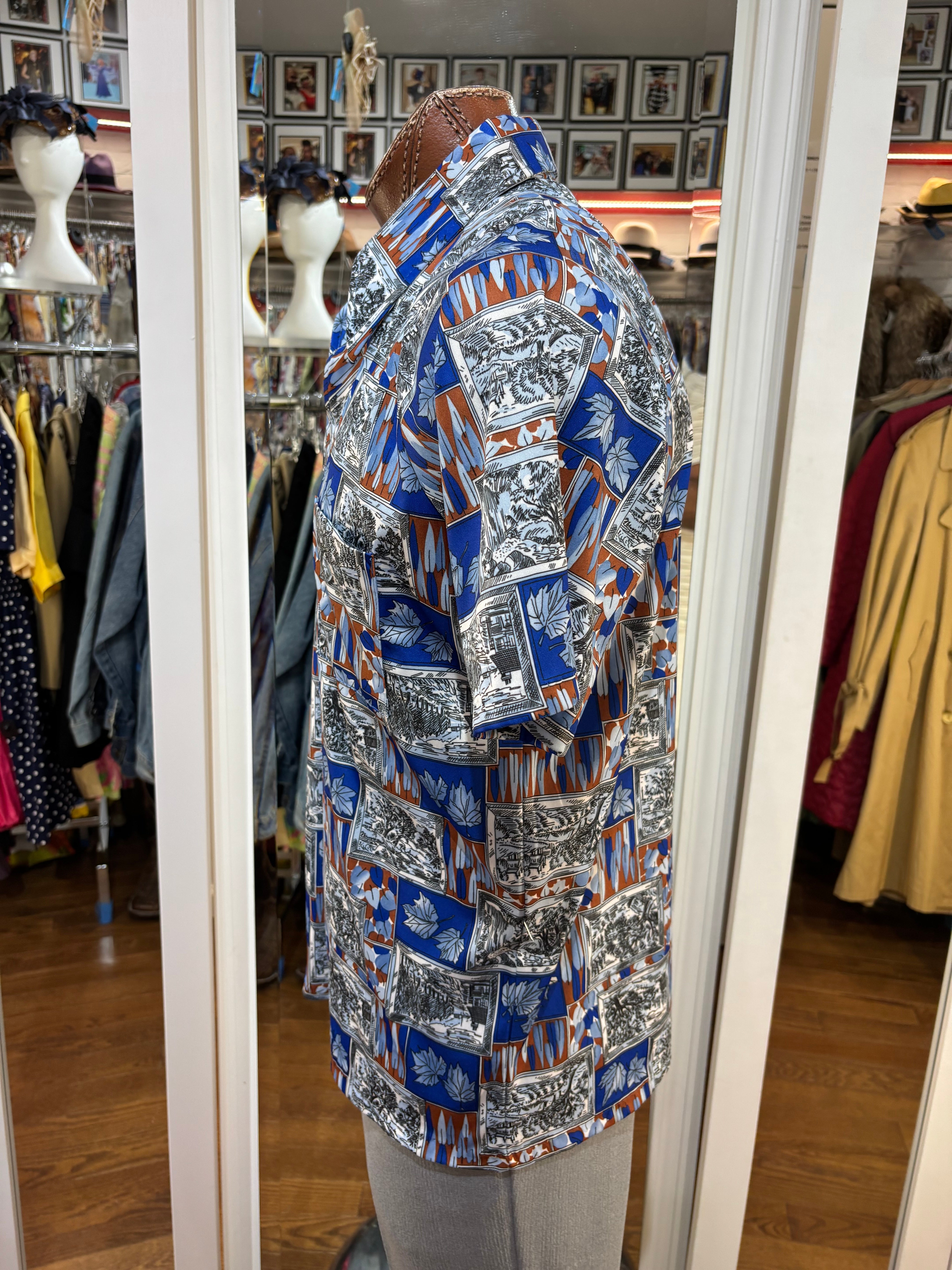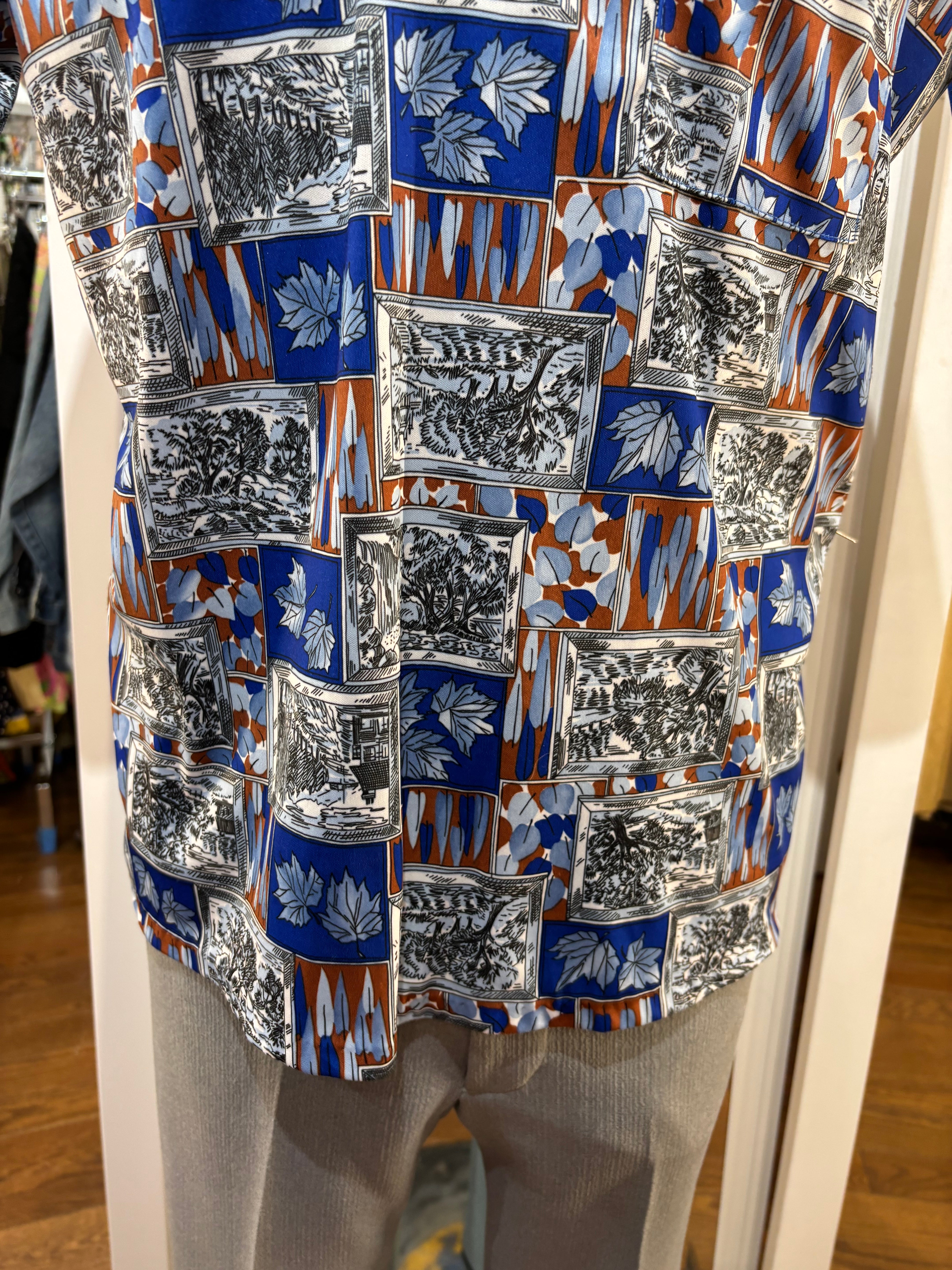 70’s Blue Flowers Abstract Multicolor Print Collared Disco Polo Shirt By Lilly Daché