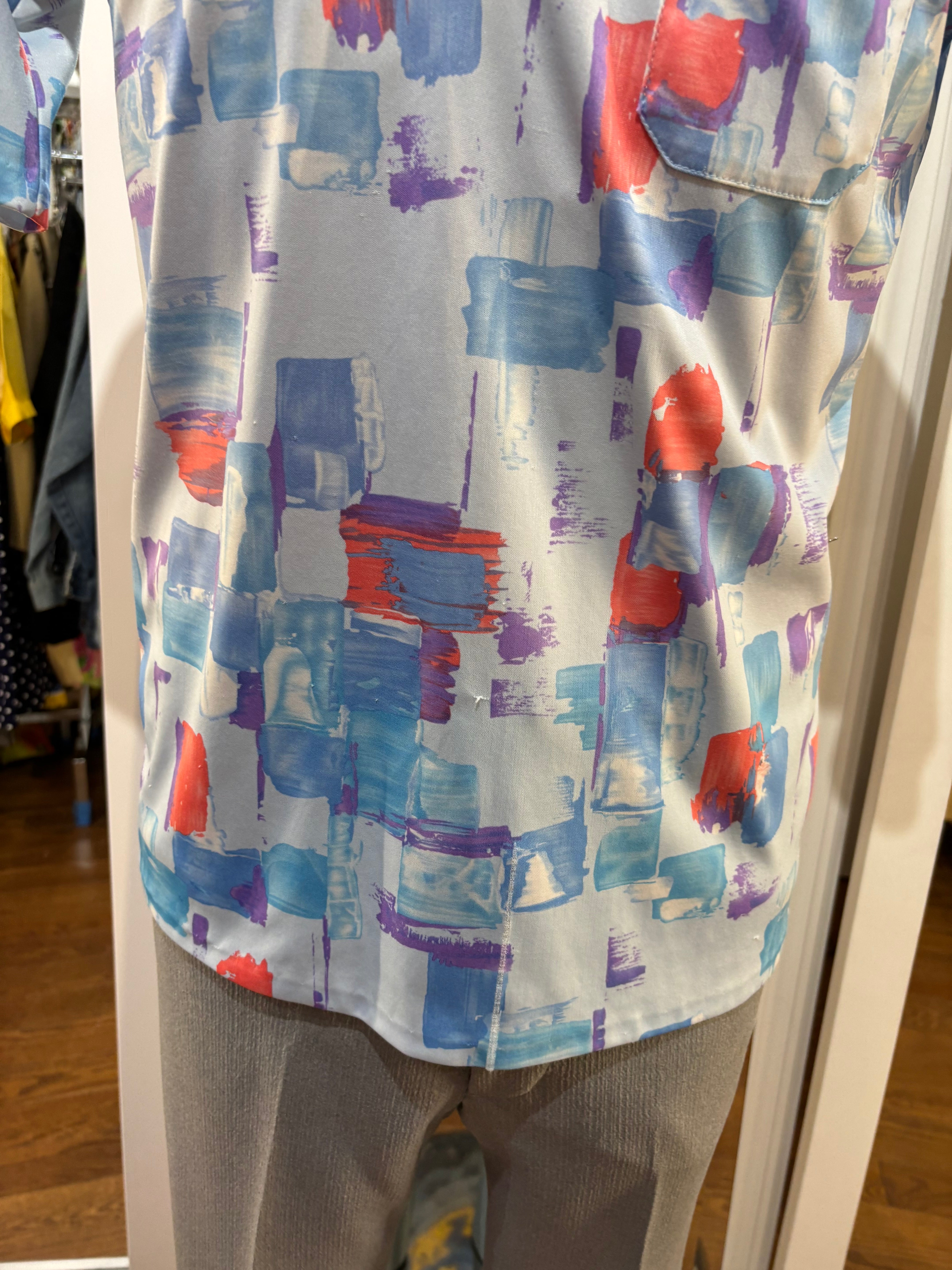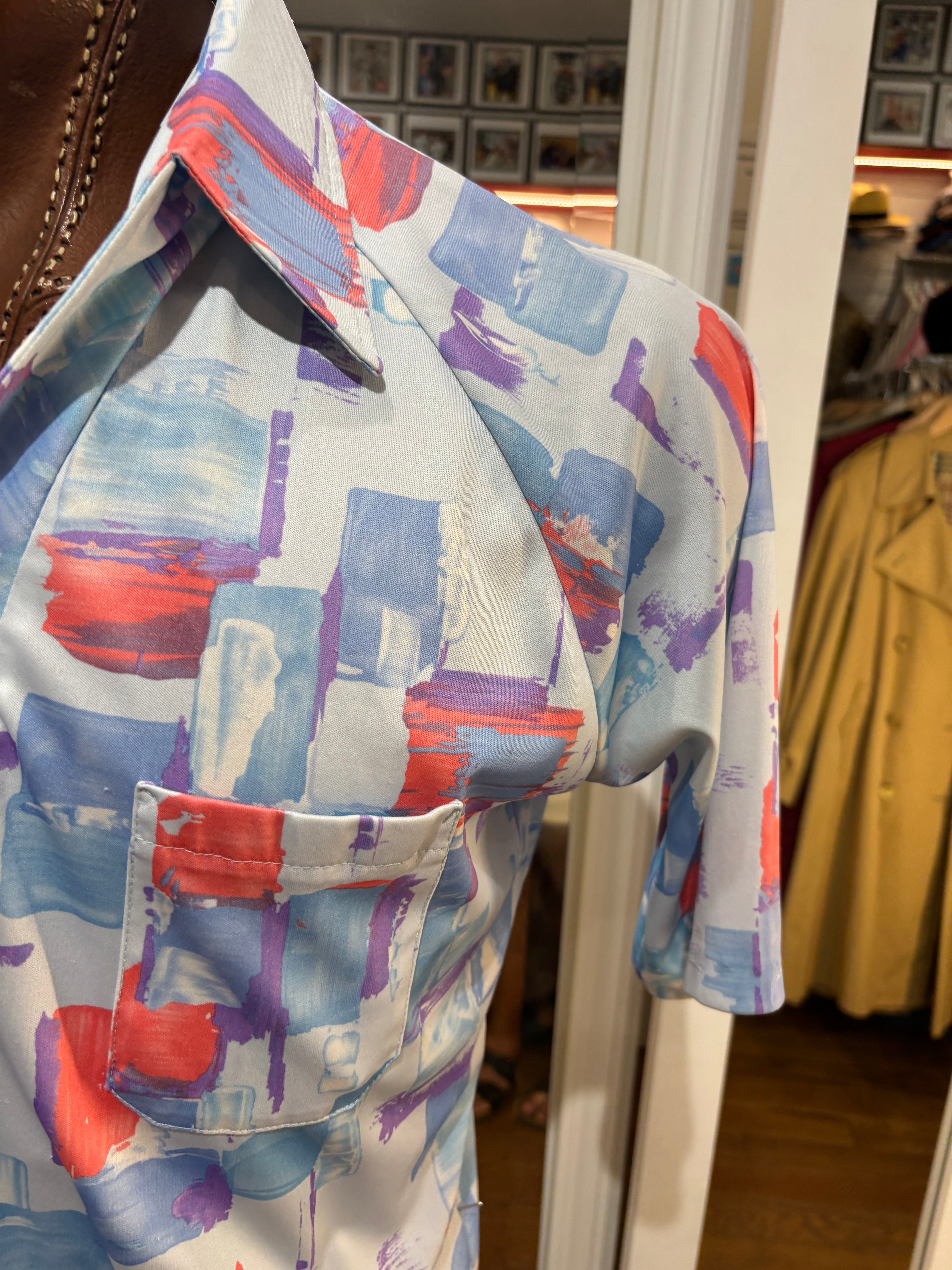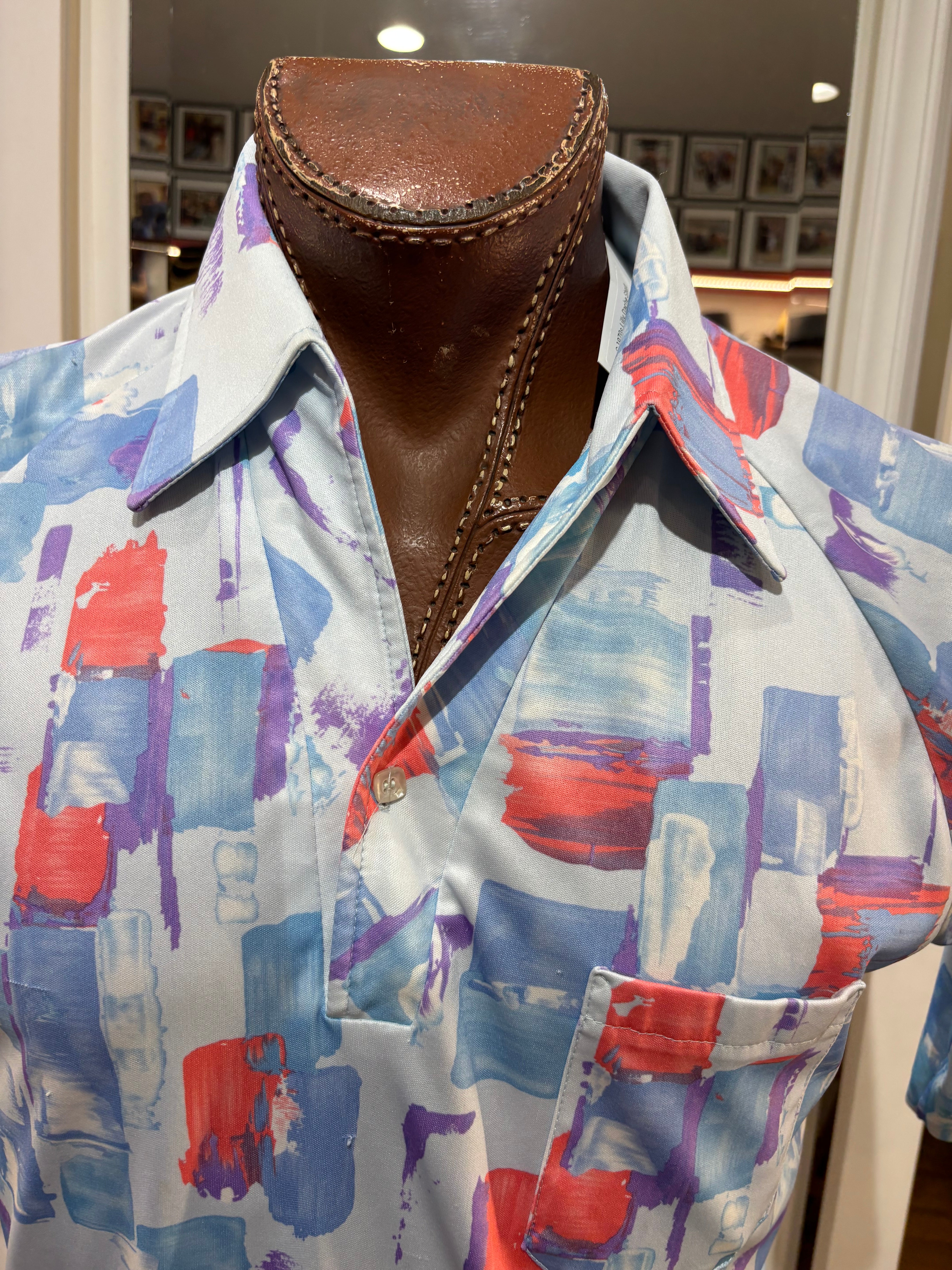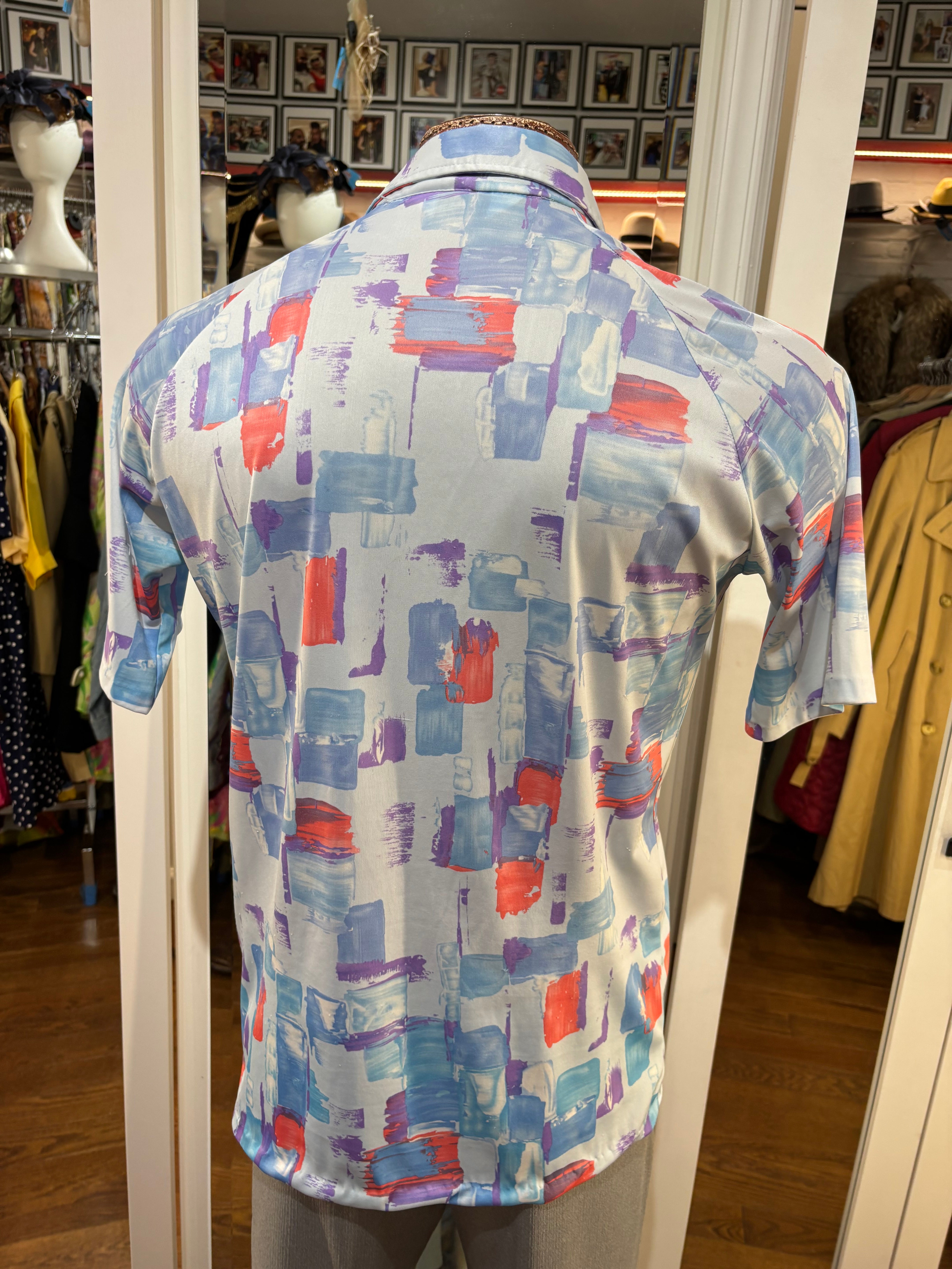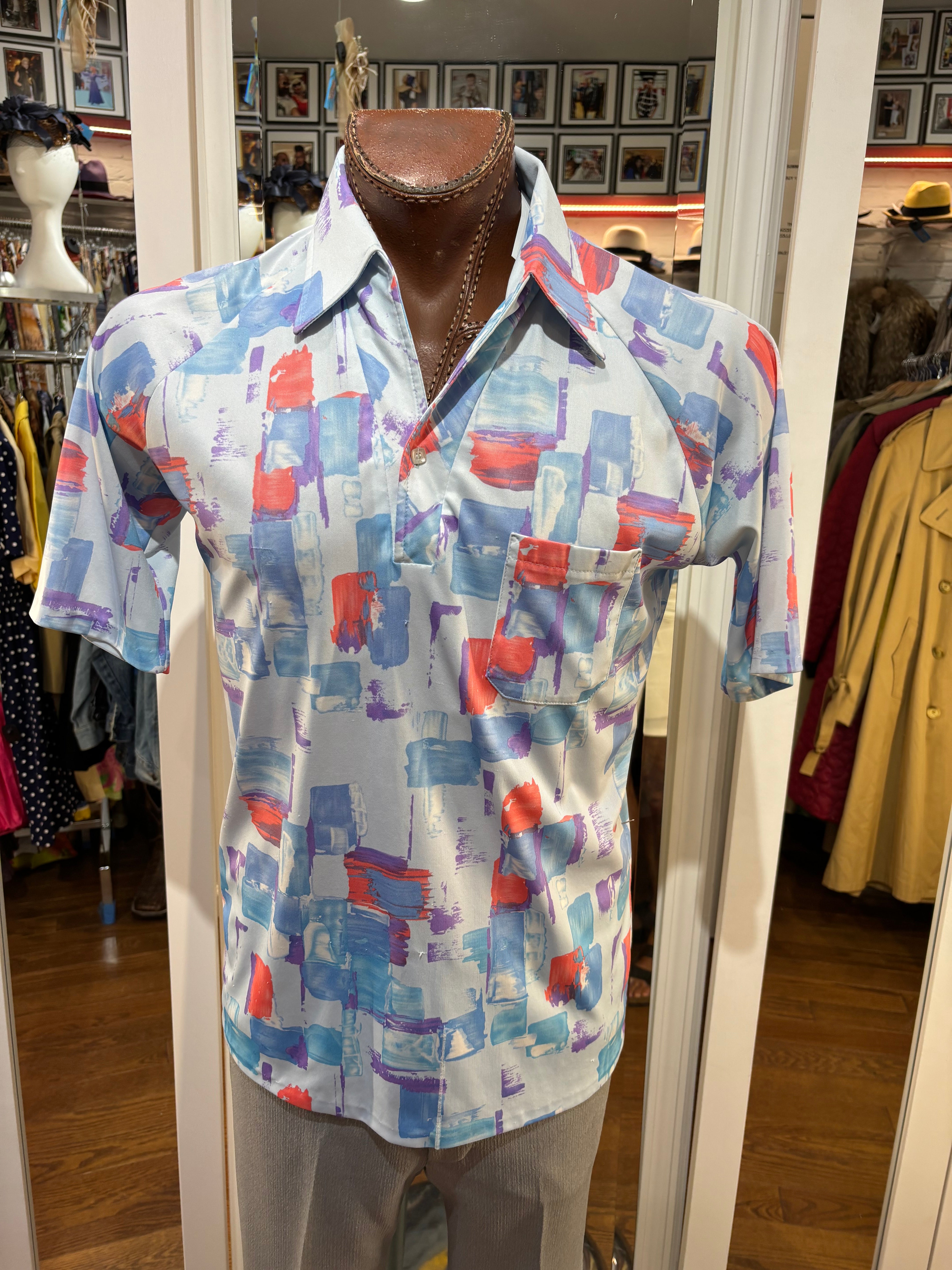70’s Pale Blue Abstract Multicolor Print Collared Disco Polo Shirt By Lilly Daché